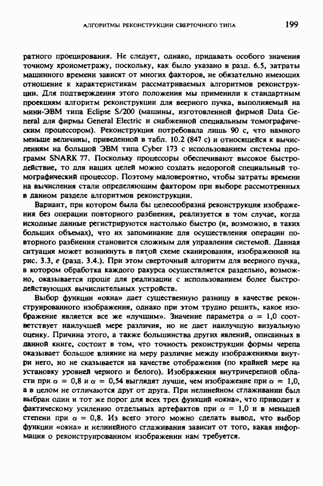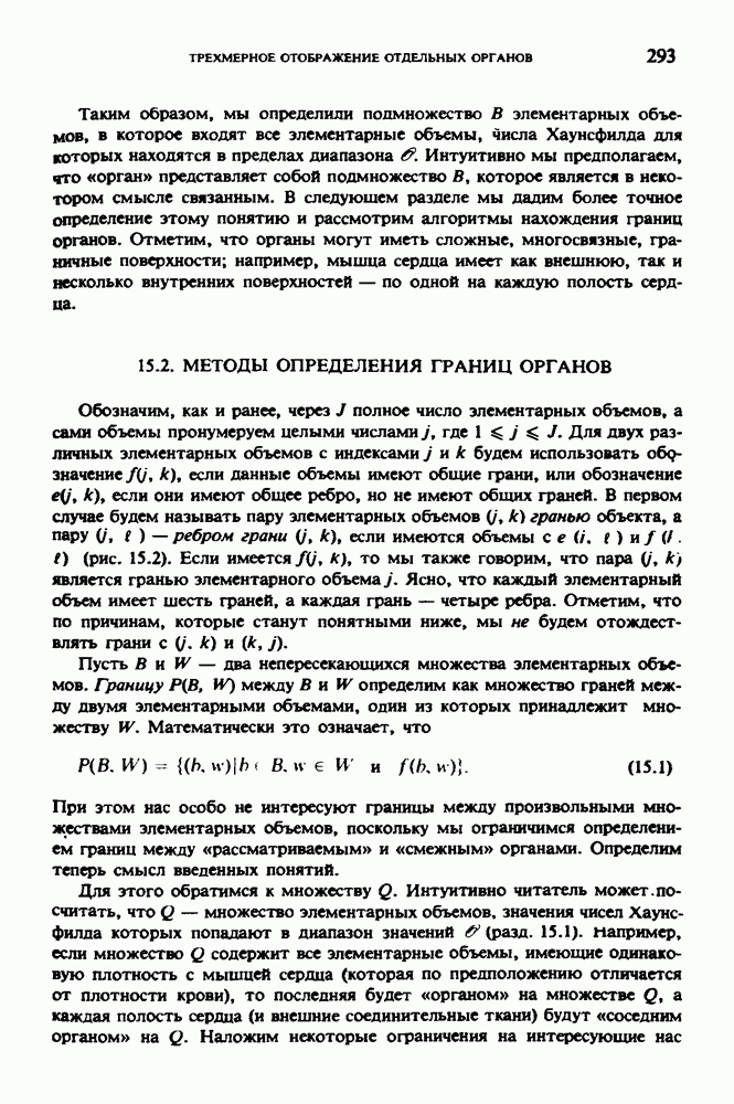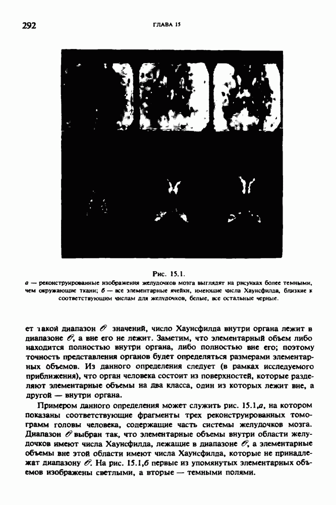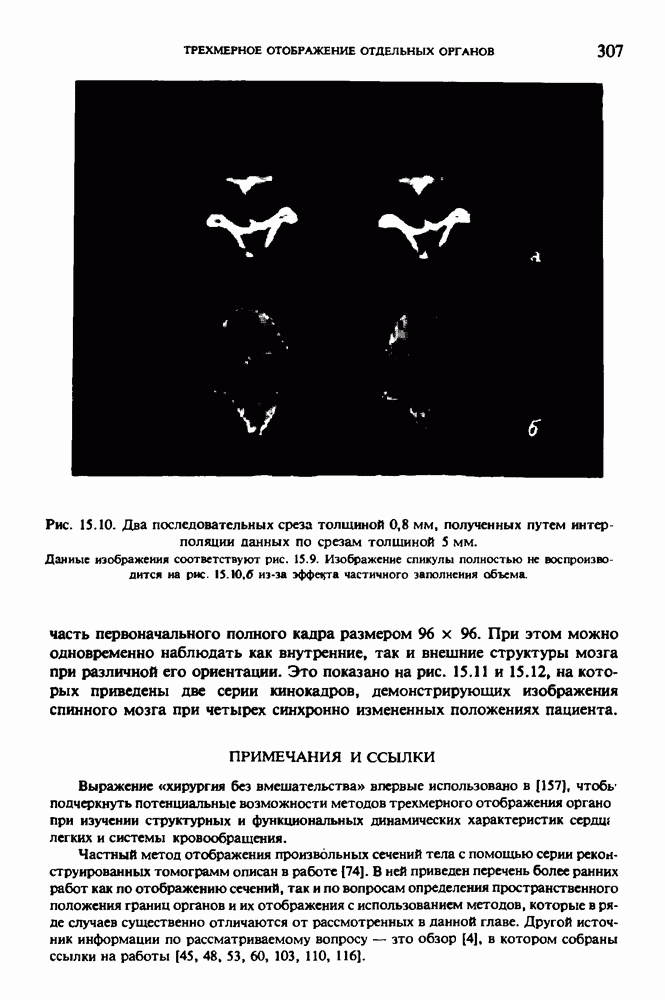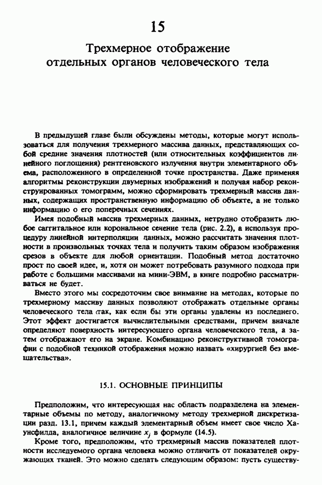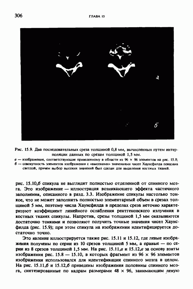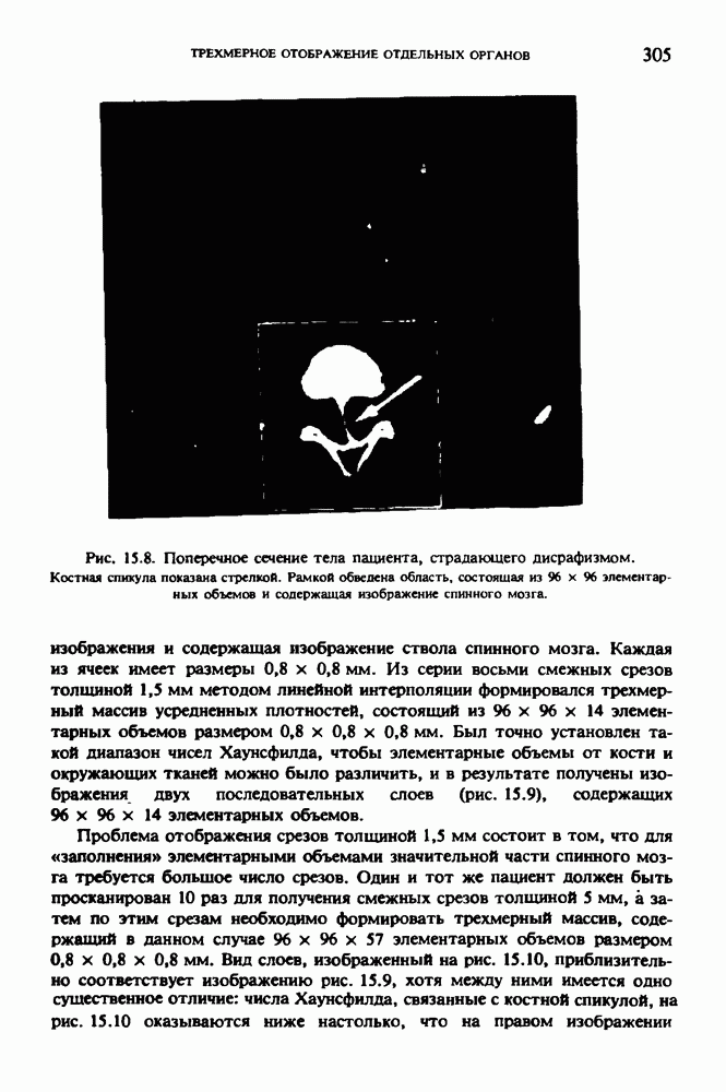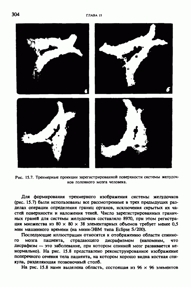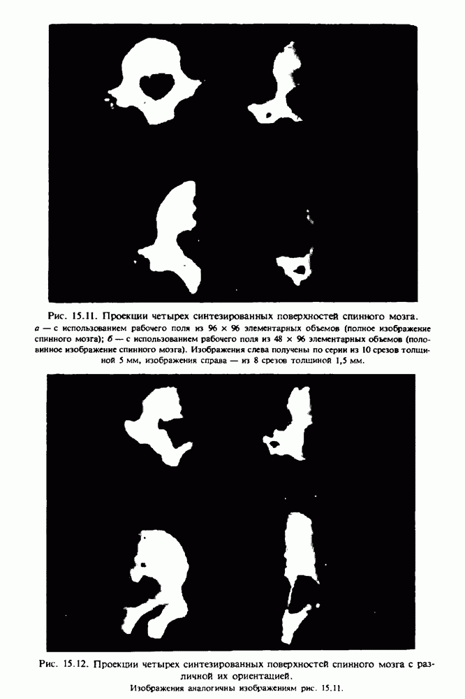 Рис. 15.6. Анатомическая структура фрагмента системы желудочков головного мозга человека. 1 — передние рога латерального желудочка; 2 — третий желудочек; 3 — четверохолмие; 4 — задние рога латерального желудочка. Рис. 15.7. (см. скан) Трехмерные проекции зарегистрированной поверхности системы желудочков головного мозга человека. Для формирования трехмерного изображения системы желудочков (рис. 15.7) были использованы все рассмотренные в трех предыдущих разделах операции определения границ органов, исключения скрытых их частей поверхности и наложения теней. Число зарегистрированных граничных граней для системы желудочков составляло 8970, при этом регистрация множества из 80 х 80 х 38 элементарных объемов требует менее 0,5 мин машинного времени (на мини-ЭВМ типа Eclipse S/200). Последующие иллюстрации относятся к отображению области спинного мозга пациента, страдающего дисрафизмом (напомним, что дисрафизм — это заболевание, при котором спинной мозг развивается ненормально). На рис. 15.8 представлено реконструированное изображение поперечного сечения тела пациента, на котором хорошо видна костная спи-кула, разделяющая позвоночный столб. На рис. 15.8 нами выделена область, состоящая из Рис. 15.8. (см. скан) Поперечное сечение тела пациента, страдающего дисрафизмом. Костная спикула показана стрелкой. Рамкой обведена область, состоящая из изображения и содержащая изображение ствола спинного мозга. Каждая из ячеек имеет размеры 0,8 х 0,8 мм. Из серии восьми смежных срезов толщиной 1,5 мм методом линейной интерполяции формировался трехмерный массив усредненных плотностей, состоящий из Проблема отображения срезов толщиной 1,5 мм состоит в том, что для «заполнения» элементарными объемами значительной части спинного мозга требуется большое число срезов. Один и тот же пациент должен быть просканирован 10 раз для получения смежных срезов толщиной 5 мм, а затем по этим срезам необходимо формировать трехмерный массив, содержащий в данном случае Рис. 15.9. (см. скан) Два последовательных среза толщиной 0,8 мм, вычисленных путем интерполяции данных по срезам толщиной 1,5 мм. — изображения, соответствующие приведенному в области из 96 х 96 элементов на рис. 15.8; б - совокупность элементов изображения с «высокими» значениями чисел Хаунсфилда показана светлой, причем выбор высоких значений был сделан для выделения костных тканей. рис. 15.10,б спикула не выглядит полностью отделенной от спинного мозга. Это изображение — иллюстрация возникающего эффекта частичного заполнения, описанного в разд. 3.3. Изображение спикулы настолько тонкое, что не может заполнить полностью элементарный объем в срезах толщиной 5 мм, поэтому числа Хаунсфилда в пределах среза неточно характеризуют коэффициент линейного ослабления рентгеновского излучения в костных тканях спикулы. Напротив, срезы толщиной 1,5 мм оказываются достаточно тонкими и позволяют получить точные значения чисел Хаунсфилда (рис. 15.9); при этом спикула на изображении идентифицируется достаточно точно. Это явление иллюстрируется также рис. 15.11 и 15.12, где левые изображения получены по серии из 10 срезов толщиной 5 мм, а правые — по серии из 8 срезов толщиной 1,5 мм. На рис. 15.11,а и 15.12,а за основу взяты изображения рис. 15.8 — 15.10, в которых фрагмент из 96 х 96 элементов изображения использовался для идентификации спинного мозга в целом. На р