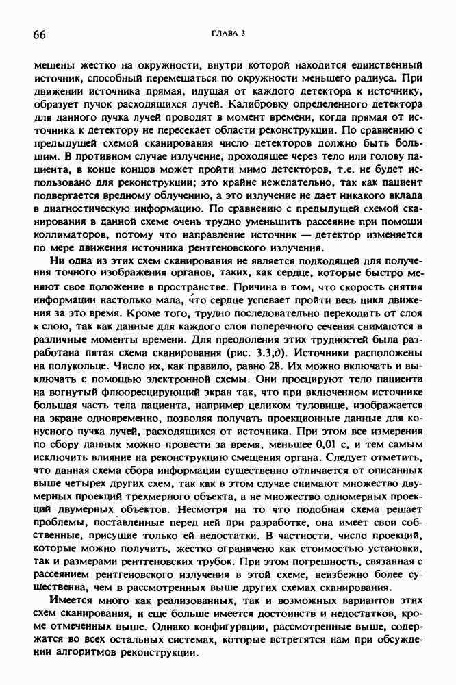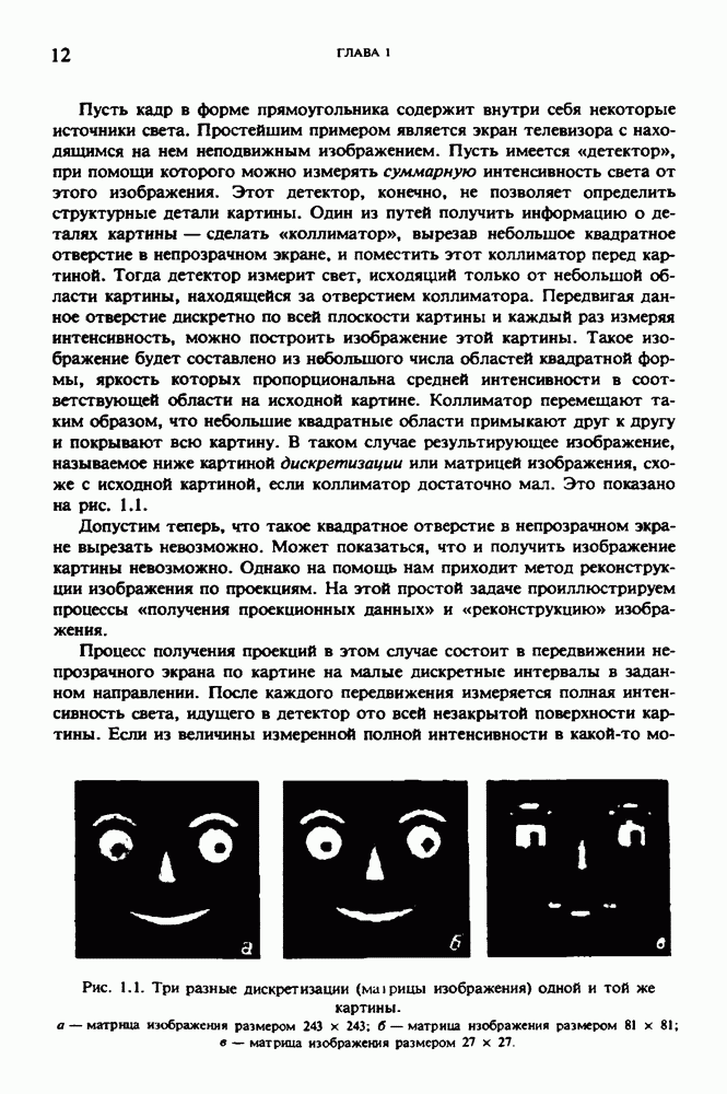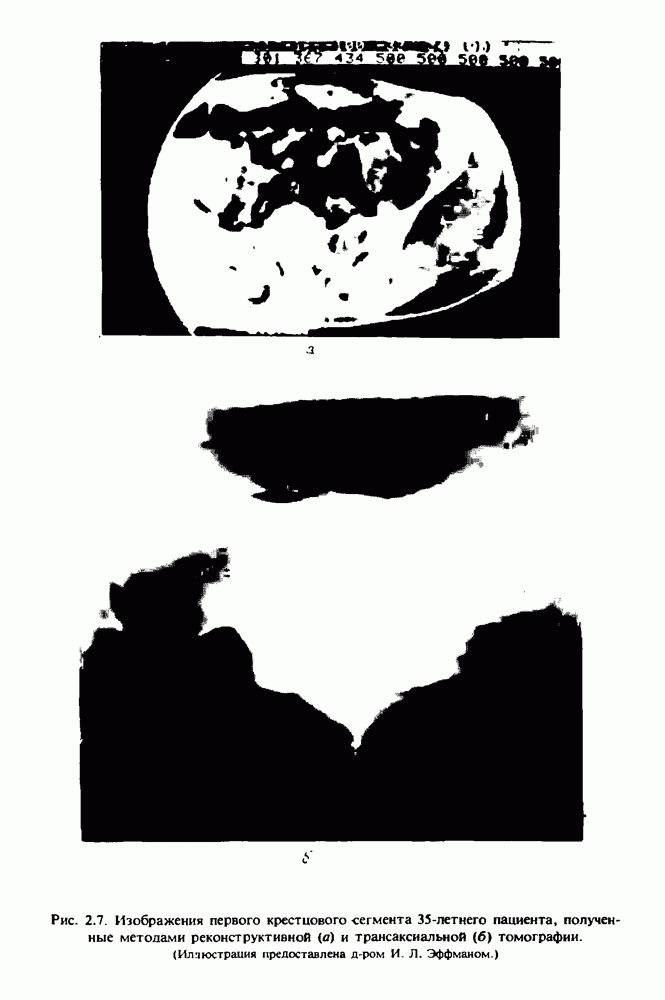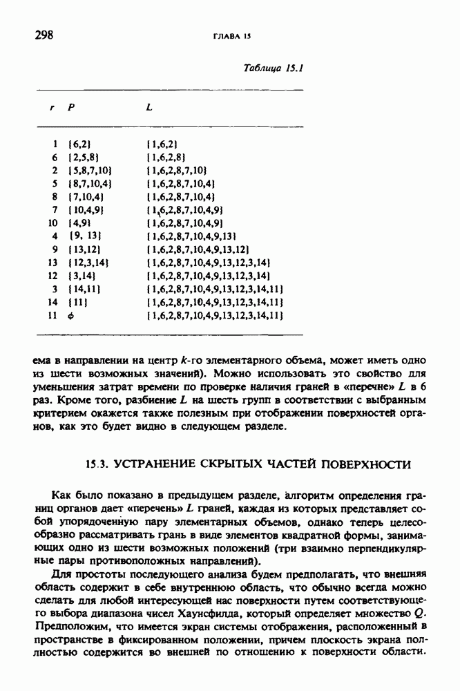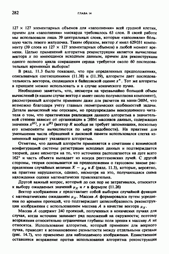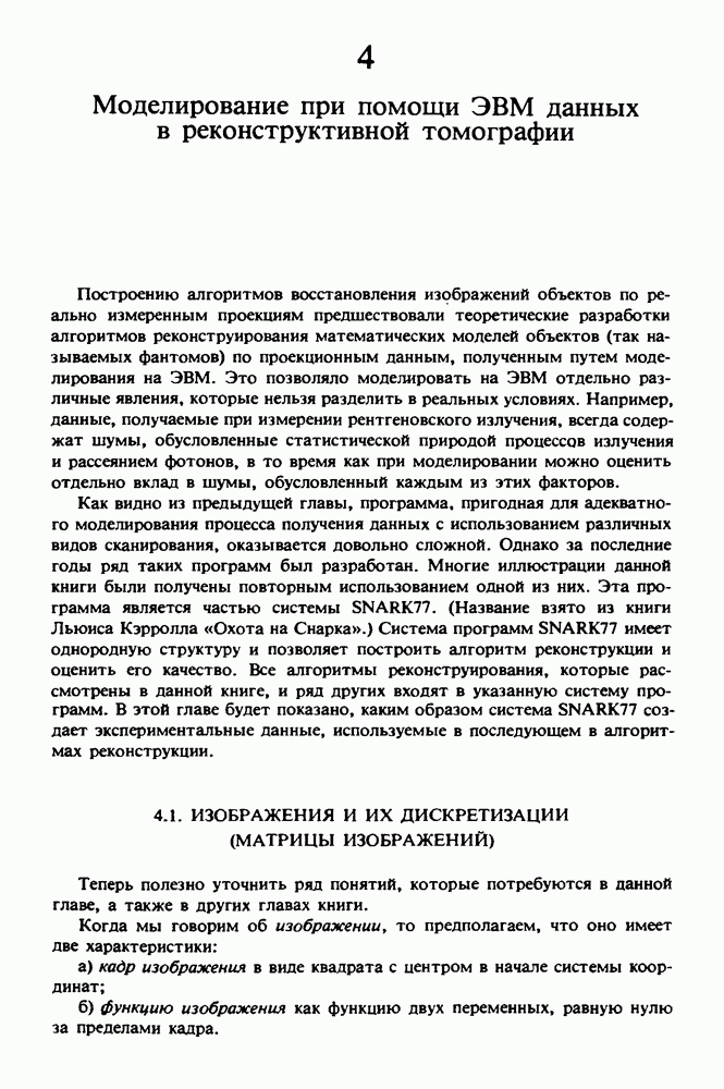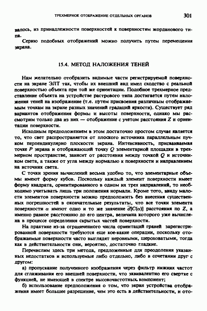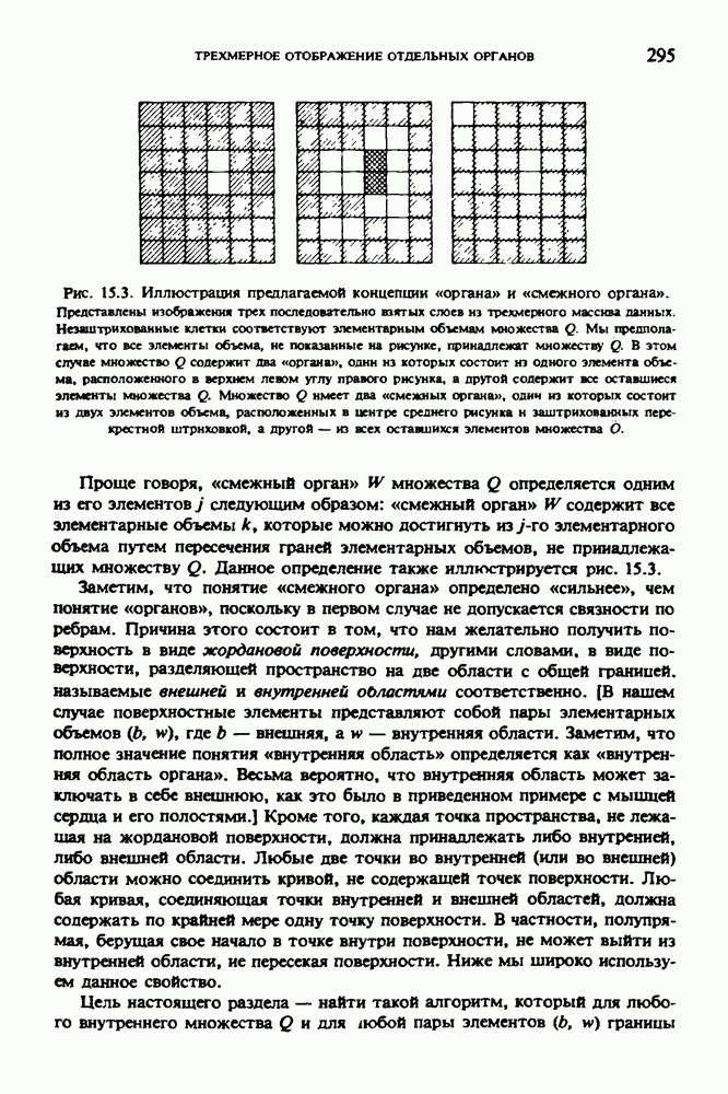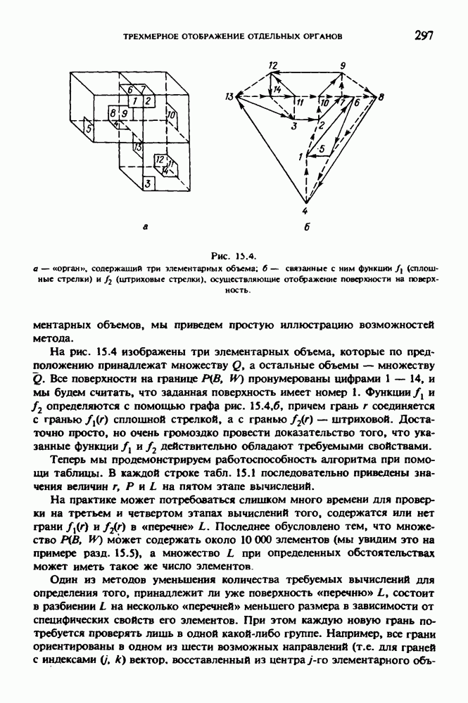 Рис. 15.6. Анатомическая структура фрагмента системы желудочков головного мозга человека. 1 — передние рога латерального желудочка; 2 — третий желудочек; 3 — четверохолмие; 4 — задние рога латерального желудочка. Рис. 15.7. (см. скан) Трехмерные проекции зарегистрированной поверхности системы желудочков головного мозга человека. Для формирования трехмерного изображения системы желудочков (рис. 15.7) были использованы все рассмотренные в трех предыдущих разделах операции определения границ органов, исключения скрытых их частей поверхности и наложения теней. Число зарегистрированных граничных граней для системы желудочков составляло 8970, при этом регистрация множества из 80 х 80 х 38 элементарных объемов требует менее 0,5 мин машинного времени (на мини-ЭВМ типа Eclipse S/200). Последующие иллюстрации относятся к отображению области спинного мозга пациента, страдающего дисрафизмом (напомним, что дисрафизм — это заболевание, при котором спинной мозг развивается ненормально). На рис. 15.8 представлено реконструированное изображение поперечного сечения тела пациента, на котором хорошо видна костная спи-кула, разделяющая позвоночный столб. На рис. 15.8 нами выделена область, состоящая из Рис. 15.8. (см. скан) Поперечное сечение тела пациента, страдающего дисрафизмом. Костная спикула показана стрелкой. Рамкой обведена область, состоящая из изображения и содержащая изображение ствола спинного мозга. Каждая из ячеек имеет размеры 0,8 х 0,8 мм. Из серии восьми смежных срезов толщиной 1,5 мм методом линейной интерполяции формировался трехмерный массив усредненных плотностей, состоящий из Проблема отображения срезов толщиной 1,5 мм состоит в том, что для «заполнения» элементарными объемами значительной части спинного мозга требуется большое число срезов. Один и тот же пациент должен быть просканирован 10 раз для получения смежных срезов толщиной 5 мм, а затем по этим срезам необходимо формировать трехмерный массив, содержащий в данном случае Рис. 15.9. (см. скан) Два последовательных среза толщиной 0,8 мм, вычисленных путем интерполяции данных по срезам толщиной 1,5 мм. — изображения, соответствующие приведенному в области из 96 х 96 элементов на рис. 15.8; б - совокупность элементов изображения с «высокими» значениями чисел Хаунсфилда показана светлой, причем выбор высоких значений был сделан для выделения костных тканей. рис. 15.10,б спикула не выглядит полностью отделенной от спинного мозга. Это изображение — иллюстрация возникающего эффекта частичного заполнения, описанного в разд. 3.3. Изображение спикулы настолько тонкое, что не может заполнить полностью элементарный объем в срезах толщиной 5 мм, поэтому числа Хаунсфилда в пределах среза неточно характеризуют коэффициент линейного ослабления рентгеновского излучения в костных тканях спикулы. Напротив, срезы толщиной 1,5 мм оказываются достаточно тонкими и позволяют получить точные значения чисел Хаунсфилда (рис. 15.9); при этом спикула на изображении идентифицируется достаточно точно. Это явление иллюстрируется также рис. 15.11 и 15.12, где левые изображения получены по серии из 10 срезов толщиной 5 мм, а правые — по серии из 8 срезов толщиной 1,5 мм. На рис. 15.11,а и 15.12,а за основу взяты изображения рис. 15.8 — 15.10, в которых фрагмент из 96 х 96 элементов изображения использовался для идентификации спинного мозга в целом. На р
