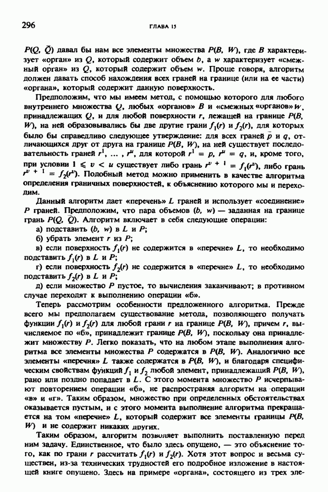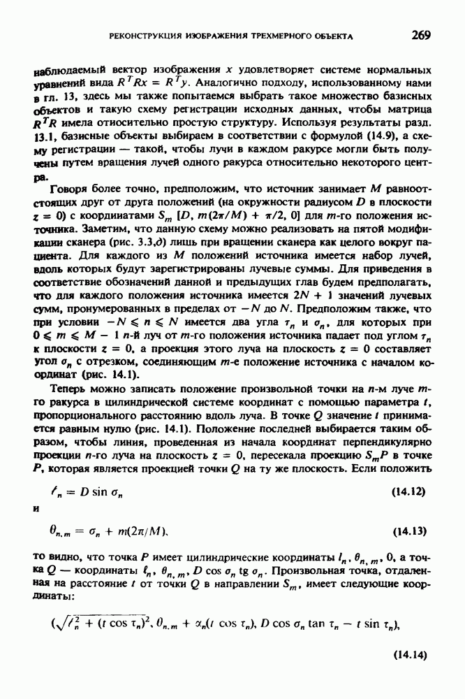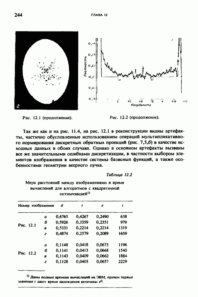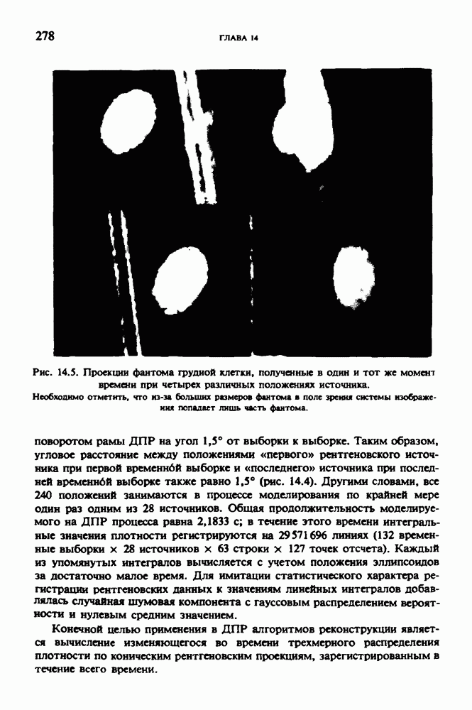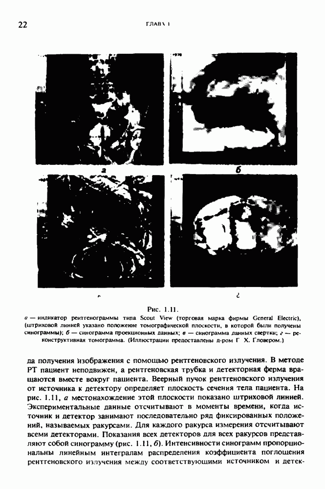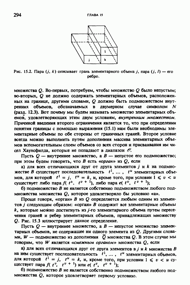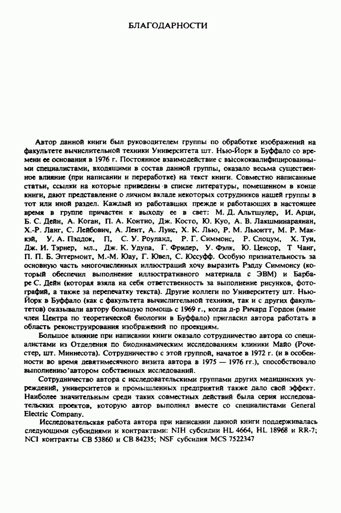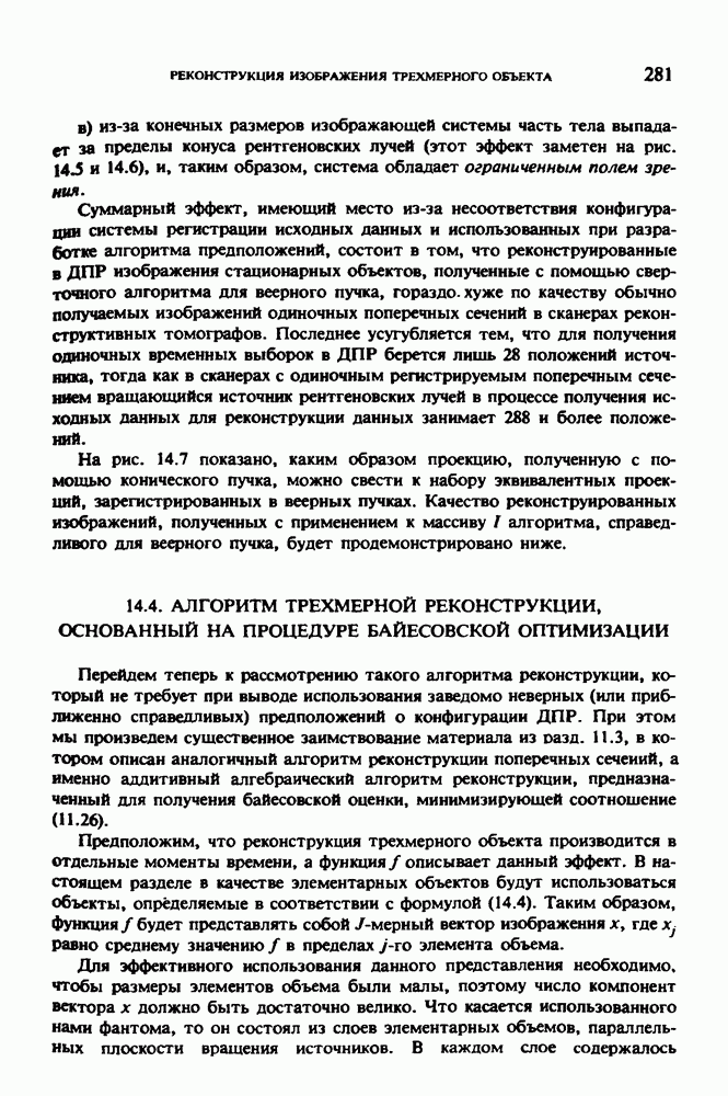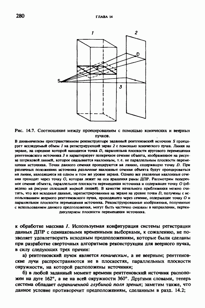 Рис. 15.6. Анатомическая структура фрагмента системы желудочков головного мозга человека. 1 — передние рога латерального желудочка; 2 — третий желудочек; 3 — четверохолмие; 4 — задние рога латерального желудочка. Рис. 15.7. (см. скан) Трехмерные проекции зарегистрированной поверхности системы желудочков головного мозга человека. Для формирования трехмерного изображения системы желудочков (рис. 15.7) были использованы все рассмотренные в трех предыдущих разделах операции определения границ органов, исключения скрытых их частей поверхности и наложения теней. Число зарегистрированных граничных граней для системы желудочков составляло 8970, при этом регистрация множества из 80 х 80 х 38 элементарных объемов требует менее 0,5 мин машинного времени (на мини-ЭВМ типа Eclipse S/200). Последующие иллюстрации относятся к отображению области спинного мозга пациента, страдающего дисрафизмом (напомним, что дисрафизм — это заболевание, при котором спинной мозг развивается ненормально). На рис. 15.8 представлено реконструированное изображение поперечного сечения тела пациента, на котором хорошо видна костная спи-кула, разделяющая позвоночный столб. На рис. 15.8 нами выделена область, состоящая из Рис. 15.8. (см. скан) Поперечное сечение тела пациента, страдающего дисрафизмом. Костная спикула показана стрелкой. Рамкой обведена область, состоящая из изображения и содержащая изображение ствола спинного мозга. Каждая из ячеек имеет размеры 0,8 х 0,8 мм. Из серии восьми смежных срезов толщиной 1,5 мм методом линейной интерполяции формировался трехмерный массив усредненных плотностей, состоящий из Проблема отображения срезов толщиной 1,5 мм состоит в том, что для «заполнения» элементарными объемами значительной части спинного мозга требуется большое число срезов. Один и тот же пациент должен быть просканирован 10 раз для получения смежных срезов толщиной 5 мм, а затем по этим срезам необходимо формировать трехмерный массив, содержащий в данном случае Рис. 15.9. (см. скан) Два последовательных среза толщиной 0,8 мм, вычисленных путем интерполяции данных по срезам толщиной 1,5 мм. — изображения, соответствующие приведенному в области из 96 х 96 элементов на рис. 15.8; б - совокупность элементов изображения с «высокими» значениями чисел Хаунсфилда показана светлой, причем выбор высоких значений был сделан для выделения костных тканей. рис. 15.10,б спикула не выглядит полностью отделенной от спинного мозга. Это изображение — иллюстрация возникающего эффекта частичного заполнения, описанного в разд. 3.3. Изображение спикулы настолько тонкое, что не может заполнить полностью элементарный объем в срезах толщиной 5 мм, поэтому числа Хаунсфилда в пределах среза неточно характеризуют коэффициент линейного ослабления рентгеновского излучения в костных тканях спикулы. Напротив, срезы толщиной 1,5 мм оказываются достаточно тонкими и позволяют получить точные значения чисел Хаунсфилда (рис. 15.9); при этом спикула на изображении идентифицируется достаточно точно. Это явление иллюстрируется также рис. 15.11 и 15.12, где левые изображения получены по серии из 10 срезов толщиной 5 мм, а правые — по серии из 8 срезов толщиной 1,5 мм. На рис. 15.11,а и 15.12,а за основу взяты изображения рис. 15.8 — 15.10, в которых фрагмент из 96 х 96 элементов изображения использовался для идентификации спинного мозга в целом. На р
