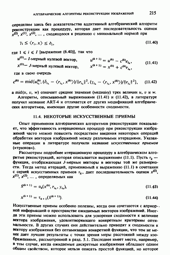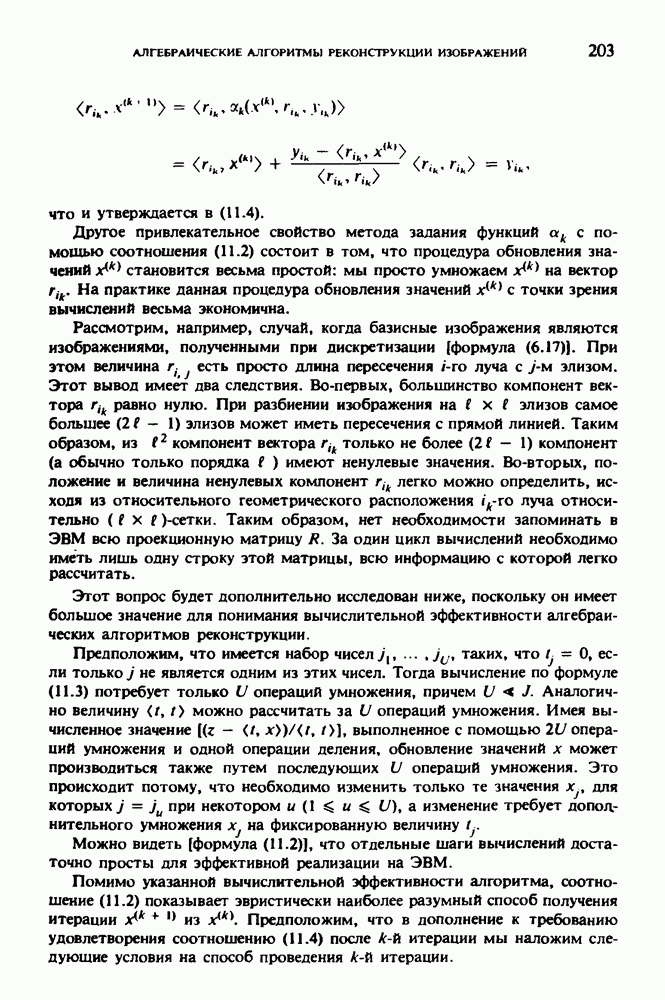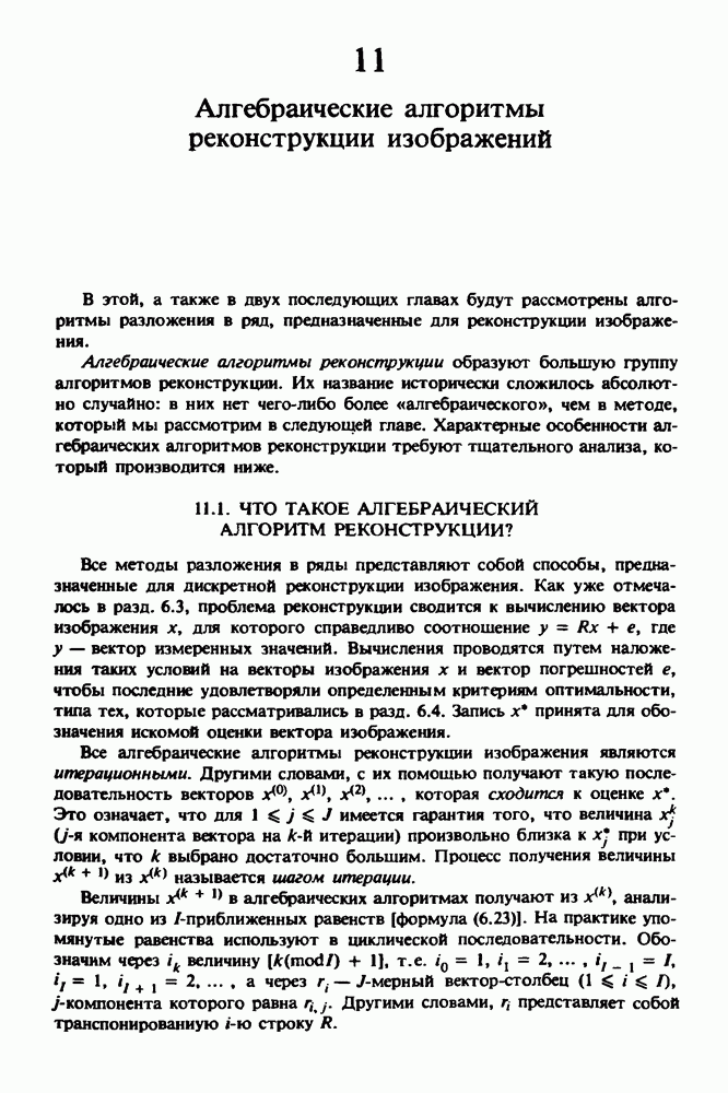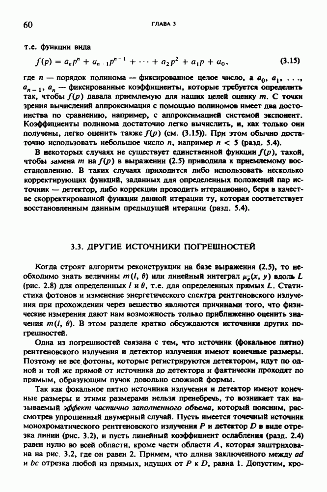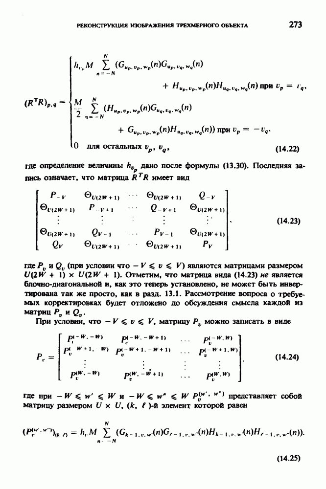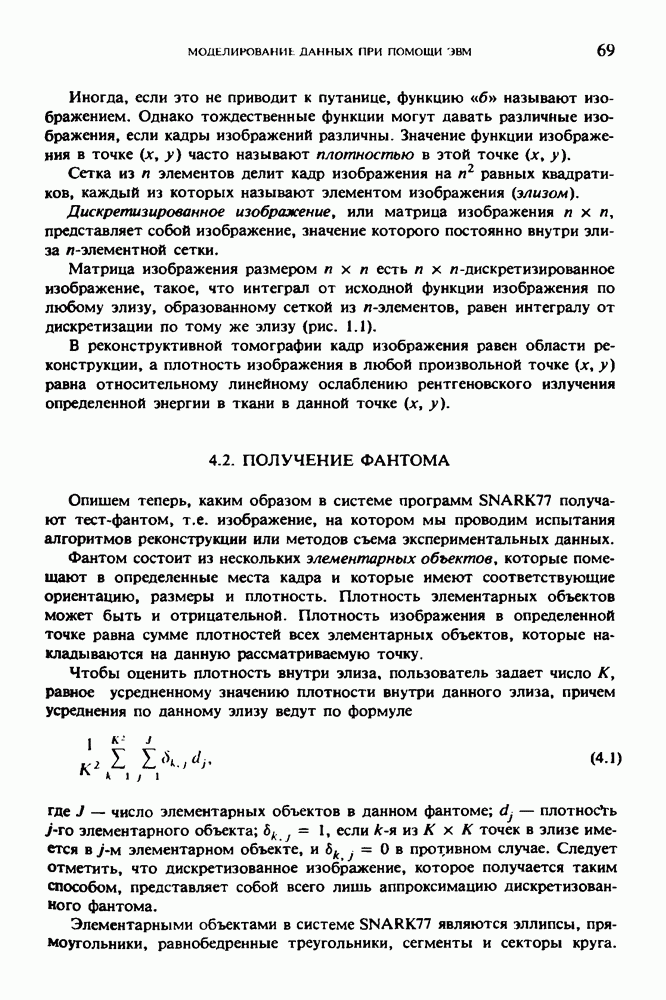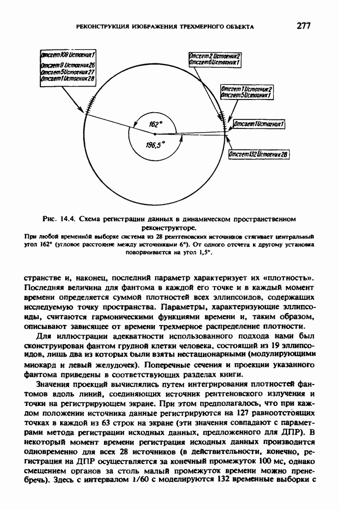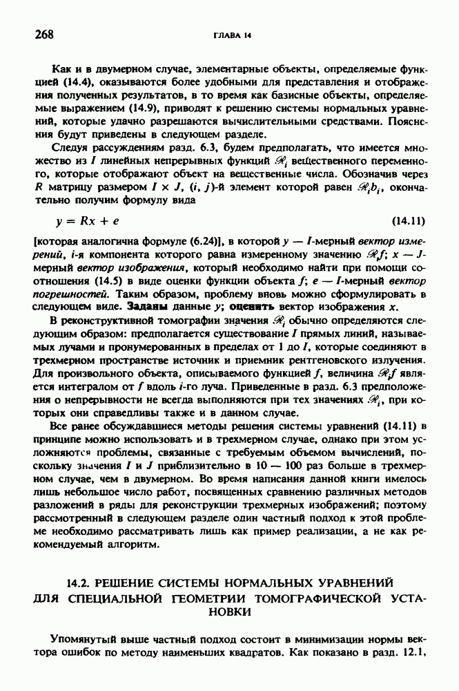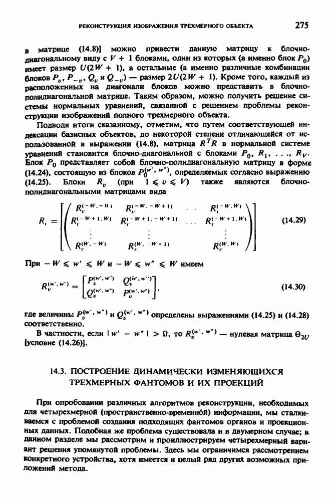 Рис. 15.6. Анатомическая структура фрагмента системы желудочков головного мозга человека. 1 — передние рога латерального желудочка; 2 — третий желудочек; 3 — четверохолмие; 4 — задние рога латерального желудочка. Рис. 15.7. (см. скан) Трехмерные проекции зарегистрированной поверхности системы желудочков головного мозга человека. Для формирования трехмерного изображения системы желудочков (рис. 15.7) были использованы все рассмотренные в трех предыдущих разделах операции определения границ органов, исключения скрытых их частей поверхности и наложения теней. Число зарегистрированных граничных граней для системы желудочков составляло 8970, при этом регистрация множества из 80 х 80 х 38 элементарных объемов требует менее 0,5 мин машинного времени (на мини-ЭВМ типа Eclipse S/200). Последующие иллюстрации относятся к отображению области спинного мозга пациента, страдающего дисрафизмом (напомним, что дисрафизм — это заболевание, при котором спинной мозг развивается ненормально). На рис. 15.8 представлено реконструированное изображение поперечного сечения тела пациента, на котором хорошо видна костная спи-кула, разделяющая позвоночный столб. На рис. 15.8 нами выделена область, состоящая из Рис. 15.8. (см. скан) Поперечное сечение тела пациента, страдающего дисрафизмом. Костная спикула показана стрелкой. Рамкой обведена область, состоящая из изображения и содержащая изображение ствола спинного мозга. Каждая из ячеек имеет размеры 0,8 х 0,8 мм. Из серии восьми смежных срезов толщиной 1,5 мм методом линейной интерполяции формировался трехмерный массив усредненных плотностей, состоящий из Проблема отображения срезов толщиной 1,5 мм состоит в том, что для «заполнения» элементарными объемами значительной части спинного мозга требуется большое число срезов. Один и тот же пациент должен быть просканирован 10 раз для получения смежных срезов толщиной 5 мм, а затем по этим срезам необходимо формировать трехмерный массив, содержащий в данном случае Рис. 15.9. (см. скан) Два последовательных среза толщиной 0,8 мм, вычисленных путем интерполяции данных по срезам толщиной 1,5 мм. — изображения, соответствующие приведенному в области из 96 х 96 элементов на рис. 15.8; б - совокупность элементов изображения с «высокими» значениями чисел Хаунсфилда показана светлой, причем выбор высоких значений был сделан для выделения костных тканей. рис. 15.10,б спикула не выглядит полностью отделенной от спинного мозга. Это изображение — иллюстрация возникающего эффекта частичного заполнения, описанного в разд. 3.3. Изображение спикулы настолько тонкое, что не может заполнить полностью элементарный объем в срезах толщиной 5 мм, поэтому числа Хаунсфилда в пределах среза неточно характеризуют коэффициент линейного ослабления рентгеновского излучения в костных тканях спикулы. Напротив, срезы толщиной 1,5 мм оказываются достаточно тонкими и позволяют получить точные значения чисел Хаунсфилда (рис. 15.9); при этом спикула на изображении идентифицируется достаточно точно. Это явление иллюстрируется также рис. 15.11 и 15.12, где левые изображения получены по серии из 10 срезов толщиной 5 мм, а правые — по серии из 8 срезов толщиной 1,5 мм. На рис. 15.11,а и 15.12,а за основу взяты изображения рис. 15.8 — 15.10, в которых фрагмент из 96 х 96 элементов изображения использовался для идентификации спинного мозга в целом. На р
