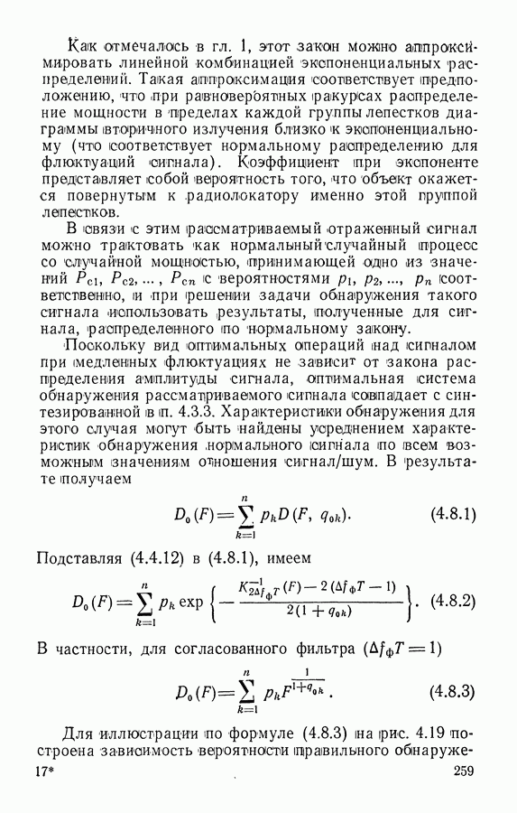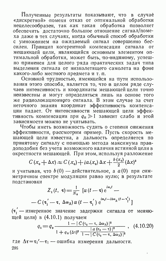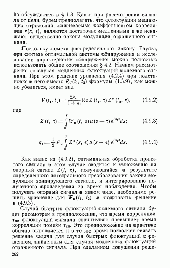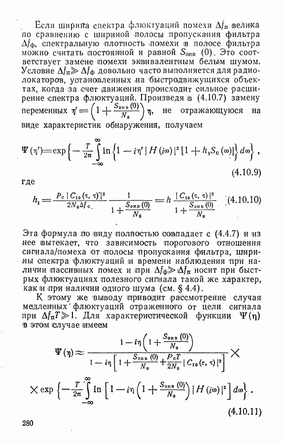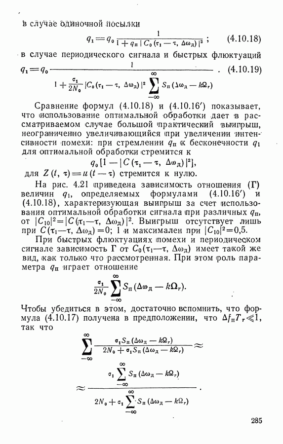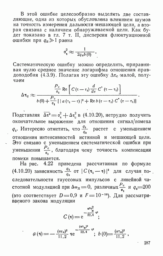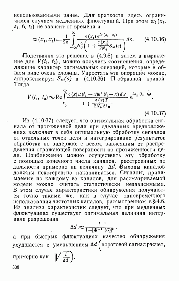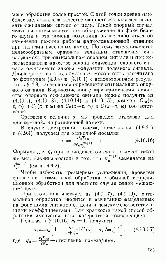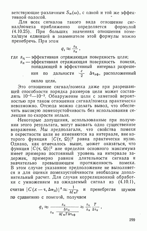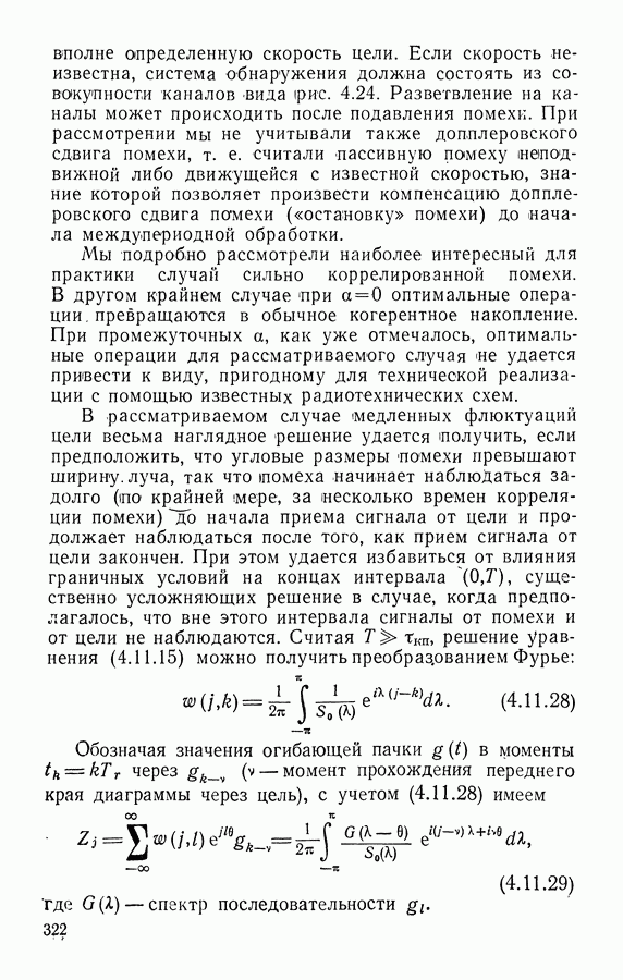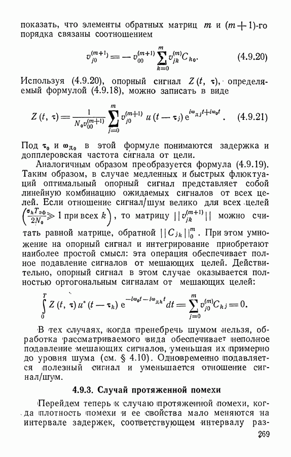 Аналогичным образом преобразуется формула (4.9.19). Таким образом, в случае медленных и быстрых флкжтуаций оптимальный опорный сигнал представляет собой линейную комбинацию ожидаемых сигналов от всех целей. Если отношение сигнал/шум велико для всех целей