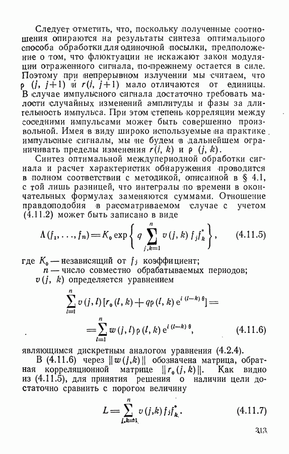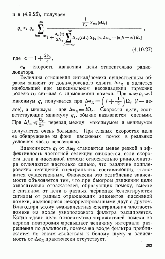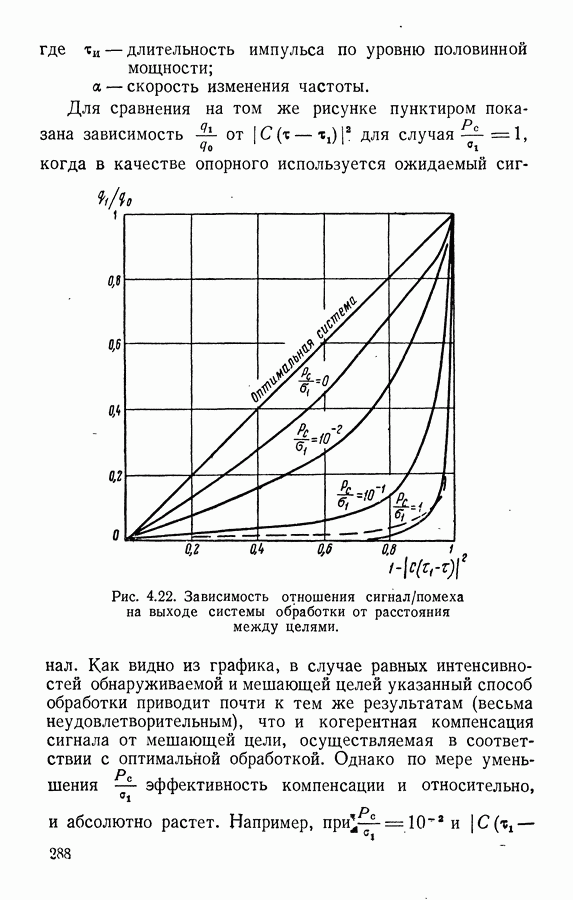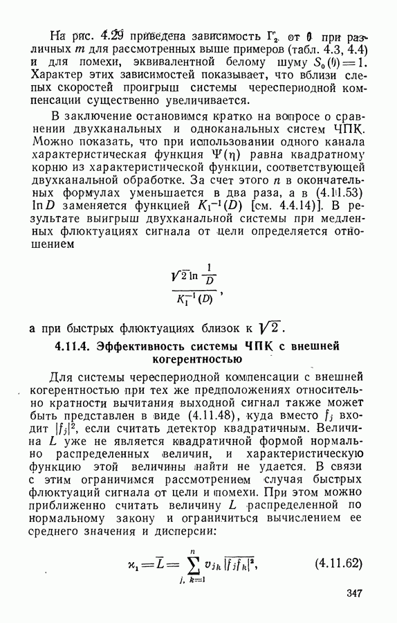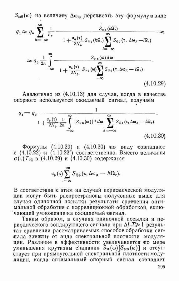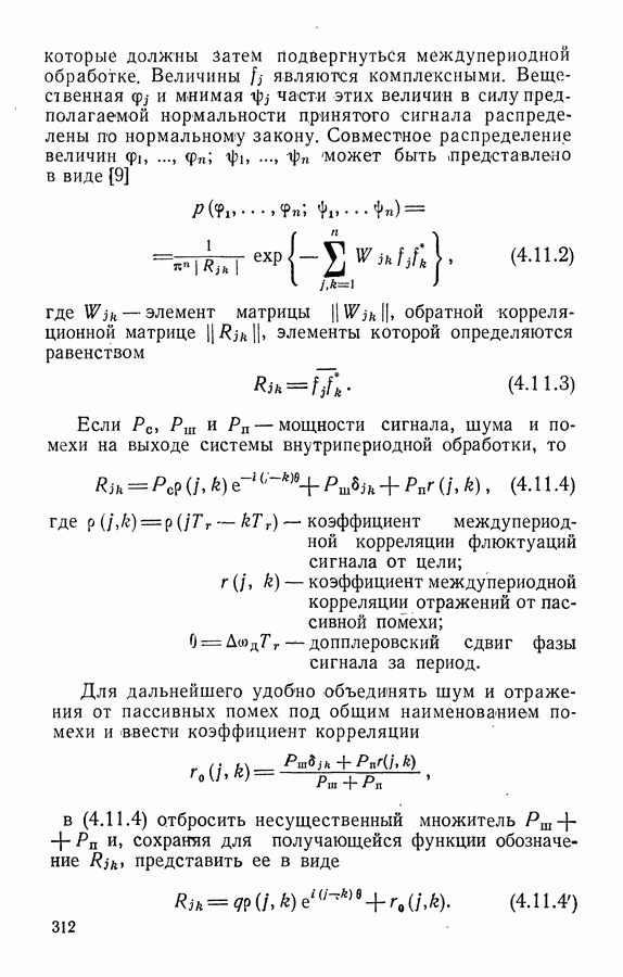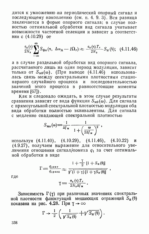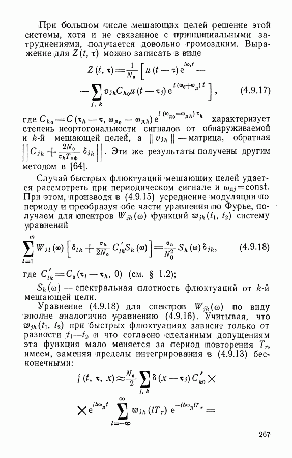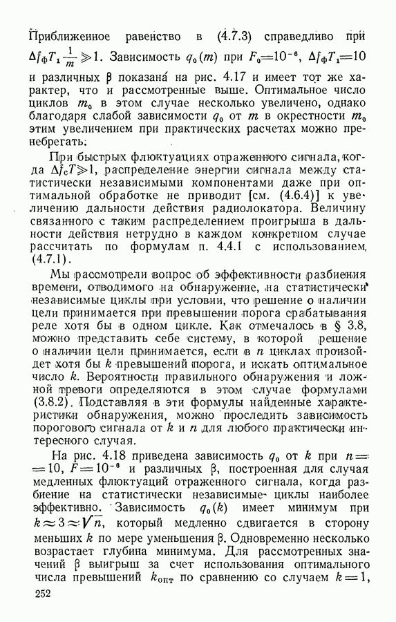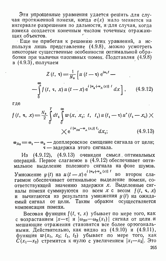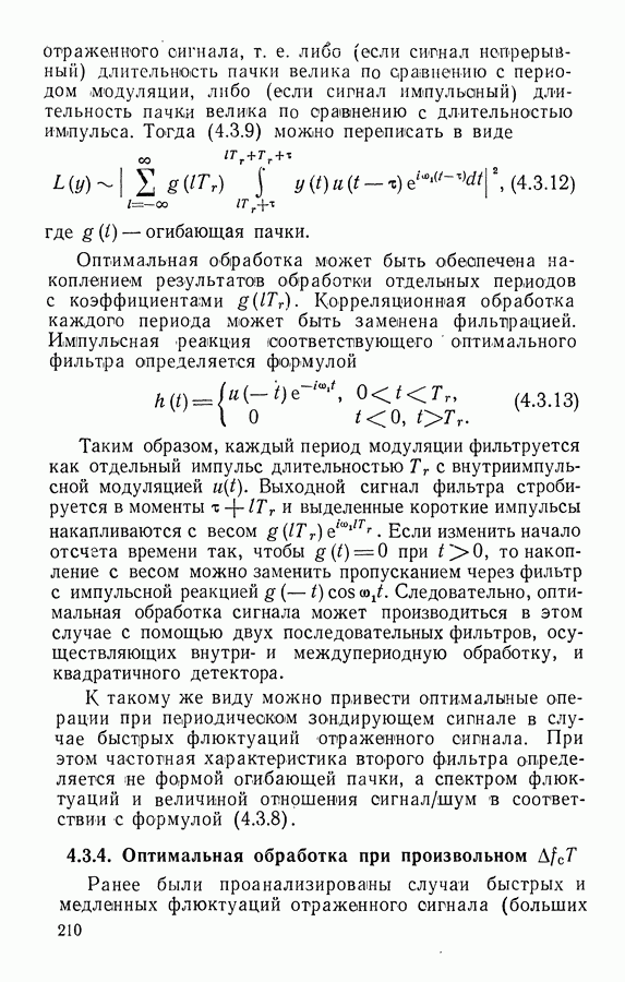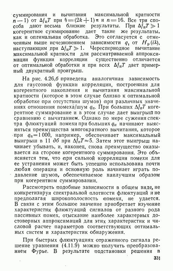 Аналогичным образом преобразуется формула (4.9.19). Таким образом, в случае медленных и быстрых флкжтуаций оптимальный опорный сигнал представляет собой линейную комбинацию ожидаемых сигналов от всех целей. Если отношение сигнал/шум велико для всех целей