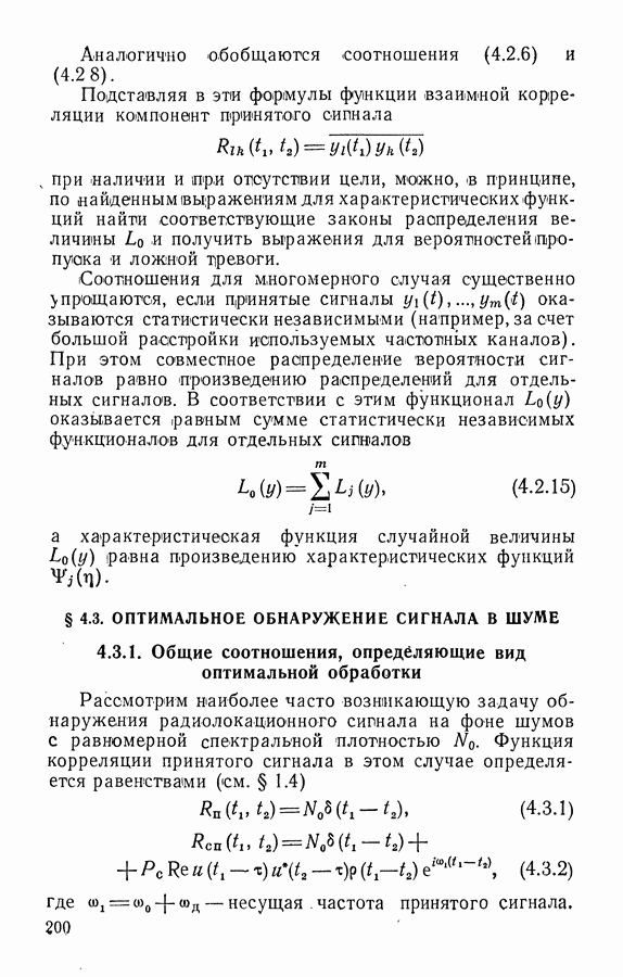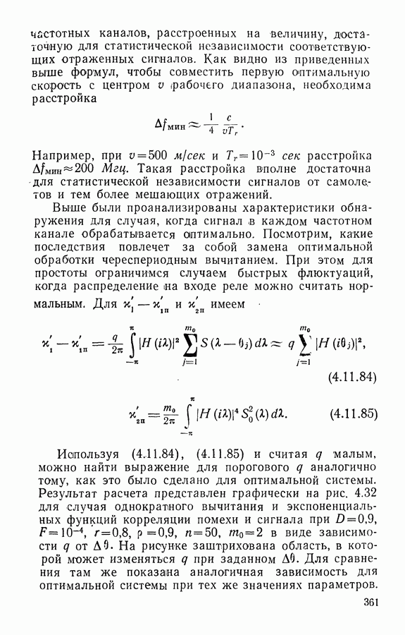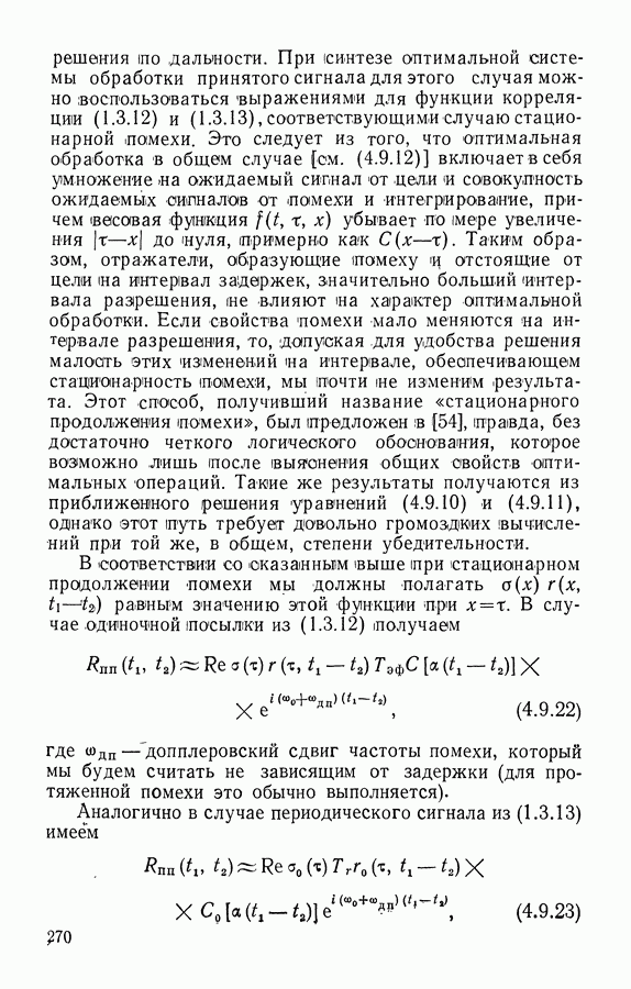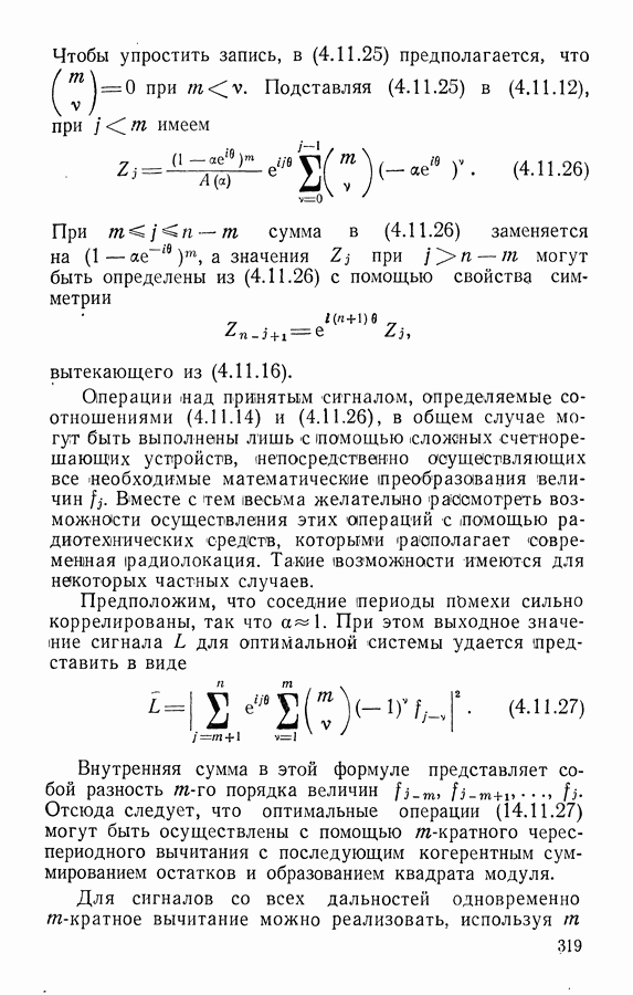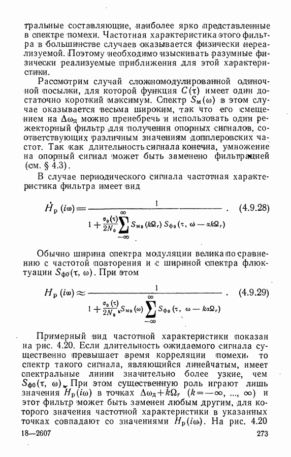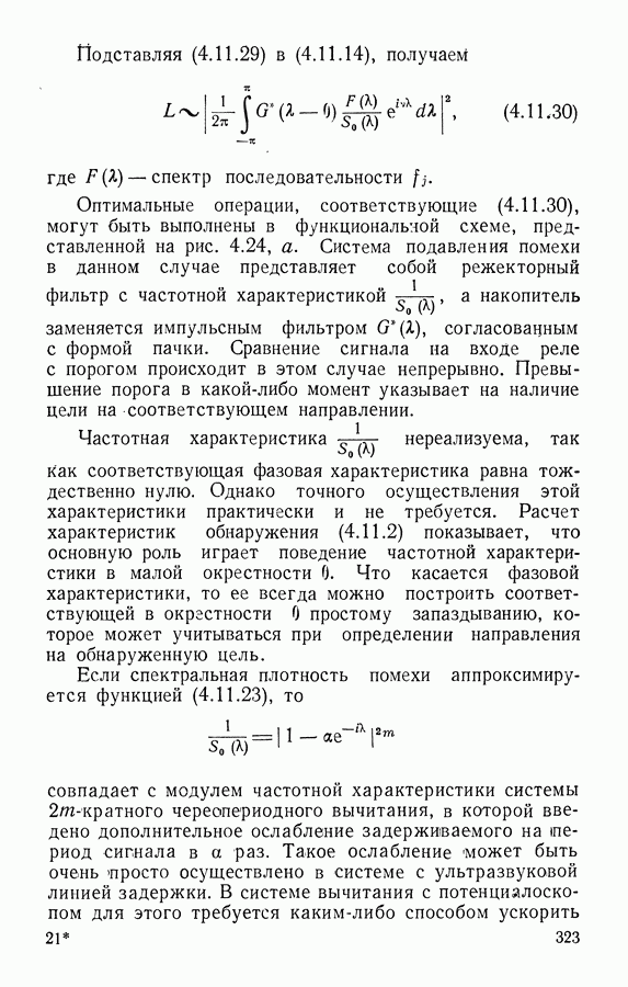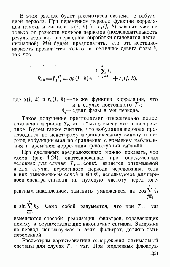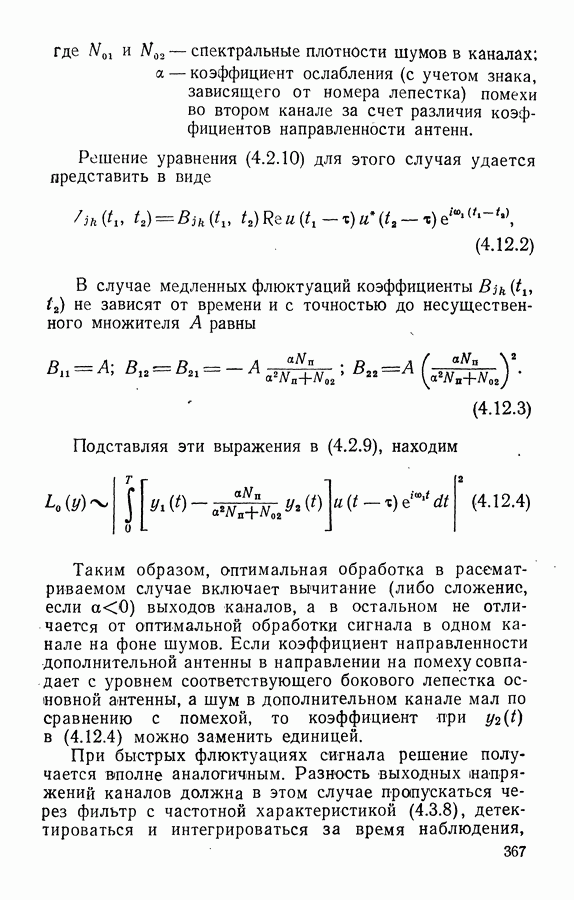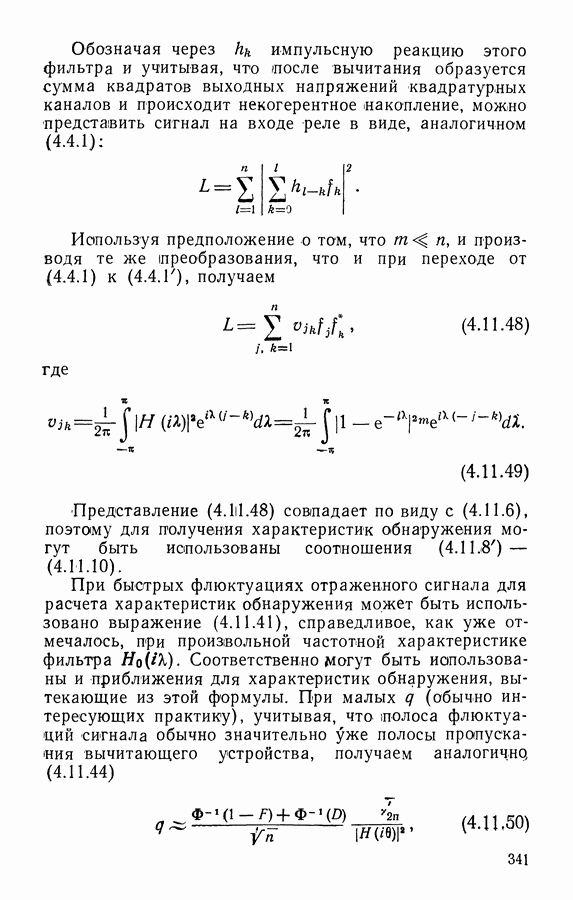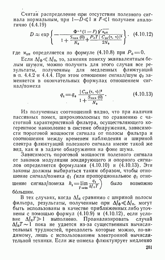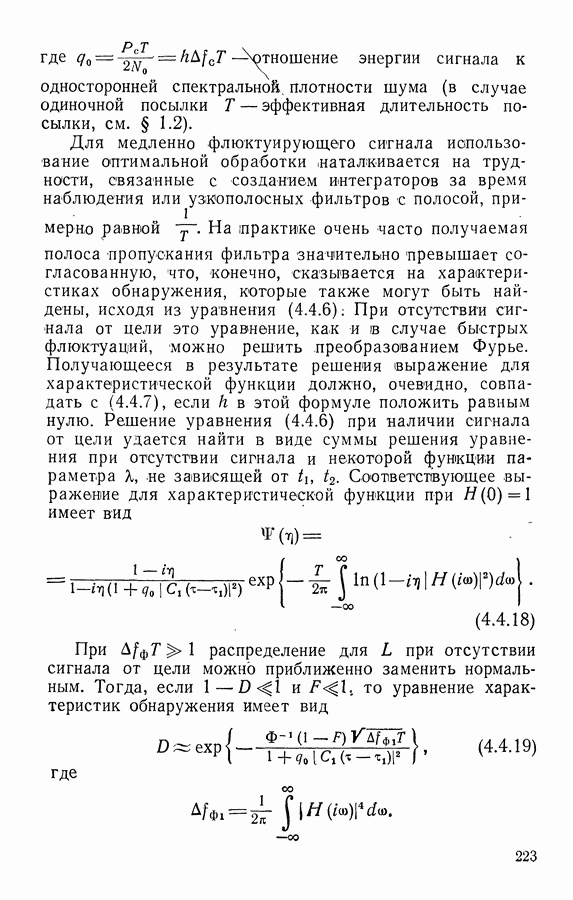 Аналогичным образом преобразуется формула (4.9.19). Таким образом, в случае медленных и быстрых флкжтуаций оптимальный опорный сигнал представляет собой линейную комбинацию ожидаемых сигналов от всех целей. Если отношение сигнал/шум велико для всех целей