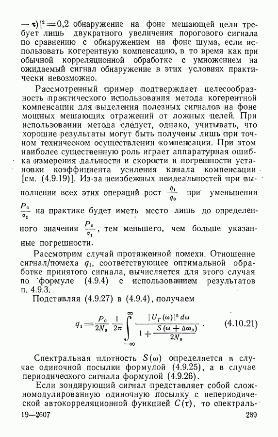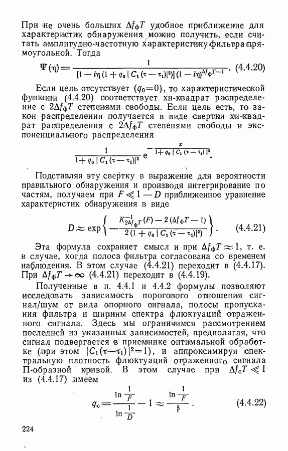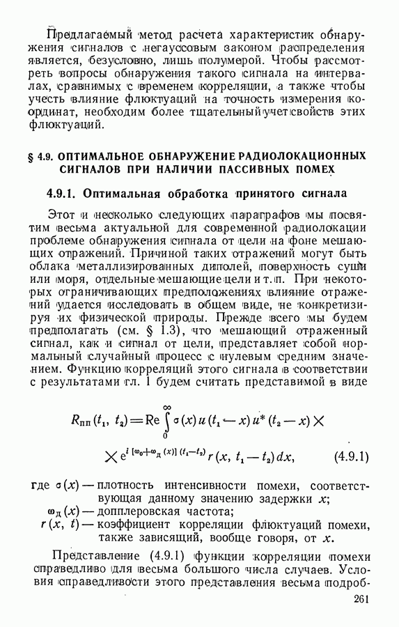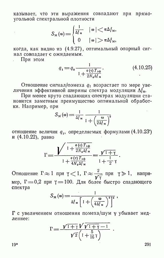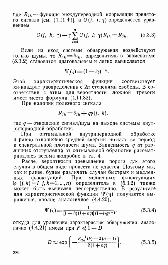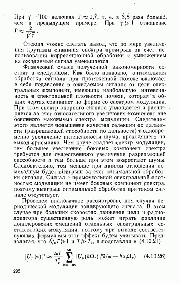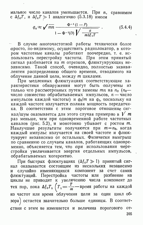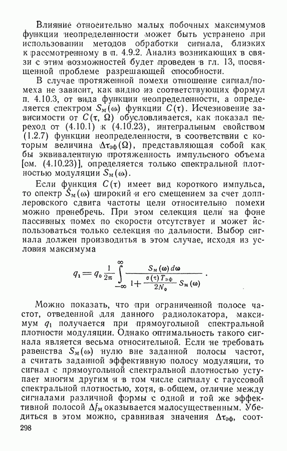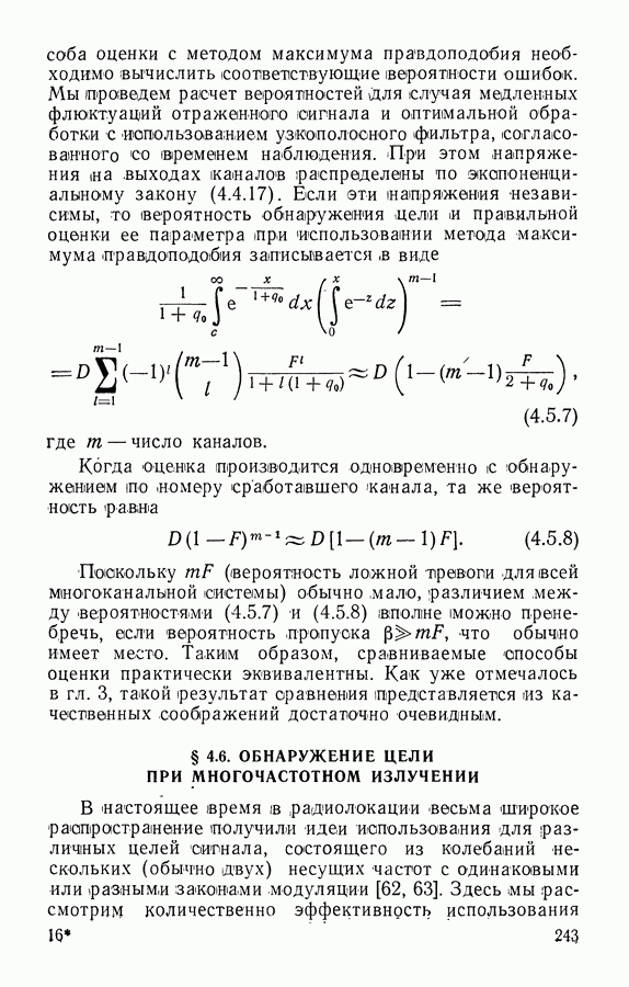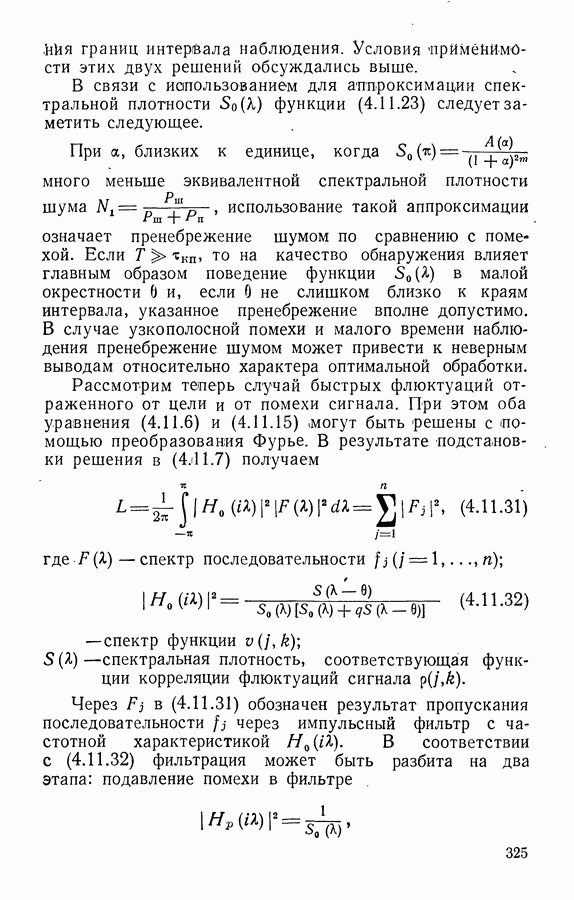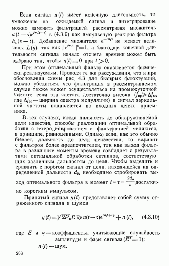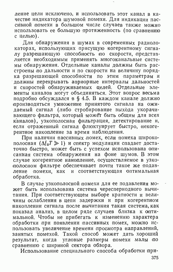 Аналогичным образом преобразуется формула (4.9.19). Таким образом, в случае медленных и быстрых флкжтуаций оптимальный опорный сигнал представляет собой линейную комбинацию ожидаемых сигналов от всех целей. Если отношение сигнал/шум велико для всех целей