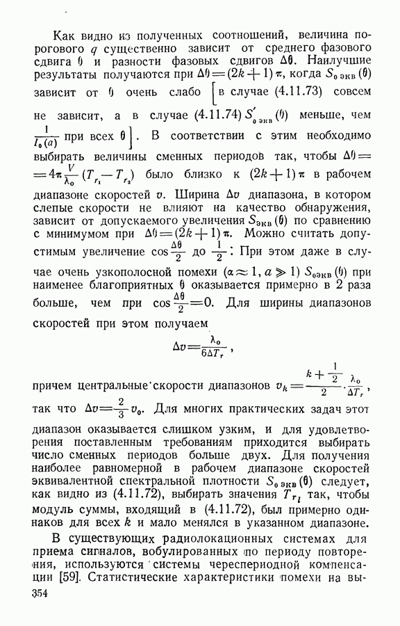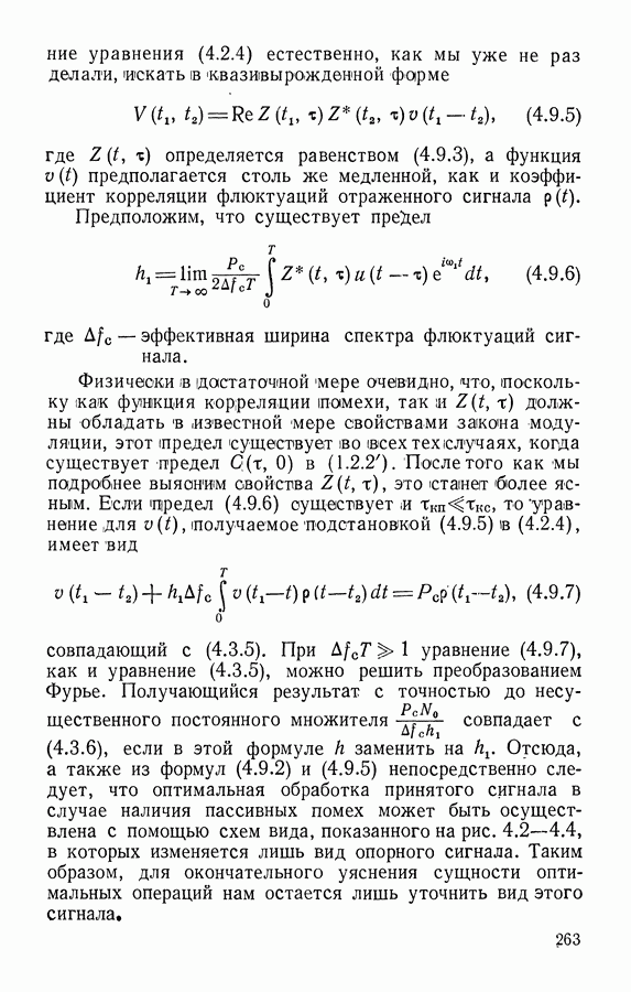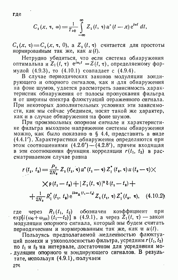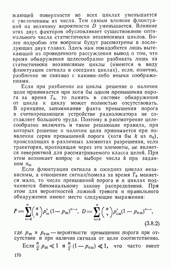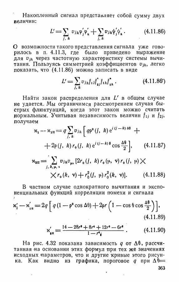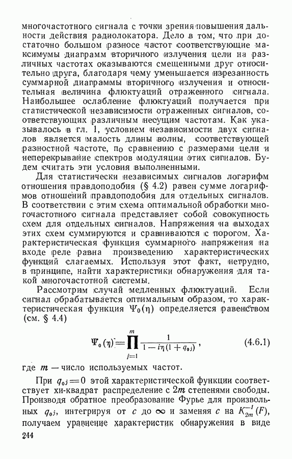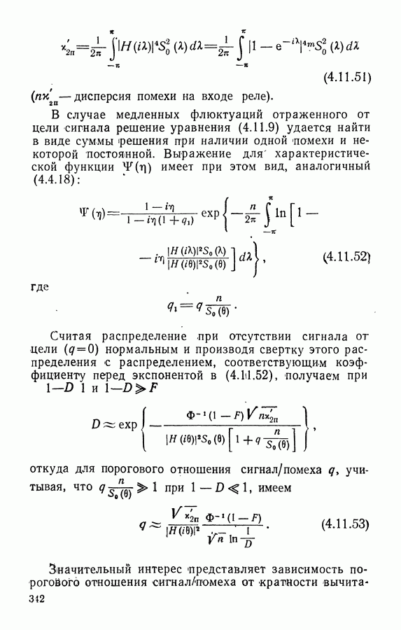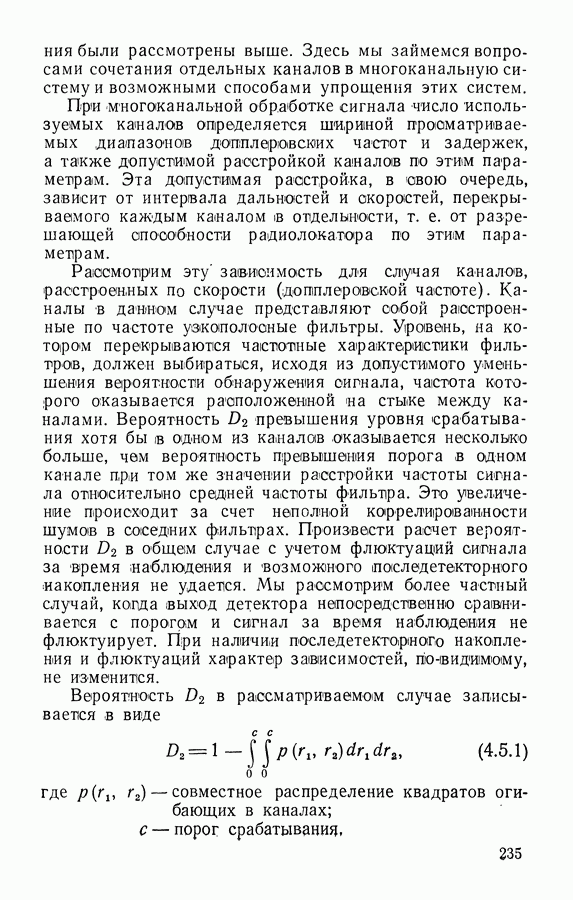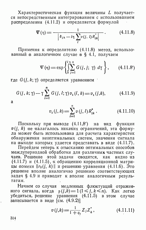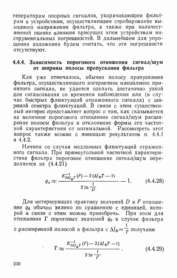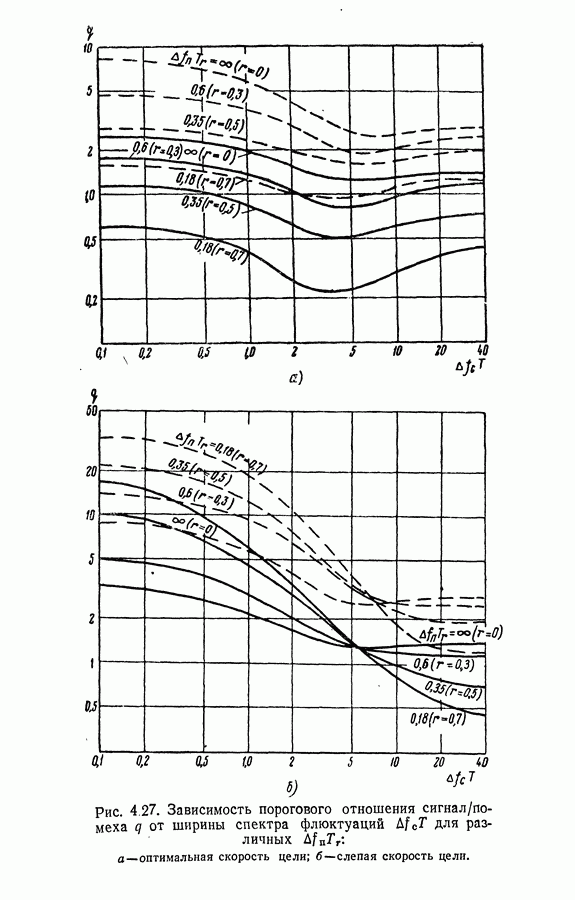 Аналогичным образом преобразуется формула (4.9.19). Таким образом, в случае медленных и быстрых флкжтуаций оптимальный опорный сигнал представляет собой линейную комбинацию ожидаемых сигналов от всех целей. Если отношение сигнал/шум велико для всех целей