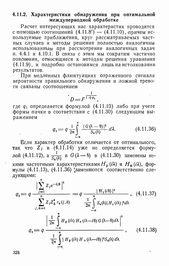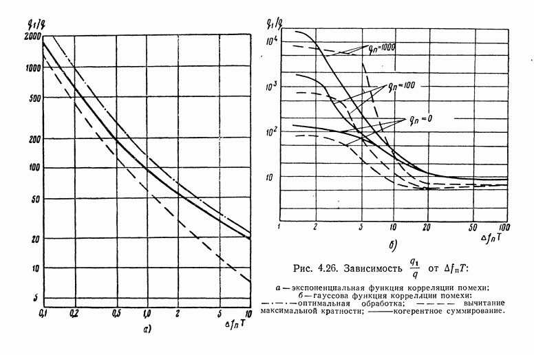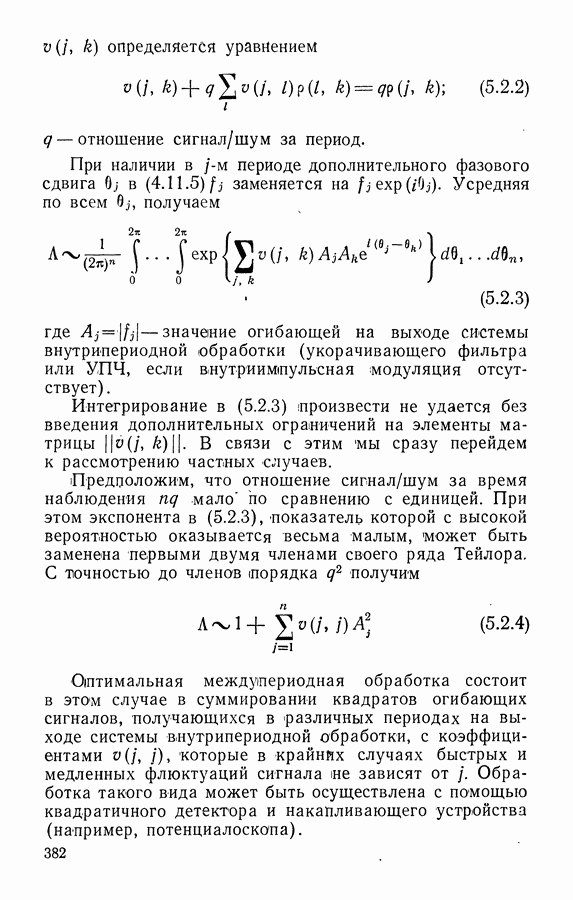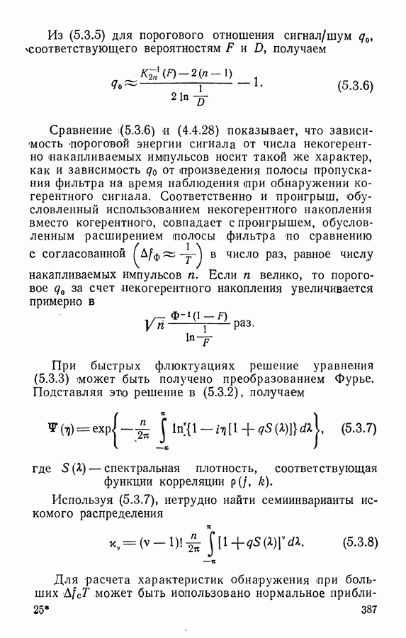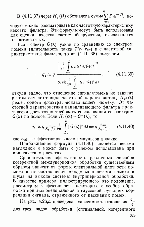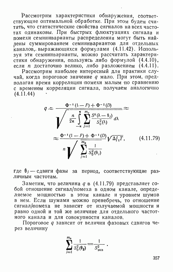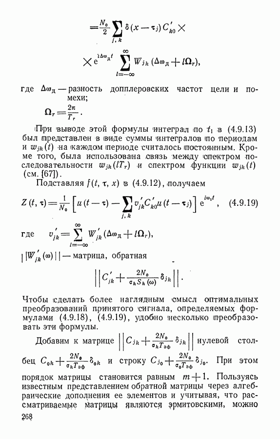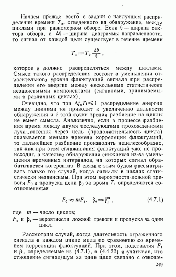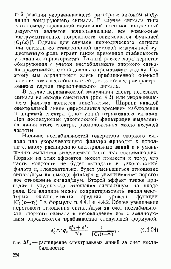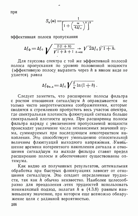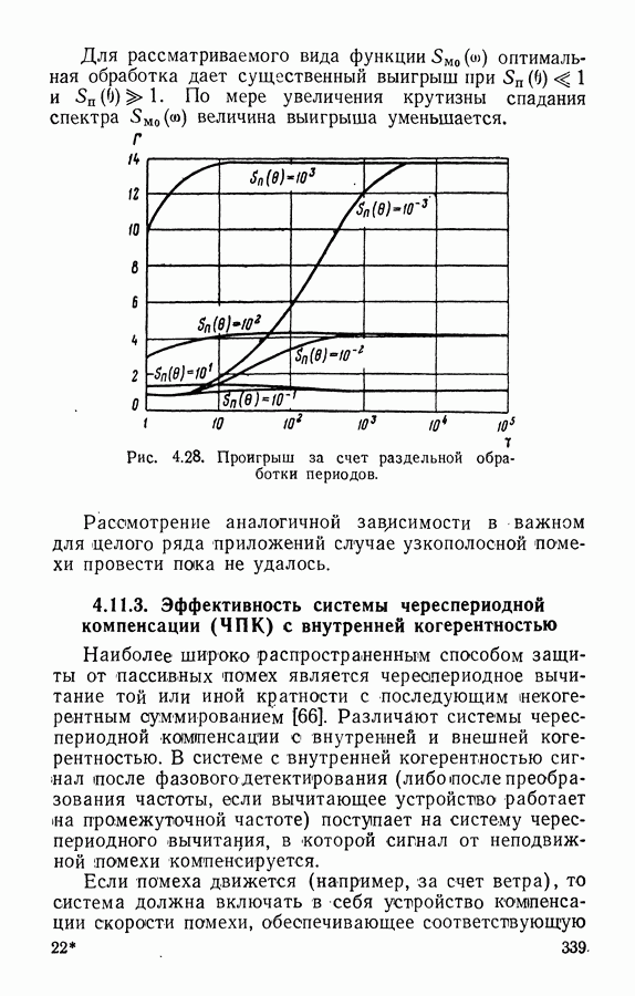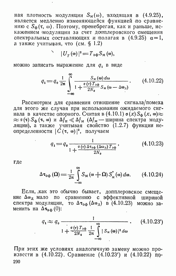 Аналогичным образом преобразуется формула (4.9.19). Таким образом, в случае медленных и быстрых флкжтуаций оптимальный опорный сигнал представляет собой линейную комбинацию ожидаемых сигналов от всех целей. Если отношение сигнал/шум велико для всех целей