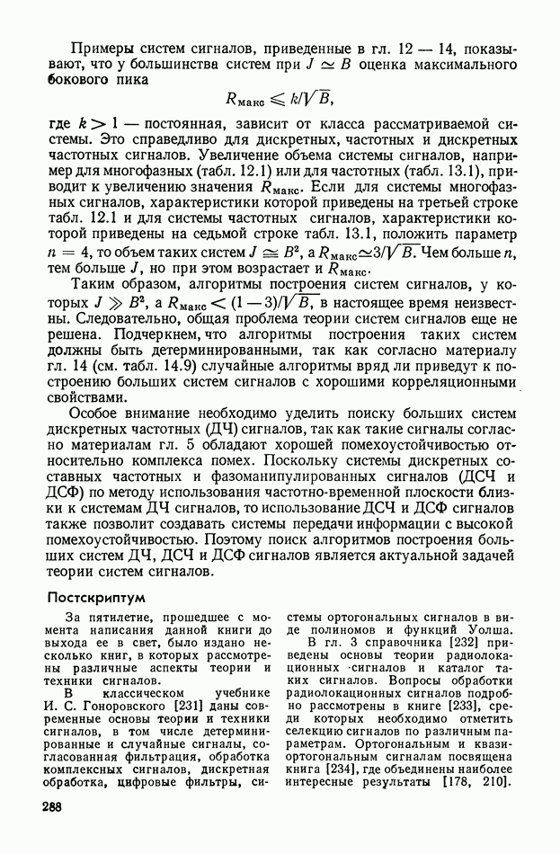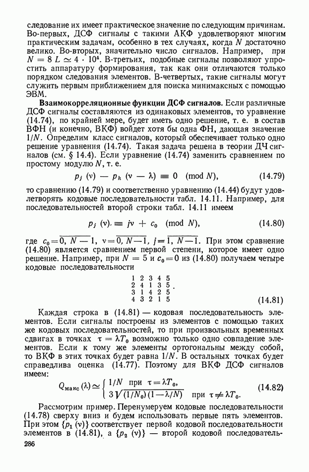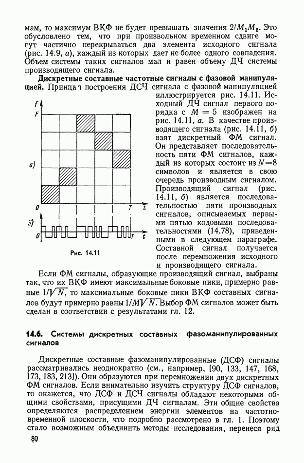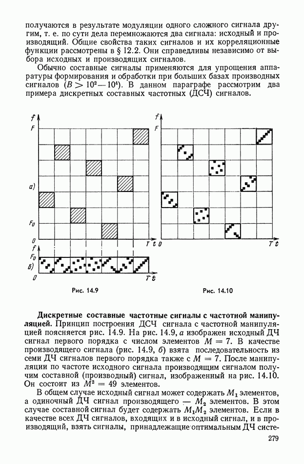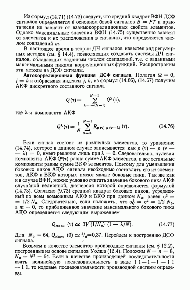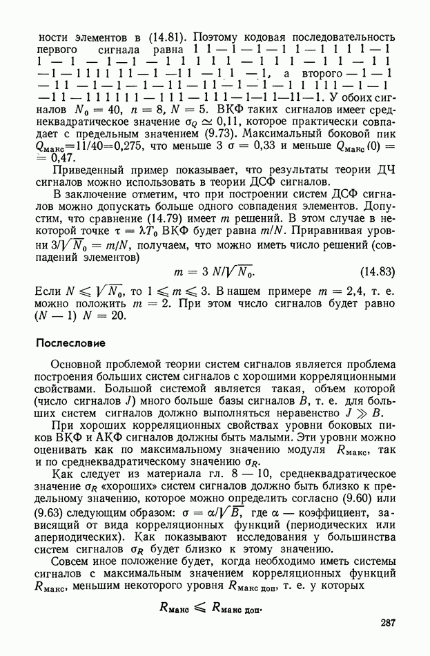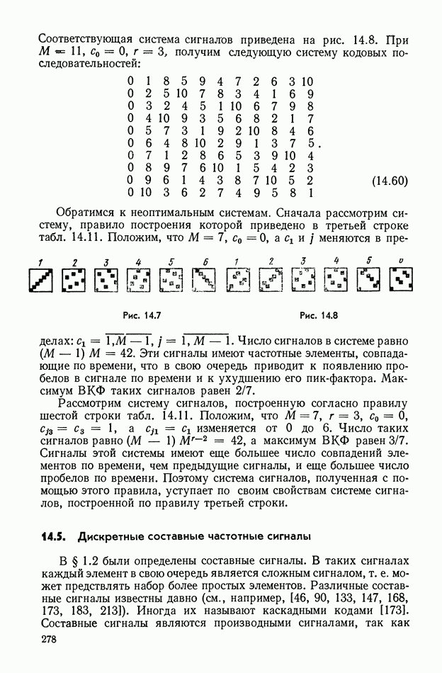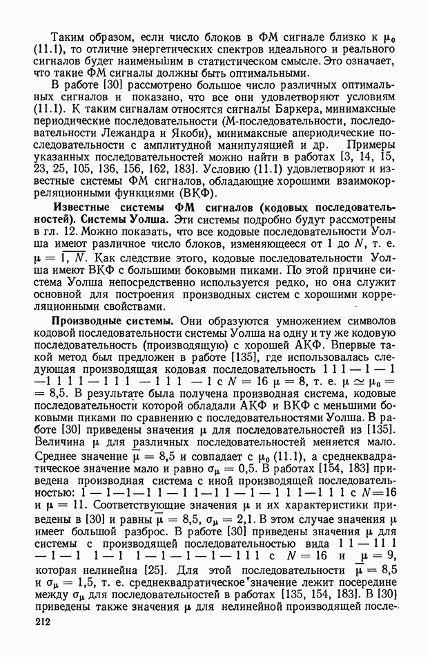 число элементов ФМ сигнала, а блок — последовательность одинаковых элементов (см. § 8.5). Это свойство подтверждается большим числом примеров как одиночных оптимальных ФМ сигналов, так и систем ФМ сигналов, рассматриваемых в данном параграфе. Такое свойство позволяет высказать гипотезу: оптимальные ФМ сигналы следует искать среди множества ФМ сигналов, которые удовлетворяют условию