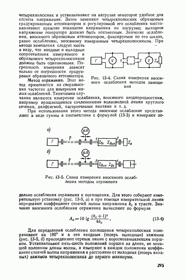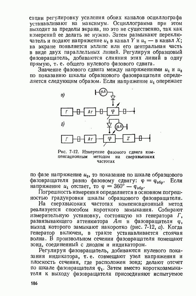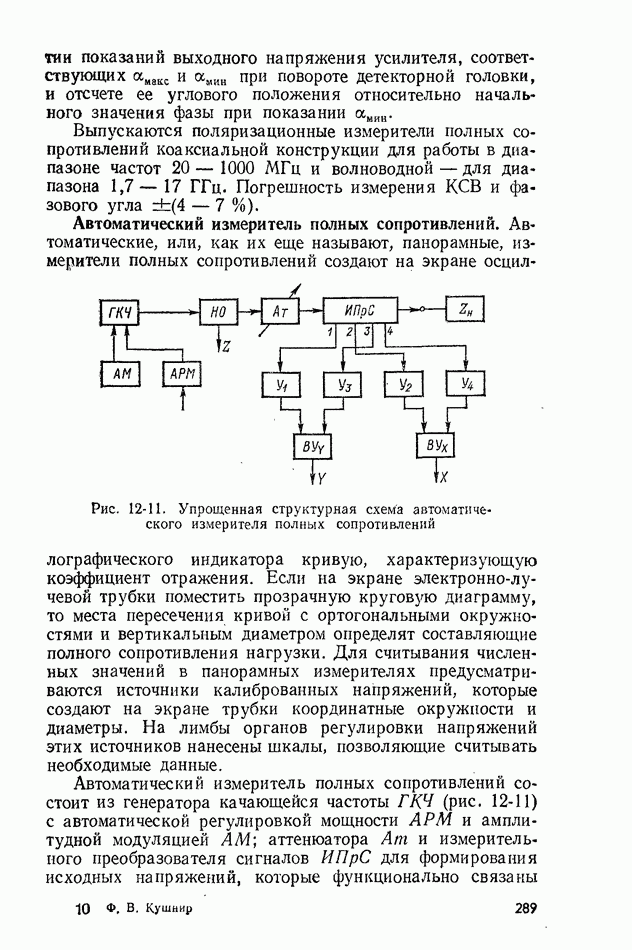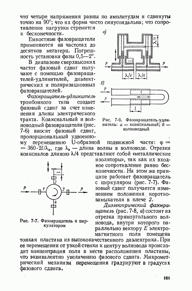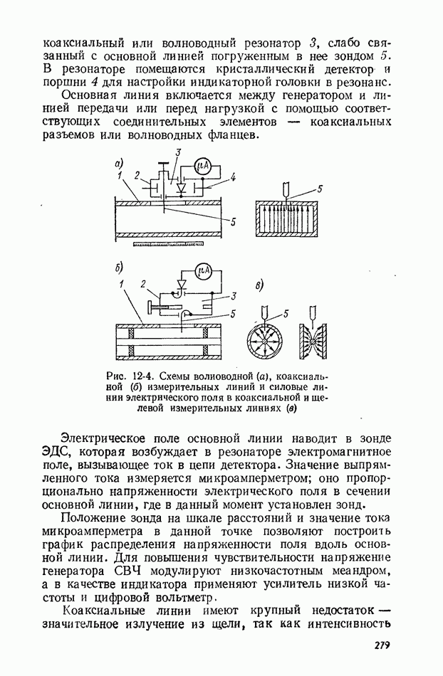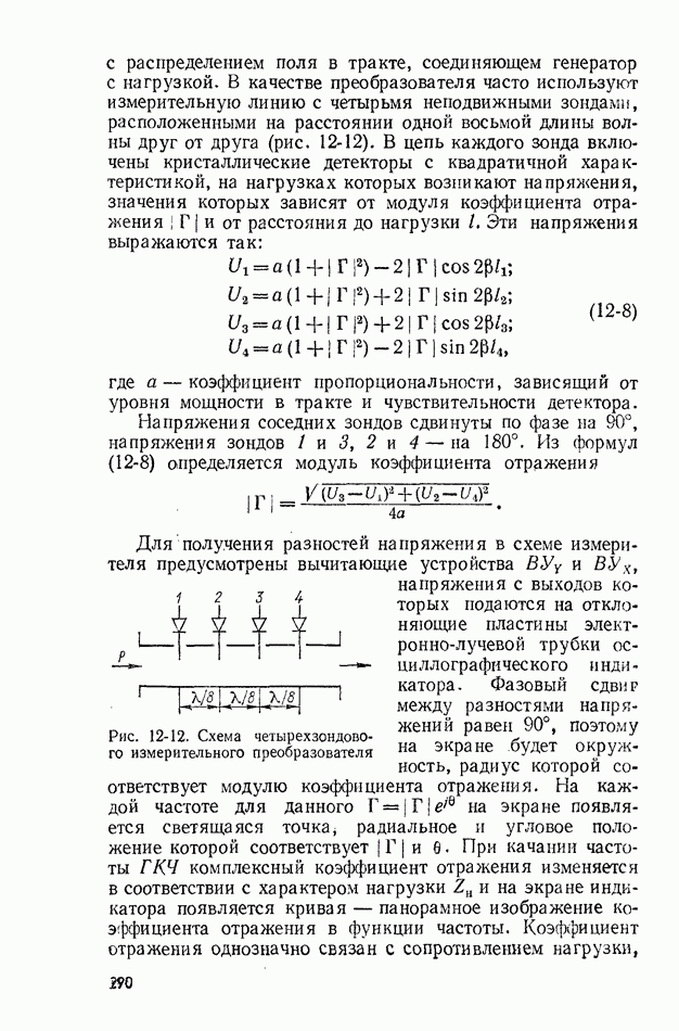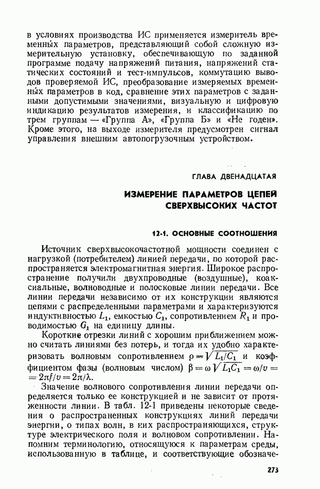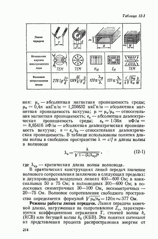 ГЛАВА ДВЕНАДЦАТАЯ. ИЗМЕРЕНИЕ ПАРАМЕТРОВ ЦЕПЕЙ СВЕРХВЫСОКИХ ЧАСТОТ12-1. ОСНОВНЫЕ СООТНОШЕНИЯИсточник сверхвысокочастотной мощности соединен с нагрузкой (потребителем) линией передачи, по которой распространяется электромагнитная энергия. Широкое распространение получили двухпроводные (воздушные), коаксиальные, волноводные и полосковые линии передачи. Все линии передачи независимо от их конструкции являются цепями с распределенными параметрами и характеризуются индуктивностью Короткие отрезки линий с хорошим приближением можно считать линиями без потерь, и тогда их удобно характеризовать волновым сопротивлением Значение волнового сопротивления линии передачи определяется только ее конструкцией и не зависит от протяженности линии. В табл. 12-1 приведены некоторые сведения о распространенных конструкциях линий передачи энергии, о типах волн, в них распространяющихся, структуре электрического поля и волновом сопротивлении. Напомним терминологию, относящуюся к параметрам среды, использованную в таблице, и соответствующие Таблица 12-1 (см. скан) обозначения: