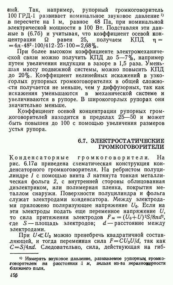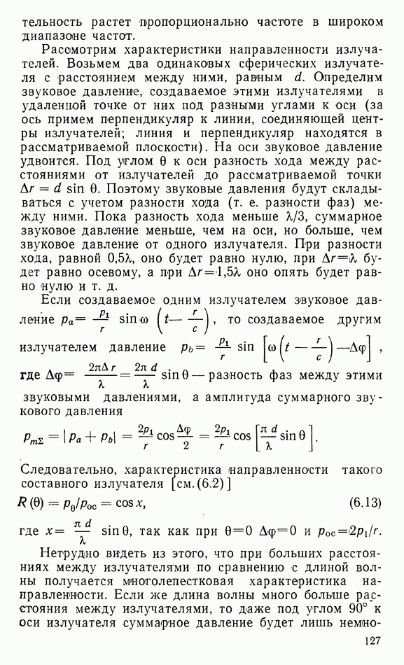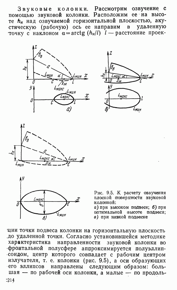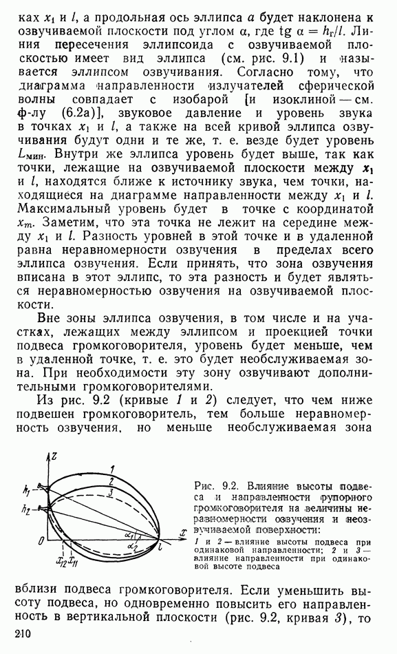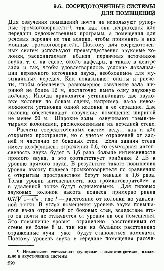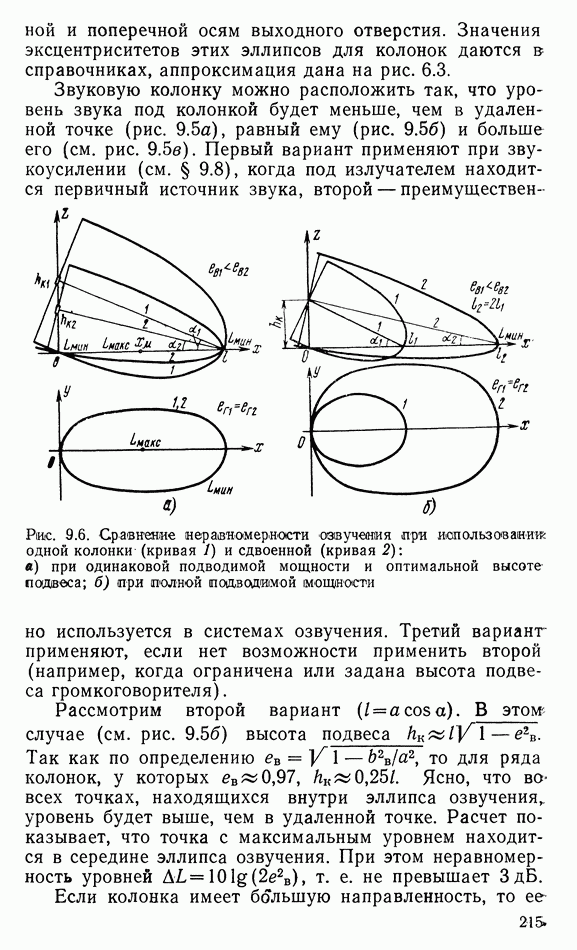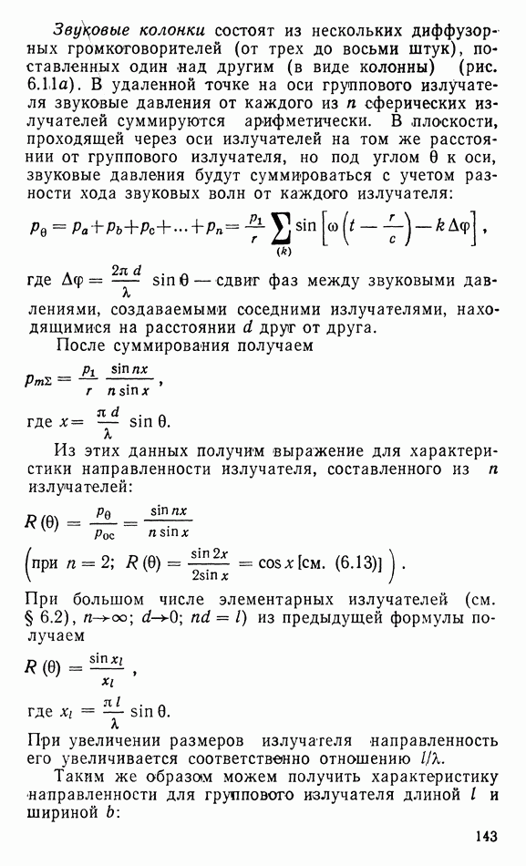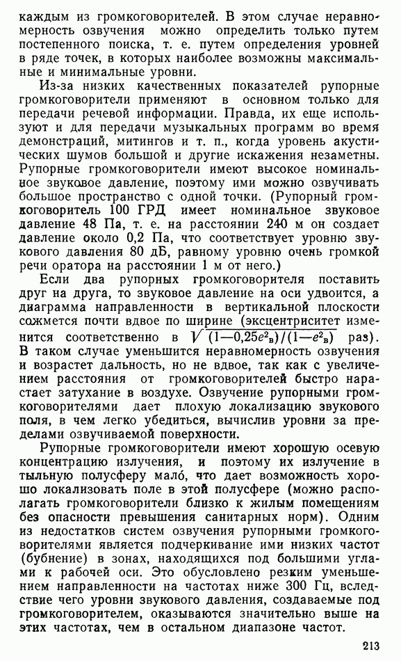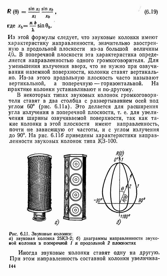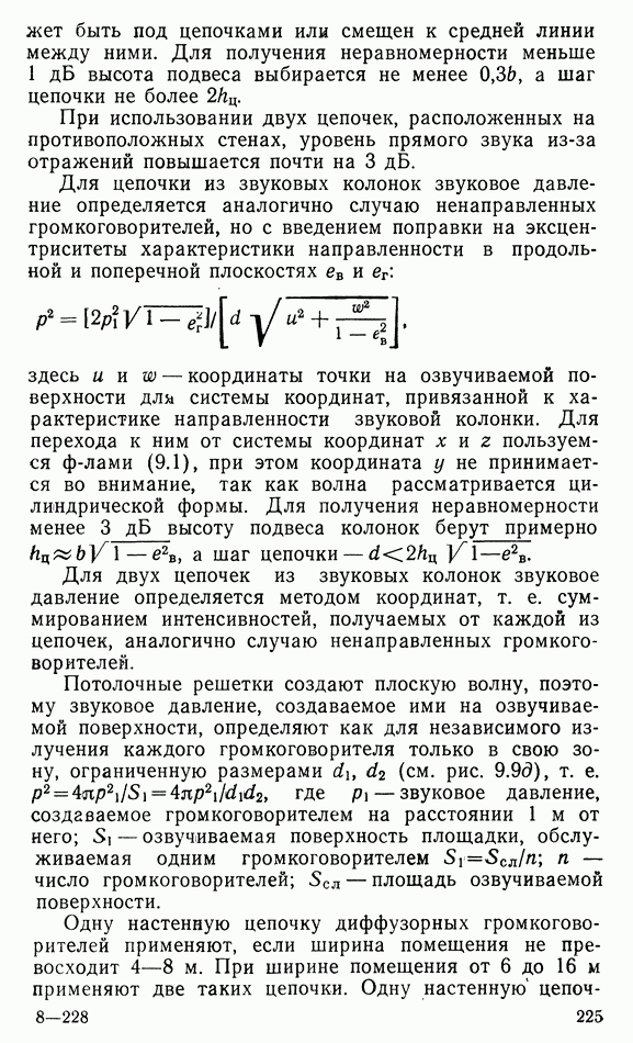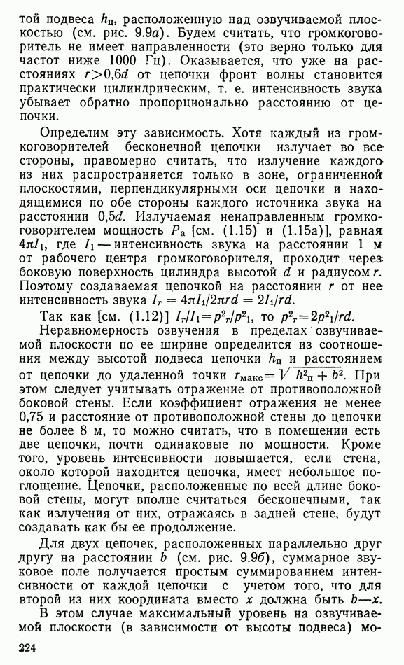 (кликните для просмотра скана) высотой подвеса Определим эту зависимость. Хотя каждый из громкоговорителей бесконечной цепочки излучает во все стороны, правомерно считать, что излучение каждого из них распространяется только в зоне, ограниченной плоскостями, перпендикулярными оси цепочки и находящимися по обе стороны каждого источника звука на расстоянии Так как Неравномерность озвучения в пределах озвучиваемой плоскости по ее ширине определится из соотношения между высотой подвеса цепочки Для двух цепочек, расположенных параллельно друг другу на расстоянии В этом случае максимальный уровень на озвучиваемой плоскости (в зависимости от высоты подвеса) может быть под цепочками или смещен к средней линии между ними. Для получения неравномерности меньше При использовании двух цепочек, расположенных на противоположных стенах, уровень прямого звука из-за отражений повышается почти на Для цепочки из звуковых колонок звуковое давление определяется аналогично случаю ненаправленных громкоговорителей, но с введением поправки на эксцентриситеты характеристики направленности в продольной и поперечной плоскостях