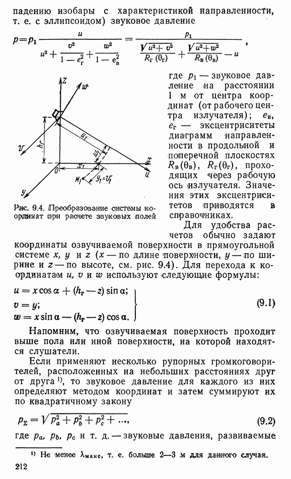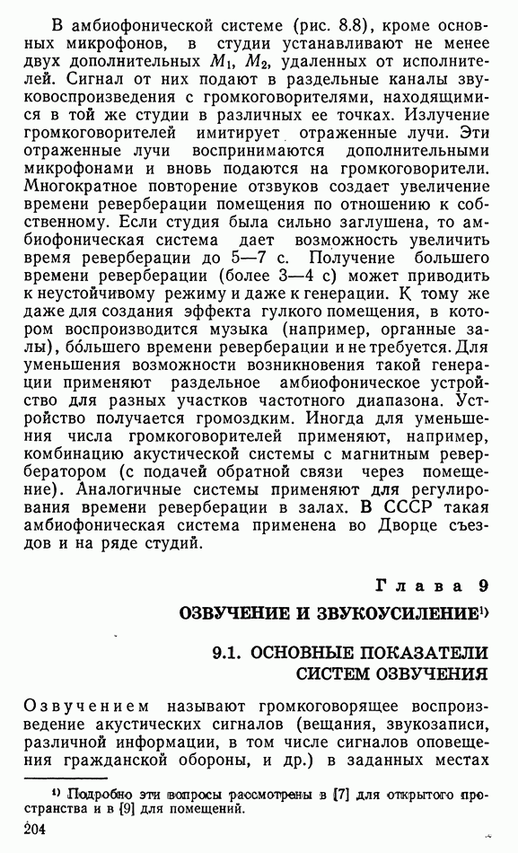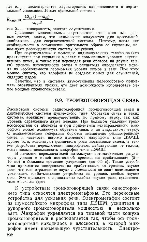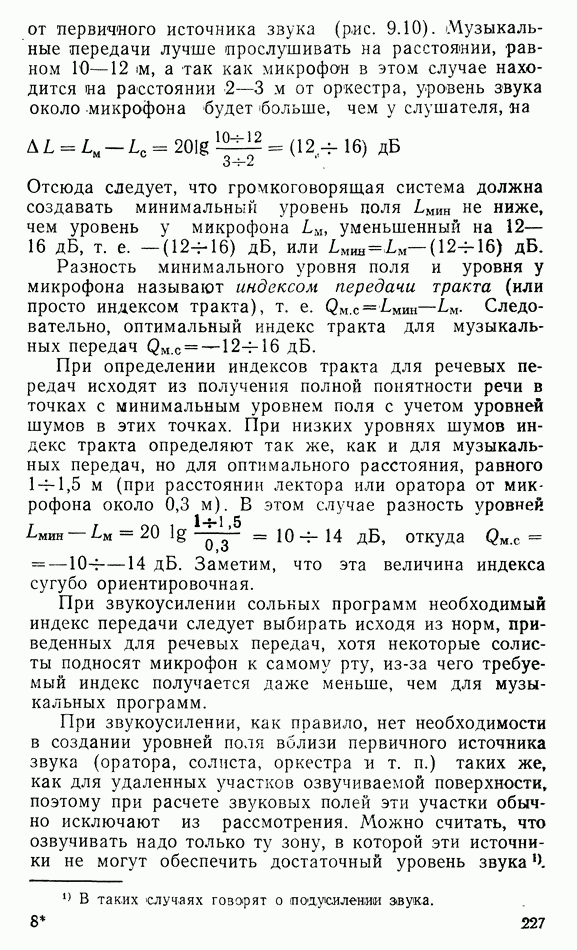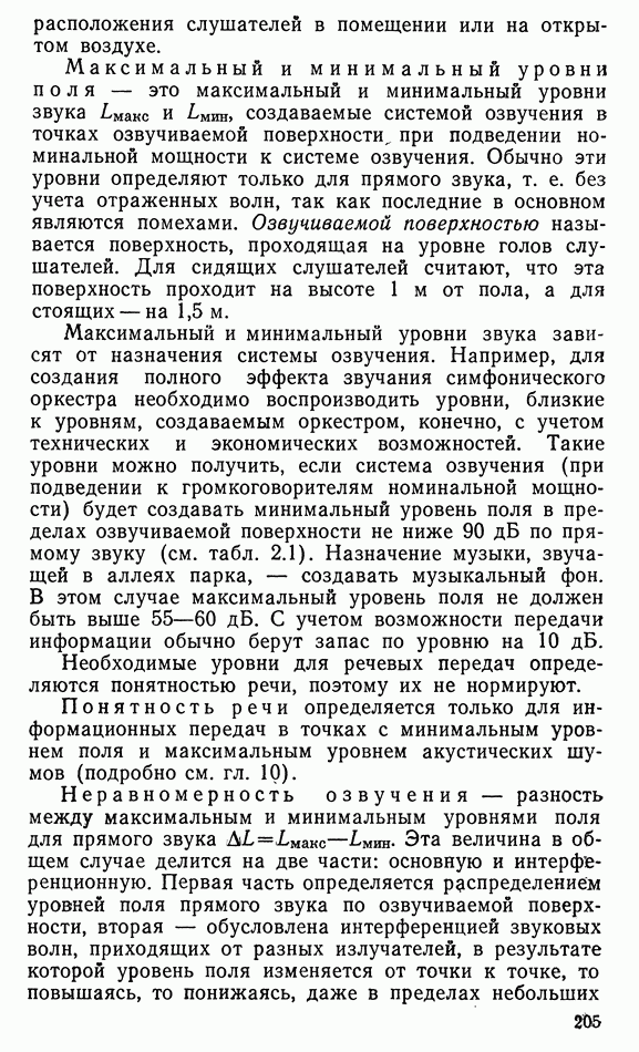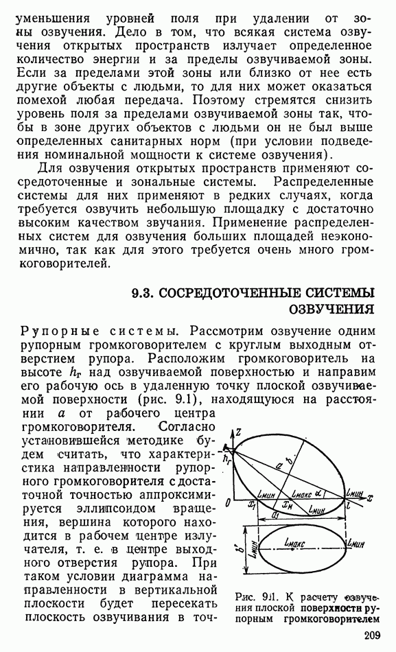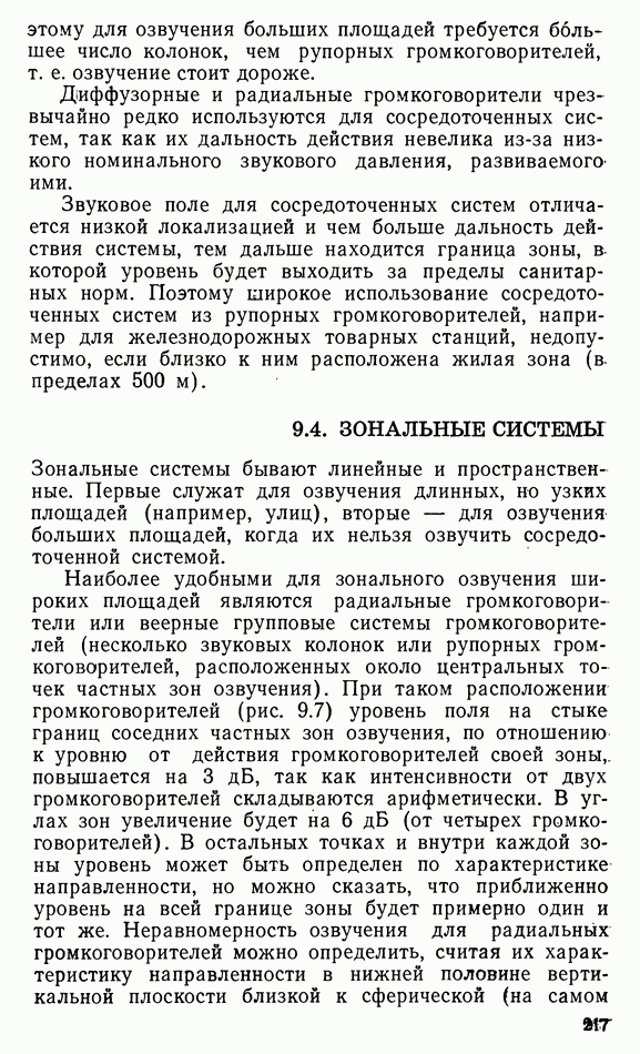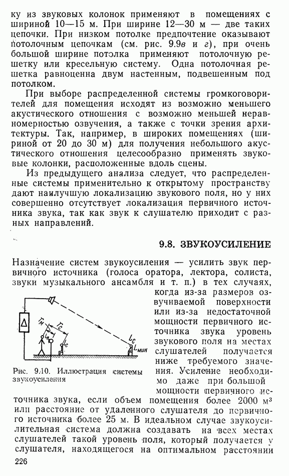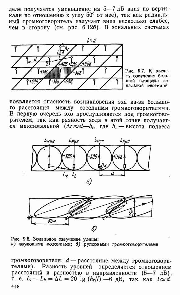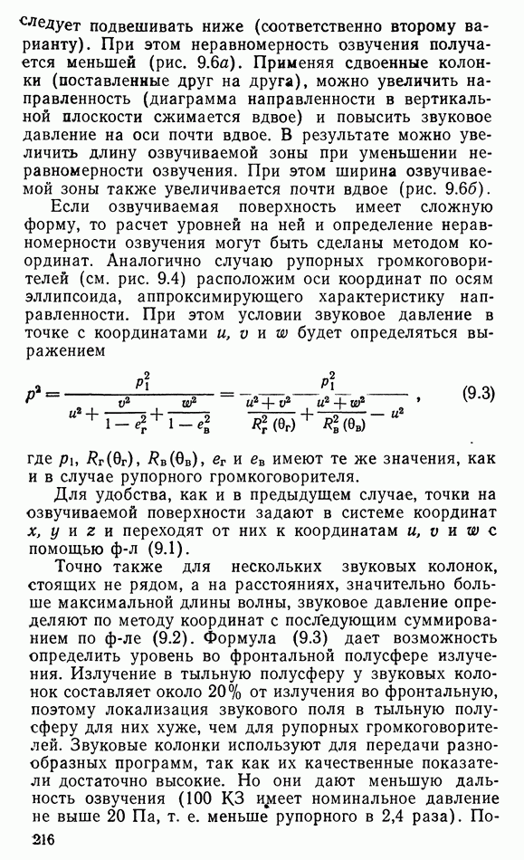 здесь Для двух цепочек из звуковых колонок звуковое давление определяется методом координат, т. е. суммированием интенсивностей, получаемых от каждой из цепочек, аналогично случаю ненаправленных громкоговорителей. Потолочные решетки создают плоскую волну, поэтому звуковое давление, создаваемое ими на озвучиваемой поверхности, определяют как для независимого излучения каждого громкоговорителя только в свою зону, ограниченную размерами Одну настенную цепочку диффузорных громкоговорителей применяют, если ширина помещения не превосходит цепочку из звуковых колонок применяют в помещениях с шириной При выборе распределенной системы громкоговорителей для помещения исходят из возможно меньшего акустического отношения с возможно меньшей неравномерностью озвучения, а также с точки зрения архитектуры. Так, например, в широких помещениях (шириной от 20 до 30 м) для получения небольшого акустического отношения целесообразно применять звуковые колонки, расположенные вдоль сцены. Из предыдущего анализа следует, что распределенные системы применительно к открытому пространству дают наилучшую локализацию звукового поля, но у них совершенно отсутствует локализация первичного источника звука, так как звук к слушателю приходит с разных направлений.