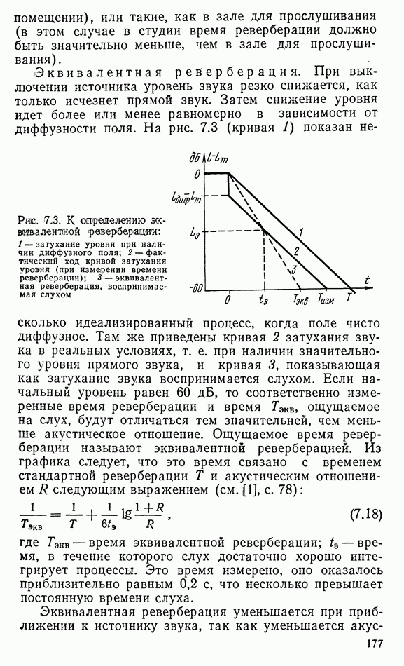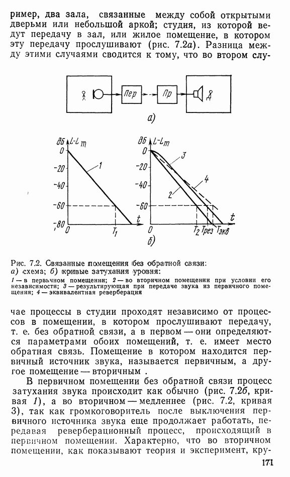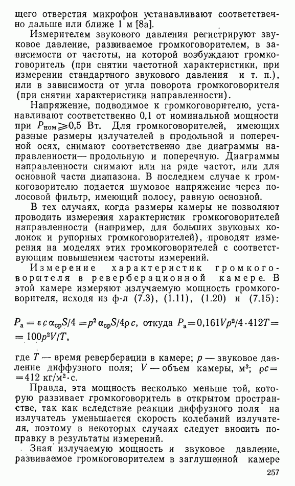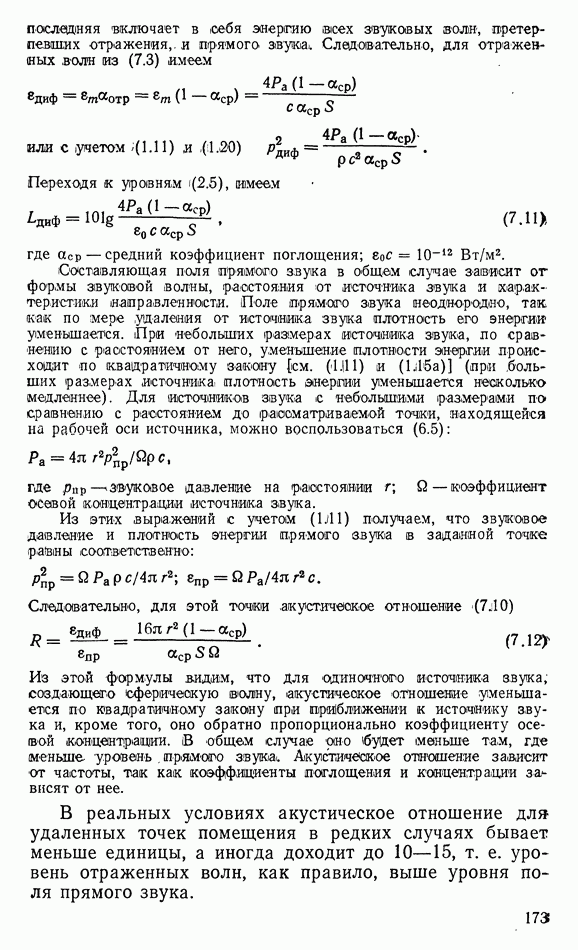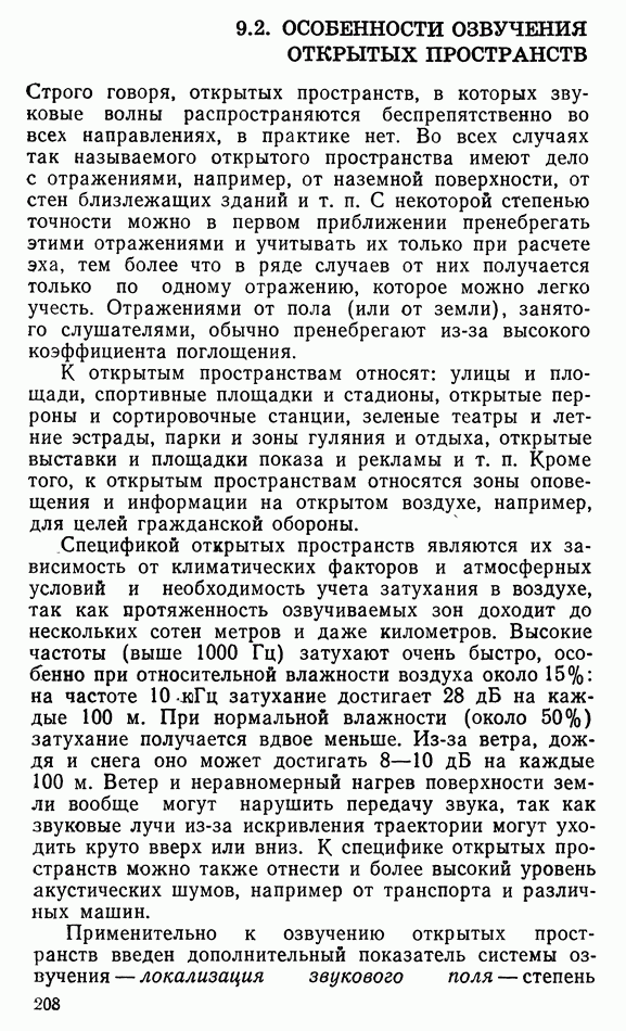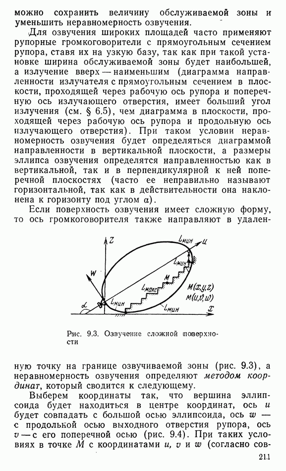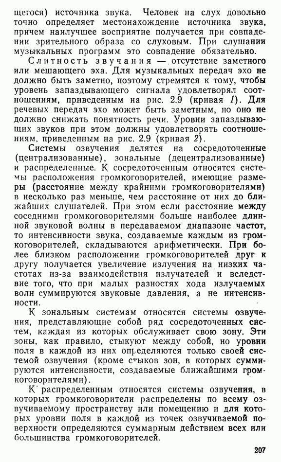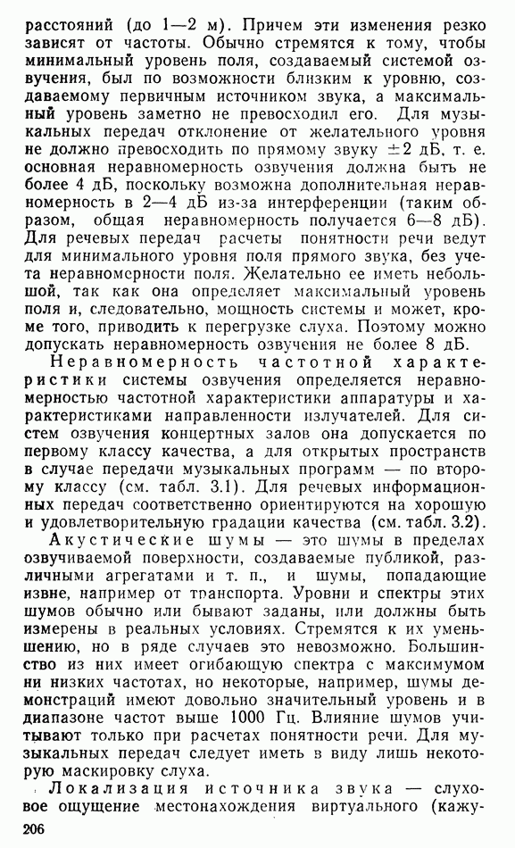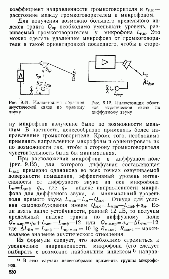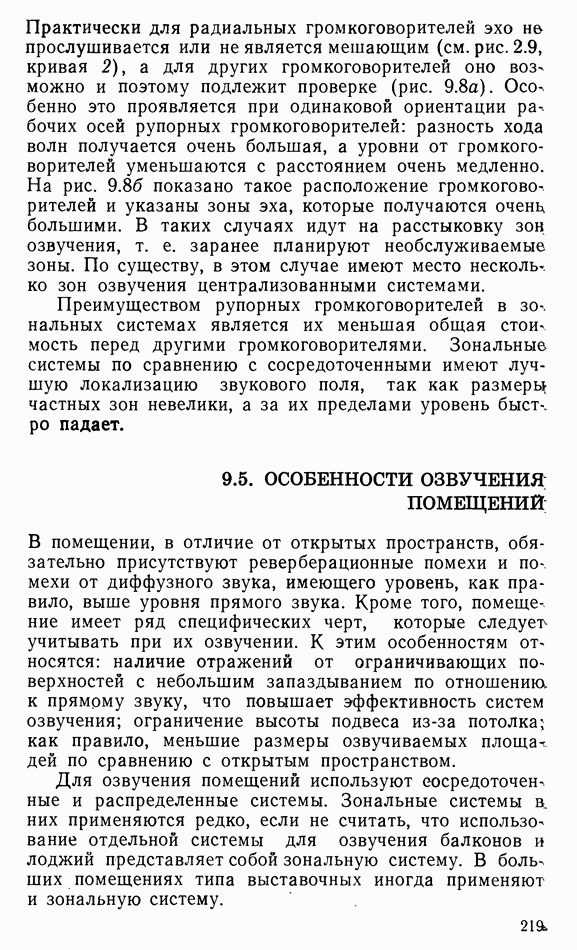 здесь Для двух цепочек из звуковых колонок звуковое давление определяется методом координат, т. е. суммированием интенсивностей, получаемых от каждой из цепочек, аналогично случаю ненаправленных громкоговорителей. Потолочные решетки создают плоскую волну, поэтому звуковое давление, создаваемое ими на озвучиваемой поверхности, определяют как для независимого излучения каждого громкоговорителя только в свою зону, ограниченную размерами Одну настенную цепочку диффузорных громкоговорителей применяют, если ширина помещения не превосходит цепочку из звуковых колонок применяют в помещениях с шириной При выборе распределенной системы громкоговорителей для помещения исходят из возможно меньшего акустического отношения с возможно меньшей неравномерностью озвучения, а также с точки зрения архитектуры. Так, например, в широких помещениях (шириной от 20 до 30 м) для получения небольшого акустического отношения целесообразно применять звуковые колонки, расположенные вдоль сцены. Из предыдущего анализа следует, что распределенные системы применительно к открытому пространству дают наилучшую локализацию звукового поля, но у них совершенно отсутствует локализация первичного источника звука, так как звук к слушателю приходит с разных направлений.