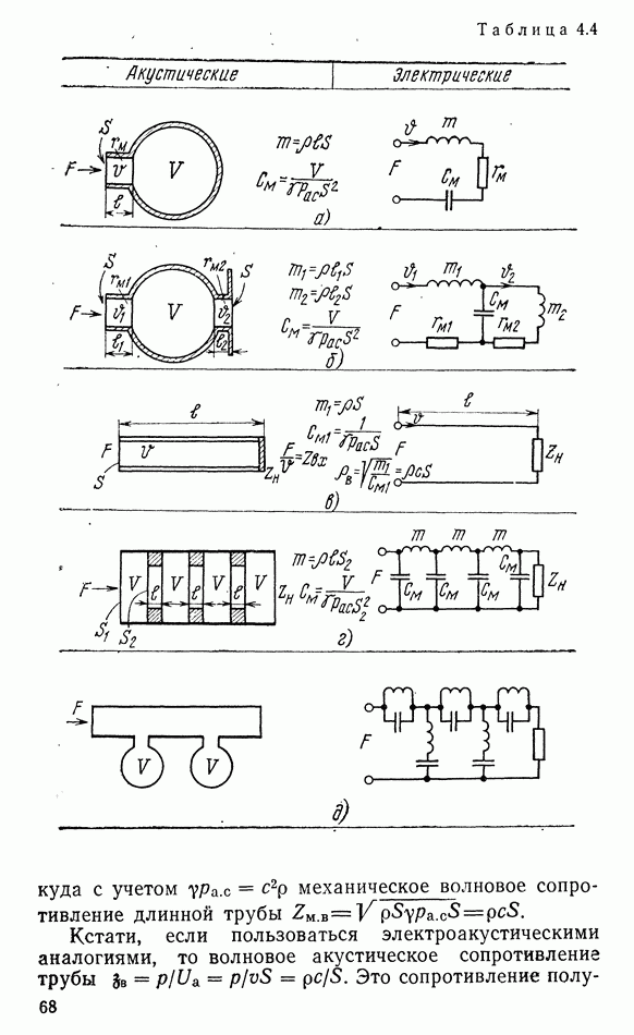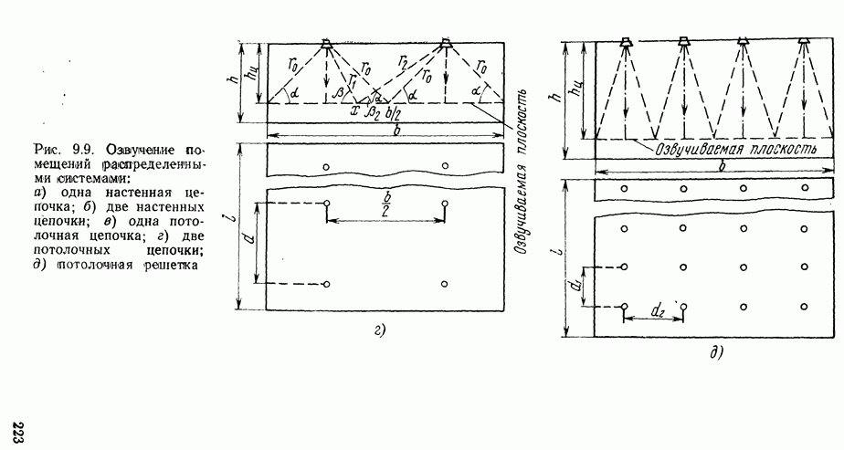 9.7. РАСПРЕДЕЛЕННЫЕ СИСТЕМЫРаспределенные системы делятся на линейные и поверхностные. Линейное расположение громкоговорителей называют цепочкой, а поверхностное — решеткой. Для помещений используют распределенные системы в виде настенных (рис. 9.9 а и б) или потолочных цепочек (рис. 9.9 в и г) громкоговорителей, а также в виде потолочных решеток из них (рис. 9.9 д). Кроме того, применяют кресельные системы из громкоговорителей или телефонов. Обычно распределенные системы применяют, когда нет необходимости в локализации первичного источника звука, т. е. когда его нет в этом помещении, или, например, для информационных передач, так как в этом случае локализация источника звука необязательна. В распределенных системах используют диффузорные громкоговорители или звуковые колонки, так как применение рупорных громкоговорителей в этих системах даже для озвучения открытых пространств нерационально, а для помещений тем более (из-за их большой мощности). Рассмотрим бесконечную прямолинейную цепочку диффузорных громкоговорителей с шагом ее