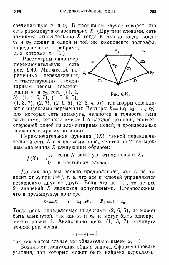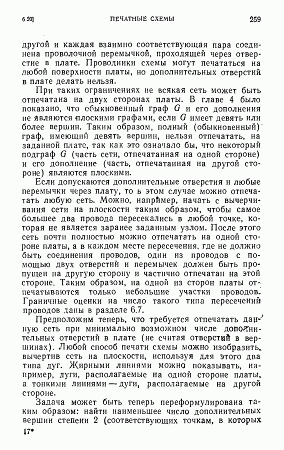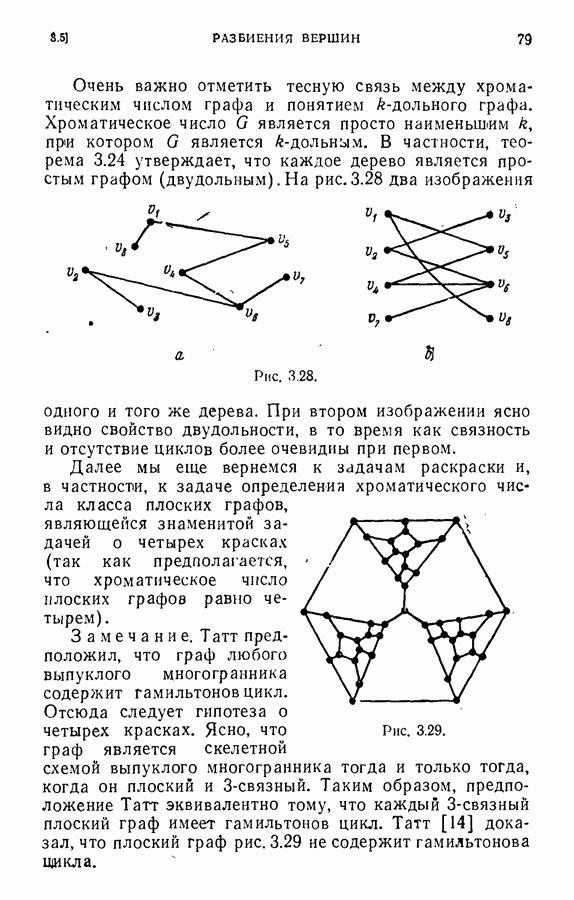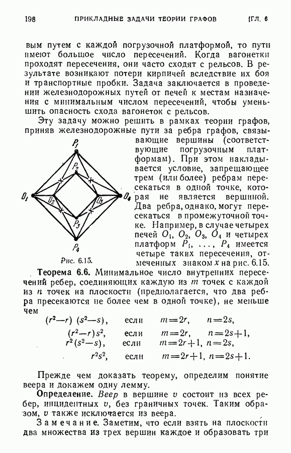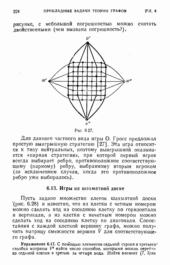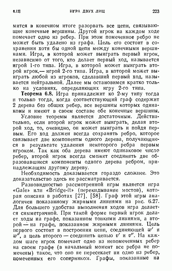 Рис. 6.26. Эта игра является, пожалуй, простейшим видом игры, в которой участвует более одного игрока. Заметим, что множество 1. Ни одна пара вершин, принадлежащих 2. Любая вершина, не принадлежащая 3. Все выигрывающие состояния принадлежат вершин подобное Таким образом, если структура игры полностью определена и выделено ядро Замечание. Читателям, знакомым с игрой «Ним» и с выигрышными стратегиями этой игры, рассмотренные действия помогают определить принадлежность текущего состояния, т. е. оставшегося числа палочек в каждой кучке, к множеству Игра типа «переключение»Рассматриваемая ниже игра была впервые сформулирована Шенноном, а ее решение предложено Леманом [58]. Игра проводится на графе двумя игроками. Оба игрока по договоренности выделяют две вершины, называемые конечными. Затем они поочередно делают ходы. В соответствии с правилами ходов один из игроков на каждом ходе удаляет из графа одно из ребер и стремится в конечном итоге разорвать все цепи, связывающие конечные вершины. Другой игрок на каждом ходе помечает одно из ребер. При этом помеченное ребро не может быть удалено из графа. Цель его состоит в сохранении хотя бы одной цепи между конечными вершинами. Игра, в которой может выиграть первый игрок, независимо от того, кто делает первый ход, называется игрой 1-го типа. Игра, в которой может выиграть второй игрок, — игрой 2-го типа. Игра, в которой может выиграть любой из игроков, сделавший первый ход, называется нейтральной. Далее мы остановимся кратко только на условиях, определяющих игру 2-го типа. Теорема 6.8. Игра принадлежит ко Условие теоремы является достаточным. Действительно, если второй игрок может выиграть, делая второй ход, то, очевидно, он может выиграть и пойдя первым. Его ход должен всегда сохранять ребро, которое связывает две компоненты одного дерева, получающиеся в результате удаления некоторого ребра первым игроком. Так как оба дерева имеют одинаковое число ребер, второй игрок всегда сможет соединить две образовавшиеся компоненты одного дерева ребром, принадлежащим другому дереву. Необходимость доказывается гораздо сложнее. Это доказательство здесь не рассматривается. Разновидностью рассмотренной игры является игра «Gale» или «Bridgeit» (перекидывание мостов), которая описана в работах [27], [58]. Граф этой игры аналогичен показанному жирными линиями на рис. 6.27. Для большего удобства выполнения ходов игра делается симметричной. При такой форме первый игрок делает ходы на графе, показанном тонкими линиями, а второй — на графе, показанном жирными линиями. Цель первого состоит в построении цепи, соединяющей рисунке, с небольшой погрешностью можно считать двойственными (чем вызвана погрешность?).
