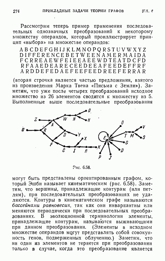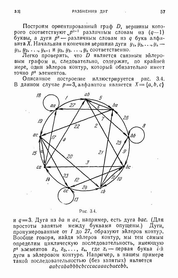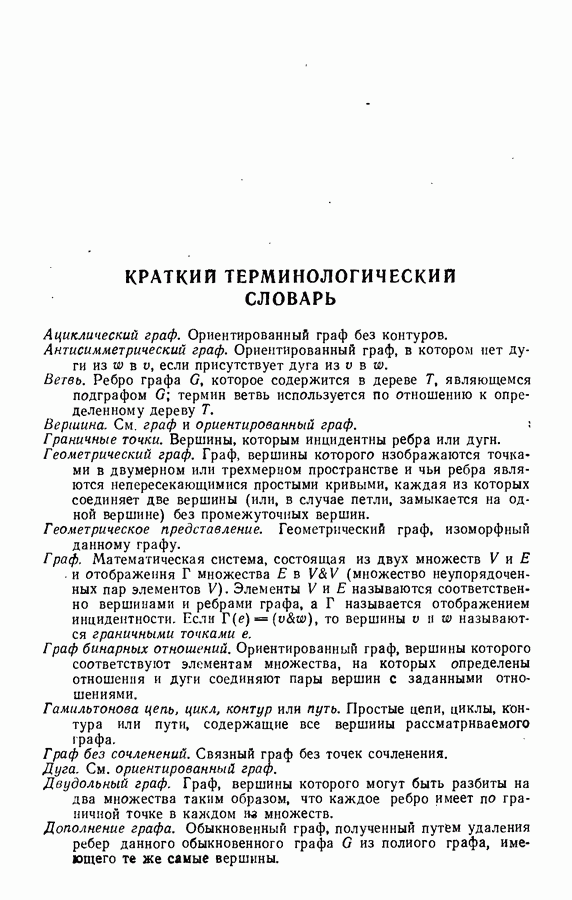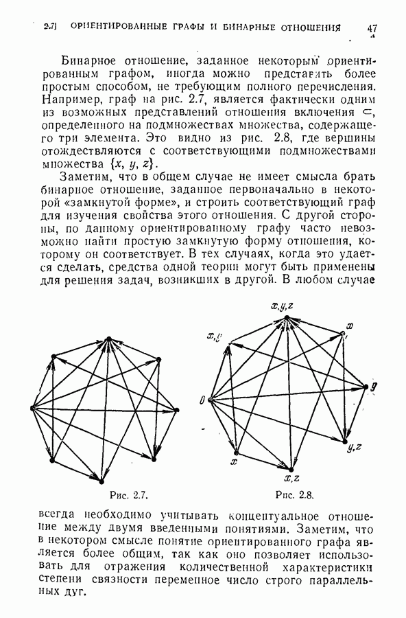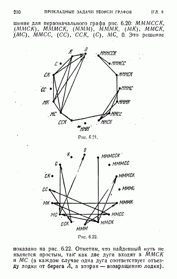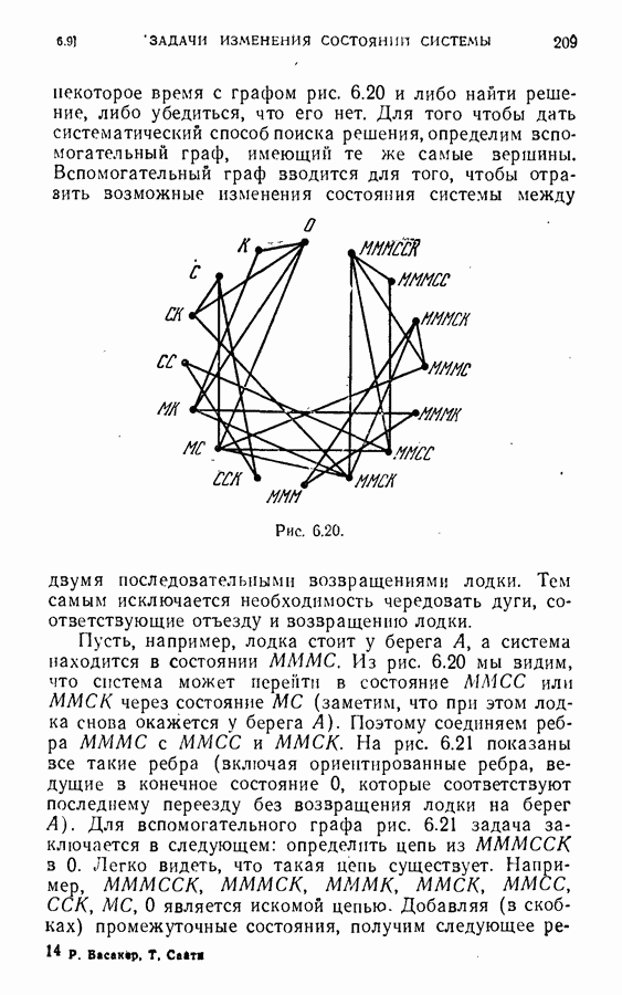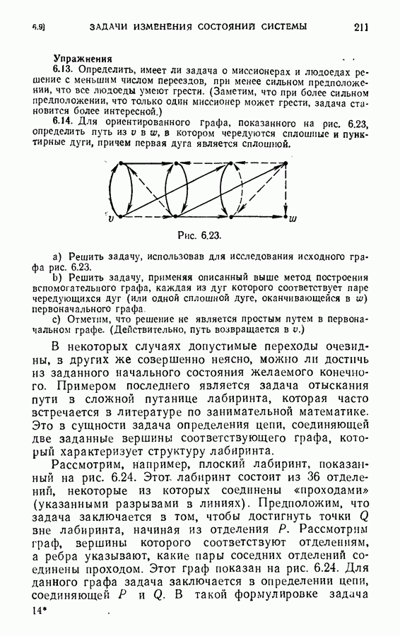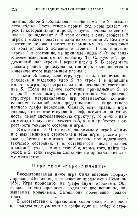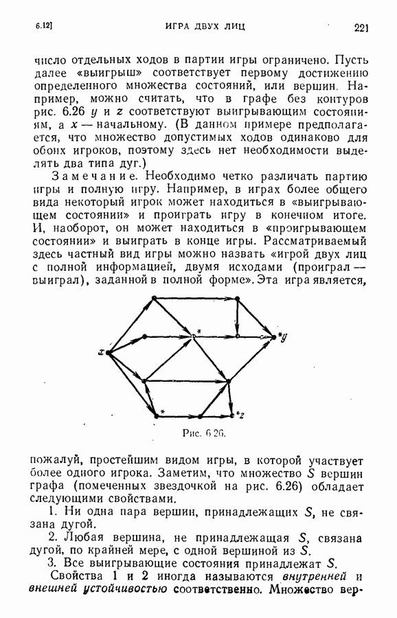 6.12. Игра двух лицОриентированный граф является удобной математической моделью для описания и анализа некоторых типов ситуаций, в которых проявляется соревнование (конкуренция) двух лиц или двух групп лиц, имеющих противоречивые (конфликтные) цели. Предлагаемое ниже краткое обсуждение такого аспекта использования графов не следует рассматривать как попытку формулирования наиболее общих понятий, в рамках которых теория графов применима к описанию таких «игр». Оно не является также попыткой установления соответствия между понятиями теории графов и понятиями формальной теории игр. Рассмотрим ситуацию, в которой два лица поочередно вносят частичные изменения в некоторую структуру. (Например, в систему размещения фигур на шахматной доске.) Пусть имеется некое стандартное начальное состояние (например, исходное положение фигур шахматистов) и «Книга правил», которая полностью определяет список допустимых ходов, т. е. допустимые изменения состояния каждого игрока за 1 шаг. Если существует конечное число различных состояний игры, то правила игры можно полностью характеризовать конечным направленным графом с двумя типами дуг. При этом каждое состояние рассматривается как вершина Предположим, что рассматриваемая игра такова, что ни одно из ее состояний не повторяется, т. е. соответствующий ей граф не имеет контуров. В этом случае число отдельных ходов в партии игры ограничено. Пусть далее «выигрыш» соответствует первому достижению определенного множества состояний, или вершин. Например, можно считать, что в графе без контуров рис. 6.26 у и z соответствуют выигрывающим состояниям, Замечание. Необходимо четко различать партию игры и полную игру. Например, в играх более общего вида некоторый игрок может находиться в «выигрывающем состоянии» и проиграть игру в конечном итоге. И, наоборот, он может находиться в «проигрывающем состоянии» и выиграть в конце игры. Рассматриваемый здесь частный вид игры можно назвать «игрой двух лиц с полной информацией, двумя исходами (проиграл — выиграл), заданной в полной форме».