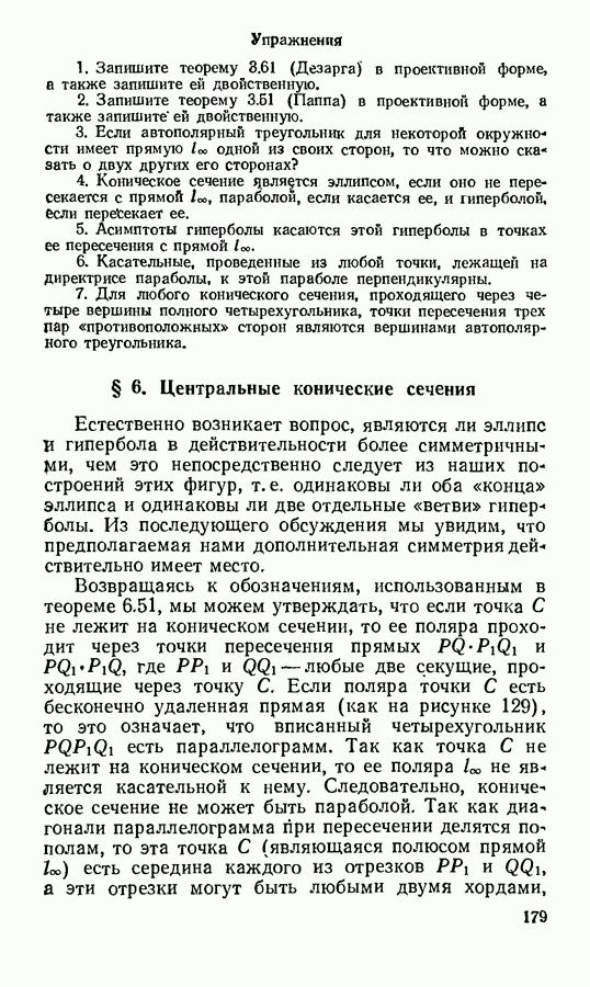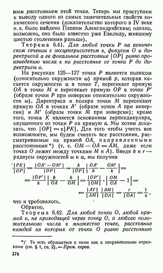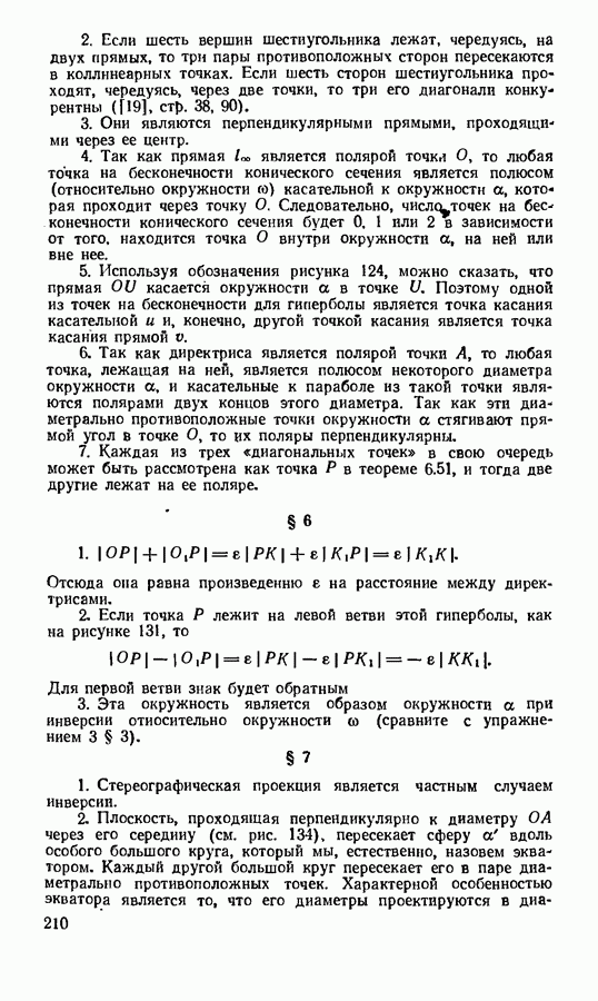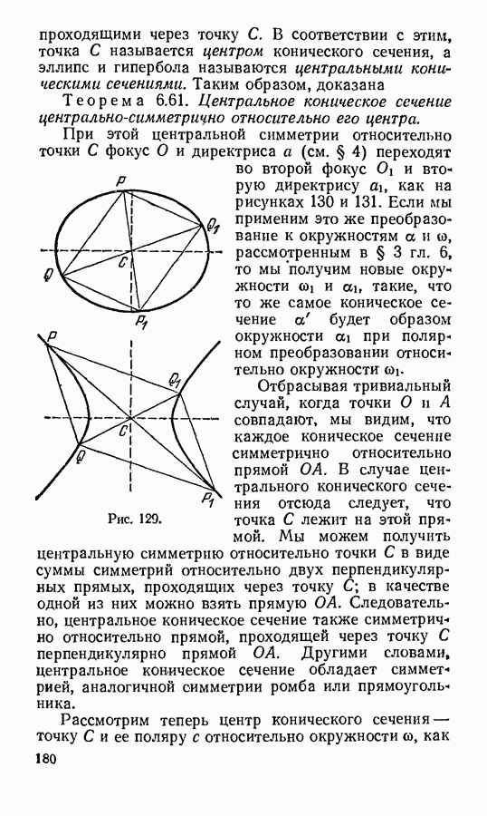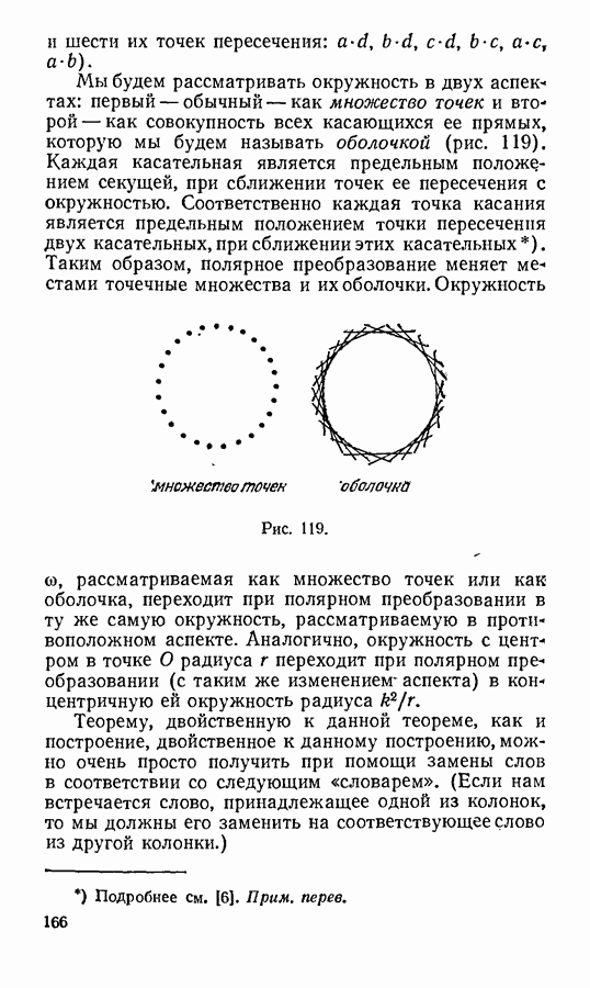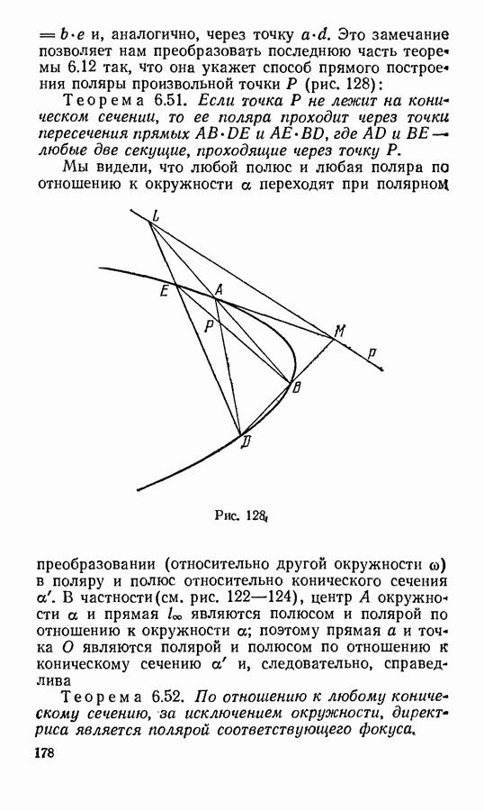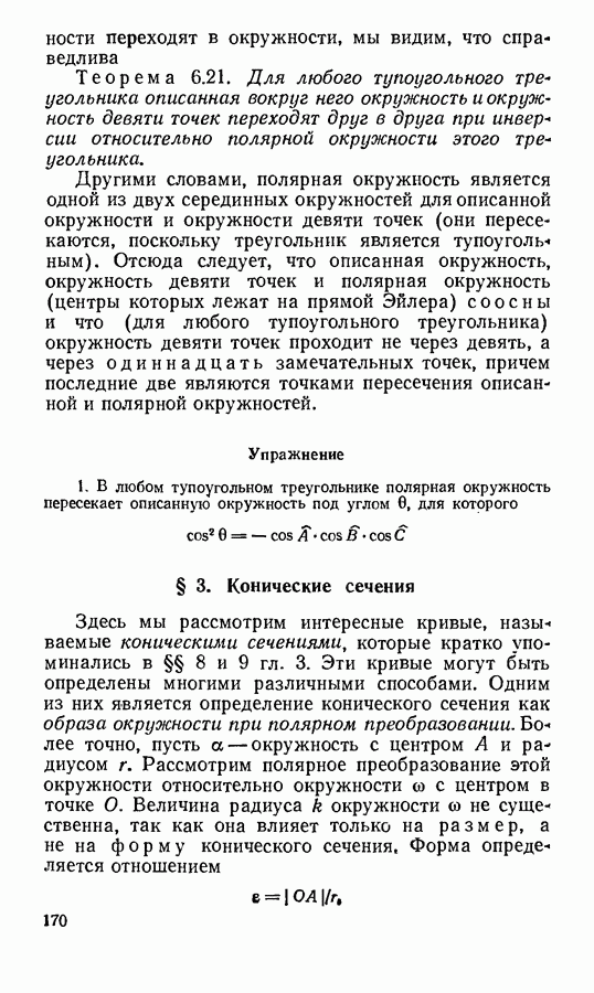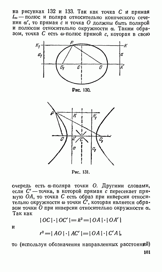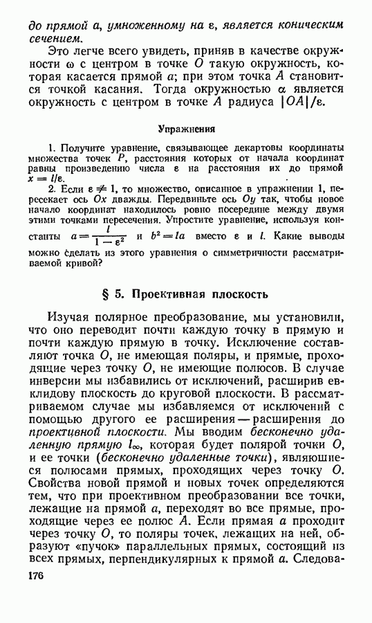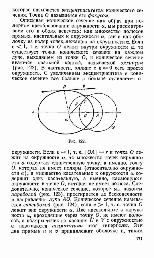 которое называется эксцентриситетом конического сечения. Точка О называется его фокусом. Описывая коническое сечение как образ при полярном преобразовании окружности а, мы рассматриваем его в обоих аспектах: как множество полюсов прямых, касательных к окружности а, так и как оболочку из поляр точек, лежащих на окружности а. Если