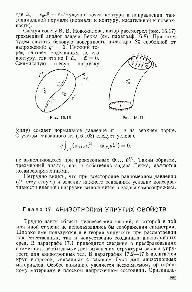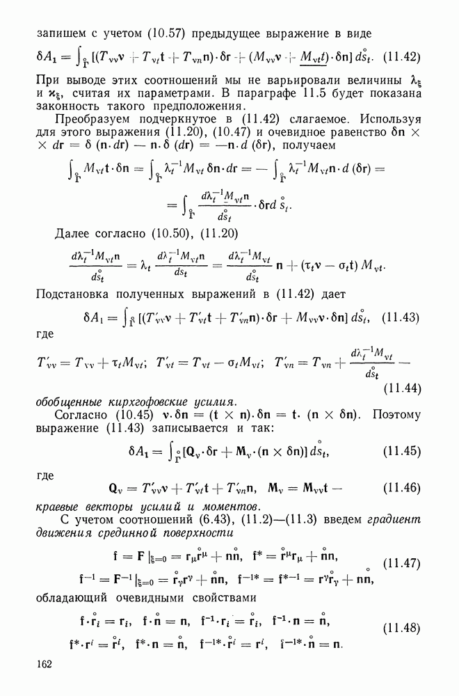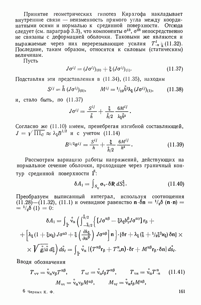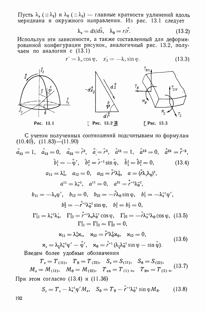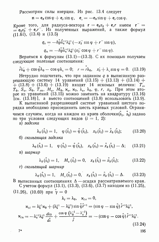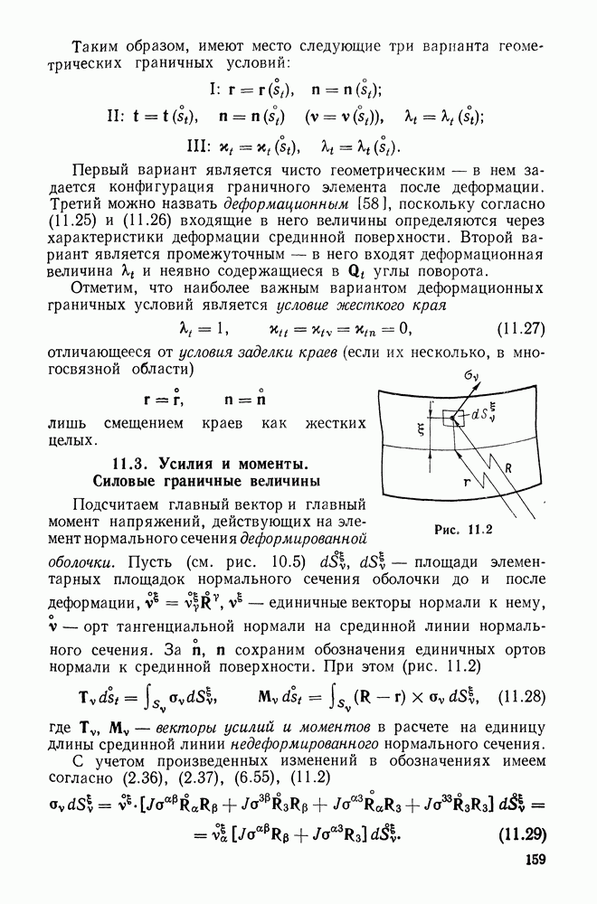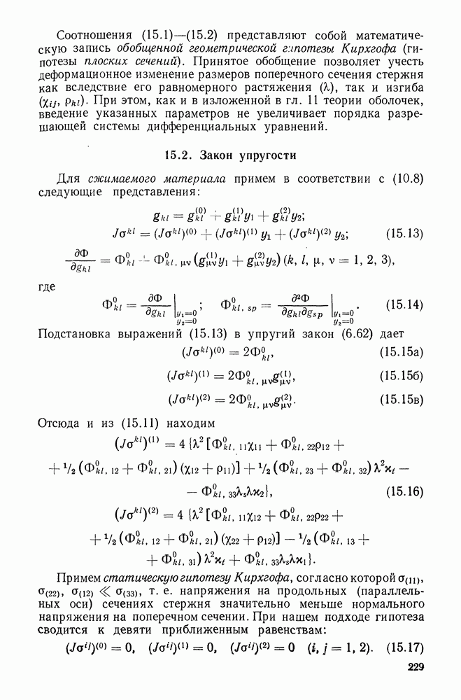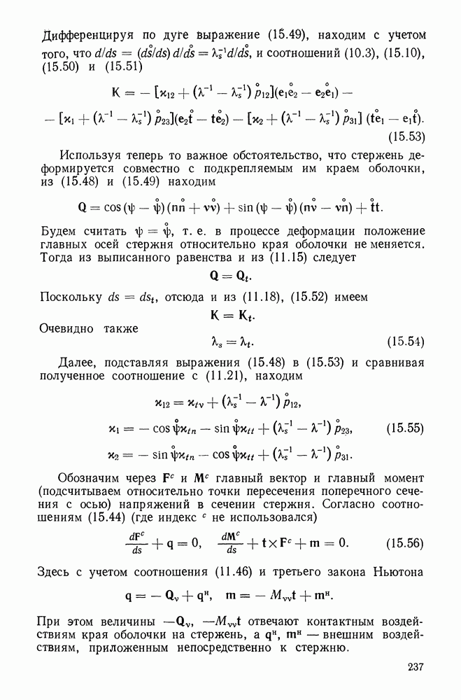 представляют собой осевую силу и компоненты момента, отвечающие внутренним напряжениям в стержне. Подставляя в последние соотношения выражения (15.57), какой-либо из вариантов (15.42), (15.26)-(15.29), (15.31), (15.32), (15.34)-(15.37) закона упругости, а также (15.54)-(15.55), получаем связь между краевыми усилиями — моментом и компонентами деформации края оболочки. При этом в получаемых описанным способом соотношениях подкрепляющий край оболочки стержень представлен лишь своими жесткостными характеристиками.