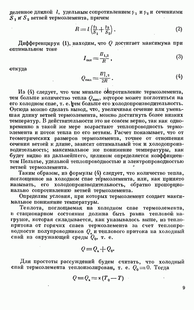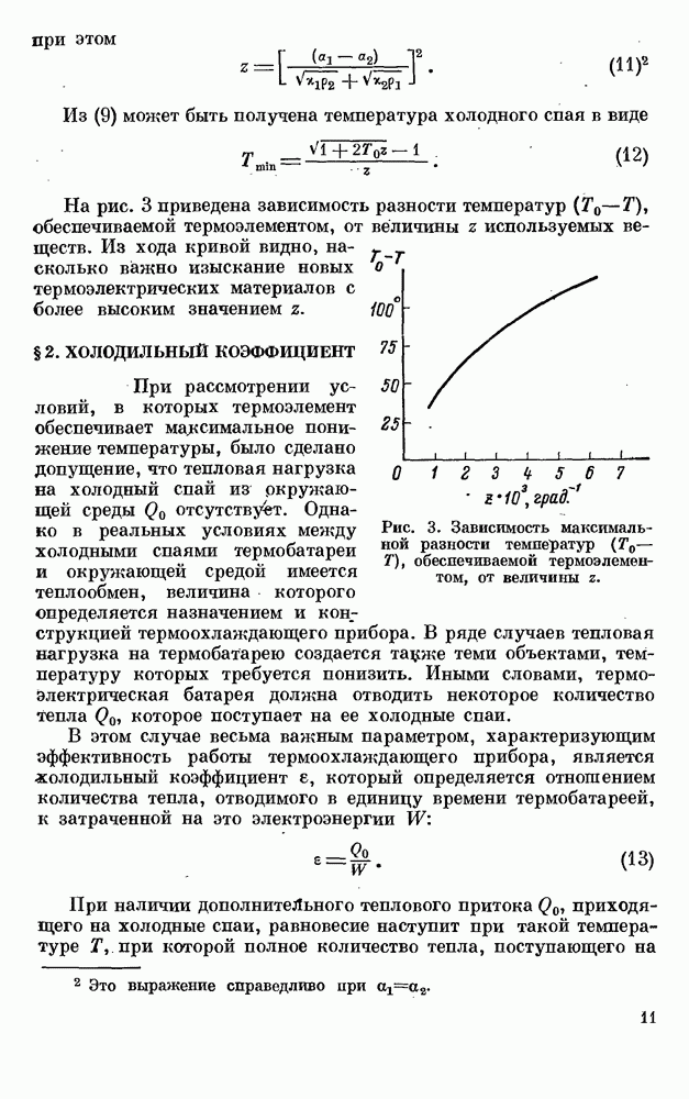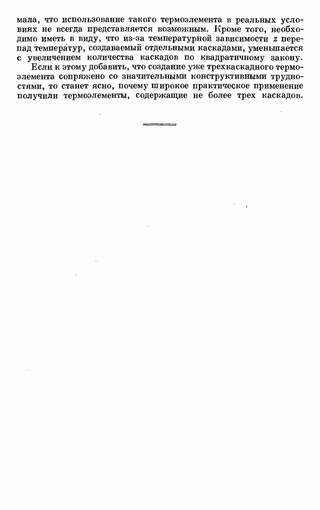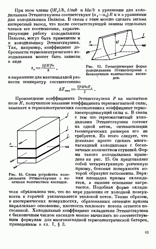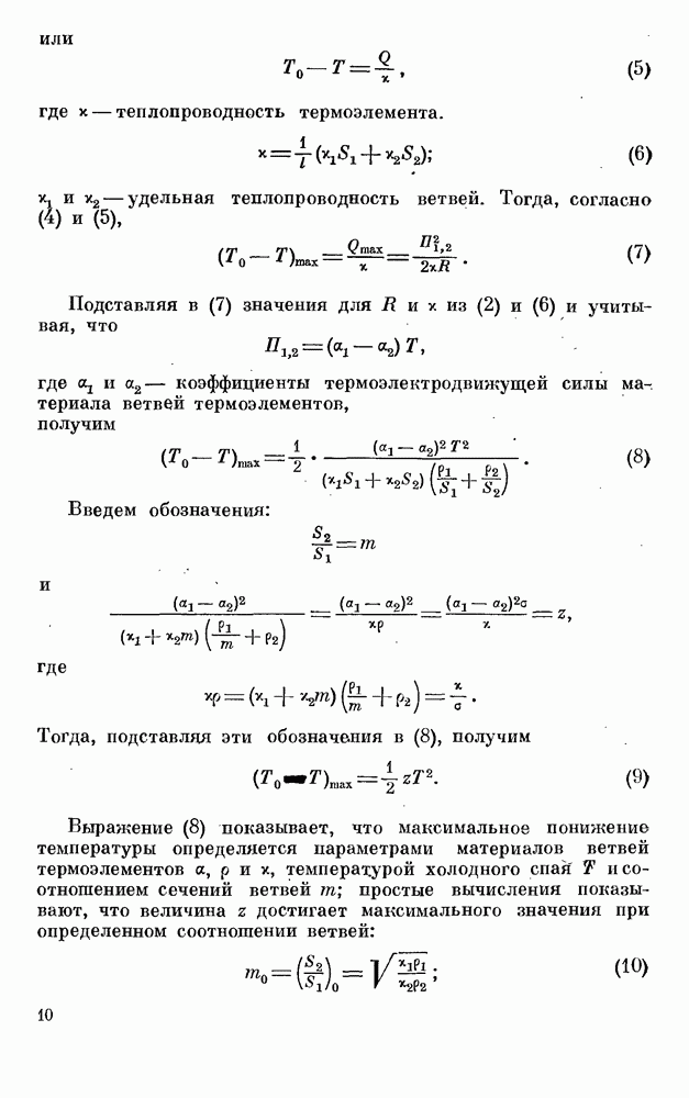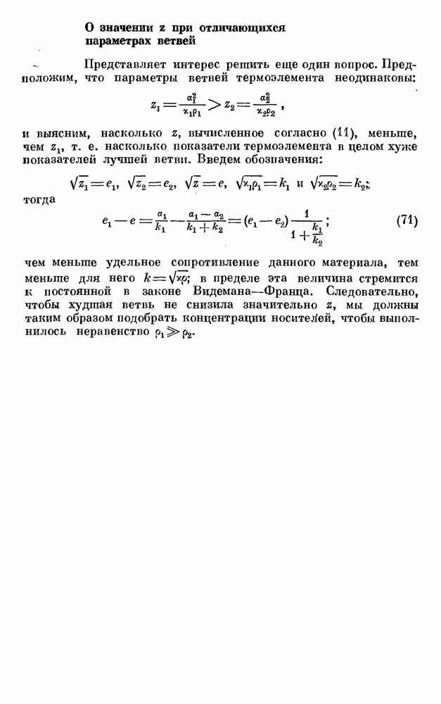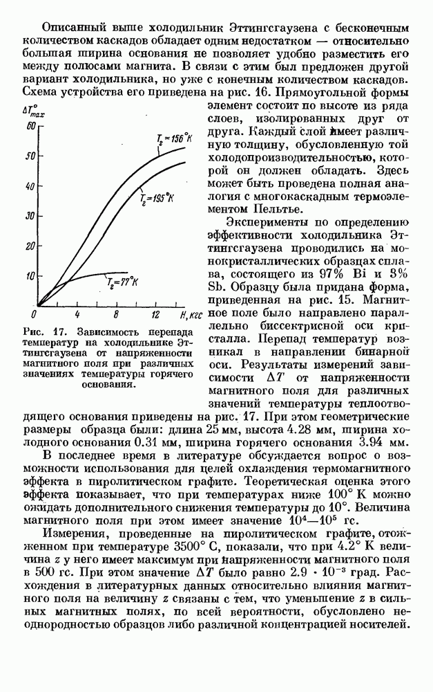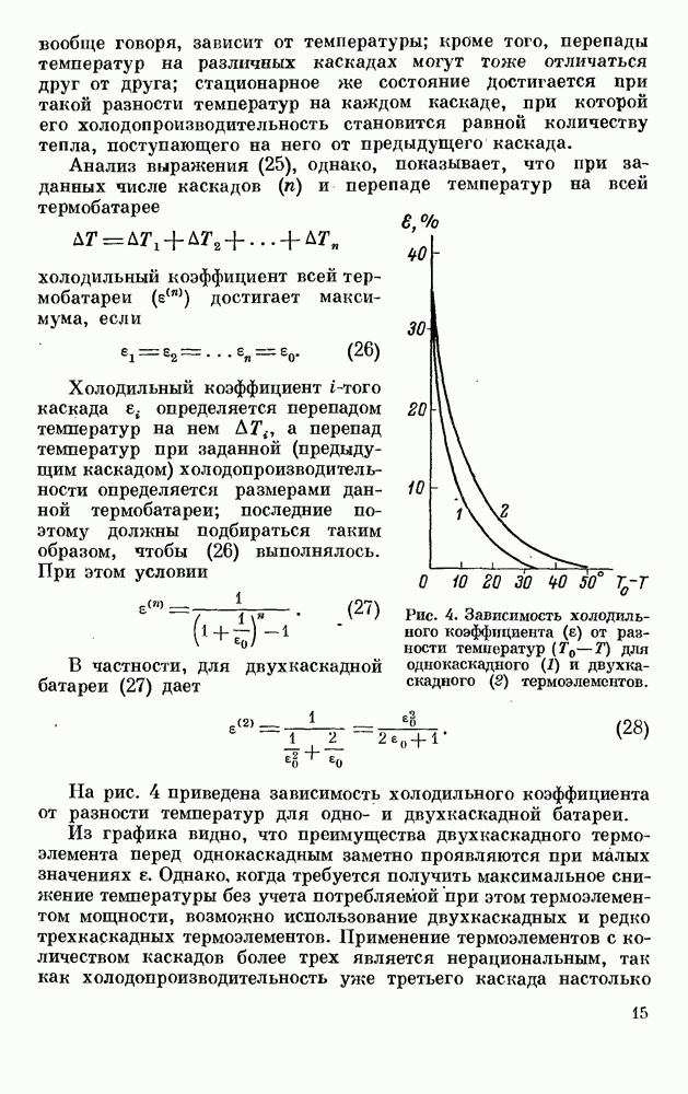 Таким образом, если в качестве материалов для ветвей термопары применить полуметаллы с достаточно широкой запретной зоной, то мы можем считать, что концентрация носителей остается постоянной. При этом условие (34) также не выполняется строго на всем протяжении ветви термоэлемента, и это приводит к некоторому снижению его эффективности. Однако, так как перепад температур на охлаждающей термопаре, как правило, не превышает нескольких десятков градусов, отступления от (34) и соответствующие потери эффективности обычно не превышают 10—20%. В этом отношении многокаскадные батареи приобретают еще одно преимущество: если общий рабочий перепад разделен на небольшие перепады температур, то в каждом каскаде условие (34) может быть удовлетворено более точно соответствующим подбором концентраций примесей. Можно также строго удовлетворить это условие, если обеспечить постепенное изменение концентрации примесей вдоль ветви термопары; это, однако, представляет большие технологические трудности, которые до настоящего времени полностью не преодолены.