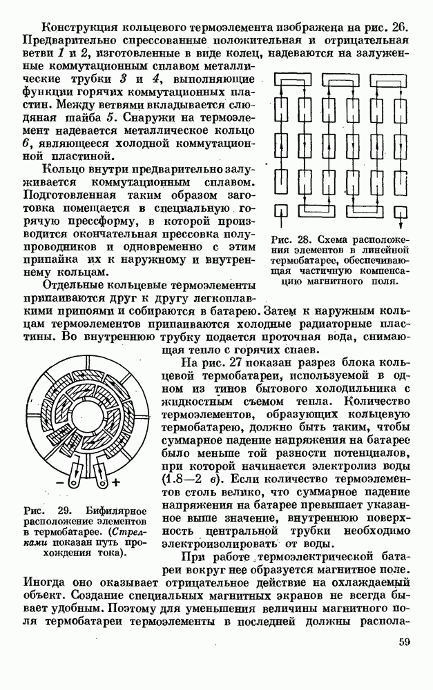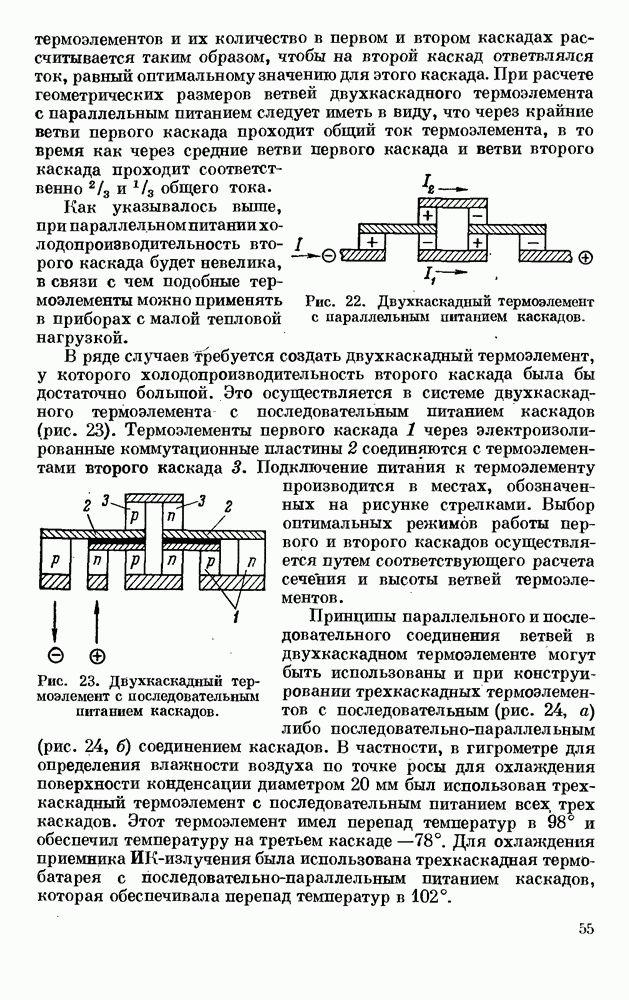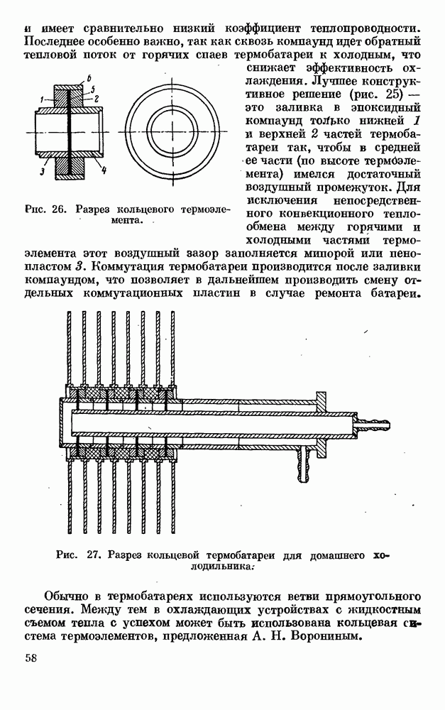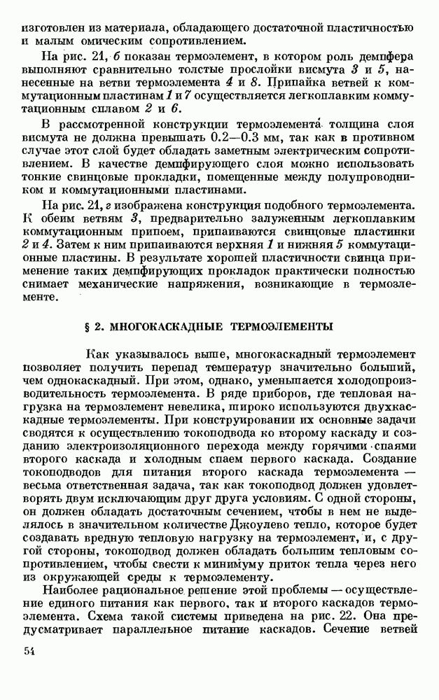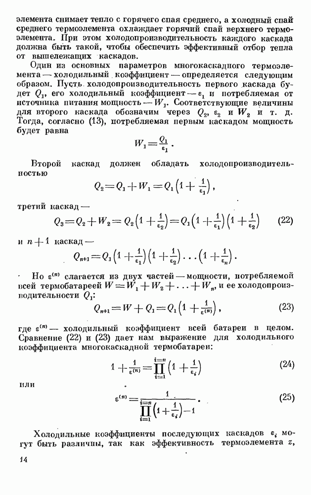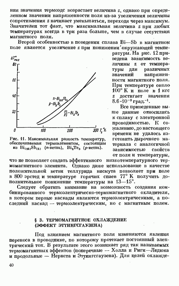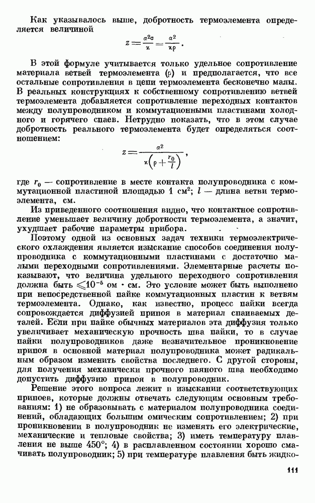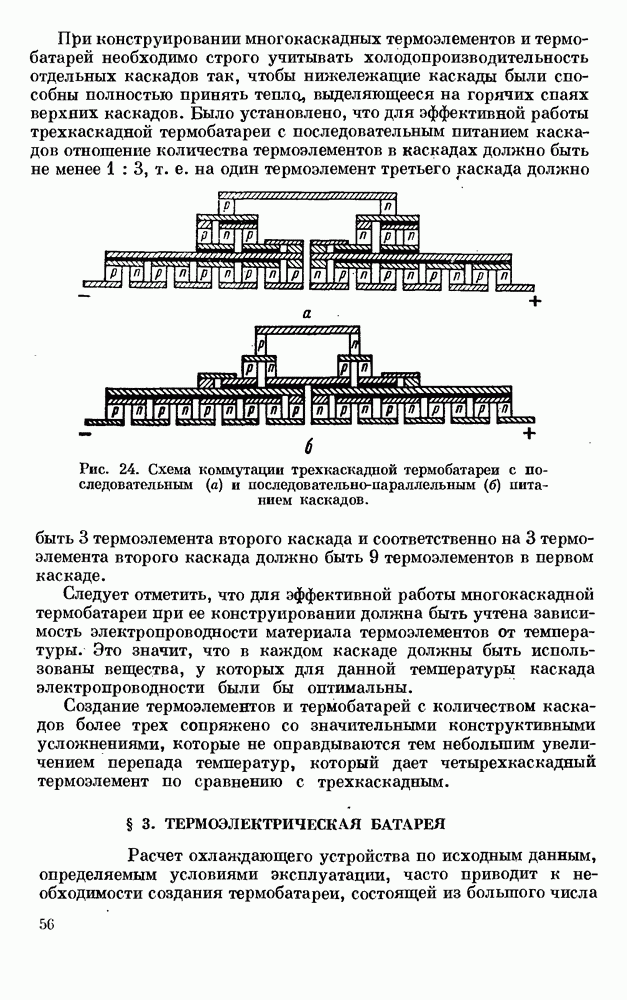 Таким образом, если в качестве материалов для ветвей термопары применить полуметаллы с достаточно широкой запретной зоной, то мы можем считать, что концентрация носителей остается постоянной. При этом условие (34) также не выполняется строго на всем протяжении ветви термоэлемента, и это приводит к некоторому снижению его эффективности. Однако, так как перепад температур на охлаждающей термопаре, как правило, не превышает нескольких десятков градусов, отступления от (34) и соответствующие потери эффективности обычно не превышают 10—20%. В этом отношении многокаскадные батареи приобретают еще одно преимущество: если общий рабочий перепад разделен на небольшие перепады температур, то в каждом каскаде условие (34) может быть удовлетворено более точно соответствующим подбором концентраций примесей. Можно также строго удовлетворить это условие, если обеспечить постепенное изменение концентрации примесей вдоль ветви термопары; это, однако, представляет большие технологические трудности, которые до настоящего времени полностью не преодолены.