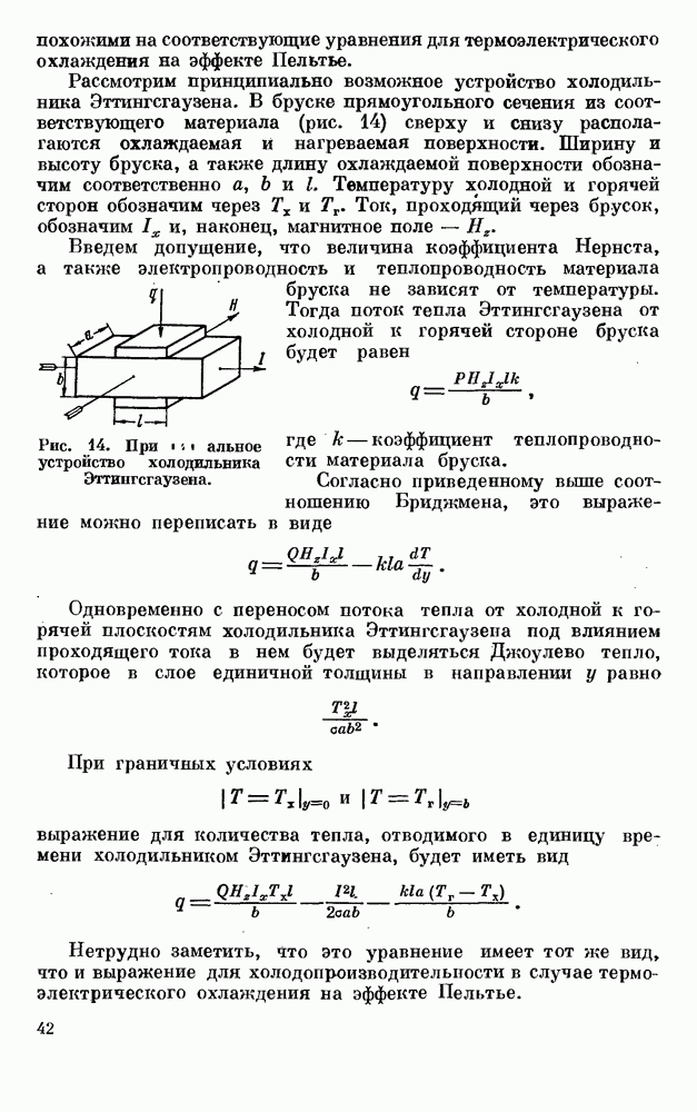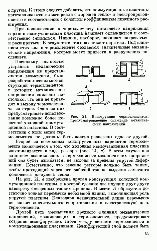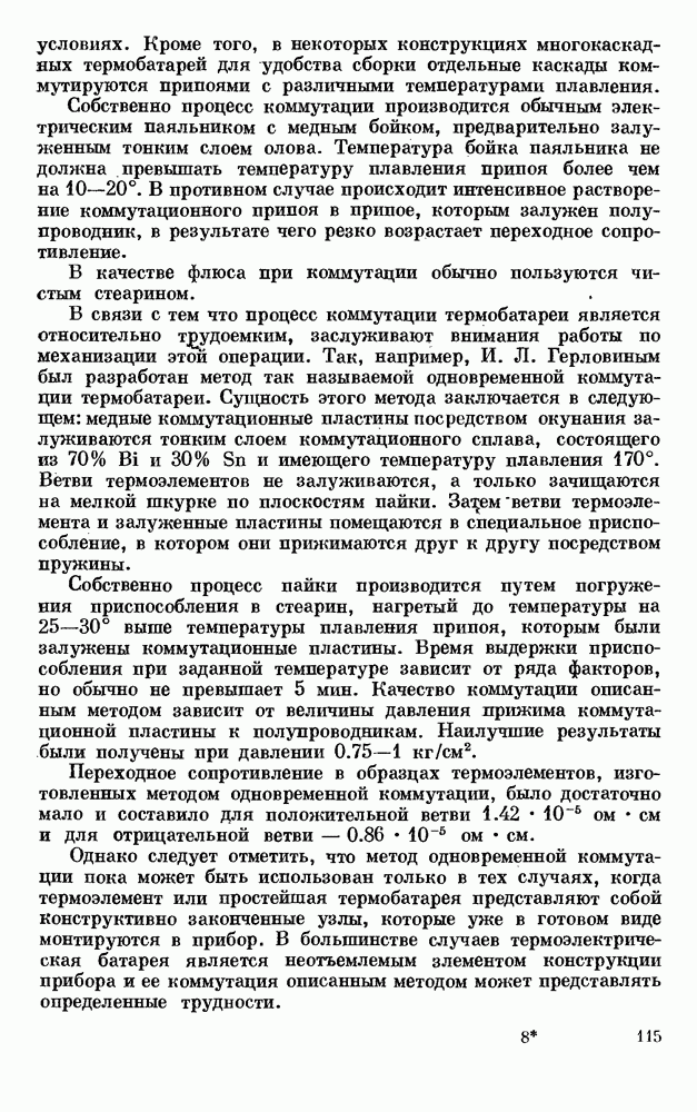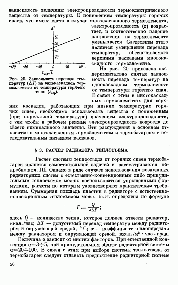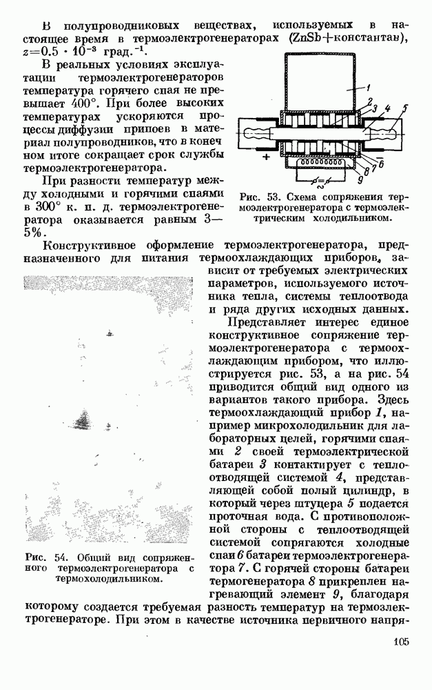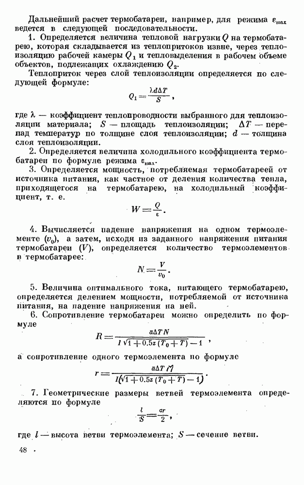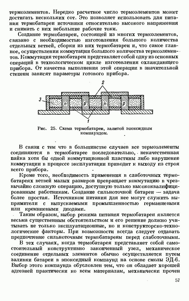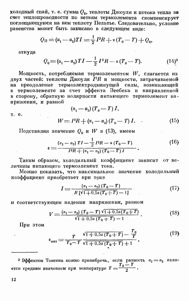 Таким образом, если в качестве материалов для ветвей термопары применить полуметаллы с достаточно широкой запретной зоной, то мы можем считать, что концентрация носителей остается постоянной. При этом условие (34) также не выполняется строго на всем протяжении ветви термоэлемента, и это приводит к некоторому снижению его эффективности. Однако, так как перепад температур на охлаждающей термопаре, как правило, не превышает нескольких десятков градусов, отступления от (34) и соответствующие потери эффективности обычно не превышают 10—20%. В этом отношении многокаскадные батареи приобретают еще одно преимущество: если общий рабочий перепад разделен на небольшие перепады температур, то в каждом каскаде условие (34) может быть удовлетворено более точно соответствующим подбором концентраций примесей. Можно также строго удовлетворить это условие, если обеспечить постепенное изменение концентрации примесей вдоль ветви термопары; это, однако, представляет большие технологические трудности, которые до настоящего времени полностью не преодолены.