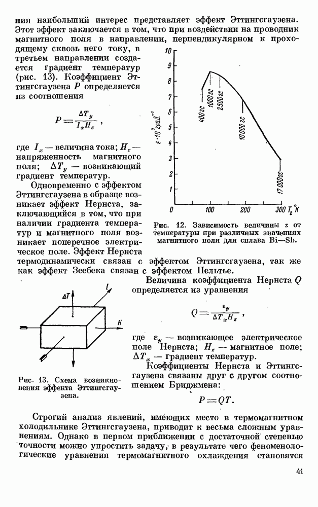достигает йвоего максимального значения. Эти качественные соображения позволяют понять, почему эффективность металлических термопар очень низка; именно этим объясняется то, что термоэлектрические генераторы и холодильники до последнего времени не находили сколько-нибудь значительного применения в технике. Если воспользоваться в качестве материалов для ветвей термопары полупроводниками (точнее, полуметаллами, см. ниже) и подобрать в них соответствующим образом концентрацию электронов (или