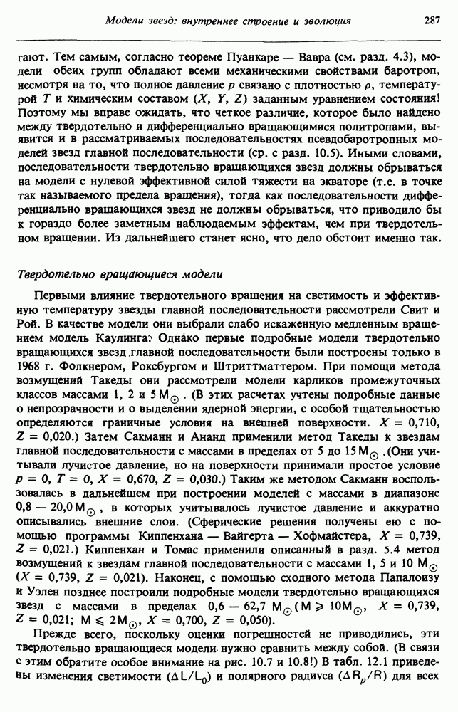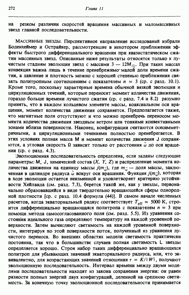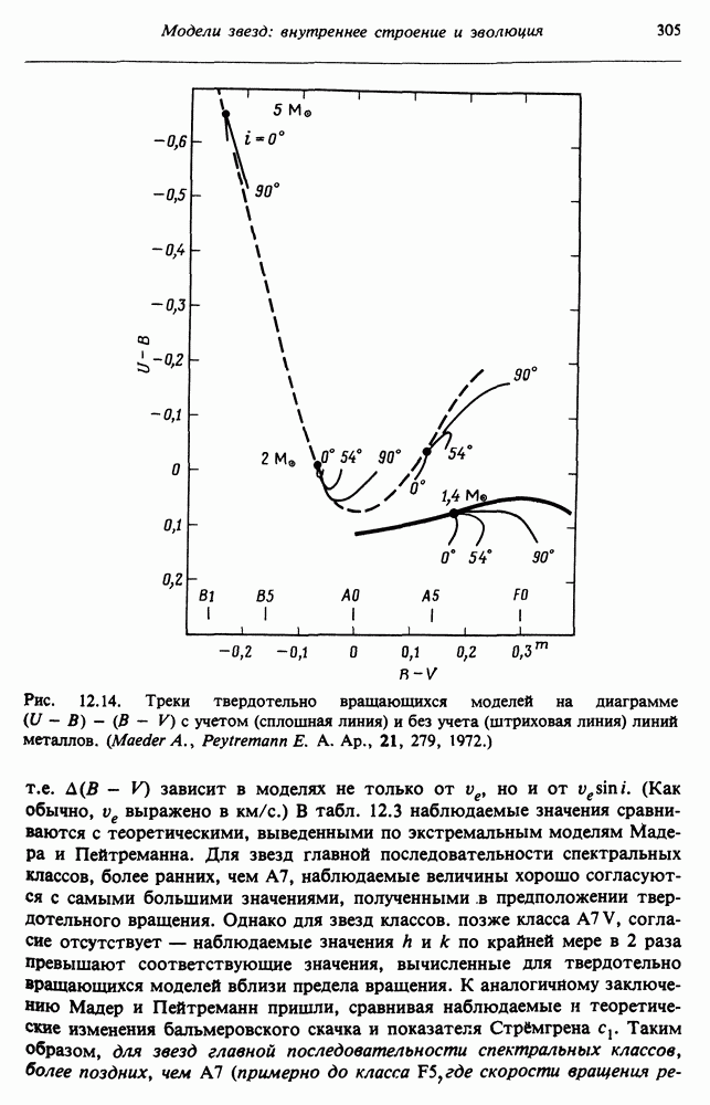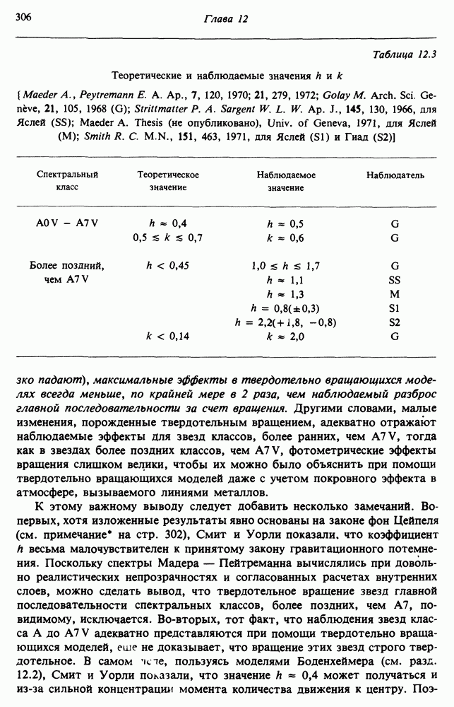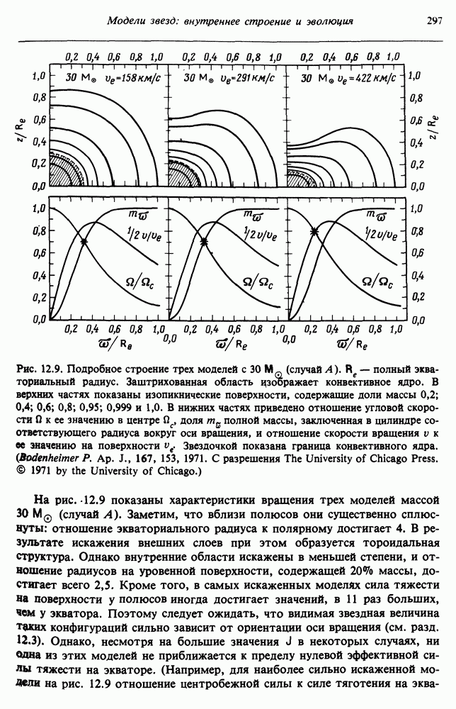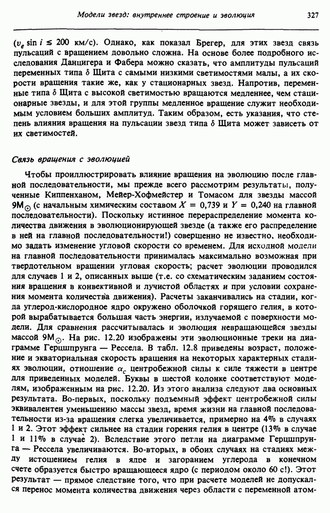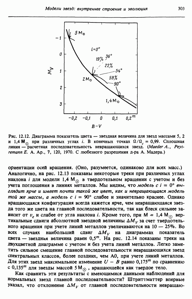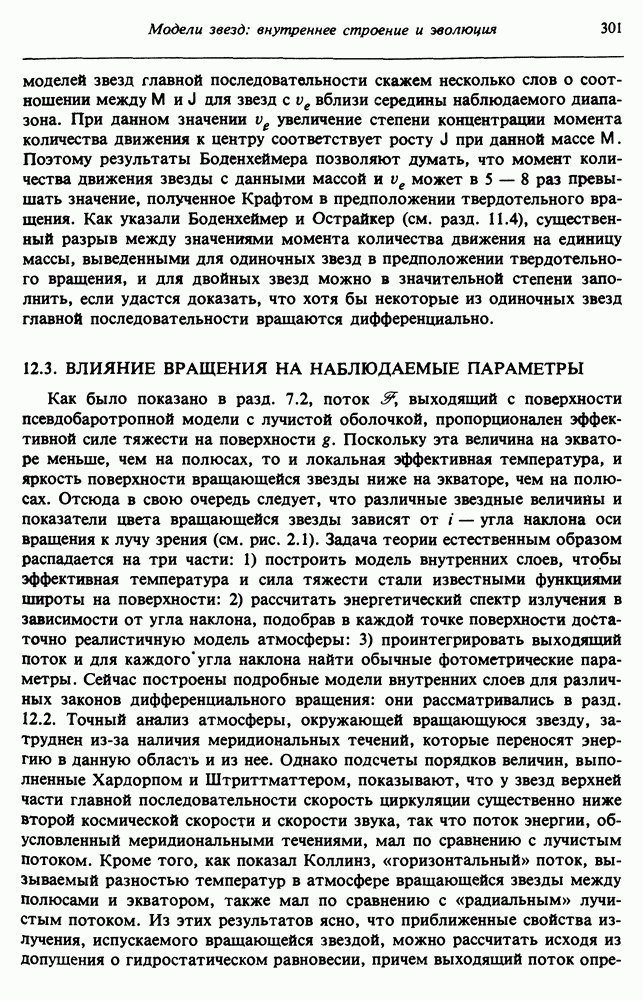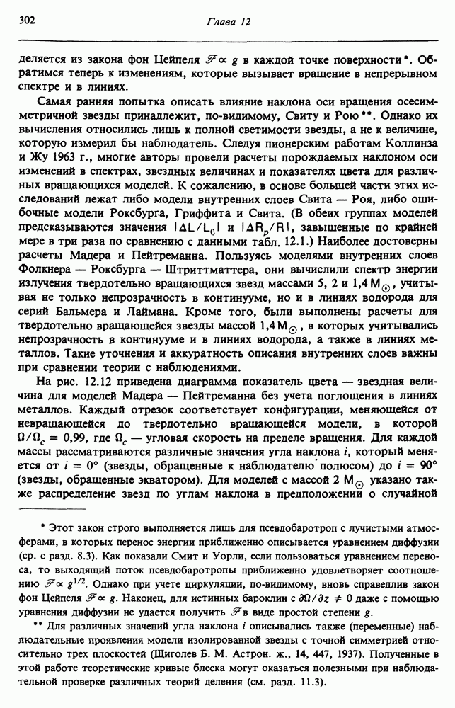 Благодаря появлению быстродействующих вычислительных машин в нашем понимании внутреннего строения и эволюции вращающихся звезд достигнут значительный прогресс. Однако, как указывалось в гл. 7, истинное распределение момента количества движения внутри звезды все еще практически не известно, поэтому во всех предлагавшихся до сих пор моделях закон вращения всегда задается ad hoc. Другими словами, даже самые подробные вычисления носят еще весьма предварительный характер, в сущности их задача — только оценить самые важные изменения, вызываемые вращением в моделях звезд. В разд. 12.2 рассматриваются изменения внутренних слоев химически однородных звезд главной последовательности под действием вращения. Следующий раздел посвящен влиянию вращения на наблюдаемые параметры, которые зависят от угла между осью вращения и лучом зрения. В разд. 12.4 рассматриваются аномально низкие скорости вращения звезд классов