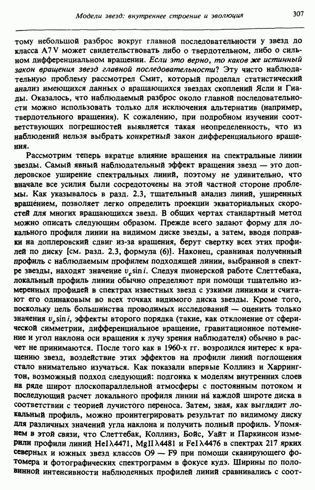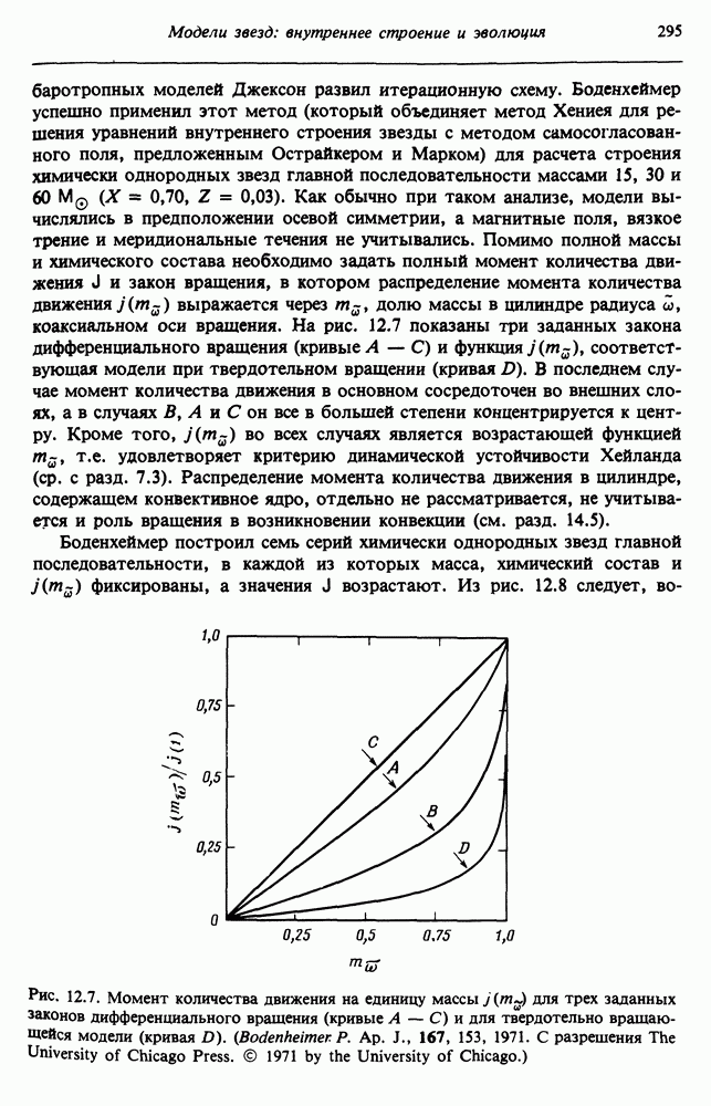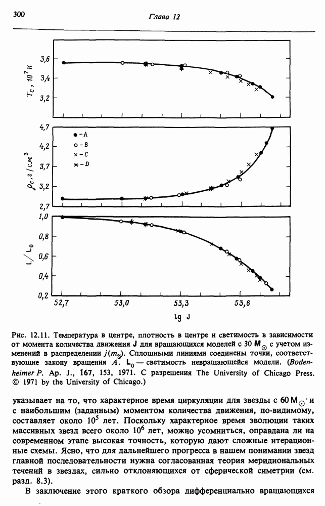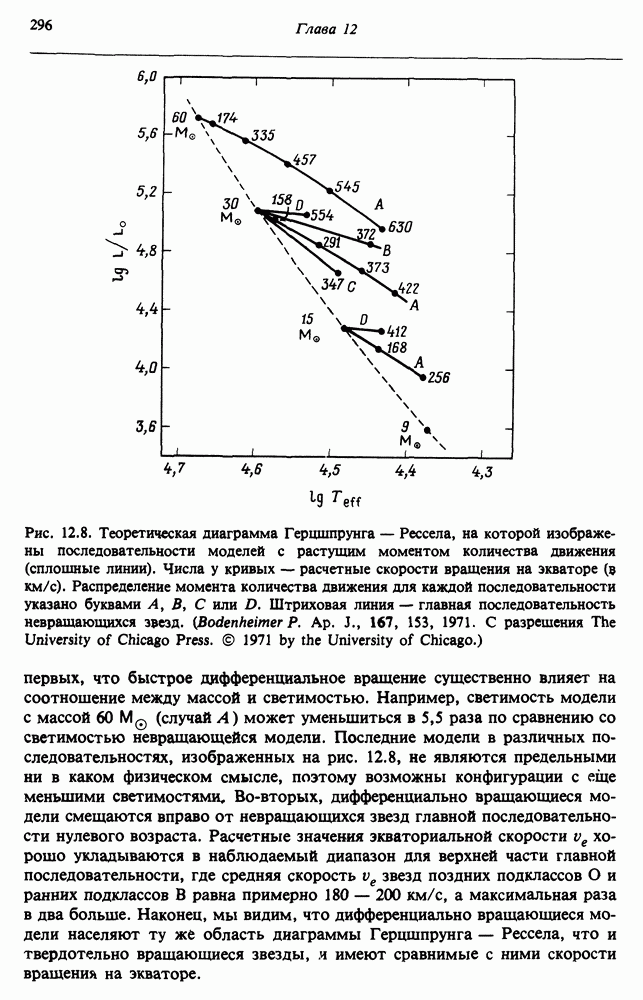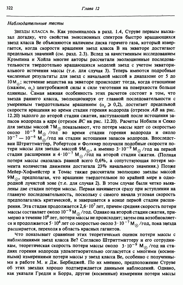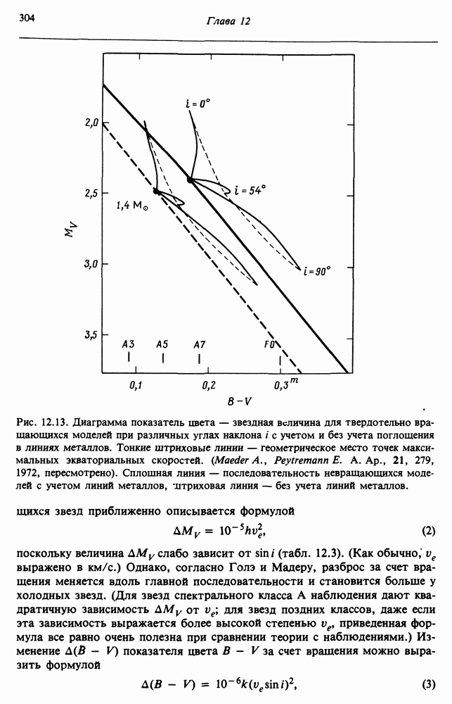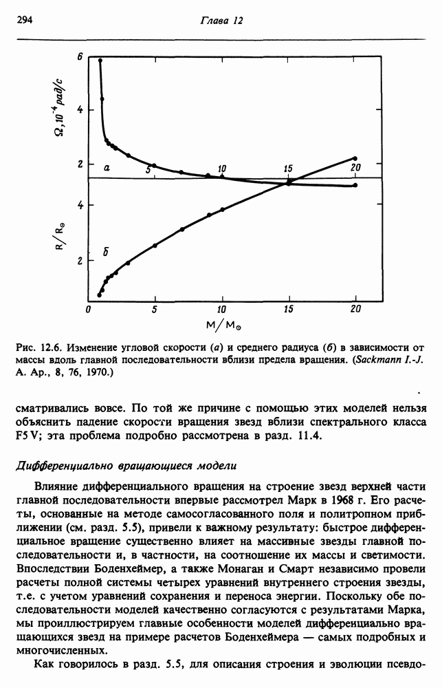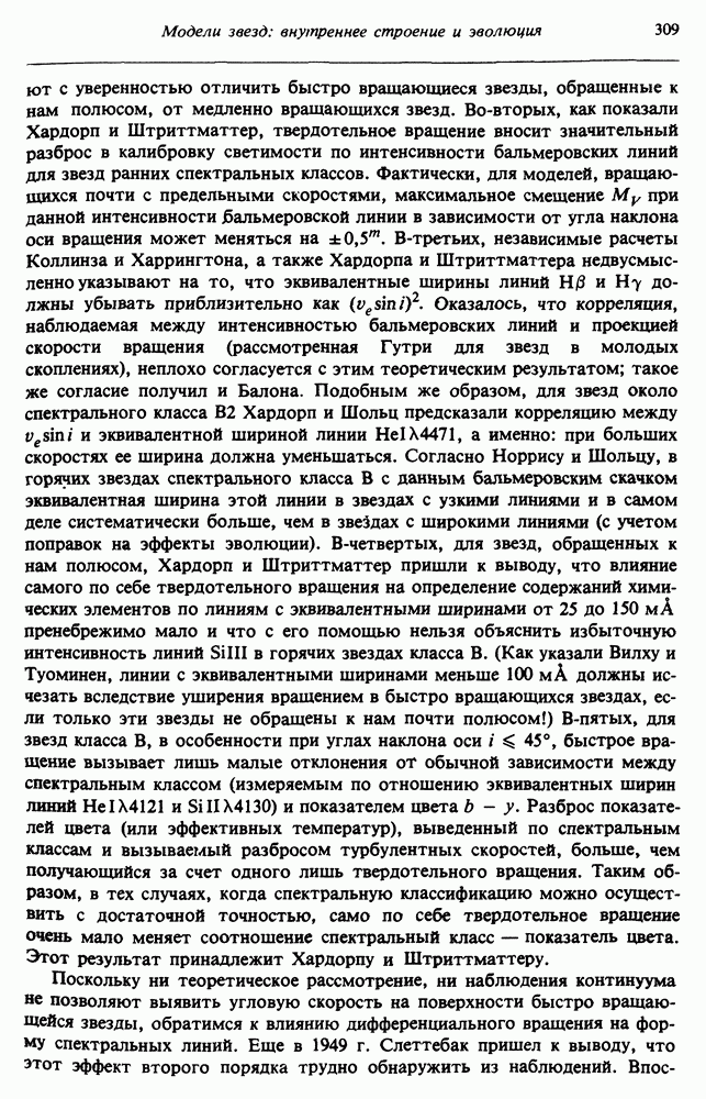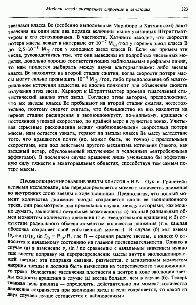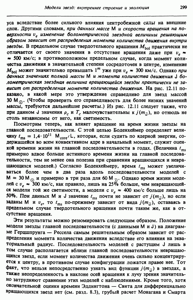 Благодаря появлению быстродействующих вычислительных машин в нашем понимании внутреннего строения и эволюции вращающихся звезд достигнут значительный прогресс. Однако, как указывалось в гл. 7, истинное распределение момента количества движения внутри звезды все еще практически не известно, поэтому во всех предлагавшихся до сих пор моделях закон вращения всегда задается ad hoc. Другими словами, даже самые подробные вычисления носят еще весьма предварительный характер, в сущности их задача — только оценить самые важные изменения, вызываемые вращением в моделях звезд. В разд. 12.2 рассматриваются изменения внутренних слоев химически однородных звезд главной последовательности под действием вращения. Следующий раздел посвящен влиянию вращения на наблюдаемые параметры, которые зависят от угла между осью вращения и лучом зрения. В разд. 12.4 рассматриваются аномально низкие скорости вращения звезд классов