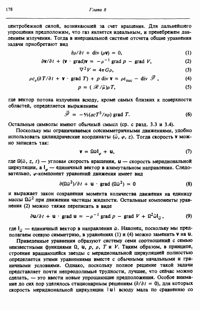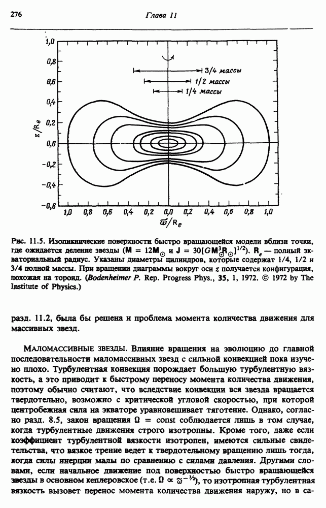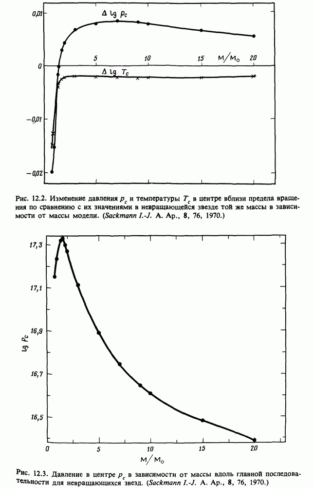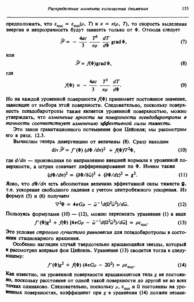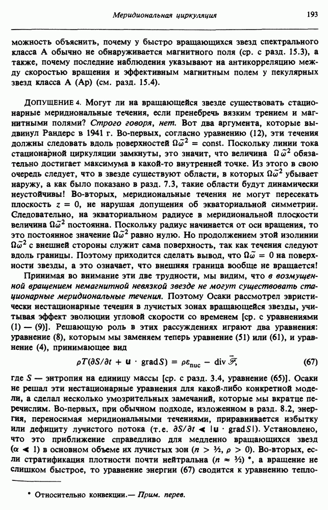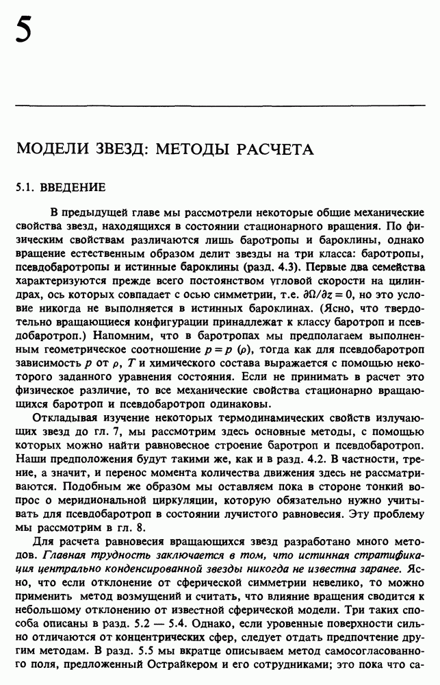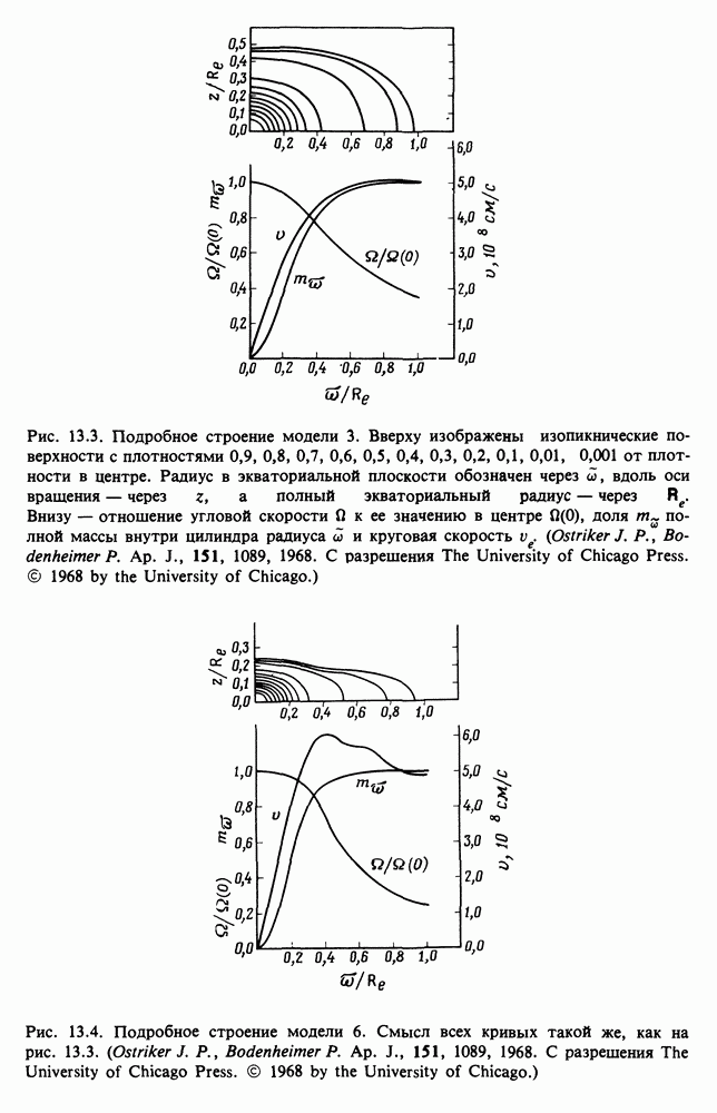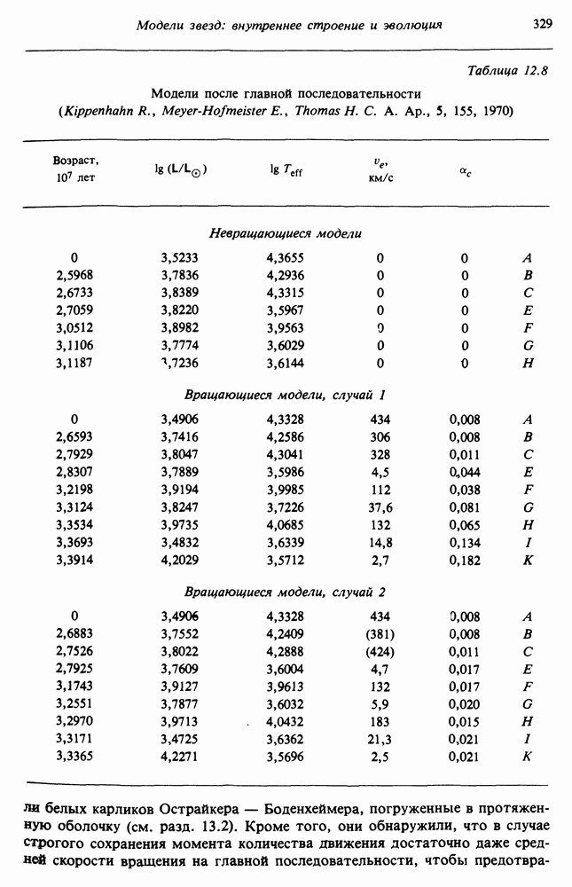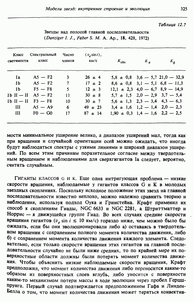 Благодаря появлению быстродействующих вычислительных машин в нашем понимании внутреннего строения и эволюции вращающихся звезд достигнут значительный прогресс. Однако, как указывалось в гл. 7, истинное распределение момента количества движения внутри звезды все еще практически не известно, поэтому во всех предлагавшихся до сих пор моделях закон вращения всегда задается ad hoc. Другими словами, даже самые подробные вычисления носят еще весьма предварительный характер, в сущности их задача — только оценить самые важные изменения, вызываемые вращением в моделях звезд. В разд. 12.2 рассматриваются изменения внутренних слоев химически однородных звезд главной последовательности под действием вращения. Следующий раздел посвящен влиянию вращения на наблюдаемые параметры, которые зависят от угла между осью вращения и лучом зрения. В разд. 12.4 рассматриваются аномально низкие скорости вращения звезд классов