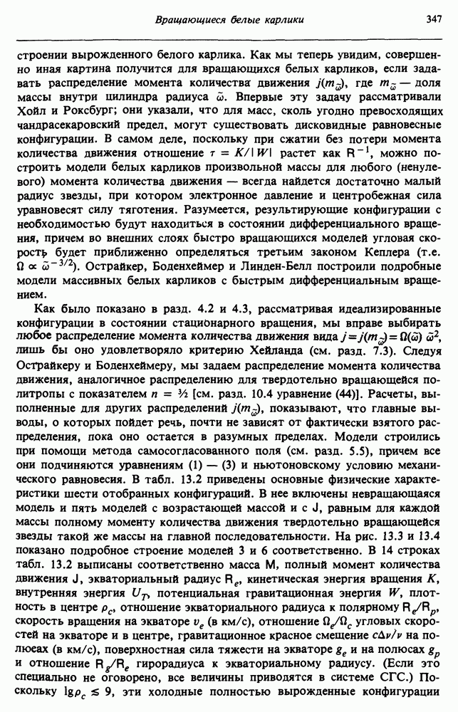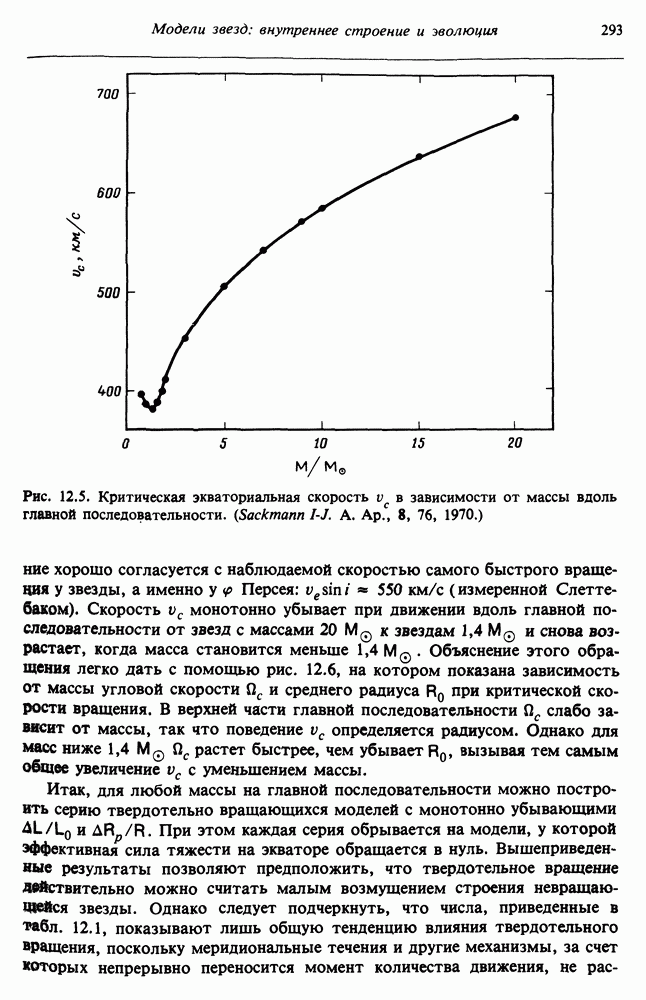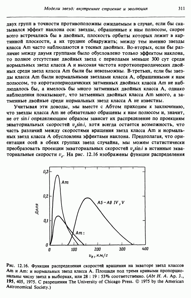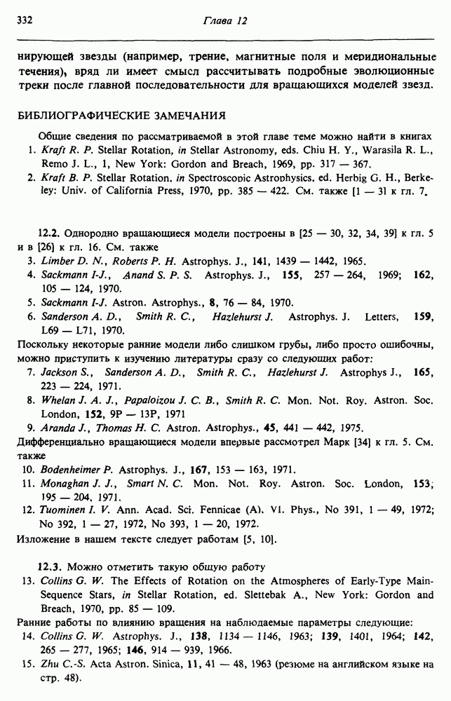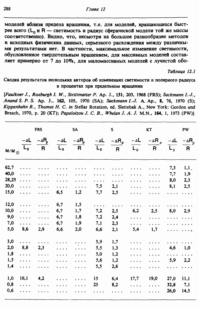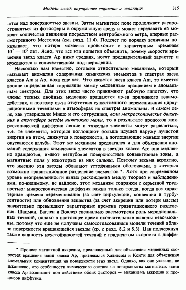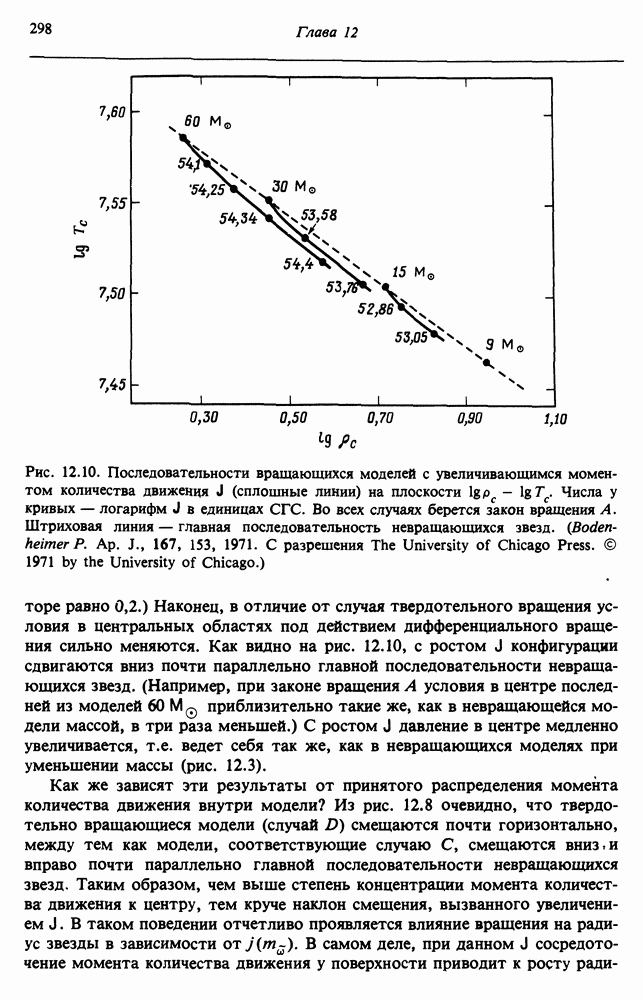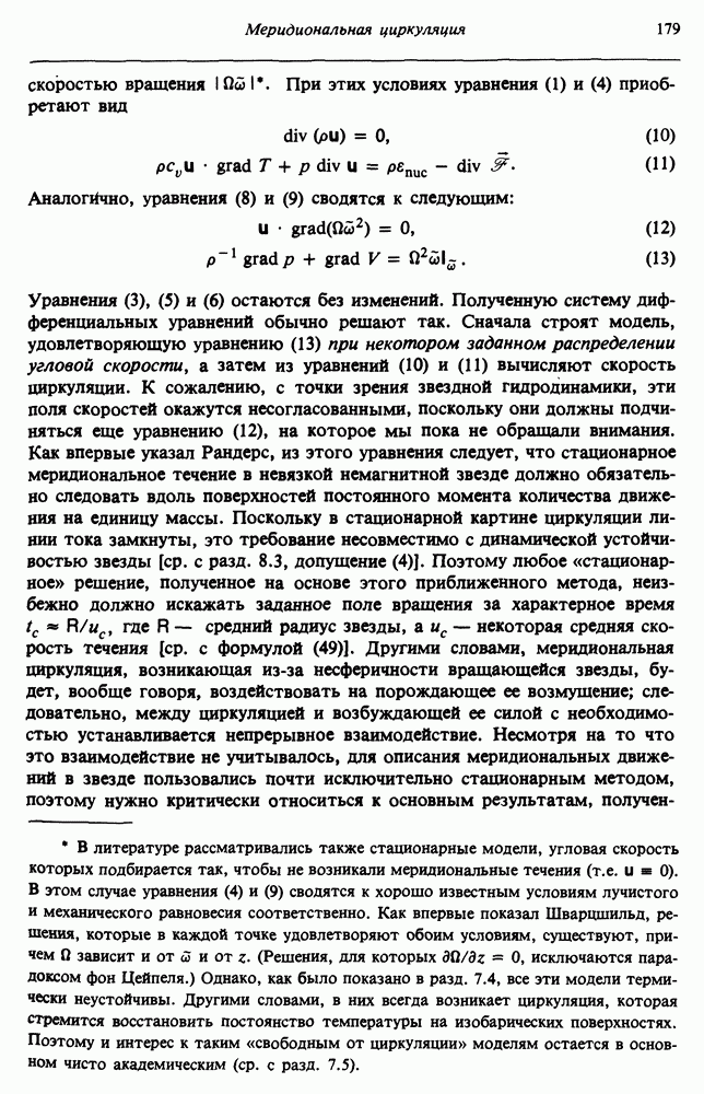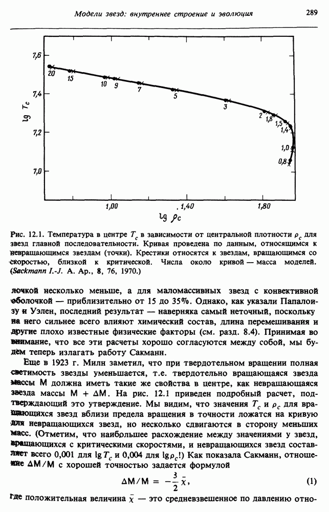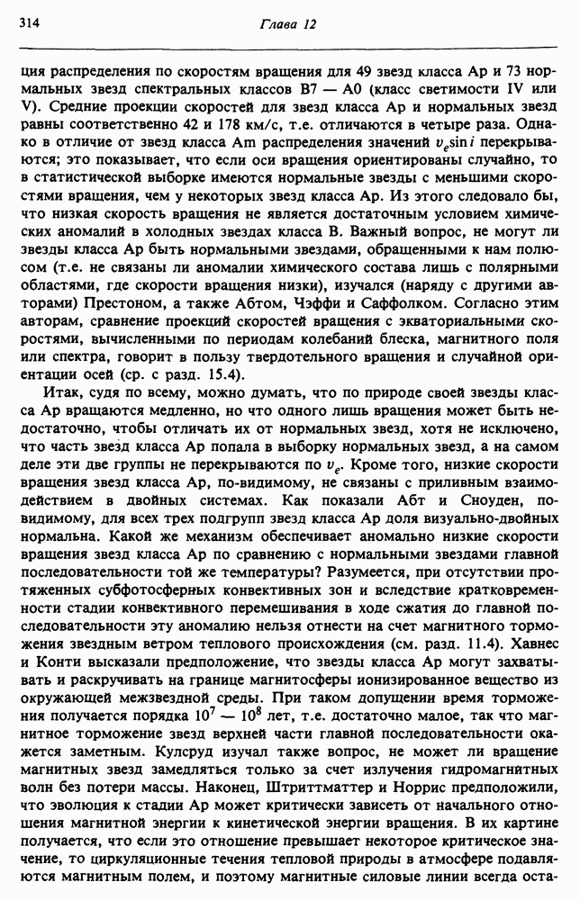 Благодаря появлению быстродействующих вычислительных машин в нашем понимании внутреннего строения и эволюции вращающихся звезд достигнут значительный прогресс. Однако, как указывалось в гл. 7, истинное распределение момента количества движения внутри звезды все еще практически не известно, поэтому во всех предлагавшихся до сих пор моделях закон вращения всегда задается ad hoc. Другими словами, даже самые подробные вычисления носят еще весьма предварительный характер, в сущности их задача — только оценить самые важные изменения, вызываемые вращением в моделях звезд. В разд. 12.2 рассматриваются изменения внутренних слоев химически однородных звезд главной последовательности под действием вращения. Следующий раздел посвящен влиянию вращения на наблюдаемые параметры, которые зависят от угла между осью вращения и лучом зрения. В разд. 12.4 рассматриваются аномально низкие скорости вращения звезд классов