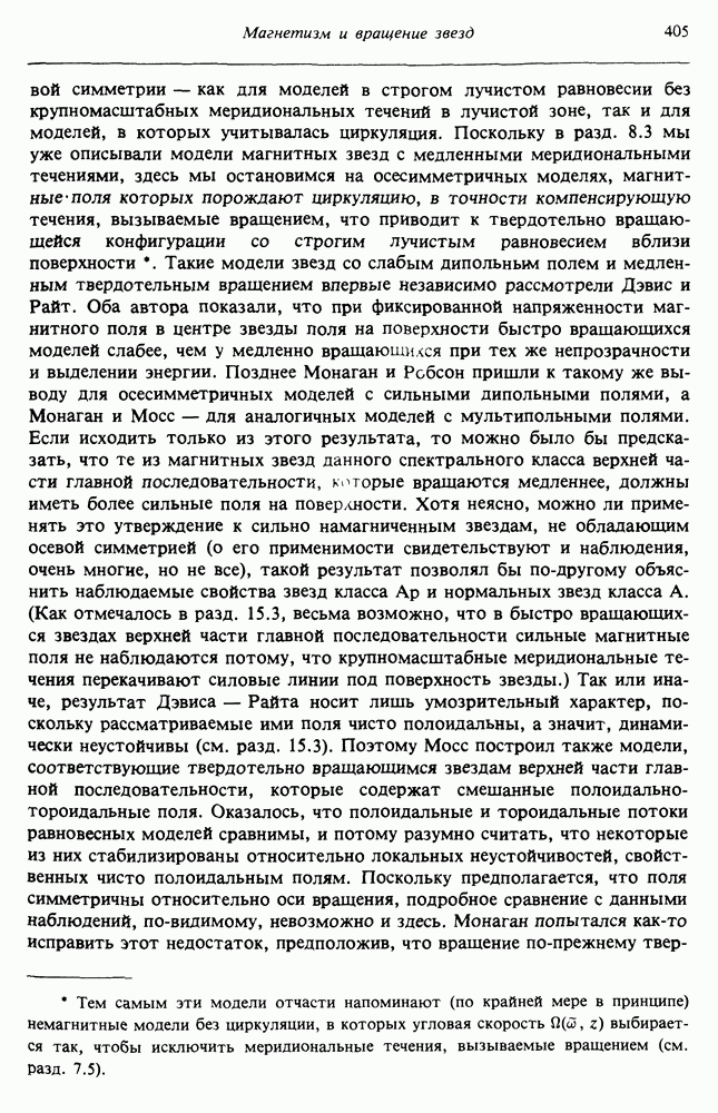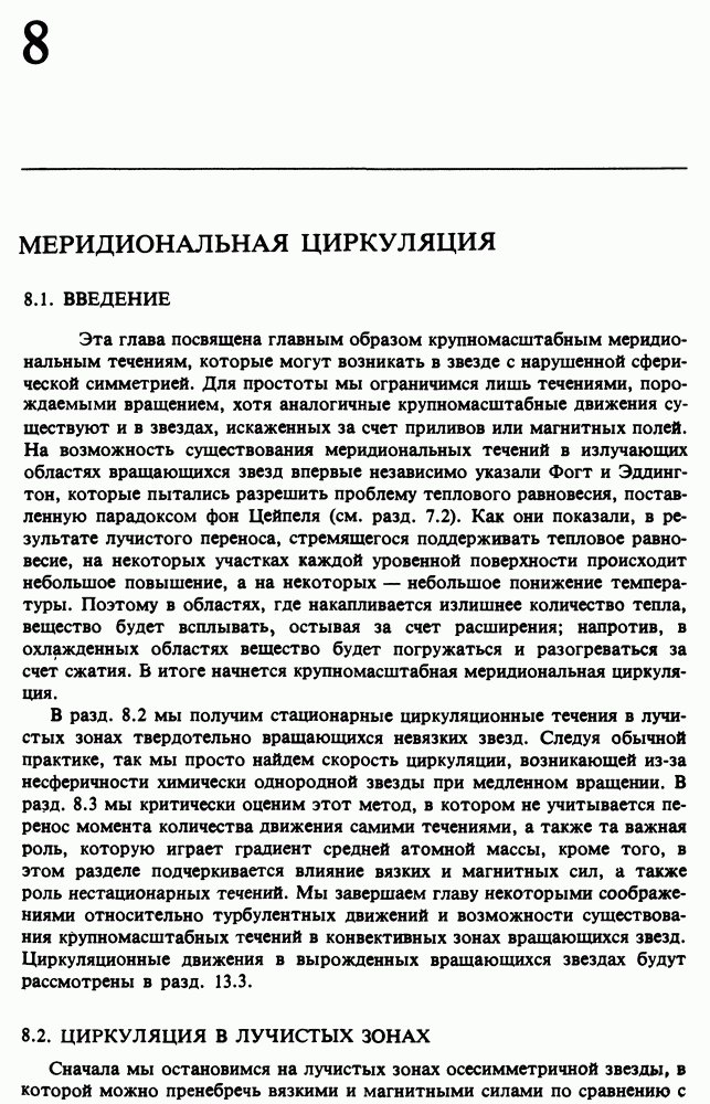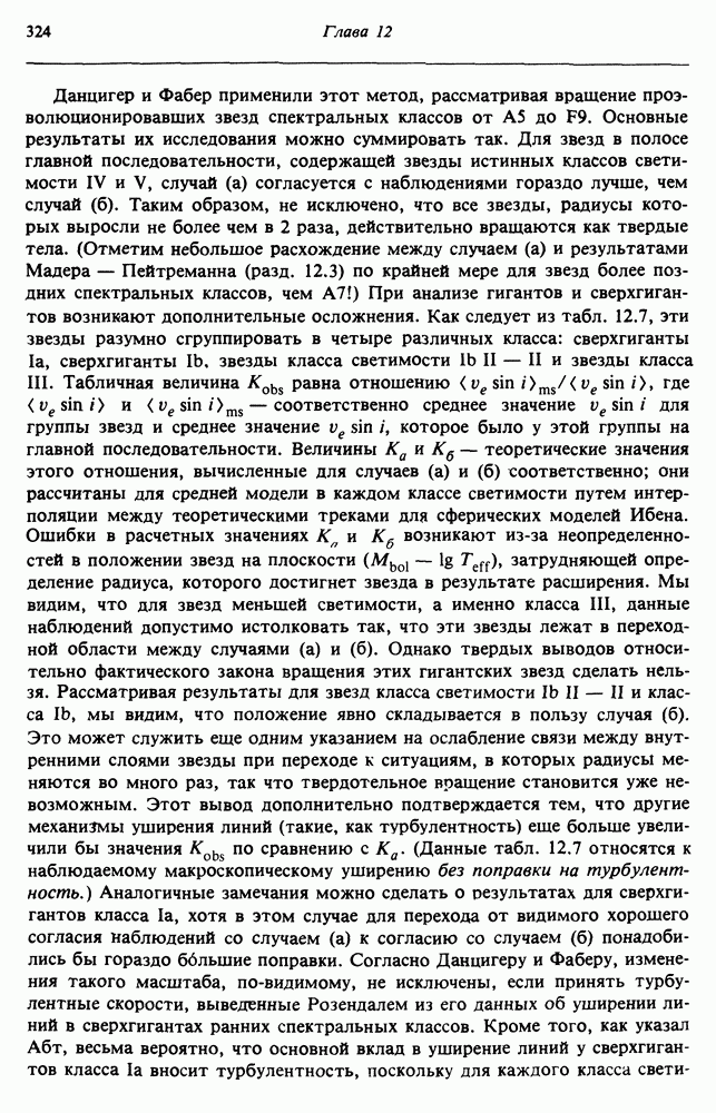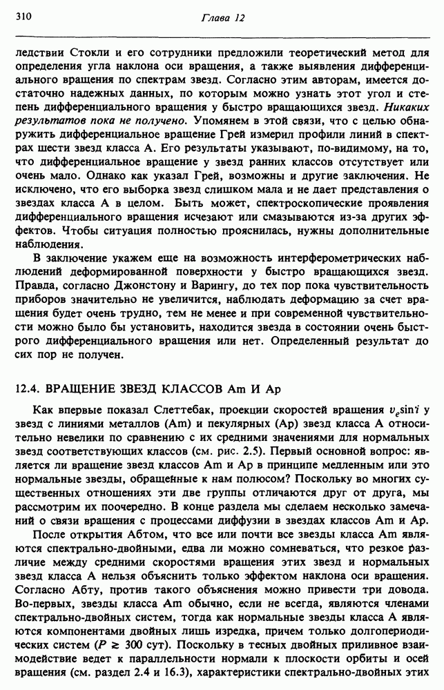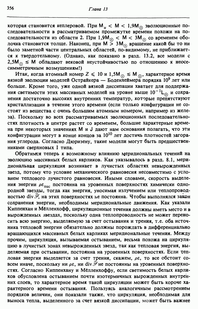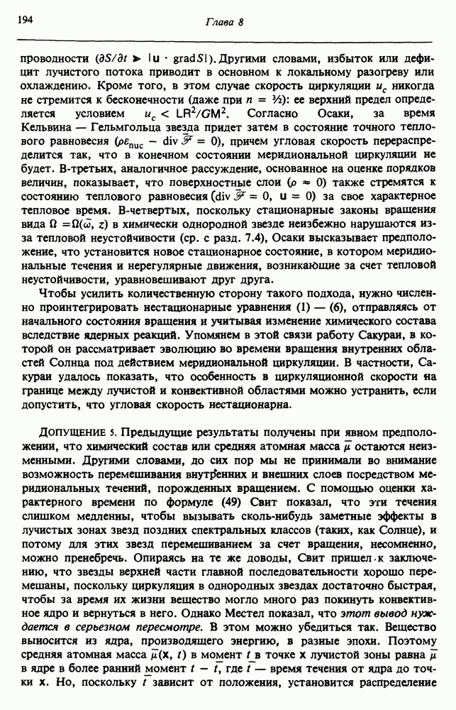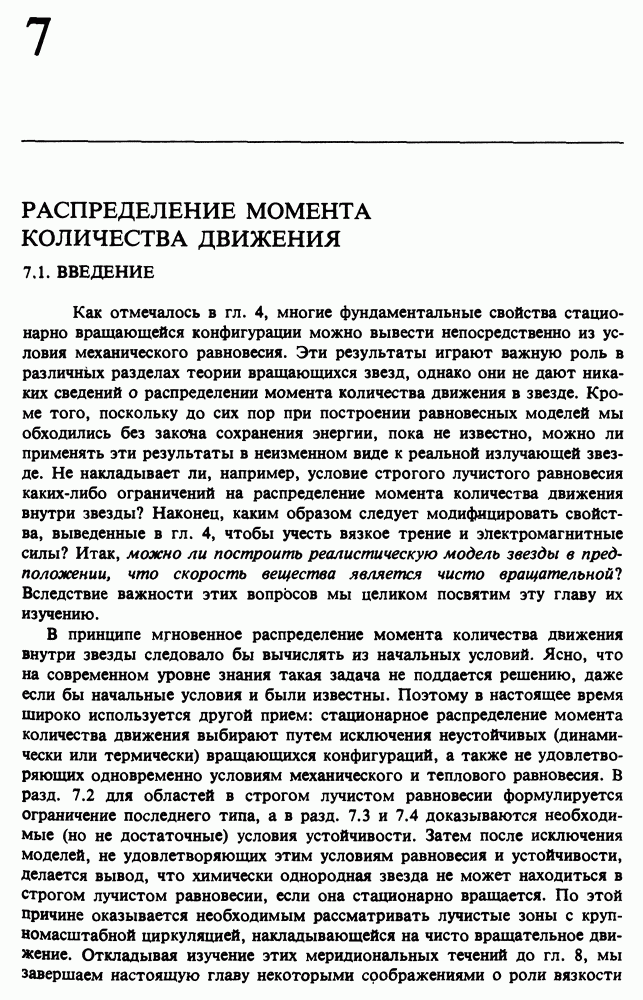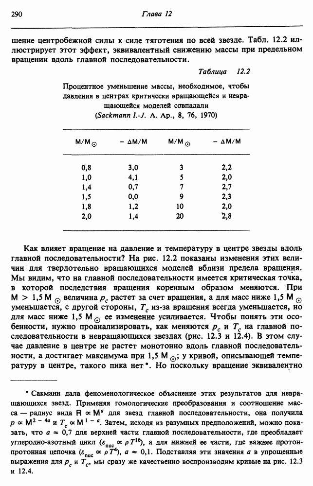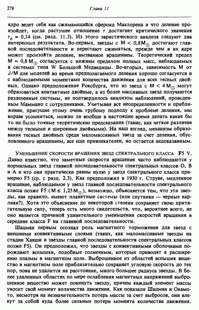 Благодаря появлению быстродействующих вычислительных машин в нашем понимании внутреннего строения и эволюции вращающихся звезд достигнут значительный прогресс. Однако, как указывалось в гл. 7, истинное распределение момента количества движения внутри звезды все еще практически не известно, поэтому во всех предлагавшихся до сих пор моделях закон вращения всегда задается ad hoc. Другими словами, даже самые подробные вычисления носят еще весьма предварительный характер, в сущности их задача — только оценить самые важные изменения, вызываемые вращением в моделях звезд. В разд. 12.2 рассматриваются изменения внутренних слоев химически однородных звезд главной последовательности под действием вращения. Следующий раздел посвящен влиянию вращения на наблюдаемые параметры, которые зависят от угла между осью вращения и лучом зрения. В разд. 12.4 рассматриваются аномально низкие скорости вращения звезд классов