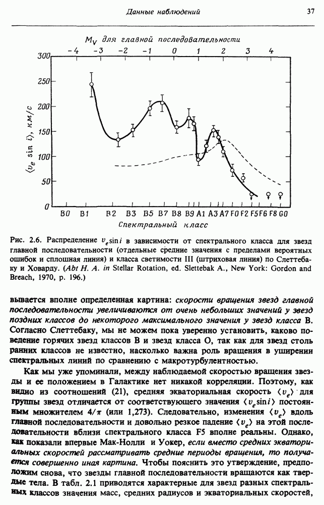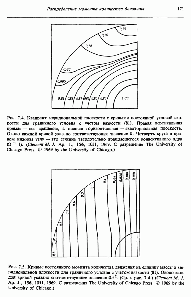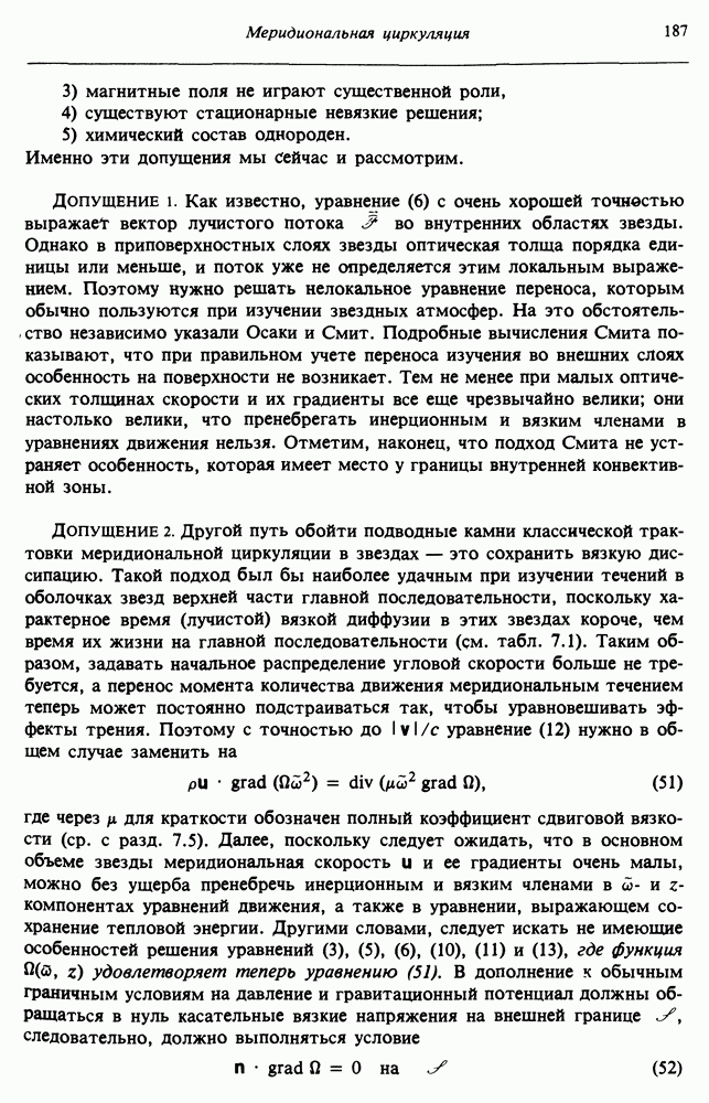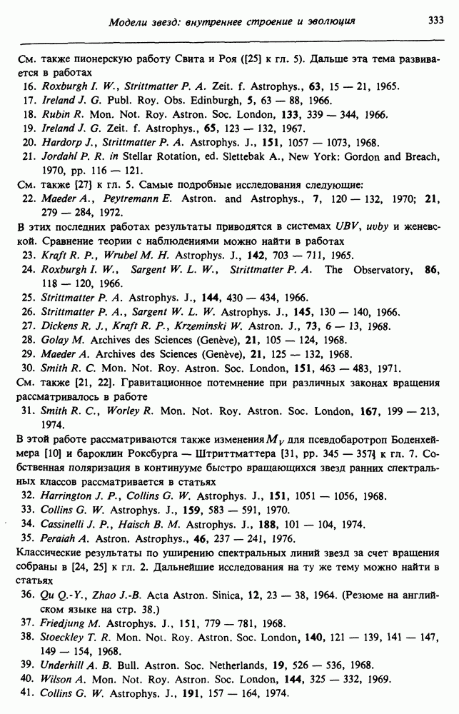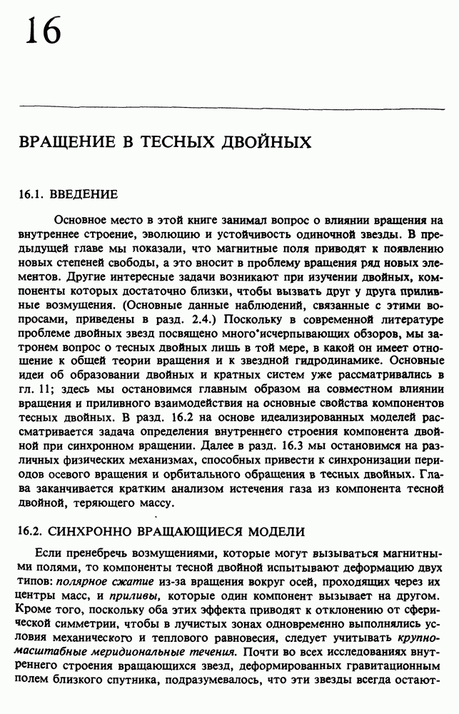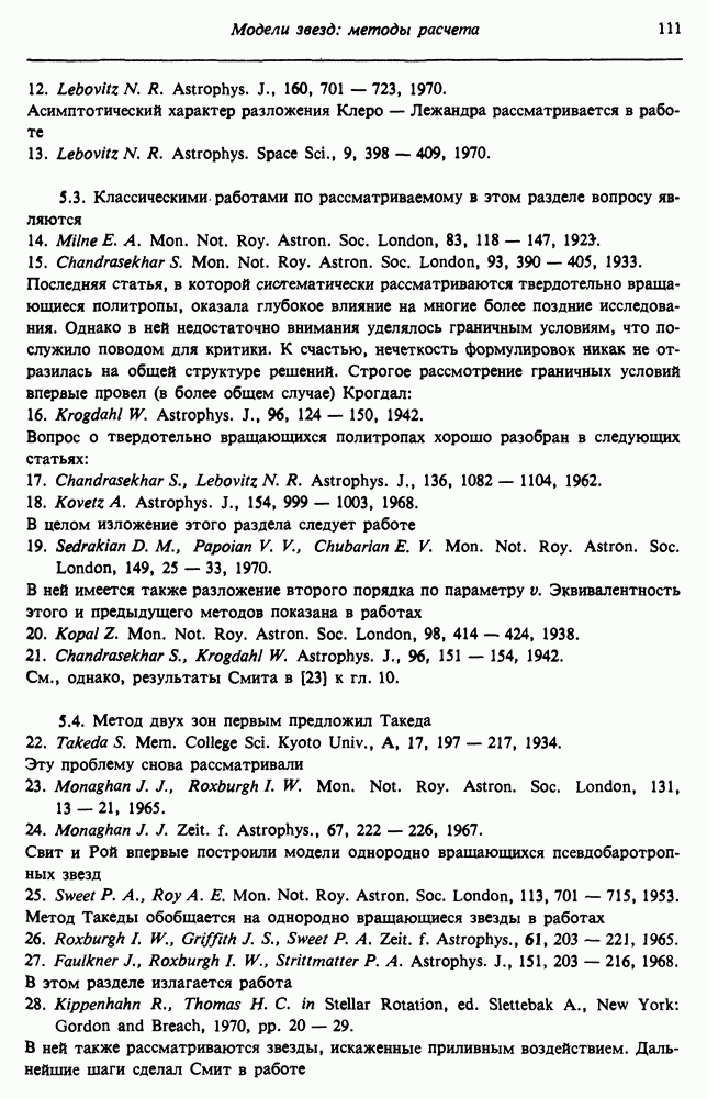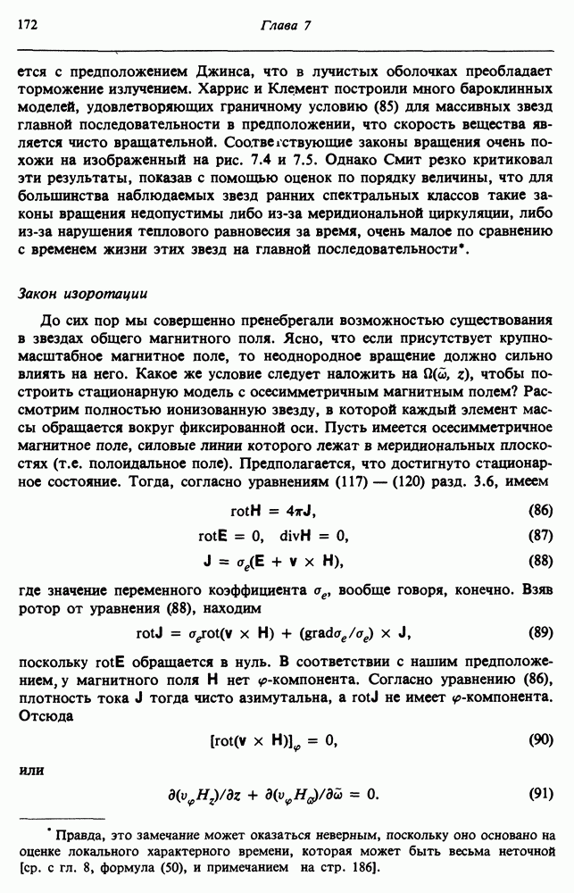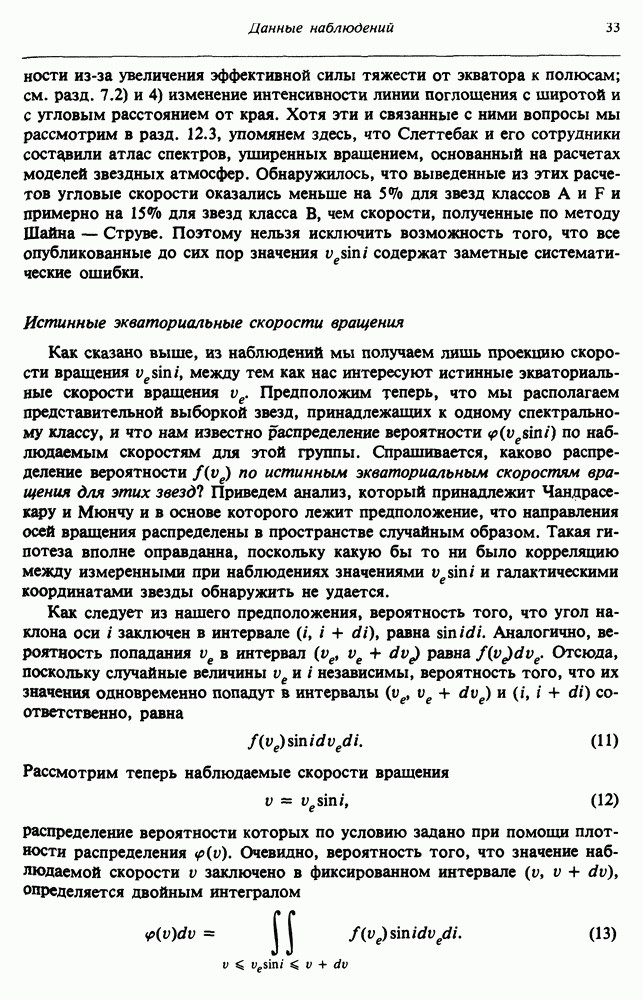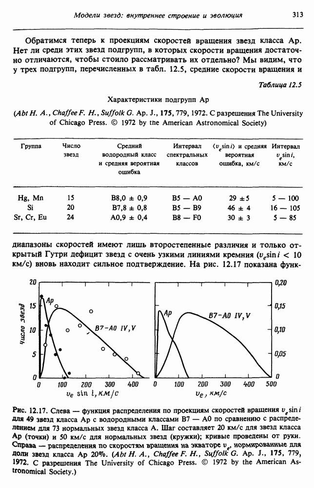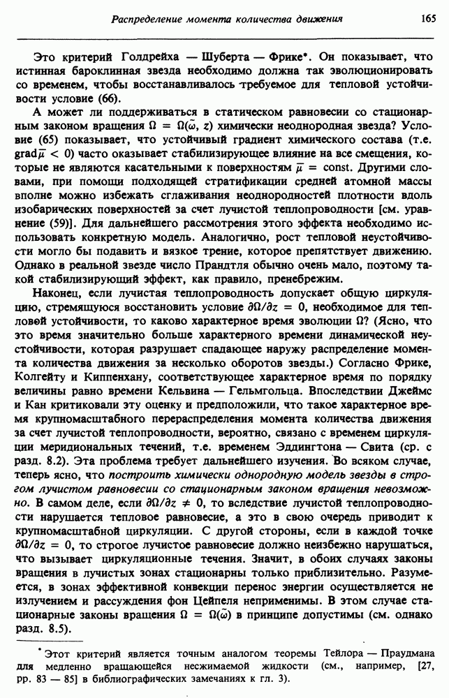 Благодаря появлению быстродействующих вычислительных машин в нашем понимании внутреннего строения и эволюции вращающихся звезд достигнут значительный прогресс. Однако, как указывалось в гл. 7, истинное распределение момента количества движения внутри звезды все еще практически не известно, поэтому во всех предлагавшихся до сих пор моделях закон вращения всегда задается ad hoc. Другими словами, даже самые подробные вычисления носят еще весьма предварительный характер, в сущности их задача — только оценить самые важные изменения, вызываемые вращением в моделях звезд. В разд. 12.2 рассматриваются изменения внутренних слоев химически однородных звезд главной последовательности под действием вращения. Следующий раздел посвящен влиянию вращения на наблюдаемые параметры, которые зависят от угла между осью вращения и лучом зрения. В разд. 12.4 рассматриваются аномально низкие скорости вращения звезд классов