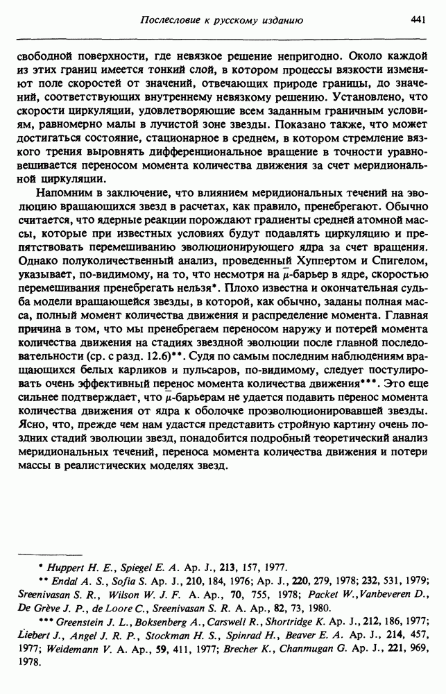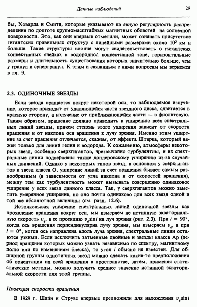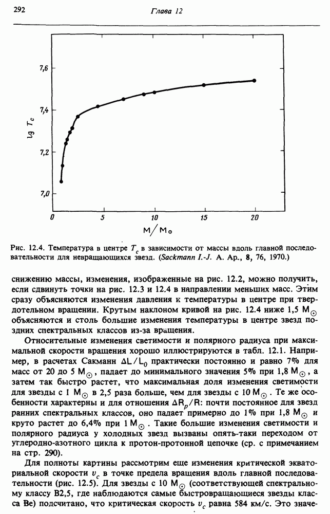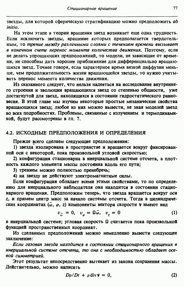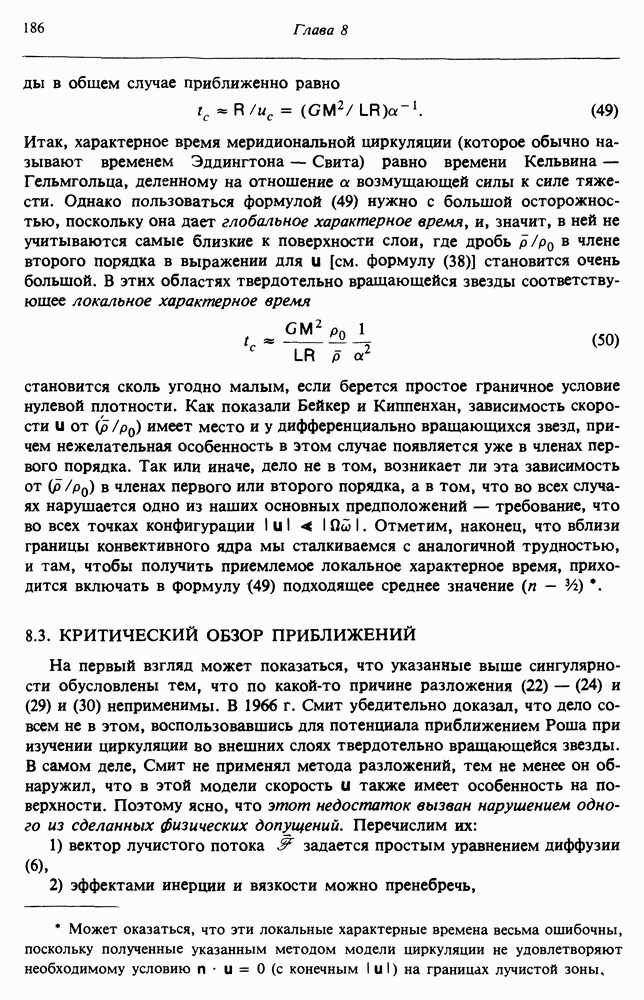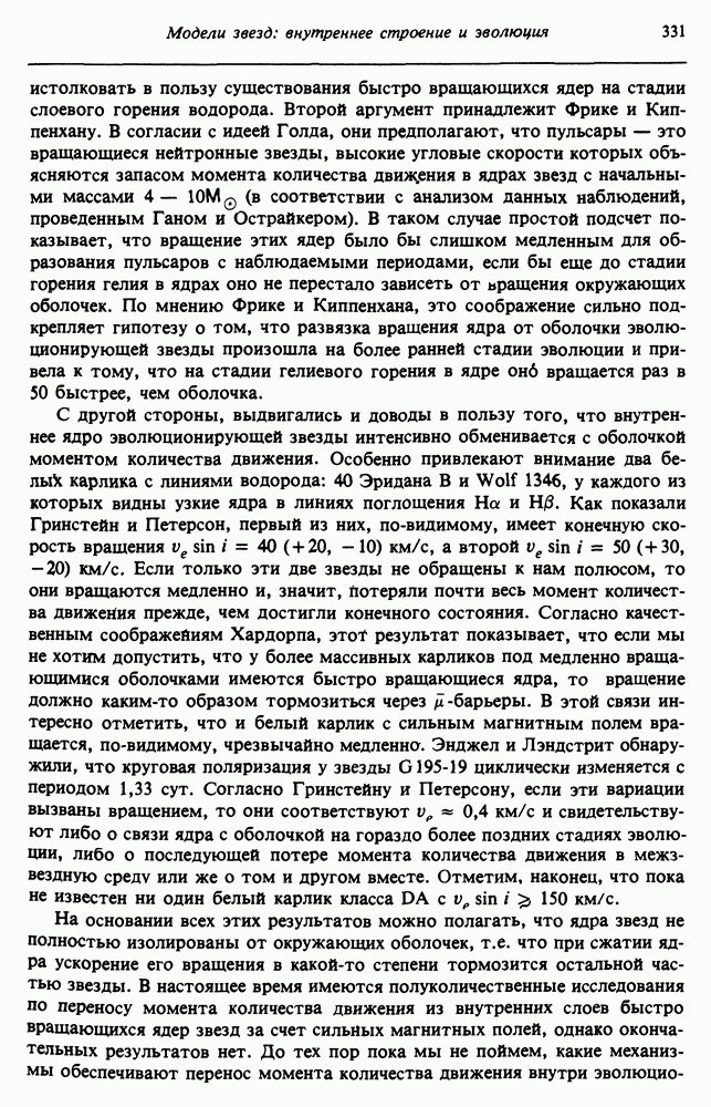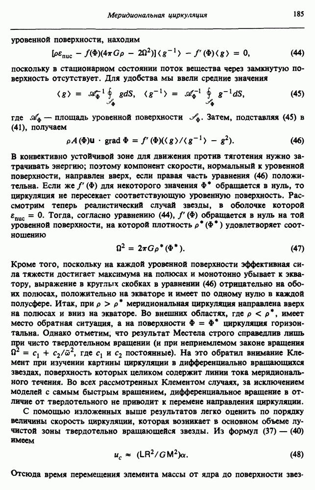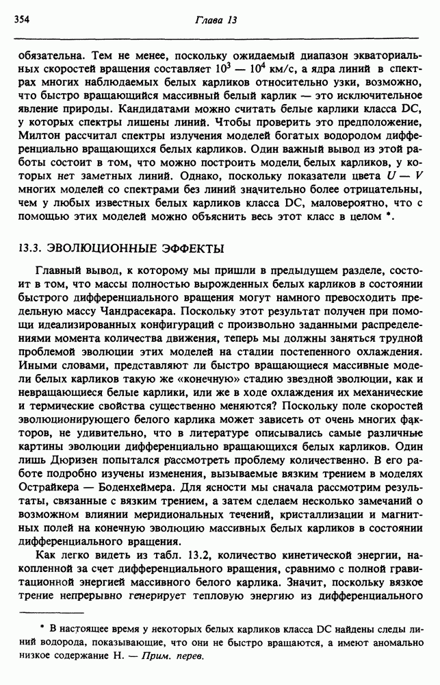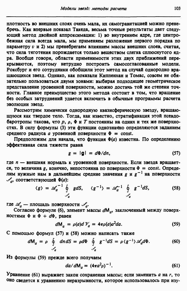 Благодаря появлению быстродействующих вычислительных машин в нашем понимании внутреннего строения и эволюции вращающихся звезд достигнут значительный прогресс. Однако, как указывалось в гл. 7, истинное распределение момента количества движения внутри звезды все еще практически не известно, поэтому во всех предлагавшихся до сих пор моделях закон вращения всегда задается ad hoc. Другими словами, даже самые подробные вычисления носят еще весьма предварительный характер, в сущности их задача — только оценить самые важные изменения, вызываемые вращением в моделях звезд. В разд. 12.2 рассматриваются изменения внутренних слоев химически однородных звезд главной последовательности под действием вращения. Следующий раздел посвящен влиянию вращения на наблюдаемые параметры, которые зависят от угла между осью вращения и лучом зрения. В разд. 12.4 рассматриваются аномально низкие скорости вращения звезд классов