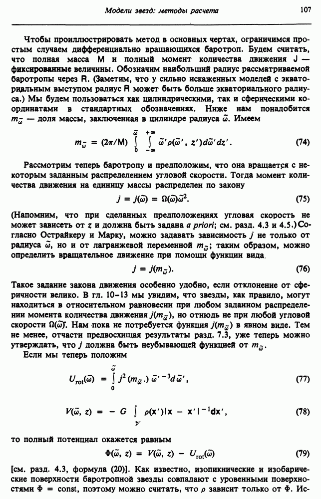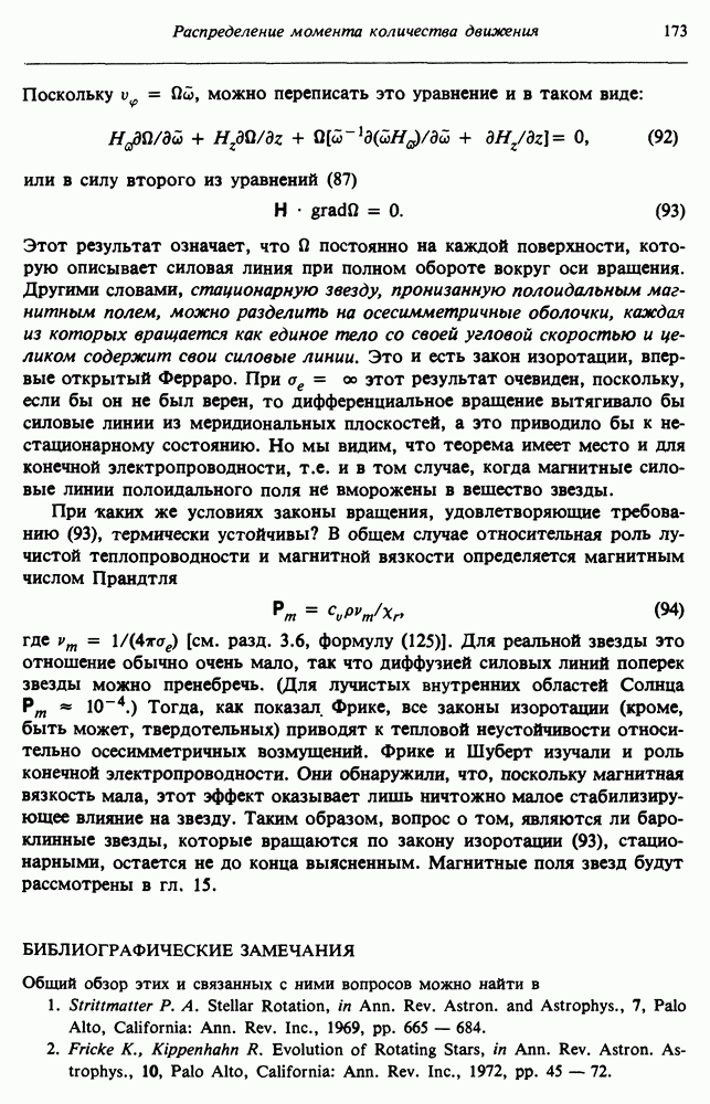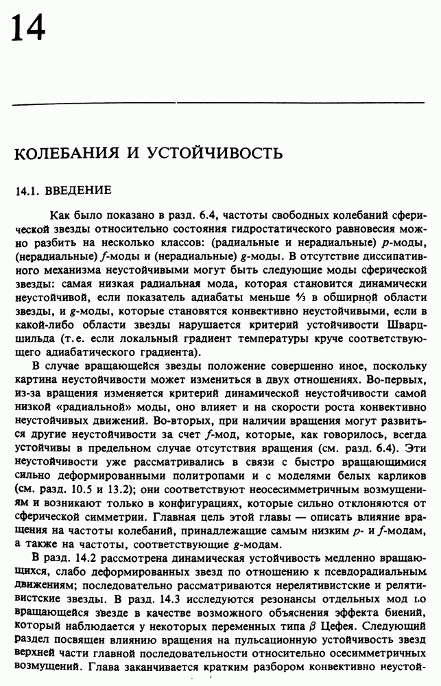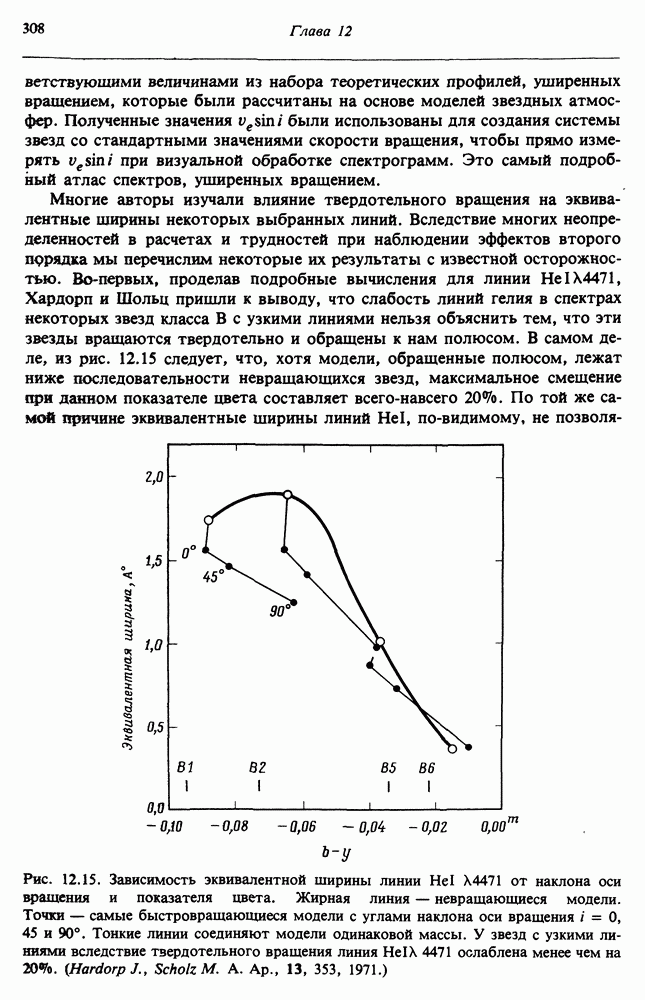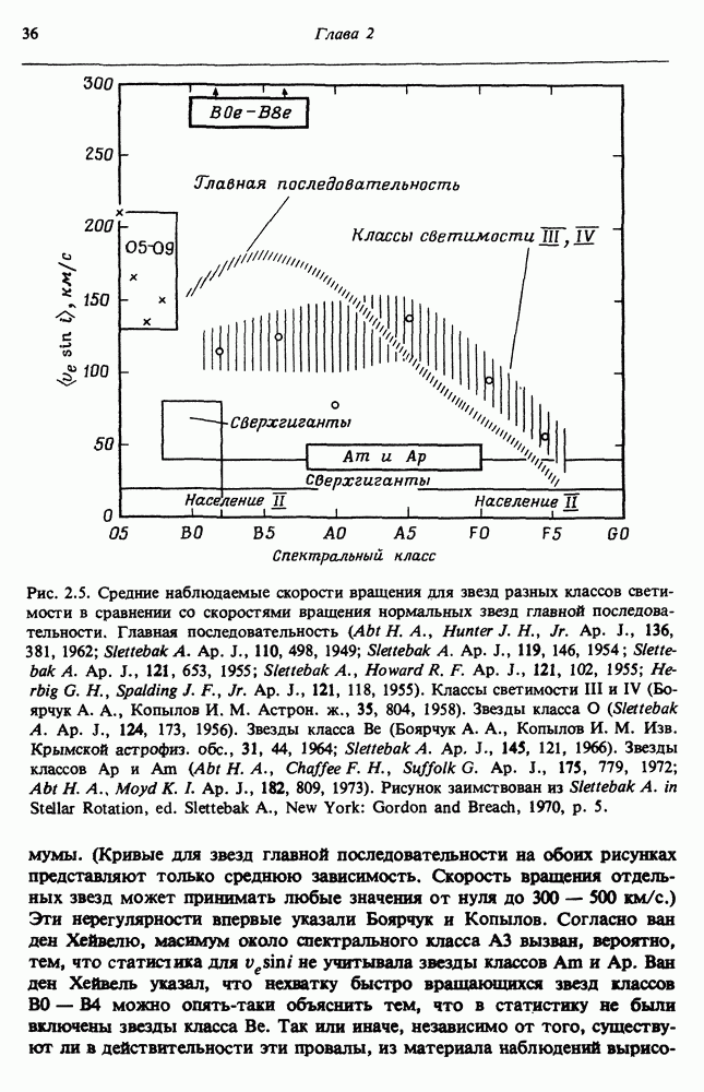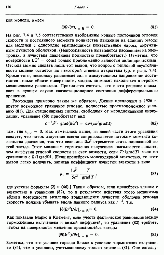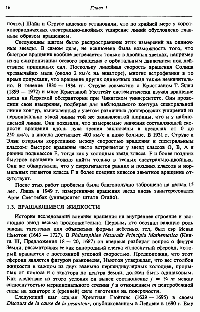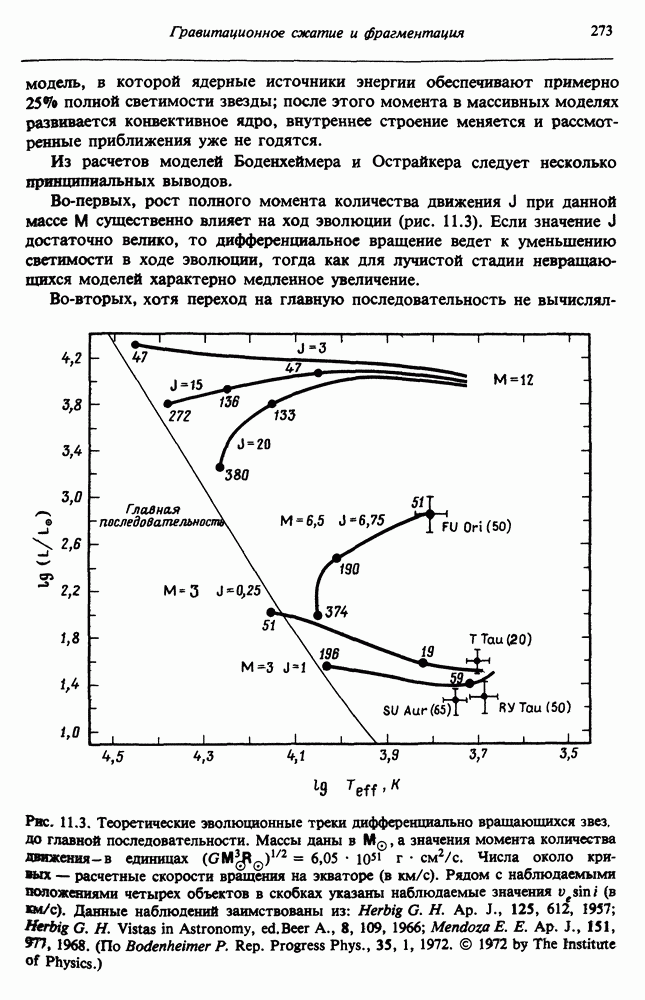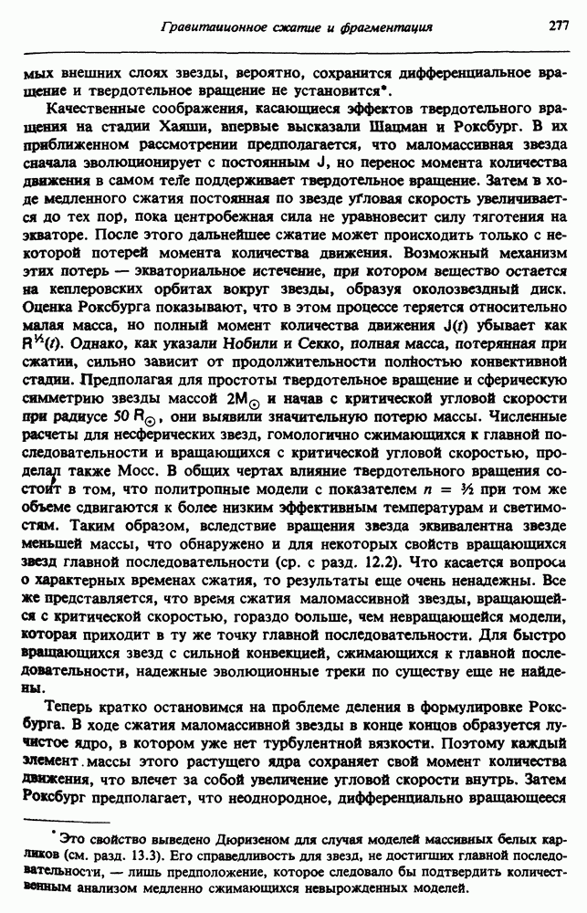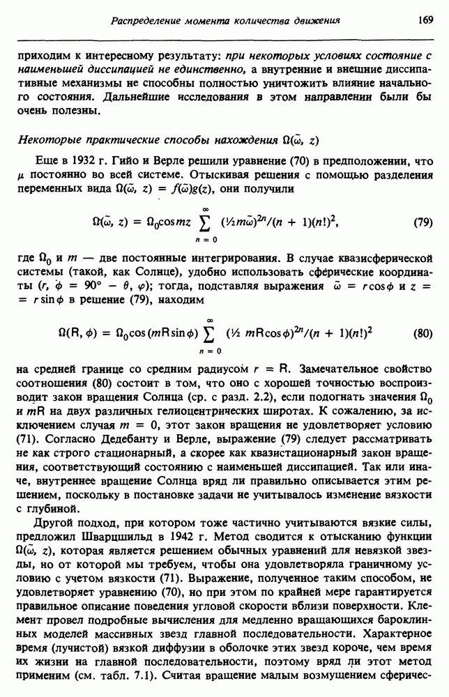 Благодаря появлению быстродействующих вычислительных машин в нашем понимании внутреннего строения и эволюции вращающихся звезд достигнут значительный прогресс. Однако, как указывалось в гл. 7, истинное распределение момента количества движения внутри звезды все еще практически не известно, поэтому во всех предлагавшихся до сих пор моделях закон вращения всегда задается ad hoc. Другими словами, даже самые подробные вычисления носят еще весьма предварительный характер, в сущности их задача — только оценить самые важные изменения, вызываемые вращением в моделях звезд. В разд. 12.2 рассматриваются изменения внутренних слоев химически однородных звезд главной последовательности под действием вращения. Следующий раздел посвящен влиянию вращения на наблюдаемые параметры, которые зависят от угла между осью вращения и лучом зрения. В разд. 12.4 рассматриваются аномально низкие скорости вращения звезд классов