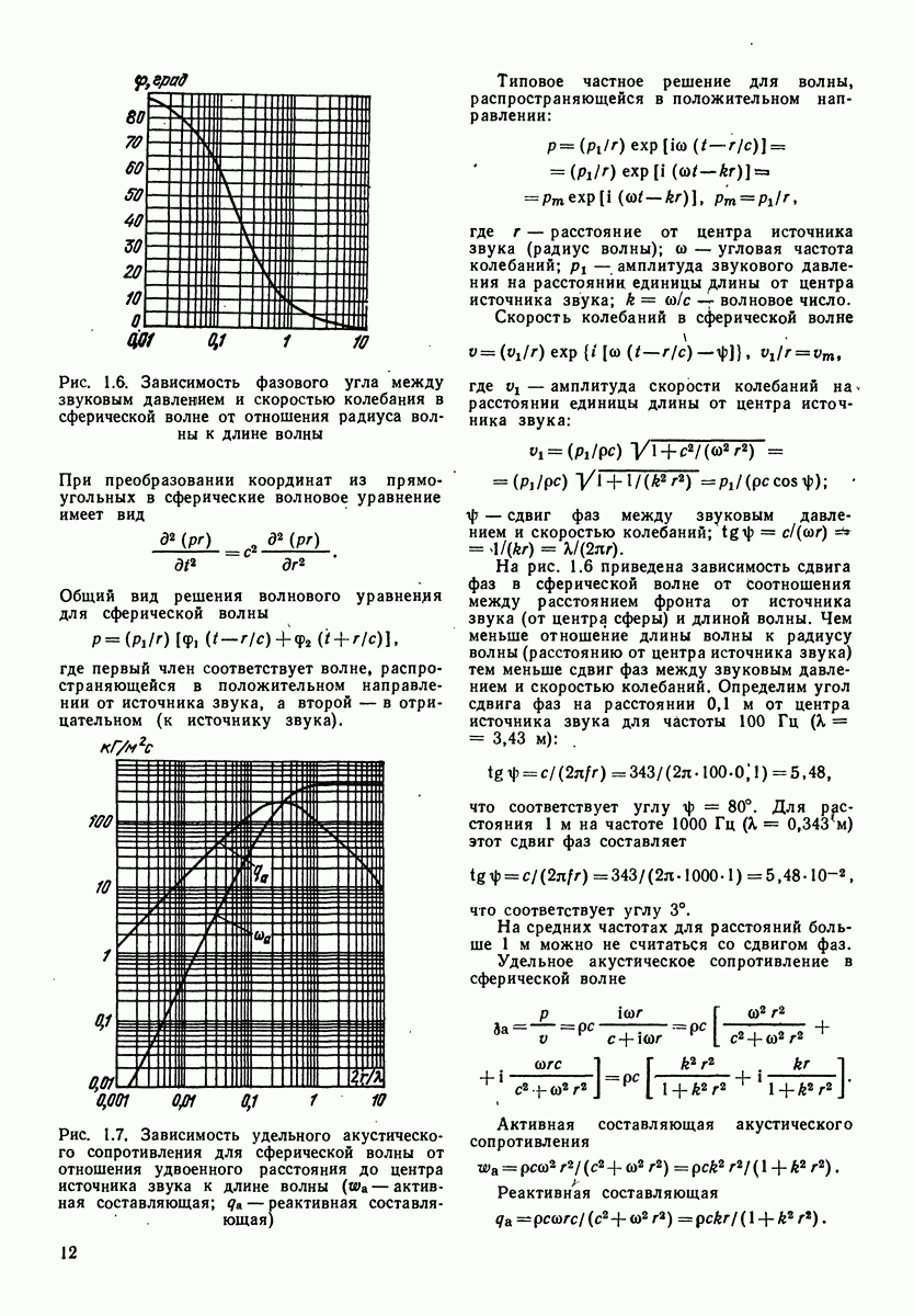 На рис. 1.6 приведена зависимость сдвига фаз в сферической волне от Соотношения между расстоянием фронта от источника звука (от центра сферы) и длиной волны. Чем меньше отношение длины волны к радиусу волны (расстоянию от центра источника звука) тем меньше сдвиг фаз между звуковым давлением и скоростью колебаний. Определим угол сдвига фаз на расстоянии