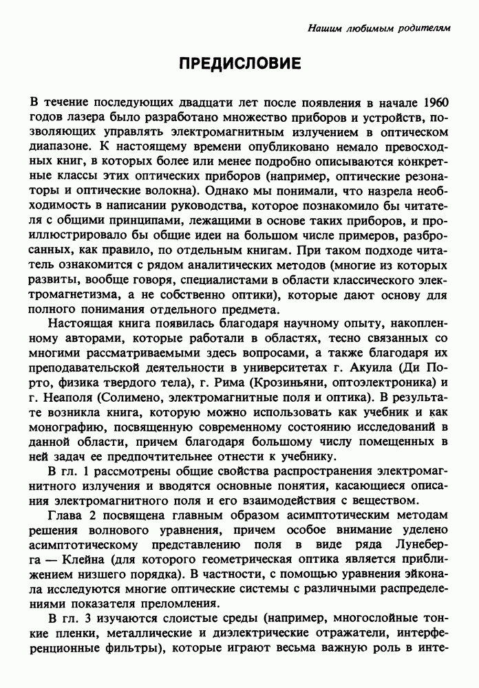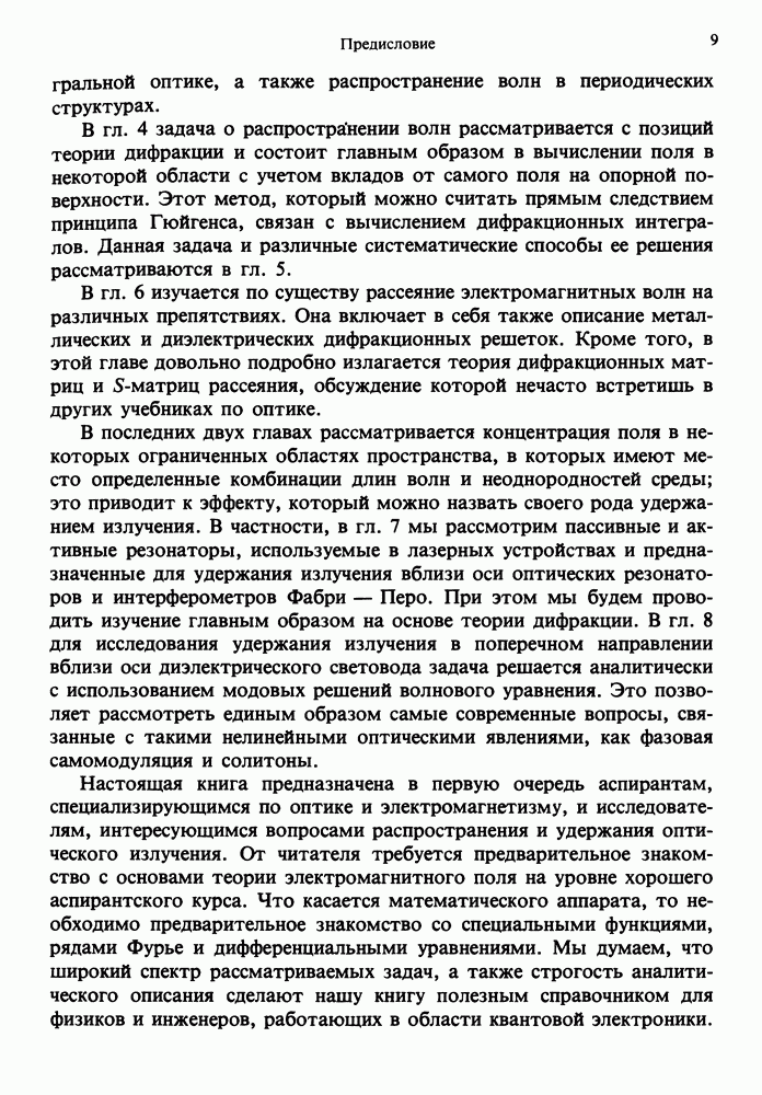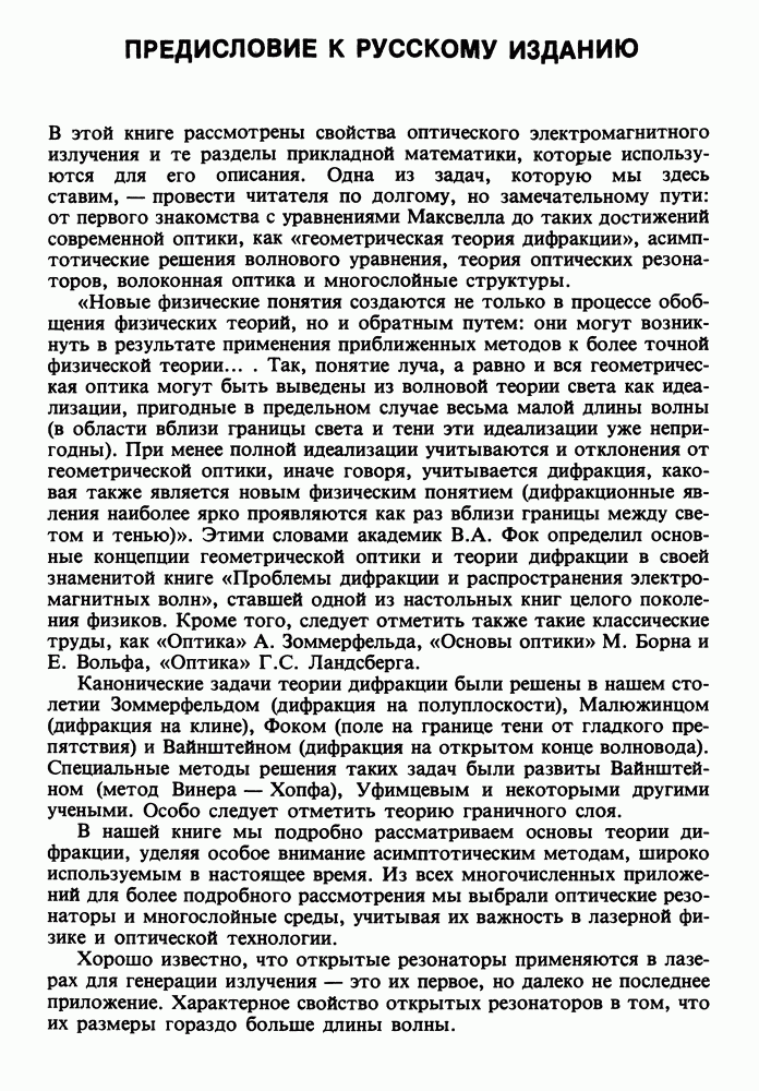 В нашей книге мы подробно рассматриваем основы теории дифракции, уделяя особое внимание асимптотическим методам, широко используемым в настоящее время. Из всех многочисленных приложений для более подробного рассмотрения мы выбрали оптические резонаторы и многослойные среды, учитывая их важность в лазерной физике и оптической технологии.