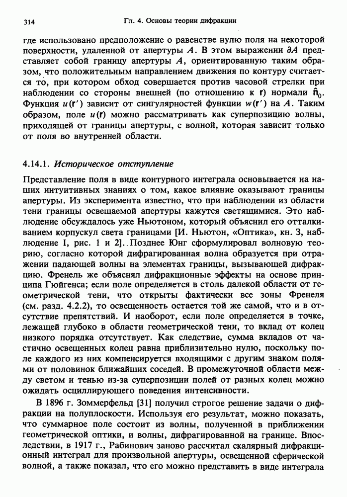 Канонические задачи теории дифракции были решены в нашем столетии Зоммерфельдом (дифракция на полуплоскости), Малюжинцом (дифракция на клине), Фоком (поле на границе тени от гладкого препятствия) и Вайнштейном (дифракция на открытом конце волновода). Специальные методы решения таких задач были развиты Вайнштейном (метод Винера — Хопфа), Уфимцевым и некоторыми другими учеными. Особо следует отметить теорию граничного слоя.