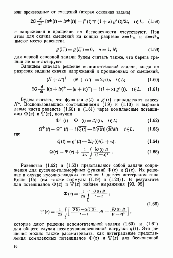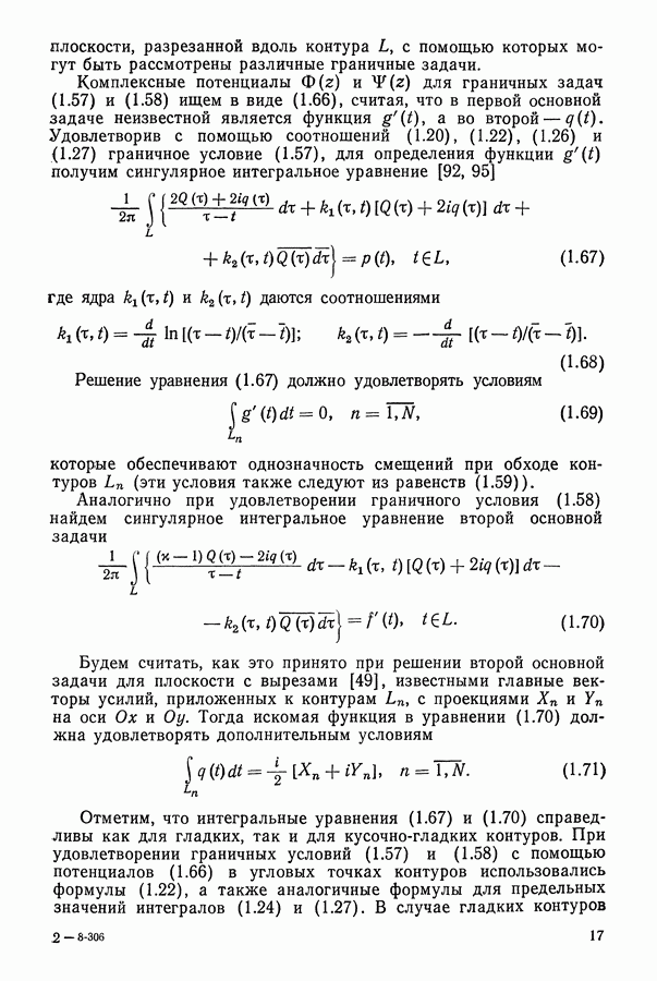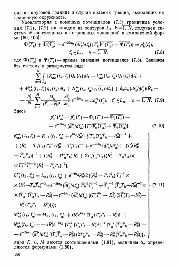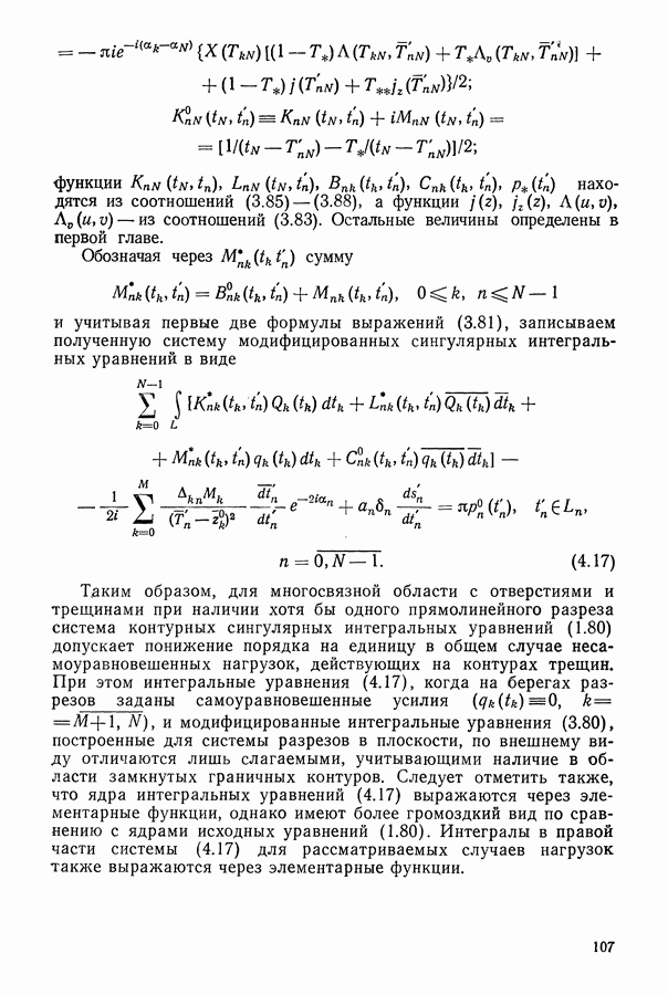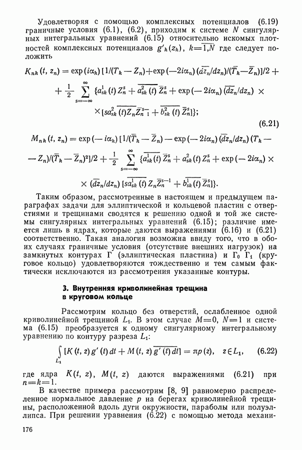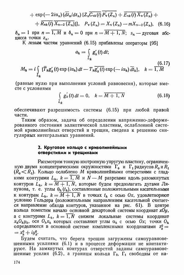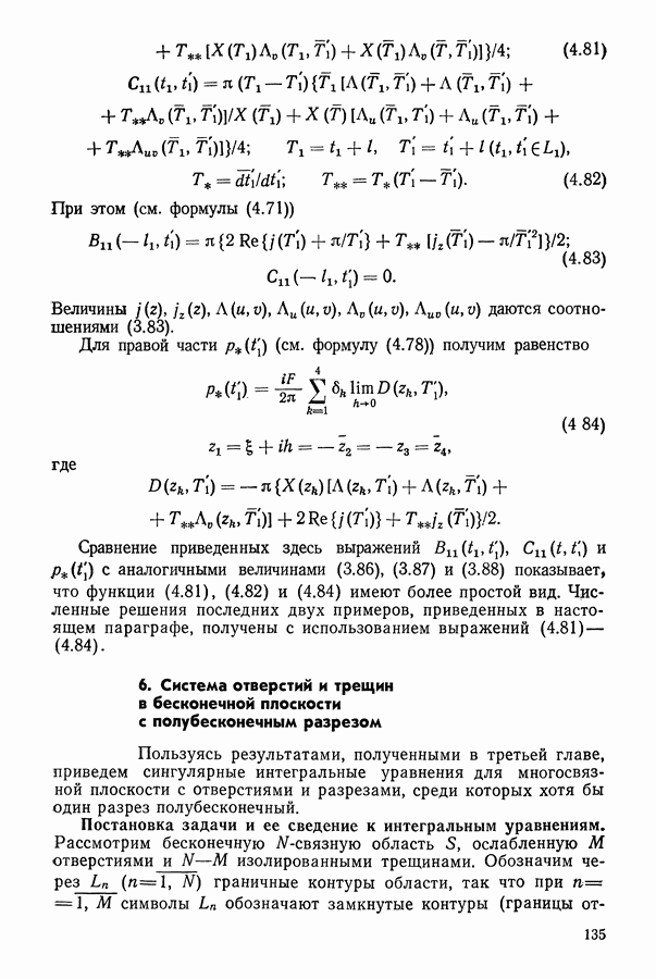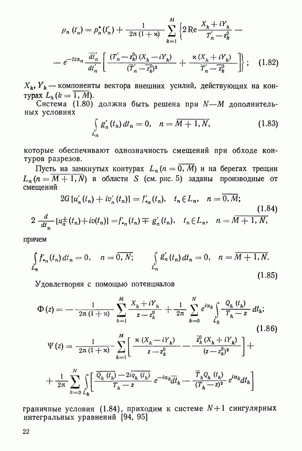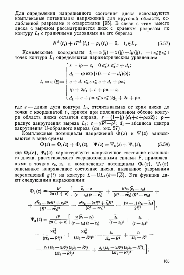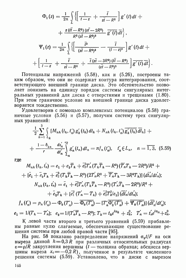 Потенциалы напряжений (5.58), как и (5.26), построены таким образом, что они не содержат контура интегрирования, соответствующего внешней границе диска. Это обстоятельство позволяет понизить на единицу порядок системы сингулярных интегральных уравнений для диска с отверстиями и трещинами (1.80). При этом граничное условие на внешней границе диска удовлетворяется тождественно. Удовлетворив с помощью комплексных потенциалов (5.58) граничные условия (5.56) и (5.57), получим систему трех сингулярных уравнений: