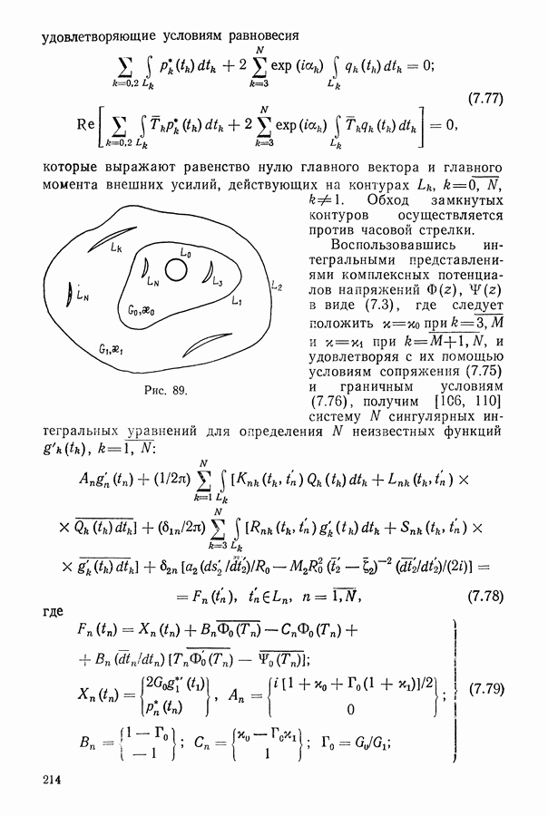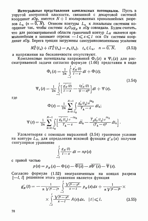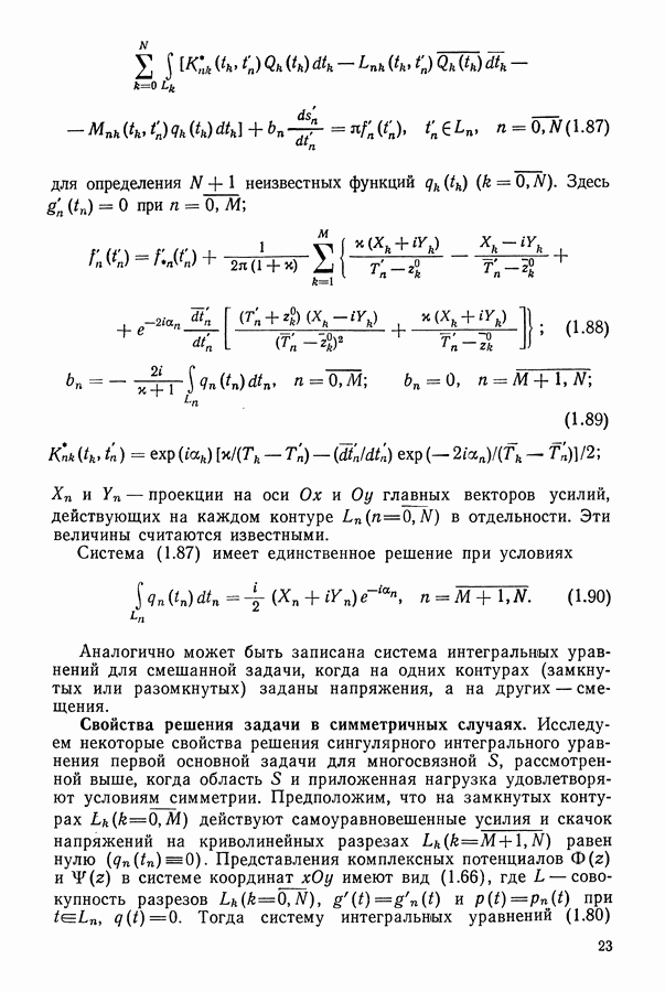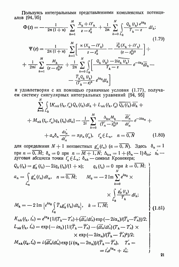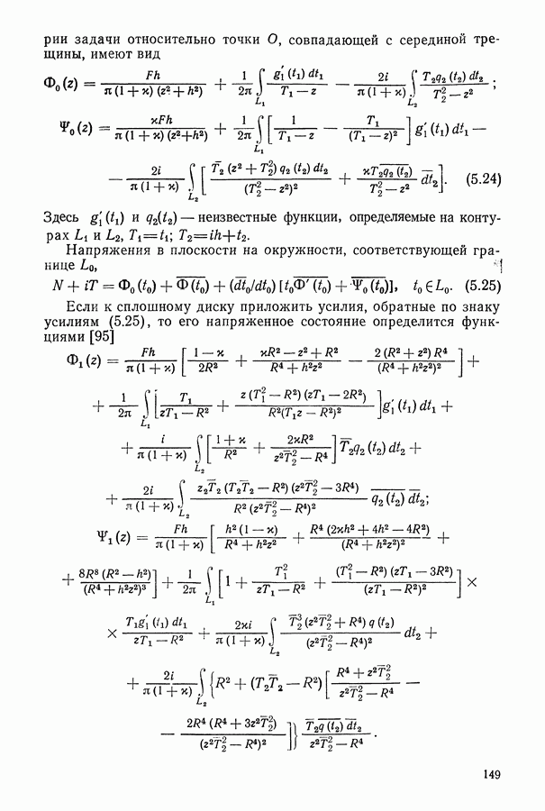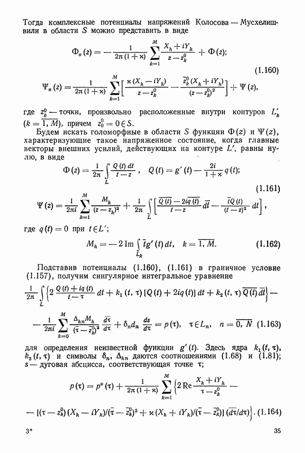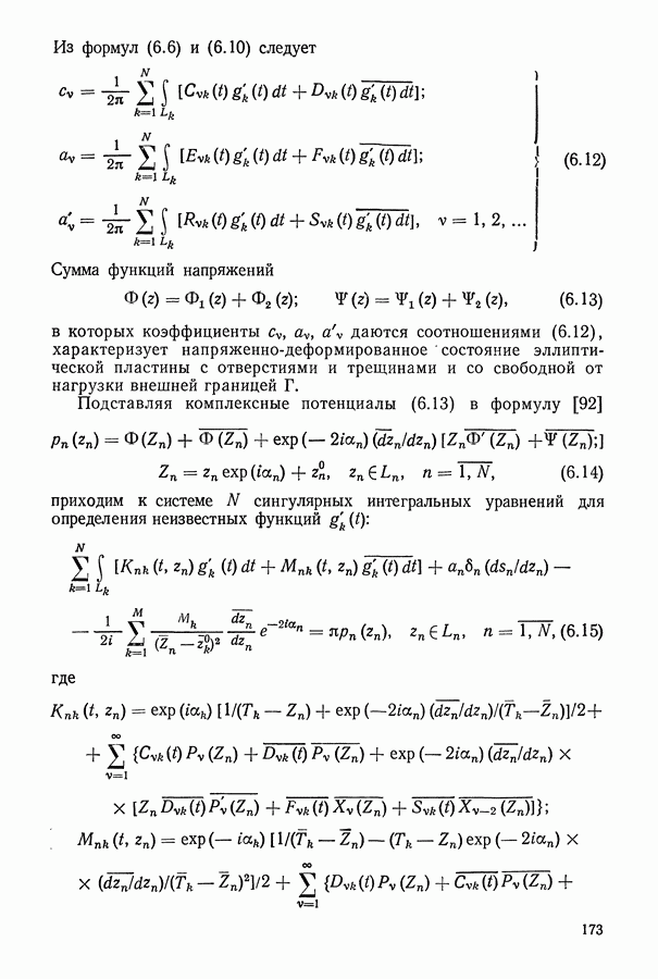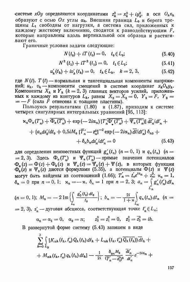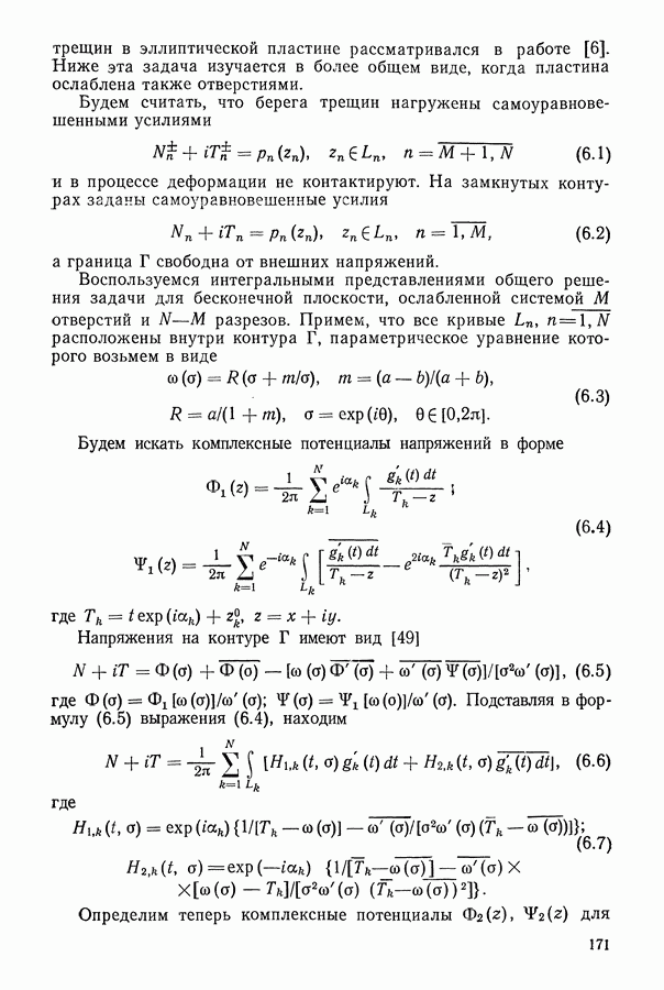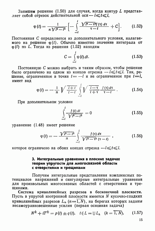 Потенциалы напряжений (5.58), как и (5.26), построены таким образом, что они не содержат контура интегрирования, соответствующего внешней границе диска. Это обстоятельство позволяет понизить на единицу порядок системы сингулярных интегральных уравнений для диска с отверстиями и трещинами (1.80). При этом граничное условие на внешней границе диска удовлетворяется тождественно. Удовлетворив с помощью комплексных потенциалов (5.58) граничные условия (5.56) и (5.57), получим систему трех сингулярных уравнений: