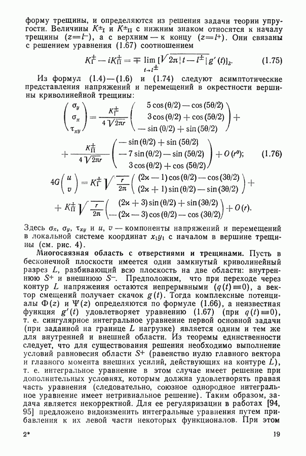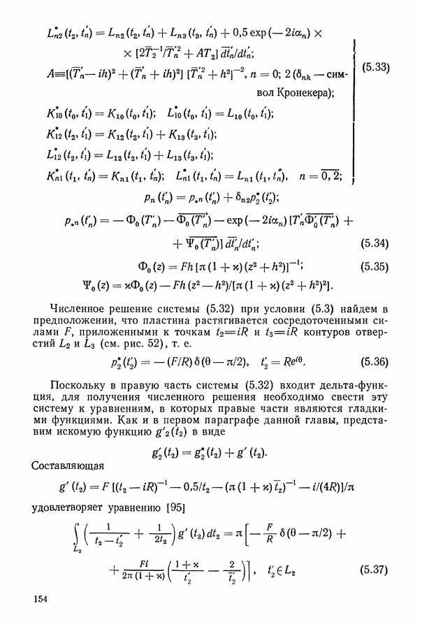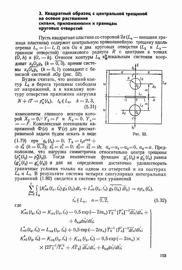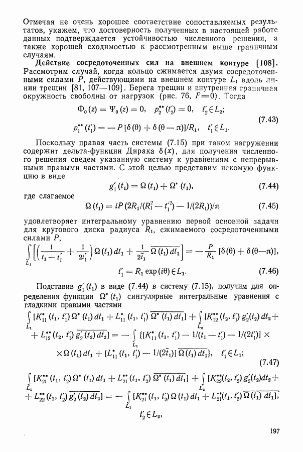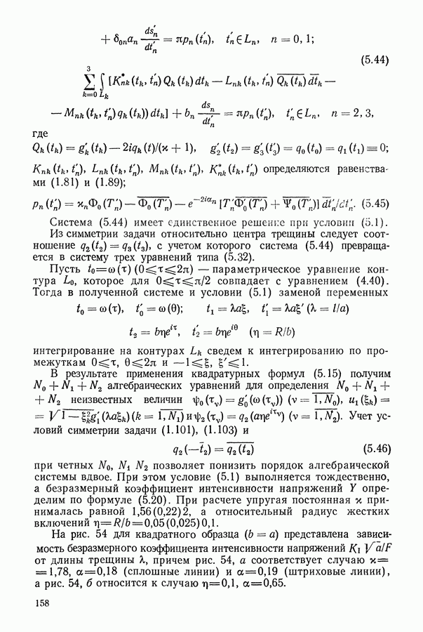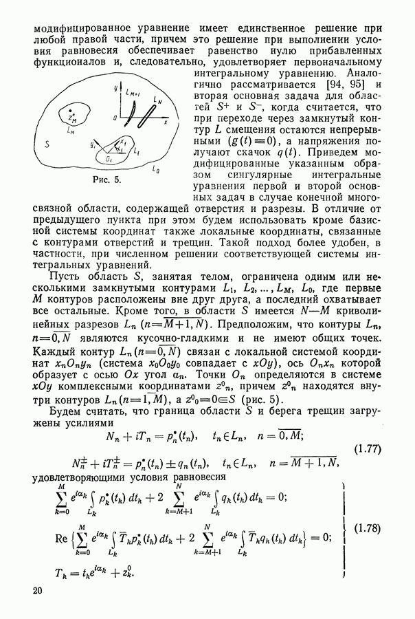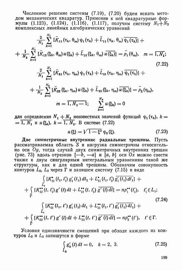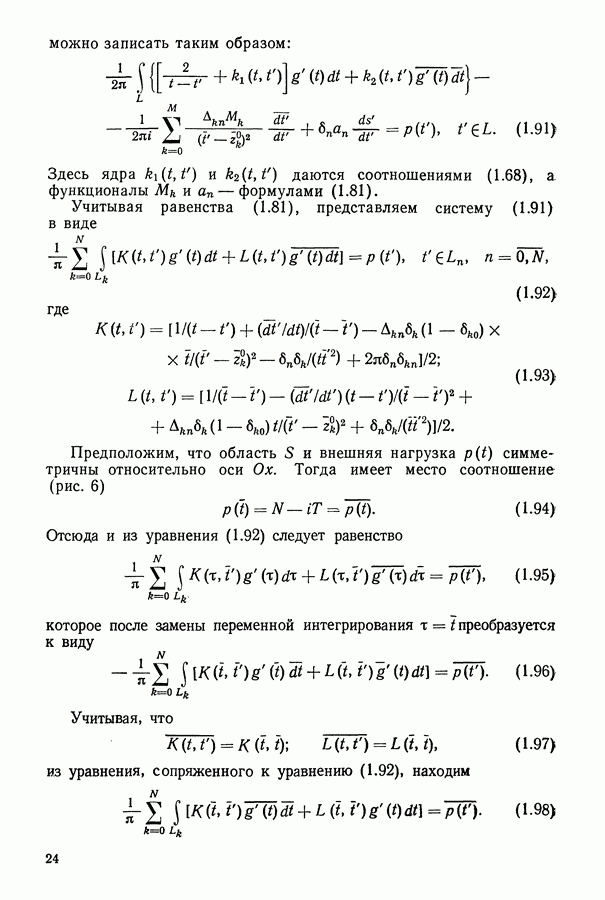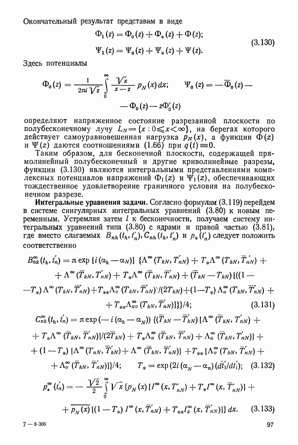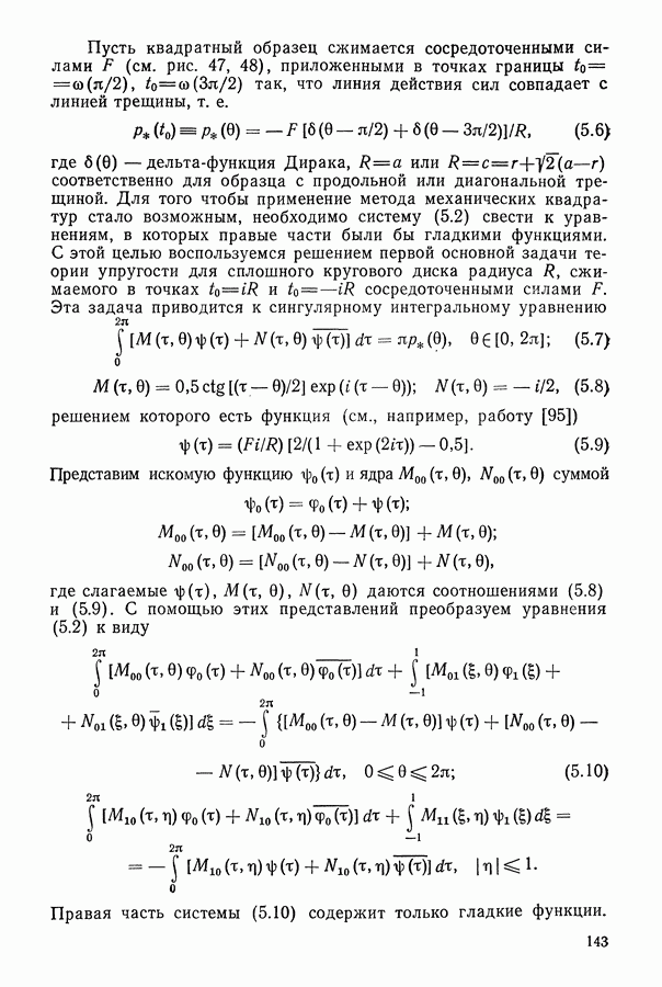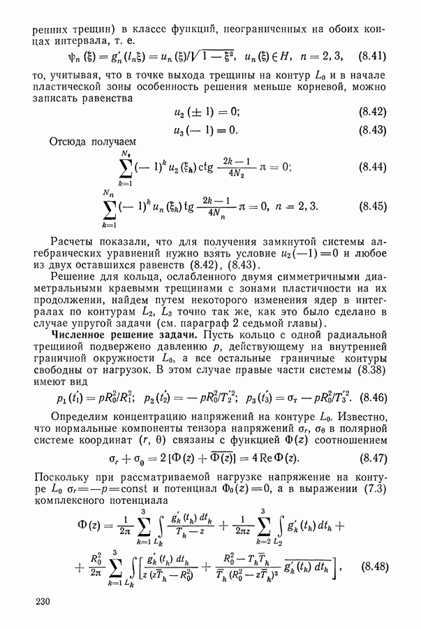 Потенциалы напряжений (5.58), как и (5.26), построены таким образом, что они не содержат контура интегрирования, соответствующего внешней границе диска. Это обстоятельство позволяет понизить на единицу порядок системы сингулярных интегральных уравнений для диска с отверстиями и трещинами (1.80). При этом граничное условие на внешней границе диска удовлетворяется тождественно. Удовлетворив с помощью комплексных потенциалов (5.58) граничные условия (5.56) и (5.57), получим систему трех сингулярных уравнений: