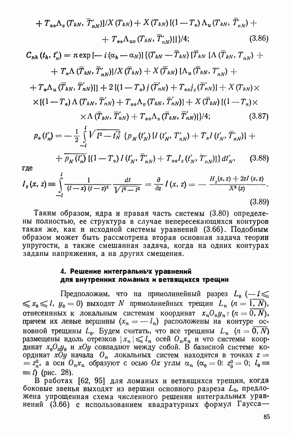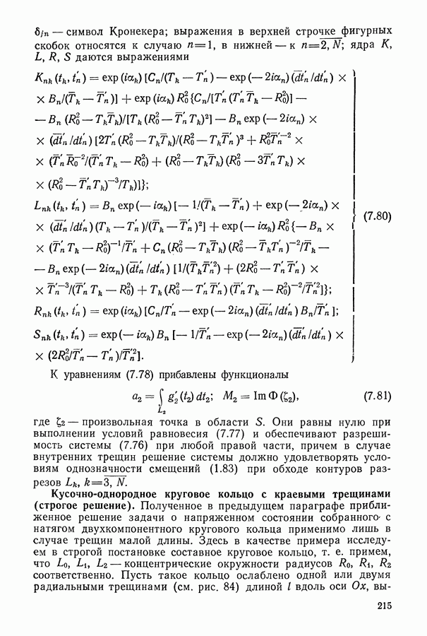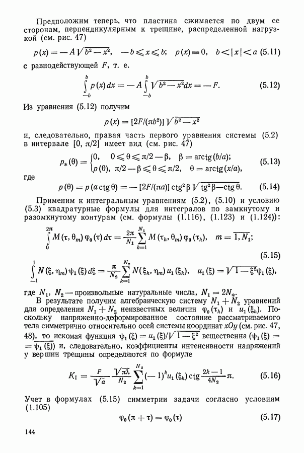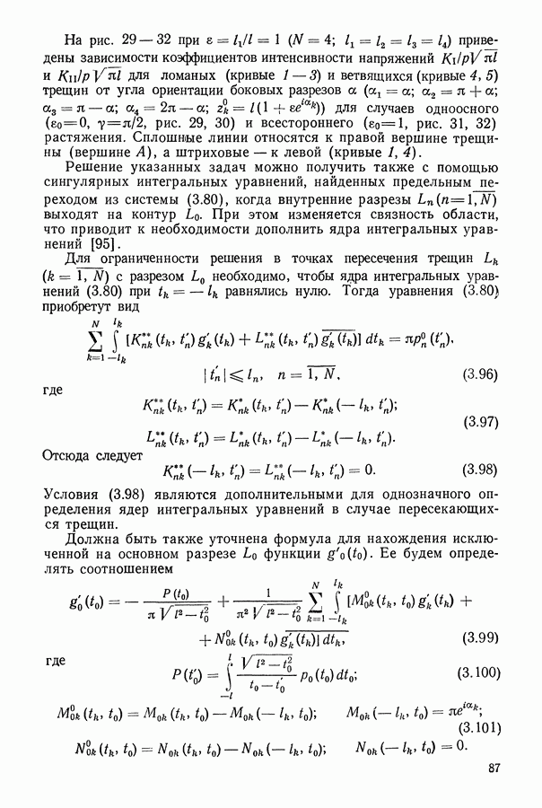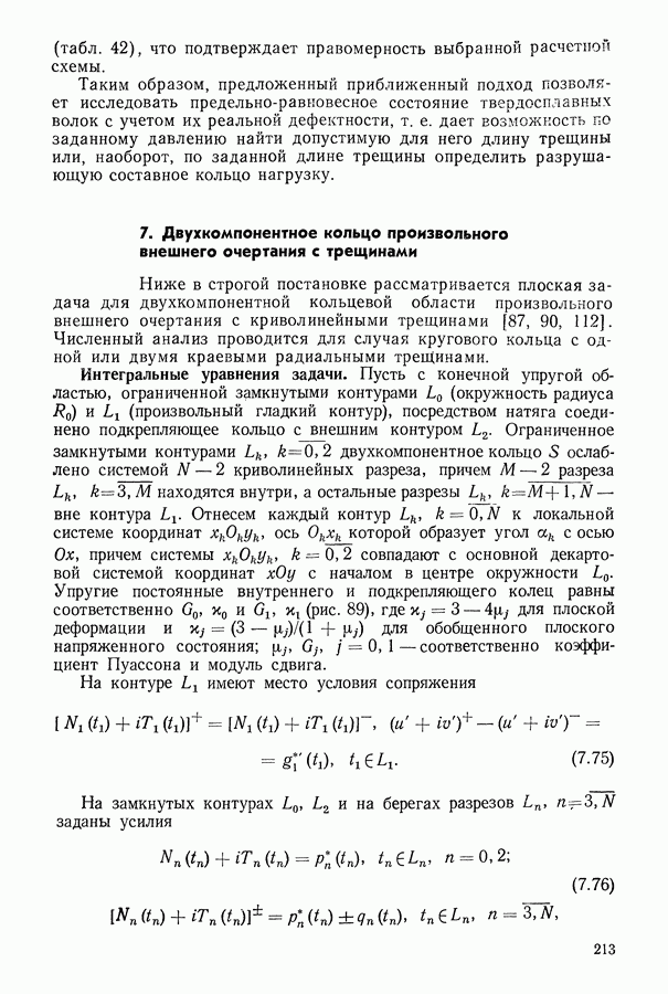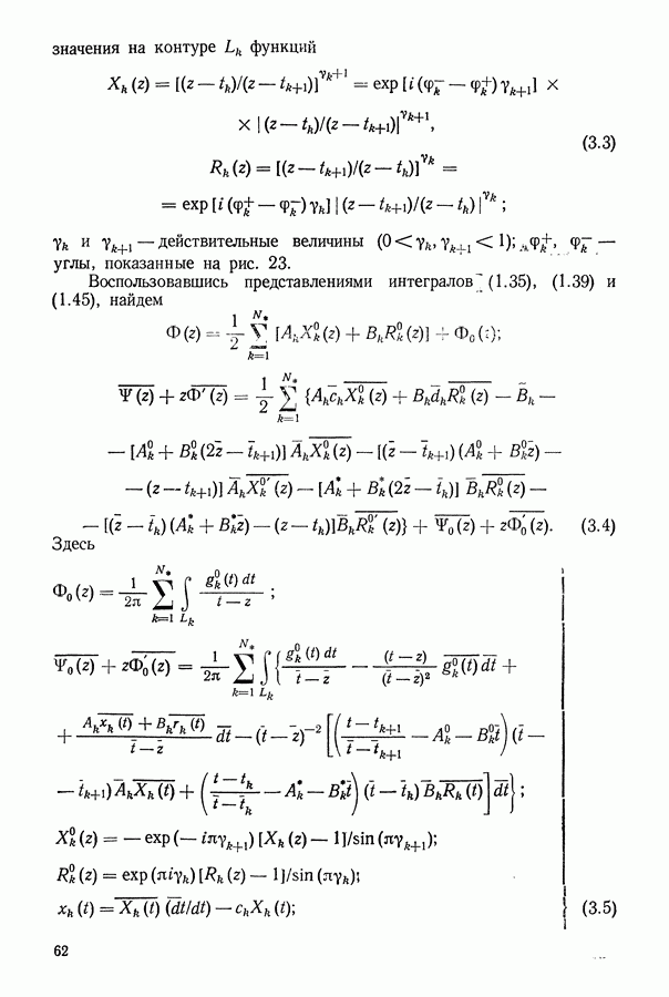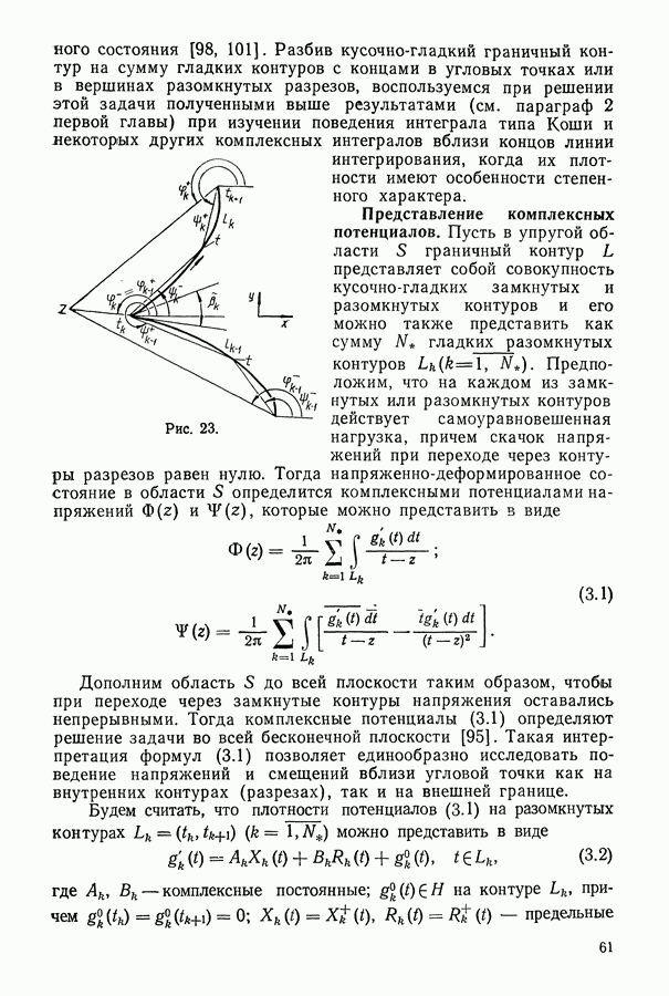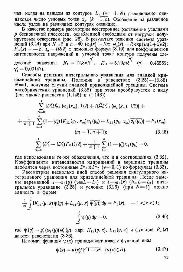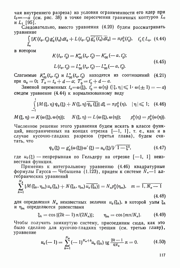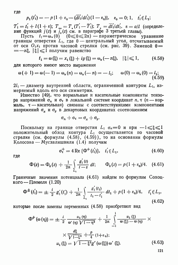 Потенциалы напряжений (5.58), как и (5.26), построены таким образом, что они не содержат контура интегрирования, соответствующего внешней границе диска. Это обстоятельство позволяет понизить на единицу порядок системы сингулярных интегральных уравнений для диска с отверстиями и трещинами (1.80). При этом граничное условие на внешней границе диска удовлетворяется тождественно. Удовлетворив с помощью комплексных потенциалов (5.58) граничные условия (5.56) и (5.57), получим систему трех сингулярных уравнений: