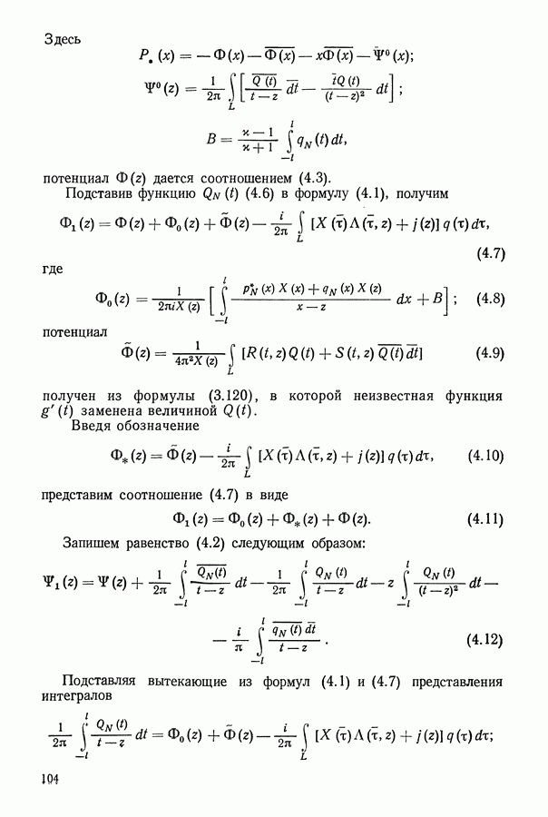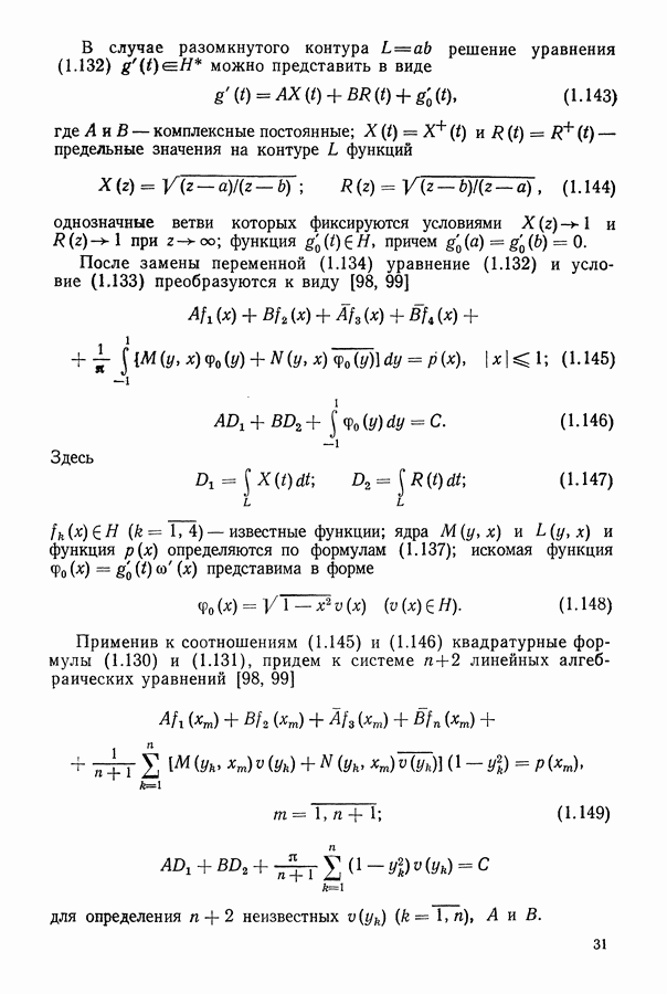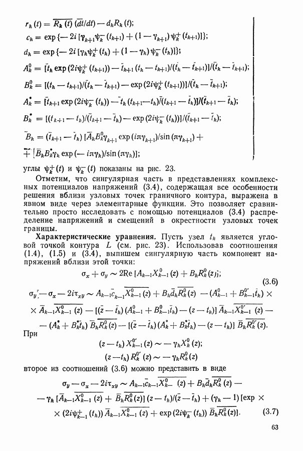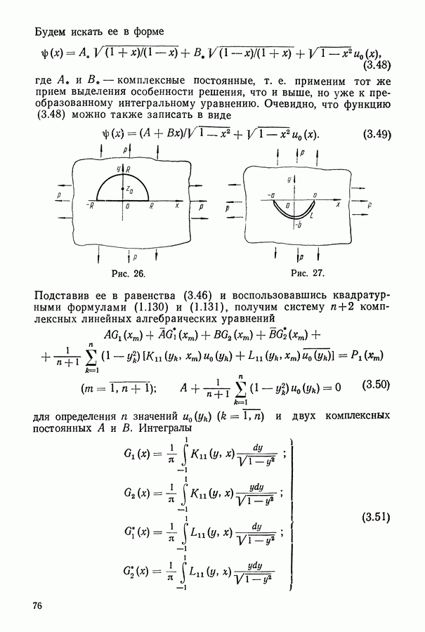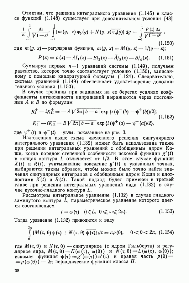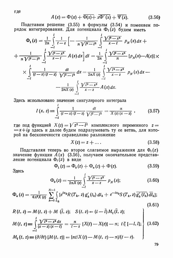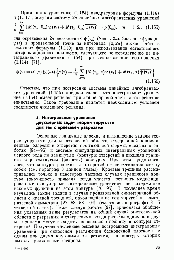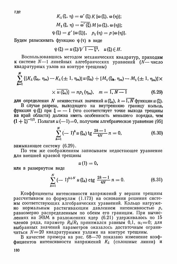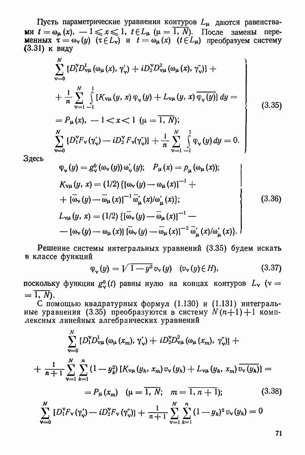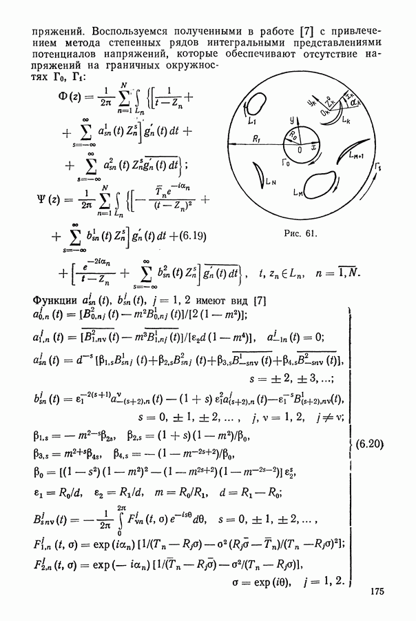 Потенциалы напряжений (5.58), как и (5.26), построены таким образом, что они не содержат контура интегрирования, соответствующего внешней границе диска. Это обстоятельство позволяет понизить на единицу порядок системы сингулярных интегральных уравнений для диска с отверстиями и трещинами (1.80). При этом граничное условие на внешней границе диска удовлетворяется тождественно. Удовлетворив с помощью комплексных потенциалов (5.58) граничные условия (5.56) и (5.57), получим систему трех сингулярных уравнений: