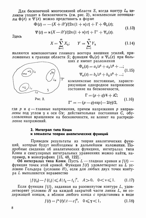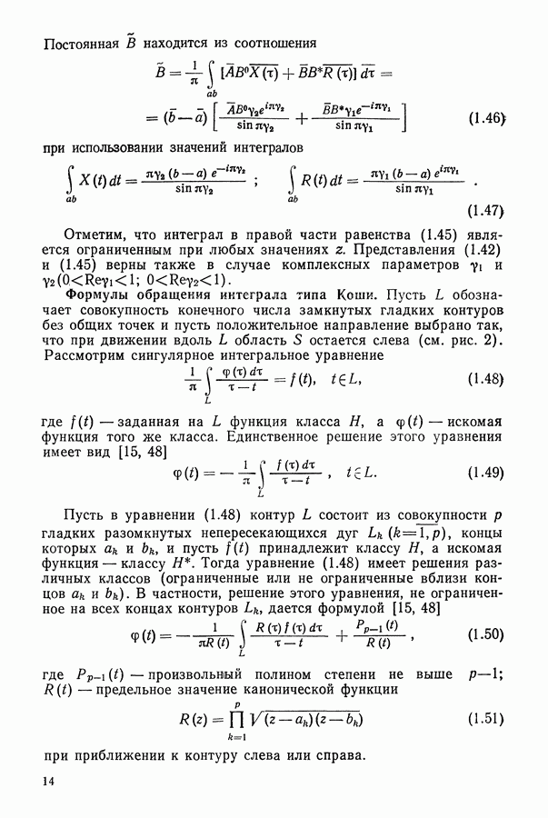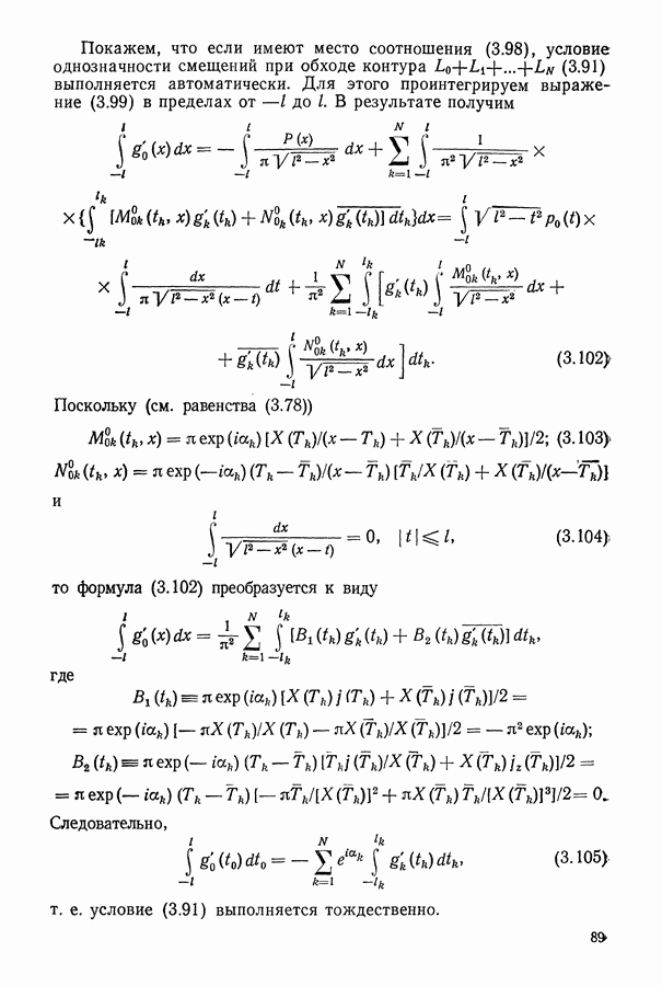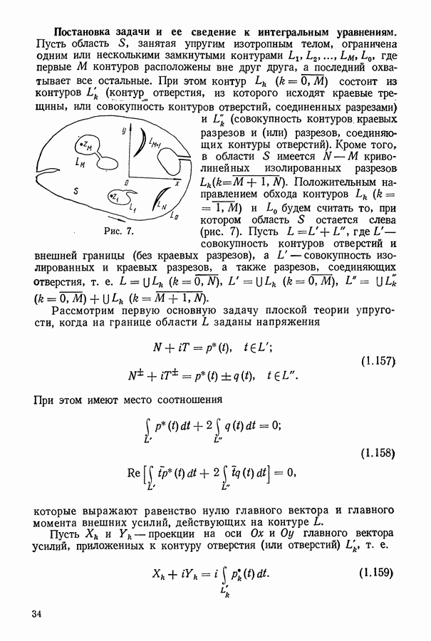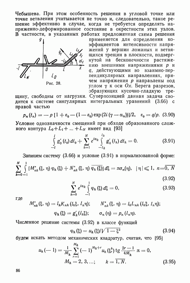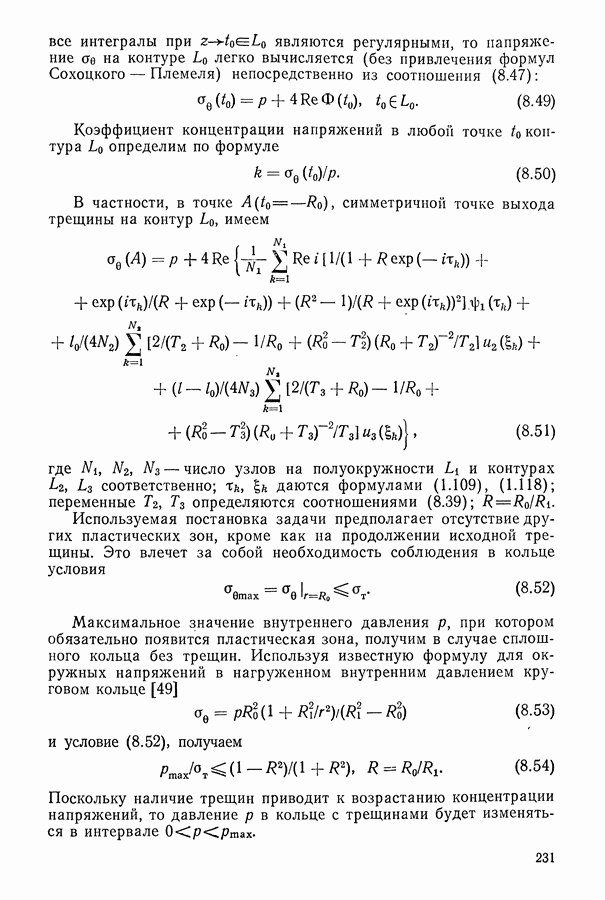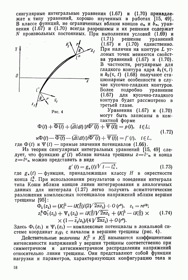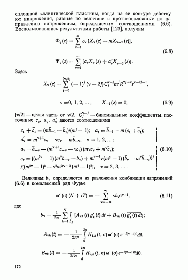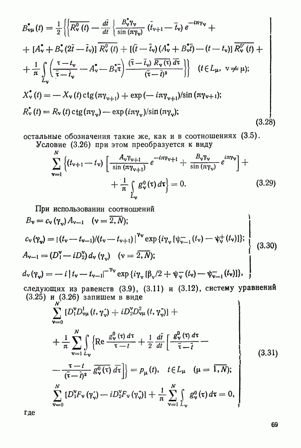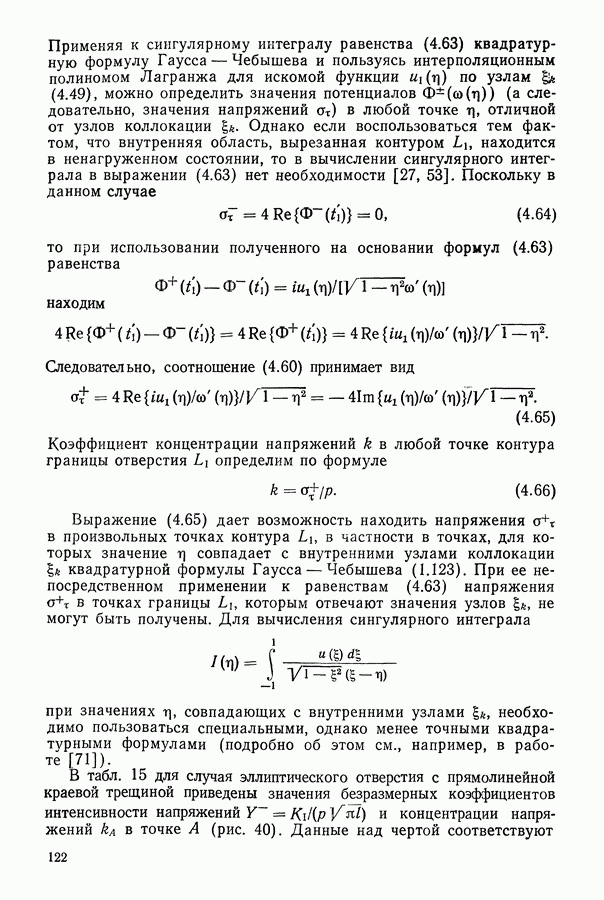 Потенциалы напряжений (5.58), как и (5.26), построены таким образом, что они не содержат контура интегрирования, соответствующего внешней границе диска. Это обстоятельство позволяет понизить на единицу порядок системы сингулярных интегральных уравнений для диска с отверстиями и трещинами (1.80). При этом граничное условие на внешней границе диска удовлетворяется тождественно. Удовлетворив с помощью комплексных потенциалов (5.58) граничные условия (5.56) и (5.57), получим систему трех сингулярных уравнений: