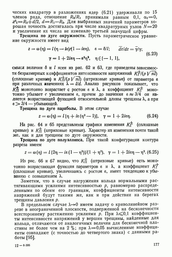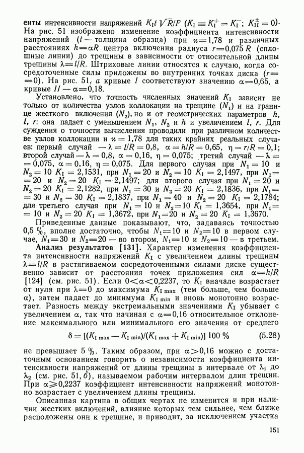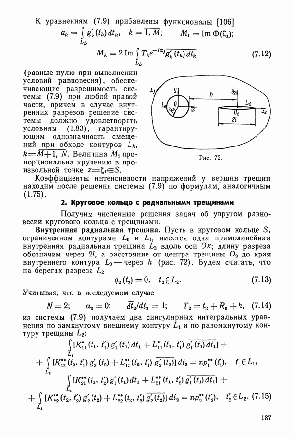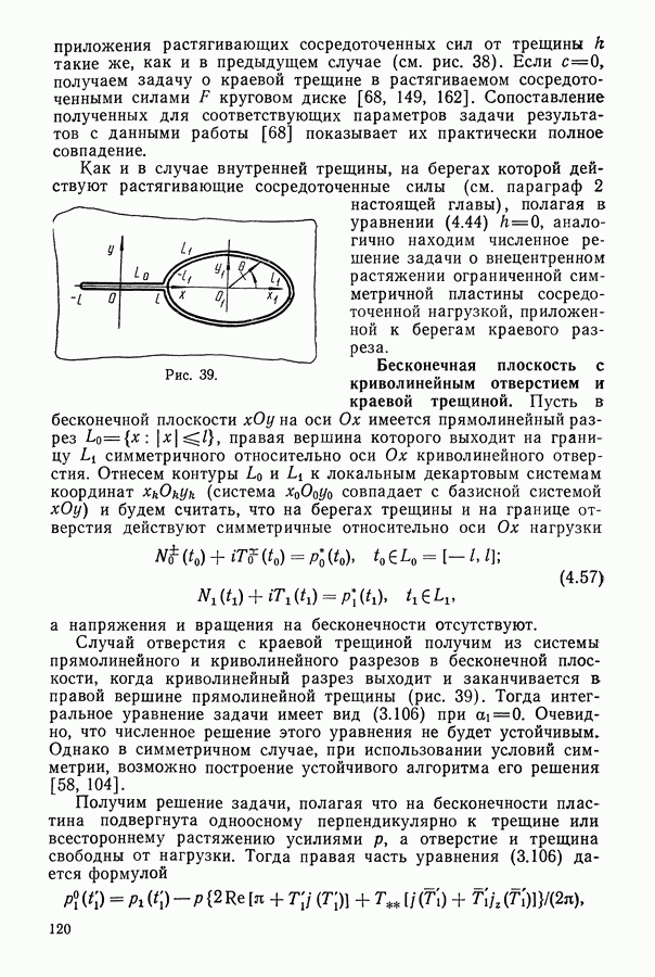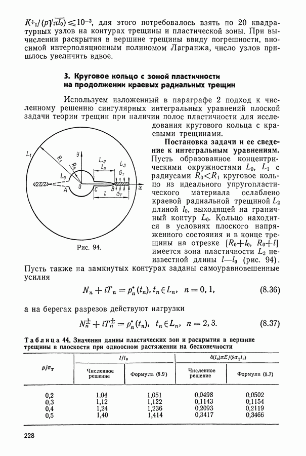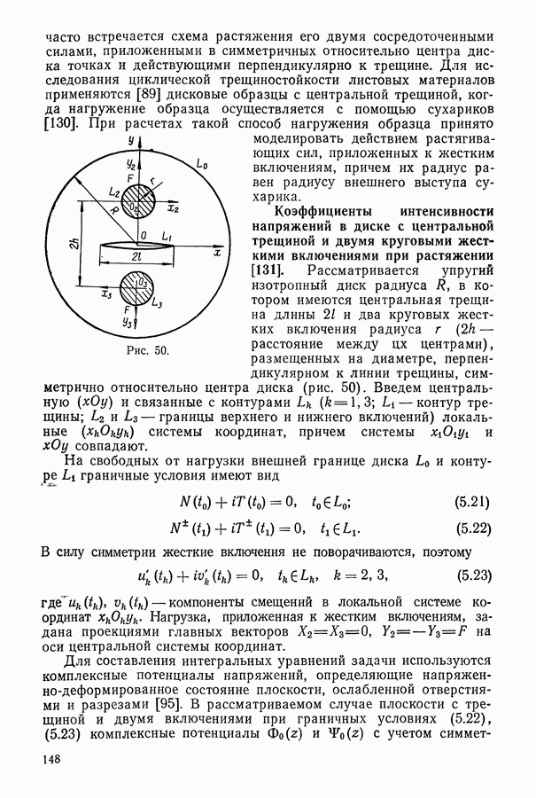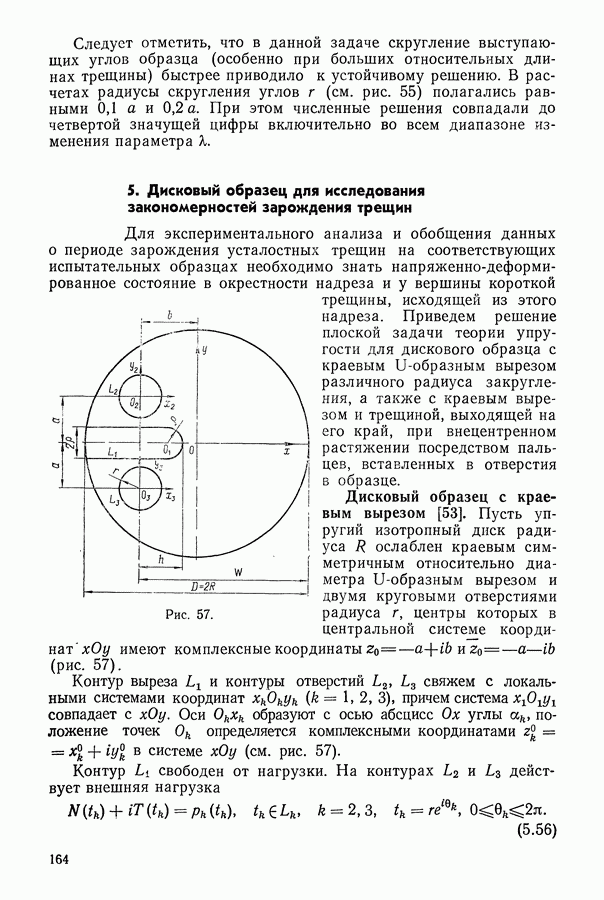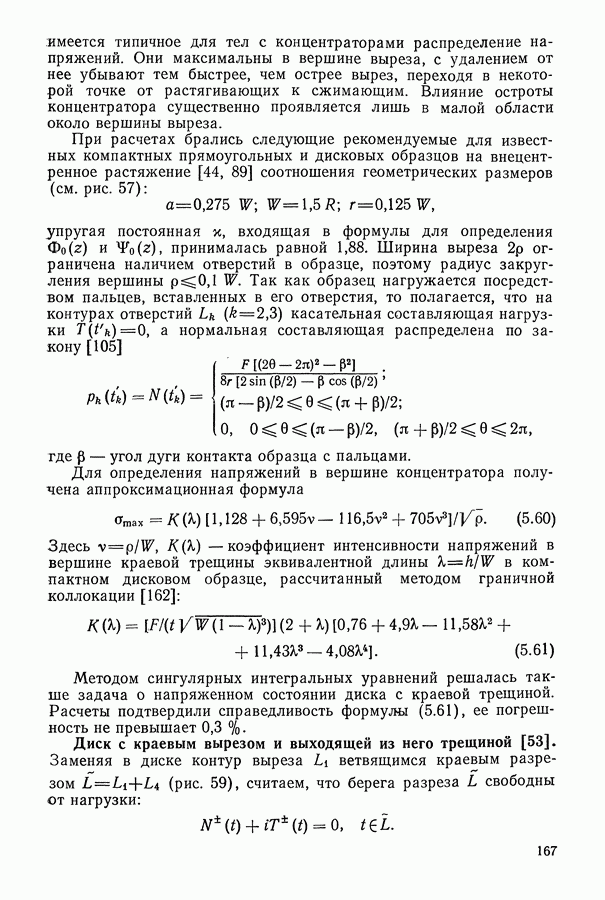Методом сингулярных интегральных уравнений решалась так же задача о напряженном состоянии диска с краевой трещиной. Расчеты подтвердили справедливость формул (5.61), ее погрешность не превышает Диск с краевым вырезом и выходящей из него трещиной [53]. Заменяя в диске контур выреза