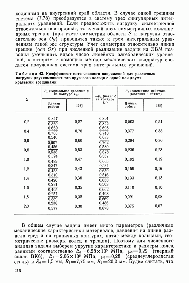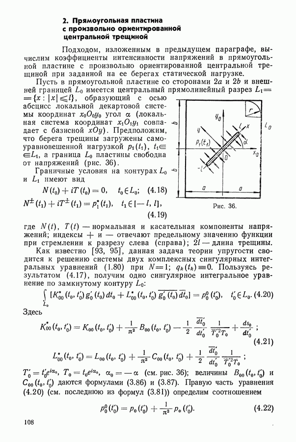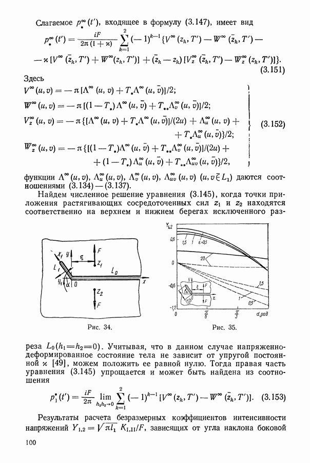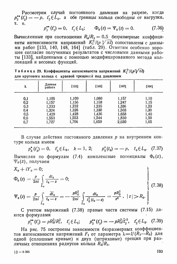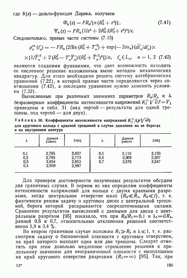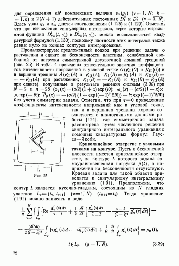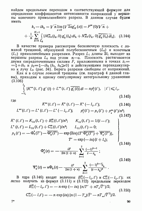 Методом сингулярных интегральных уравнений решалась так же задача о напряженном состоянии диска с краевой трещиной. Расчеты подтвердили справедливость формул (5.61), ее погрешность не превышает Диск с краевым вырезом и выходящей из него трещиной [53]. Заменяя в диске контур выреза