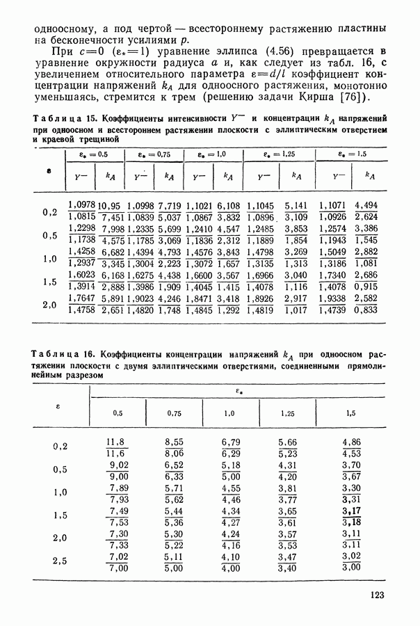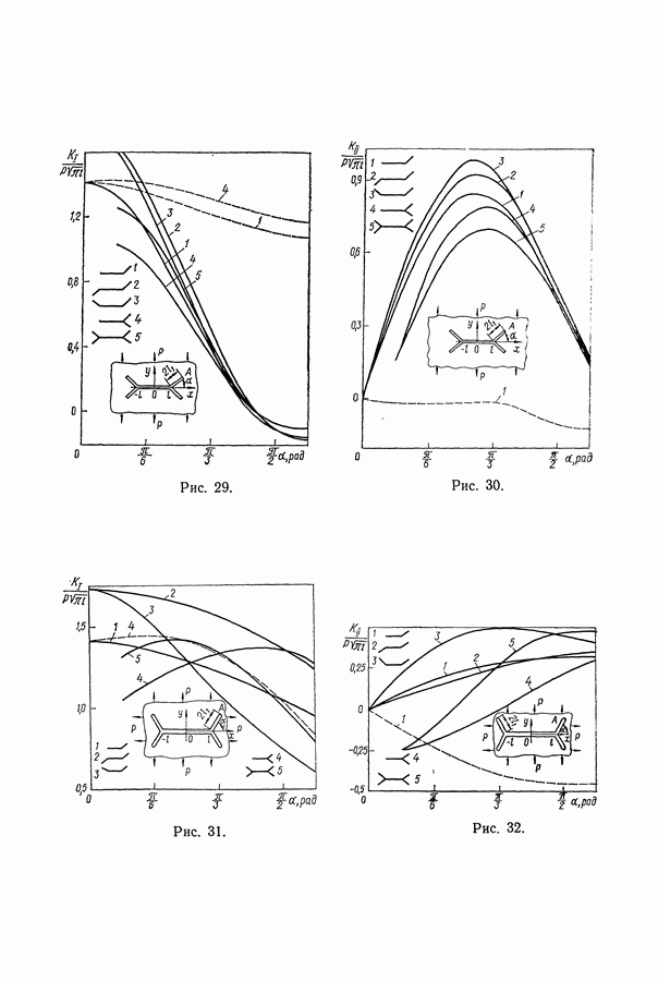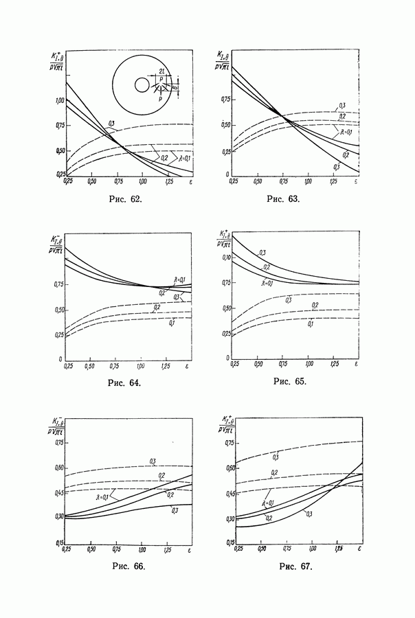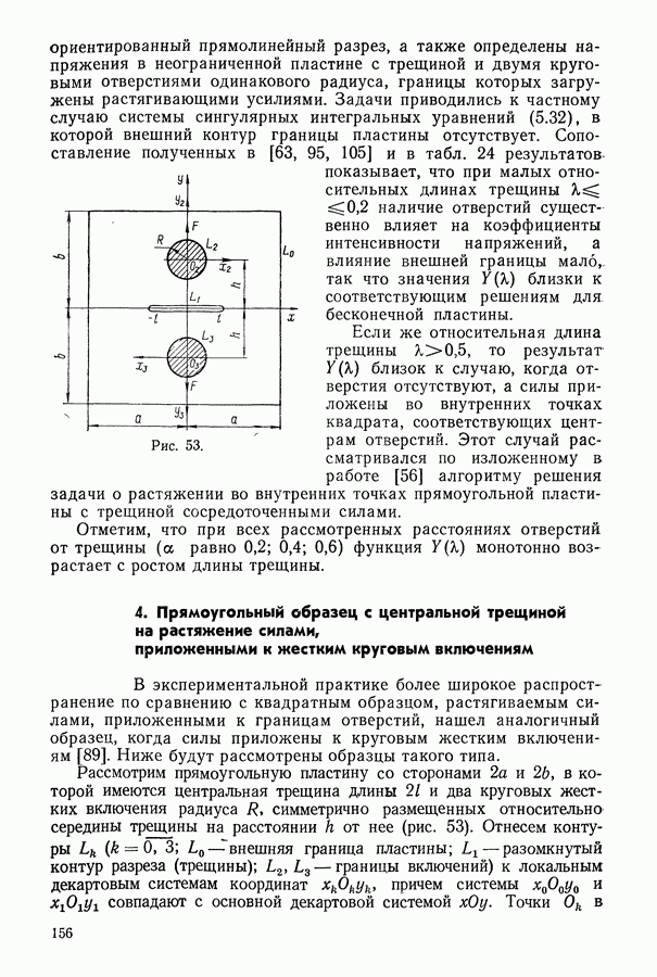 К левой части второго и третьего уравнений (5.59) прибавлены равные кулю слагаемые, обеспечивающие существование решения системы при любой правой части [95]. На рис. 58 показано распределение напряжений имеется типичное для тел с концентраторами распределение напряжений. Они максимальны в вершине выреза, с удалением от нее убывают тем быстрее, чем острее вырез, переходя в некоторой точке от растягивающих к сжимающим. Влияние остроты концентратора существенно проявляется лишь в малой области около вершины выреза. При расчетах брались следующие рекомендуемые для известных компактных прямоугольных и дисковых образцов на внецентренное растяжение [44, 89] соотношения геометрических размеров (см. рис. 57):