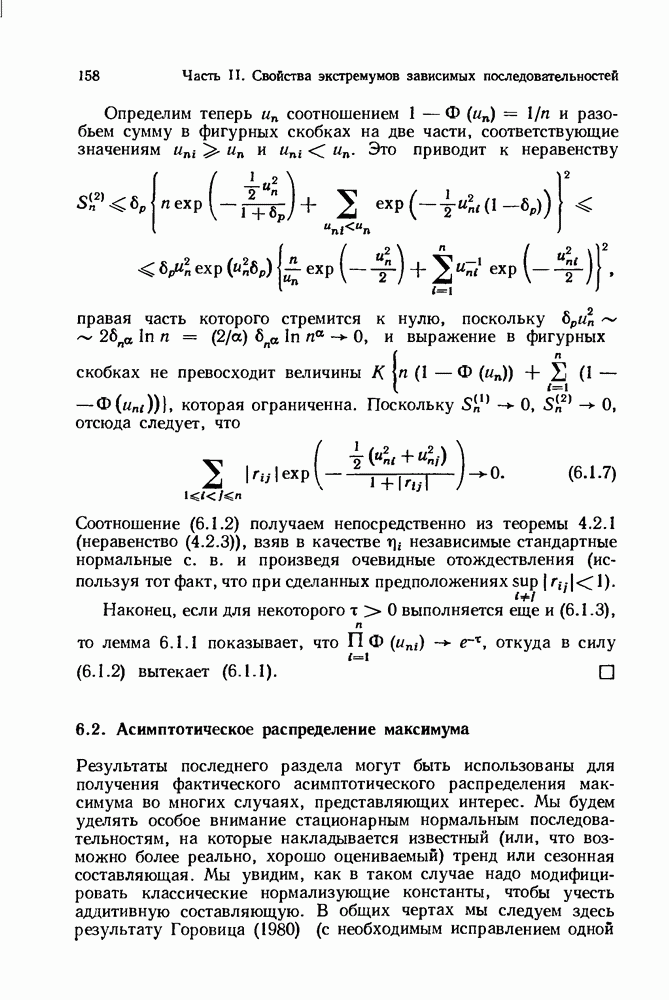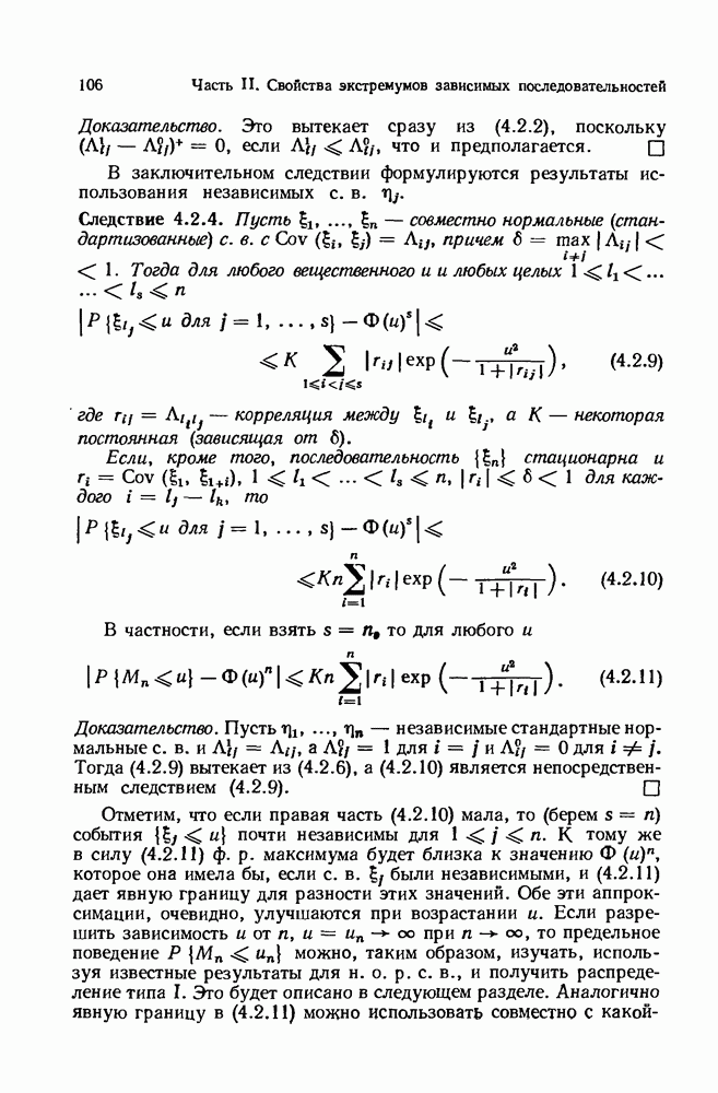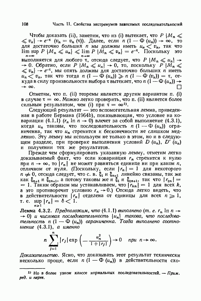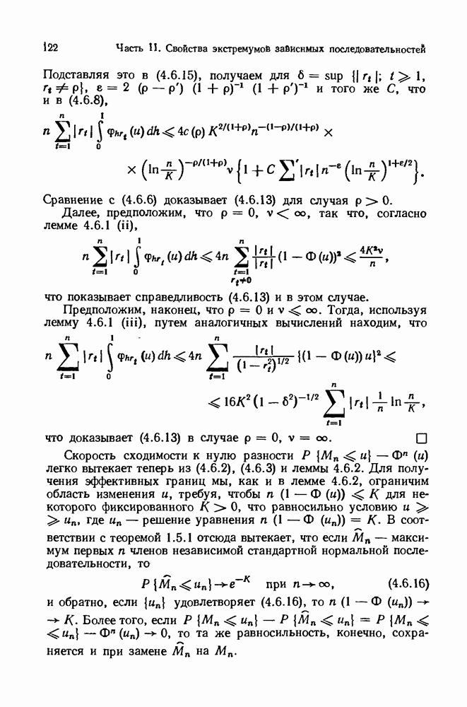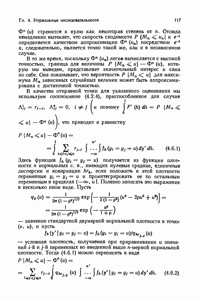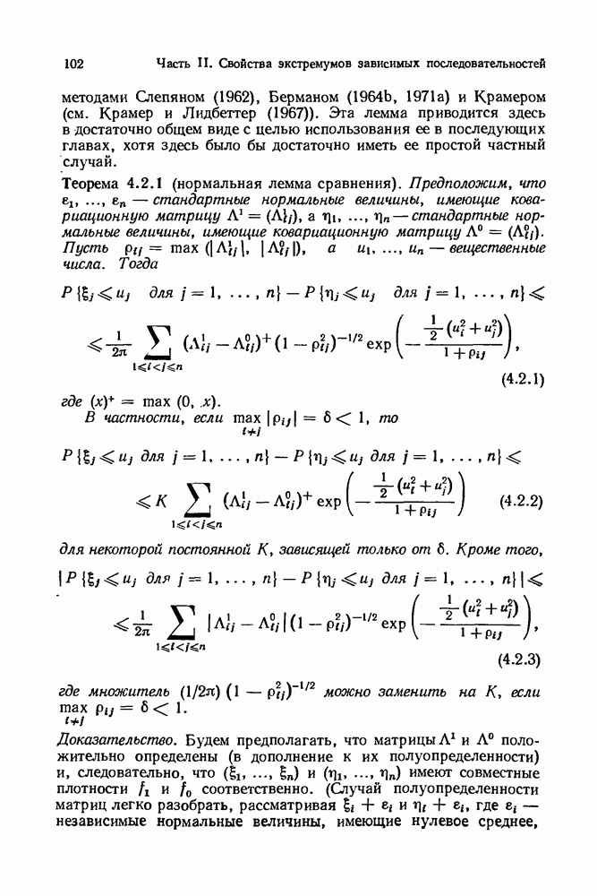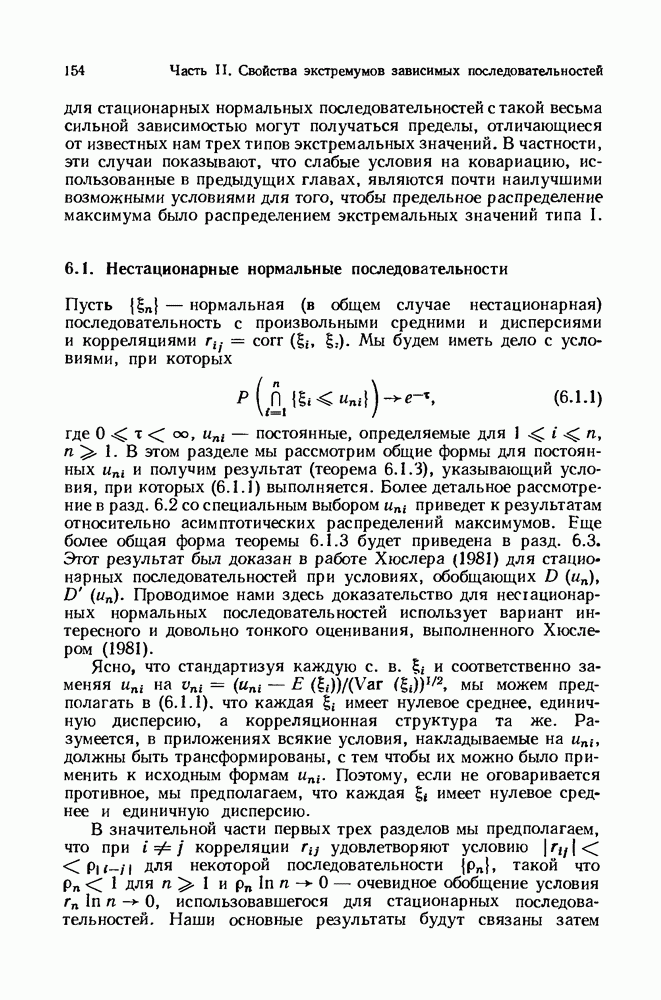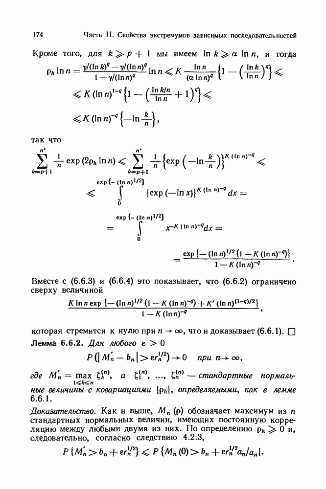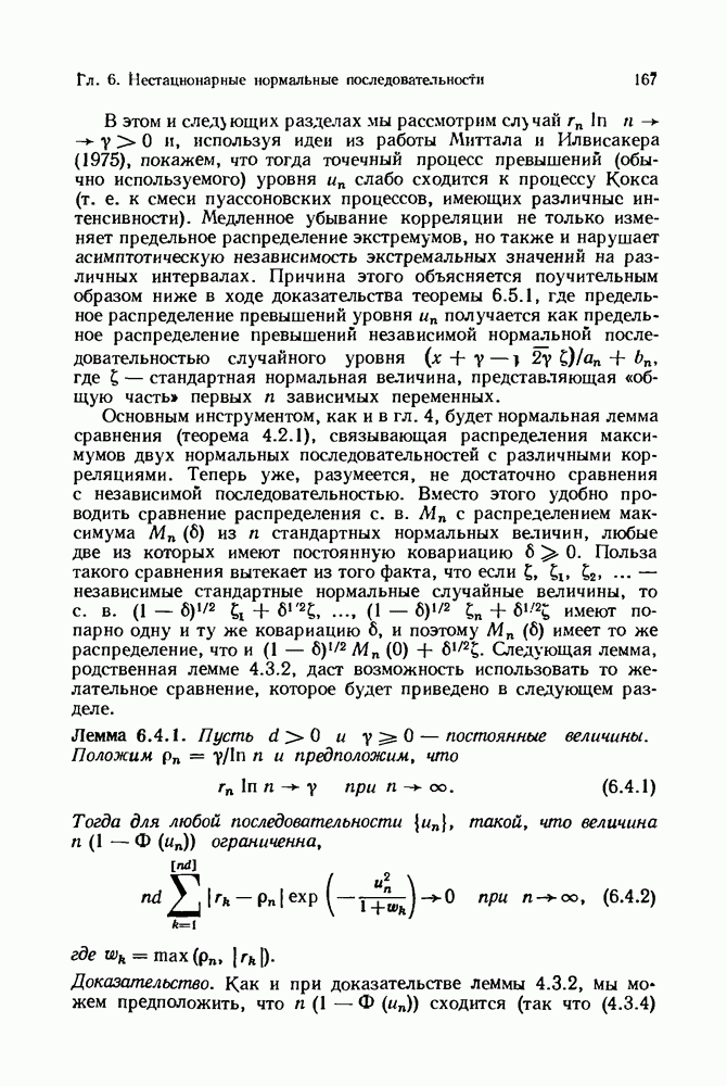 6.4. Стационарные нормальные последовательности с сильной зависимостьюВ этом и остальных разделах мы обращаемся ко второй теме настоящей главы, а именно хотим посмотреть, как влияет на экстремумы более жесткая структура зависимости стационарной нормальной последовательности В этом и следующих разделах мы рассмотрим сличай Основным инструментом, как и в гл. 4, будет нормальная лемма сравнения (теорема 4.2.1), связывающая распределения максимумов двух нормальных последовательностей с различными корреляциями. Теперь уже, разумеется, не достаточно сравнения с независимой последовательностью. Вместо этого удобно проводить сравнение распределения с. в. Лемма 6.4.1. Пусть