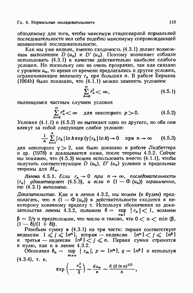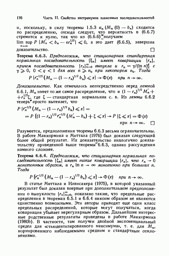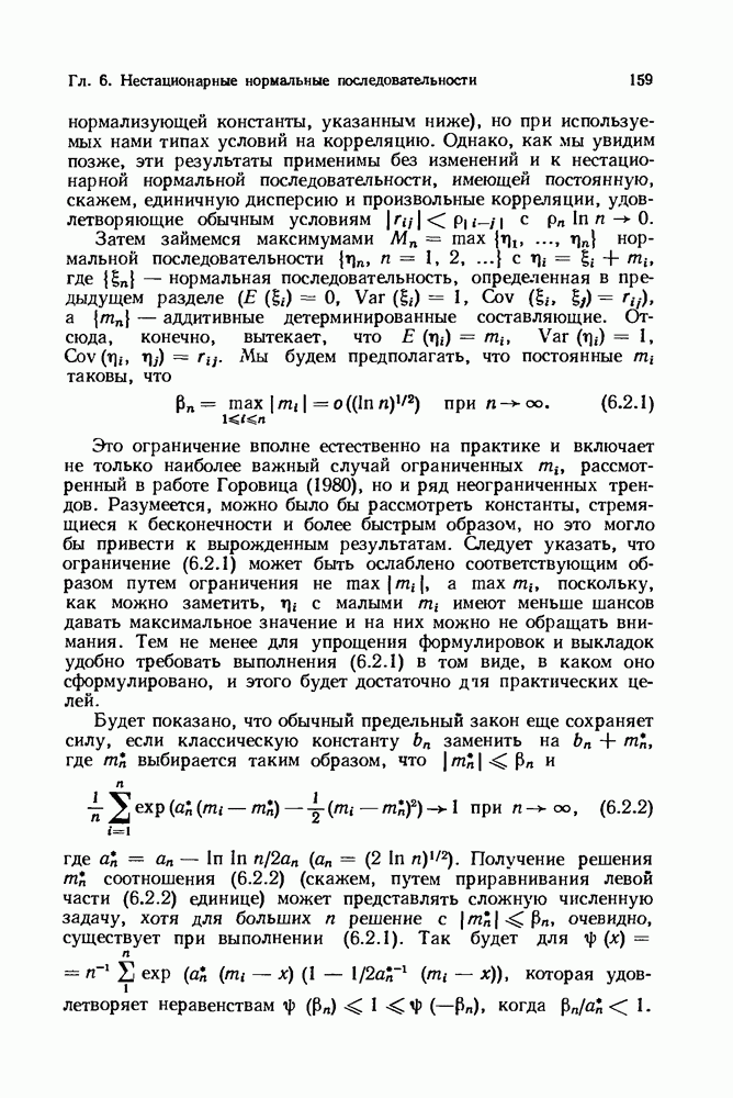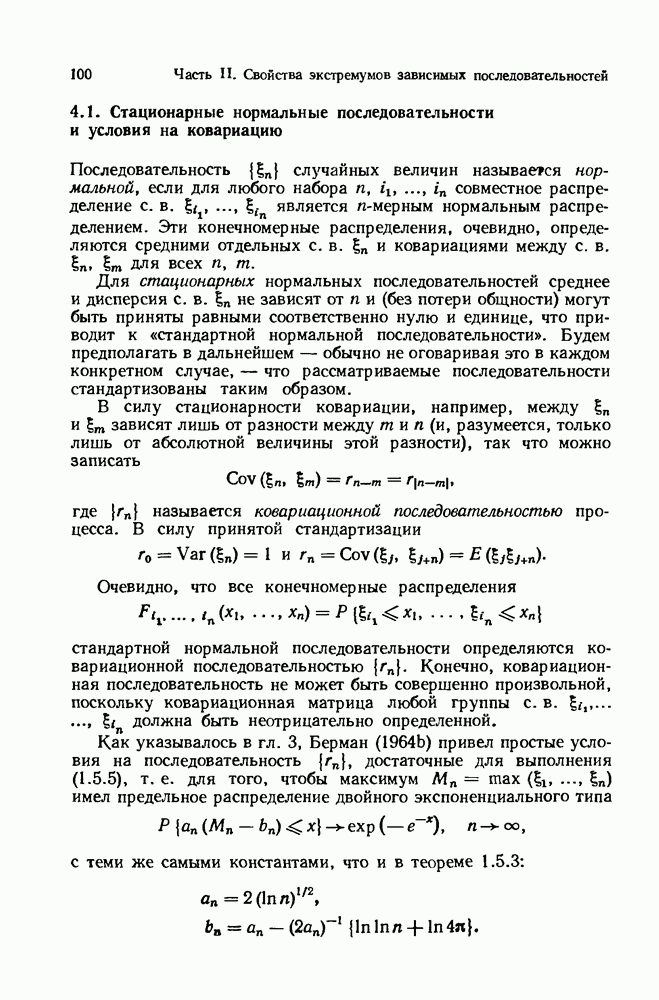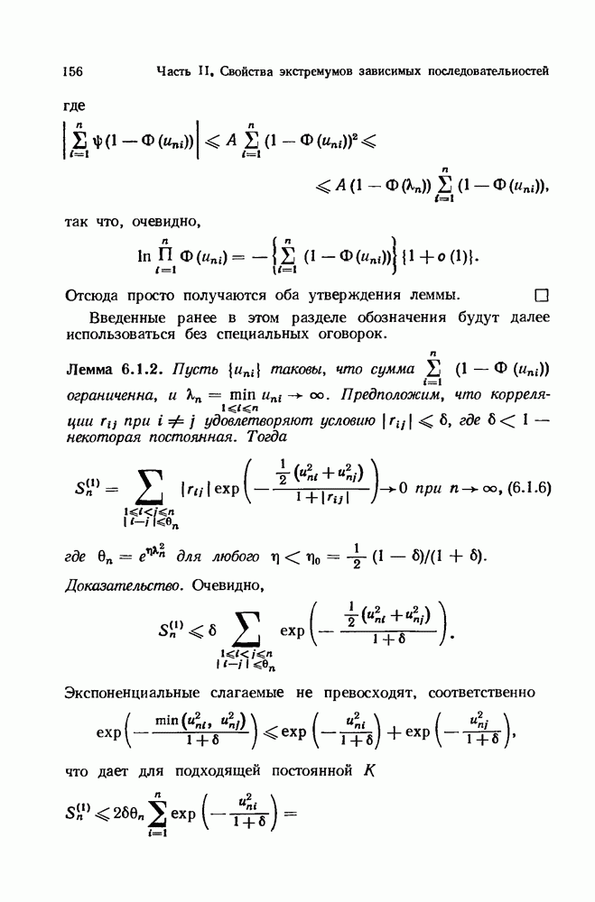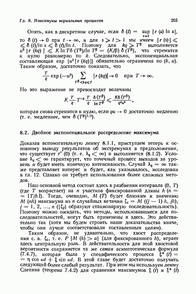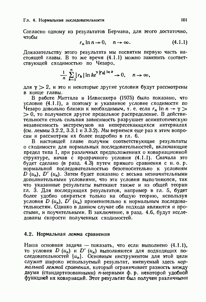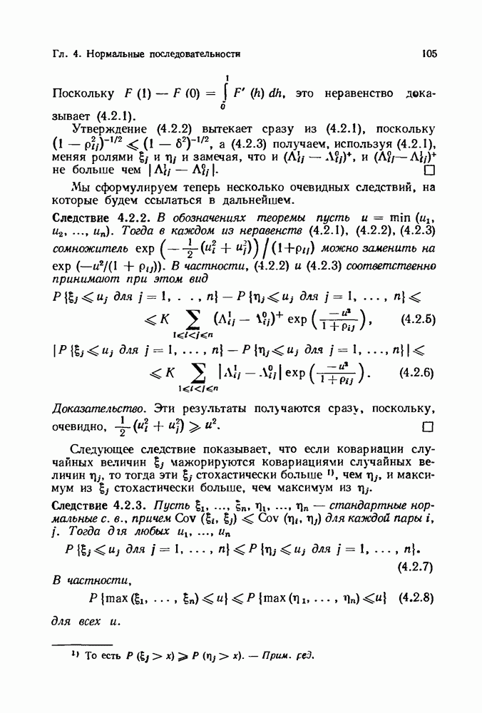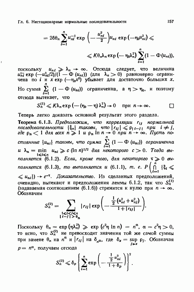 6.4. Стационарные нормальные последовательности с сильной зависимостьюВ этом и остальных разделах мы обращаемся ко второй теме настоящей главы, а именно хотим посмотреть, как влияет на экстремумы более жесткая структура зависимости стационарной нормальной последовательности В этом и следующих разделах мы рассмотрим сличай Основным инструментом, как и в гл. 4, будет нормальная лемма сравнения (теорема 4.2.1), связывающая распределения максимумов двух нормальных последовательностей с различными корреляциями. Теперь уже, разумеется, не достаточно сравнения с независимой последовательностью. Вместо этого удобно проводить сравнение распределения с. в. Лемма 6.4.1. Пусть