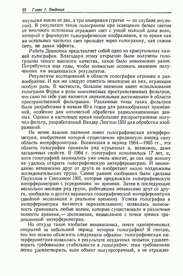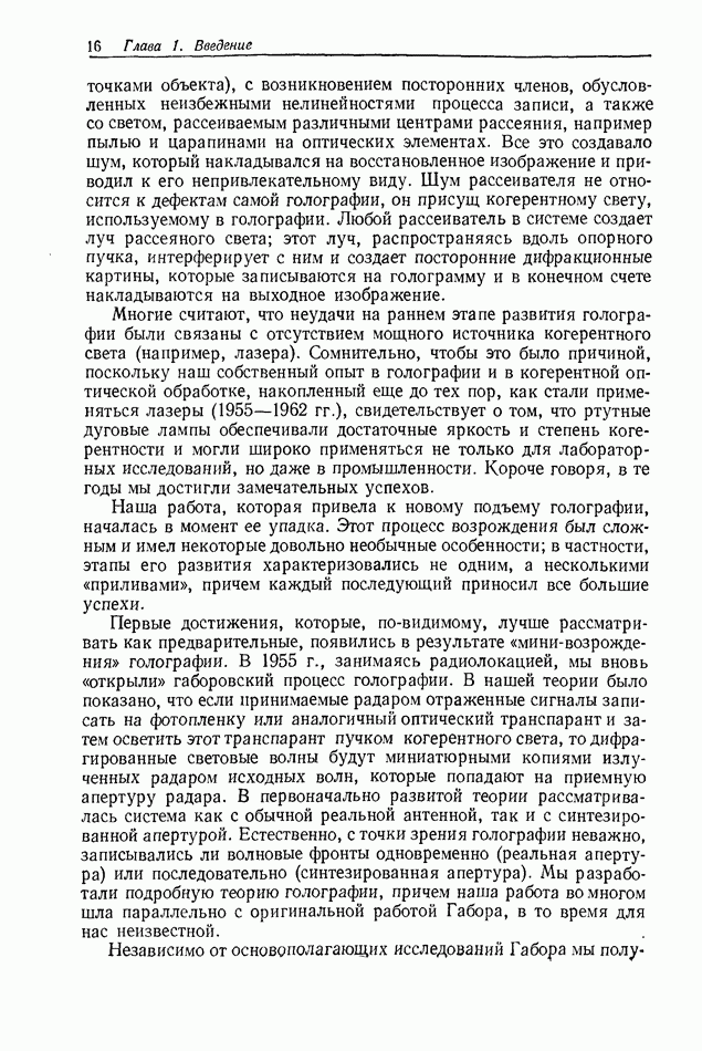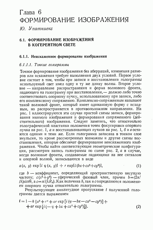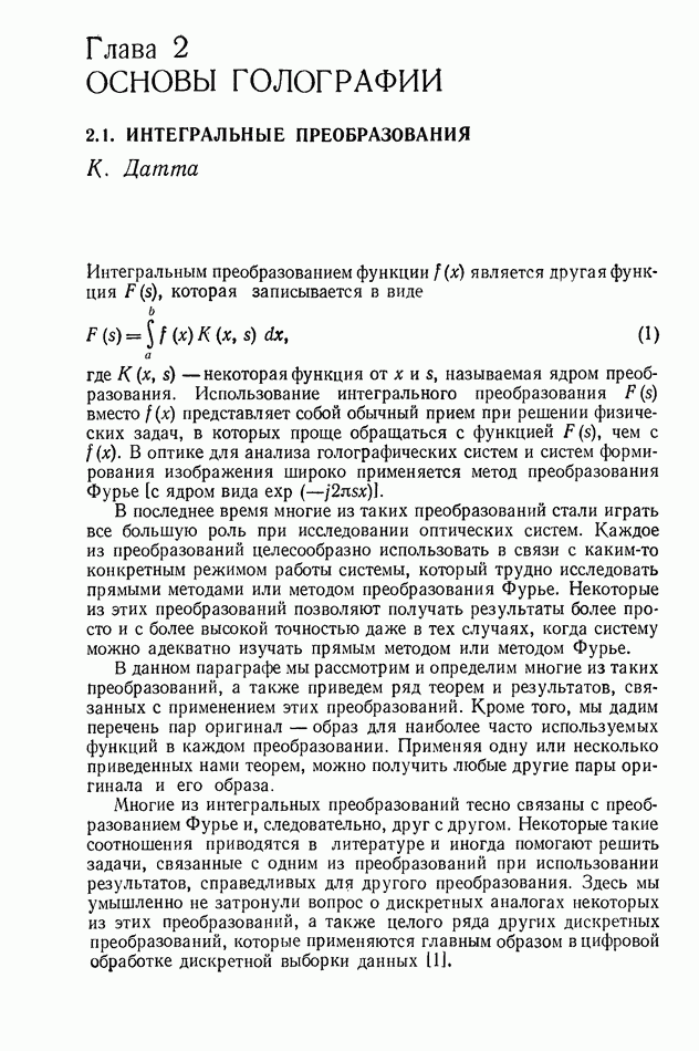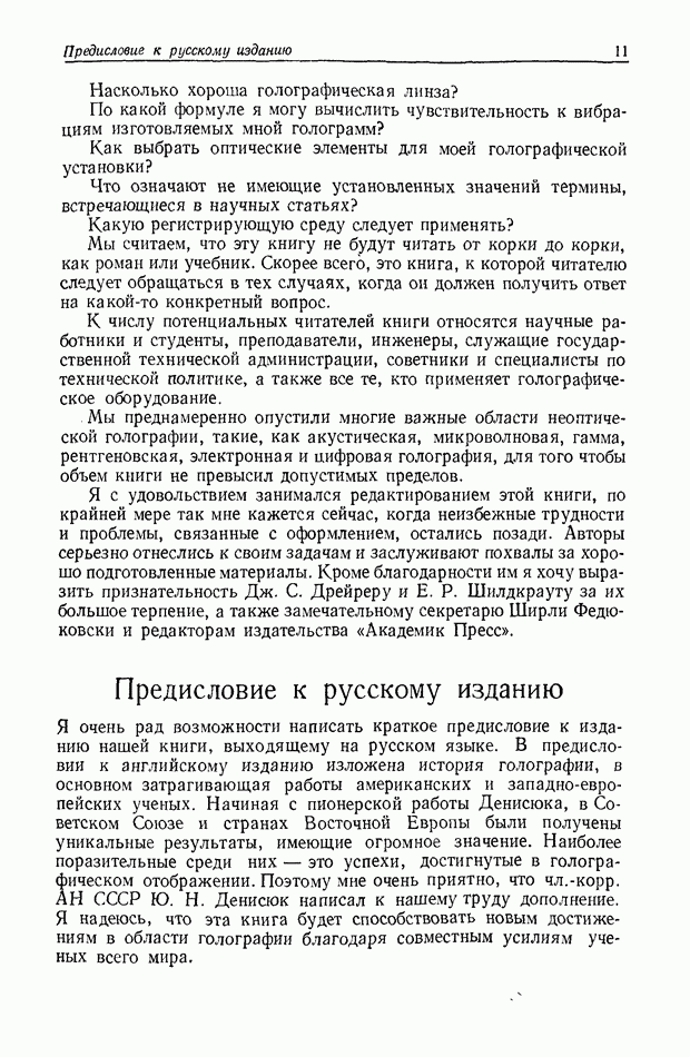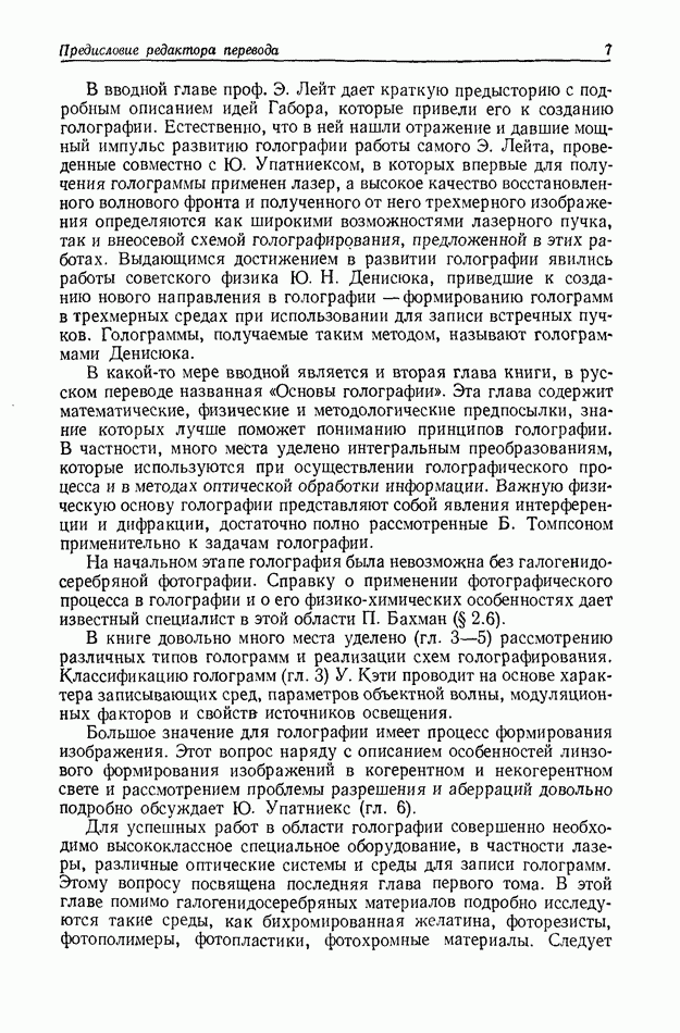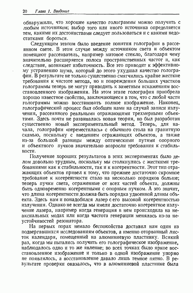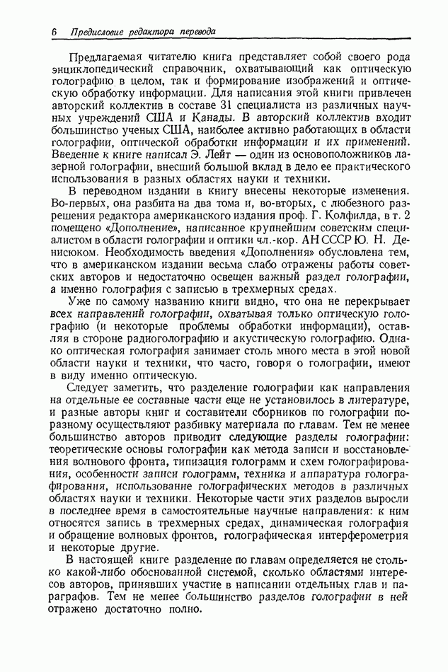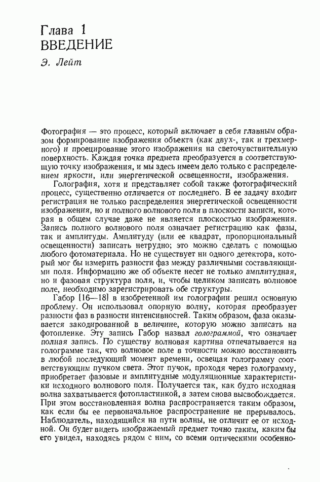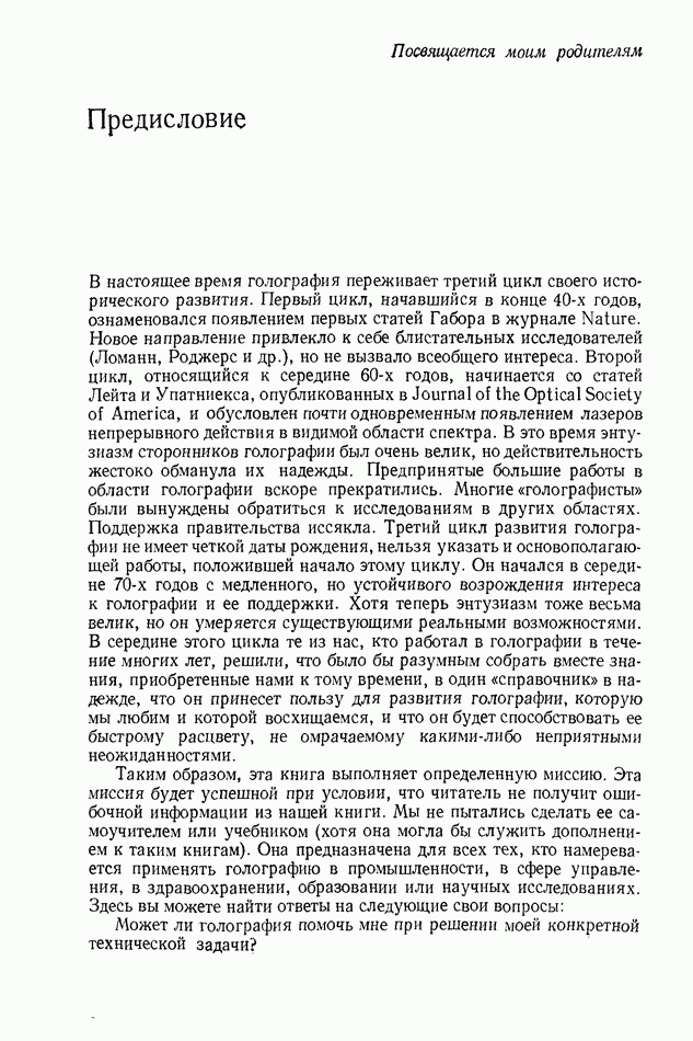 Предисловие редактора переводаВ последнее время голографические методы получения и анализа изображений находят все большее применение в различных областях науки и техники. Путь к использованию голографии отнюдь не был гладок. Хотя популярность она завоевала сразу же после появления лазерных голограмм в начале 60-х годов, прошло немало времени, прежде чем были преодолены многие технические трудности, разработаны и применены новые, основанные на принципах голографии, методы анализа и контроля явлений и объектов. Процесс расширения областей использования голографии продолжается и поныне. В научно-исследовательских институтах и научно-производственных объединениях возникло немало лабораторий, призванных распространять уже известные и разрабатывать новые голографические методы для различных областей науки и техники. Голография стала широко использоваться и как средство трехмерного отображения объектов. Возможности практического применения уже расширились настолько, что голография затронула и космические исследования, продемонстрировав целый ряд преимуществ голографических методов над традиционными. Интенсивное развитие голографии, расширение областей ее применения, постоянное увеличение числа специалистов, так или иначе связанных с голографией, — все это оказало влияние на рост интереса к литературе, рассматривающей те или иные аспекты голографии. За последние годы появилось немало книг по голографии. Одни из них (см. список литературы) посвящены проблеме в целом, другие — отдельным разделам голографии и конкретным областям ее приложения. Тем не менее вне поля зрения специальной голографической литературы осталось немало неосвещенных вопросов. Кроме того, назрела необходимость в подробном справочнике по голографии, в котором с достаточной полнотой были бы рассмотрены все главные разделы голографии. Наиболее близко удовлетворяла этим требованиям изданная в 1970 г. в русском переводе книга Р. Кольера, К Беркхарта и Л. Лина «Оптическая голография» [5]. Однако материал ее частично устарел, он уже не является достаточно полным и не отражает современного уровня развития голографии. Предлагаемая читателю книга представляет собой своего рода энциклопедический справочник, охватывающий как оптическую голографию в целом, так и формирование изображений и оптическую обработку информации. Для написания этой книги привлечен авторский коллектив в составе 31 специалиста из различных научных учреждений США и Канады. В авторский коллектив входит большинство ученых США, наиболее активно работающих в области голографии, оптической обработки информации и их применений. Введение к книге написал Э. Лейт — один из основоположников лазерной голографии, внесший большой вклад в дело ее практического использования в разных областях науки и техники. В переводном издании в книгу внесены некоторые изменения. Во-первых, она разбита на два тома и, во-вторых, с любезного разрешения редактора американского издания проф. Г. Колфилда, в т. 2 помещено «Дополнение», написанное крупнейшим советским специалистом в области голографии и оптики чл.-кор. АН СССР Ю. Н. Денисюком. Необходимость введения «Дополнения» обусловлена тем, что в американском издании весьма слабо отражены работы советских авторов и недостаточно освещен важный разде