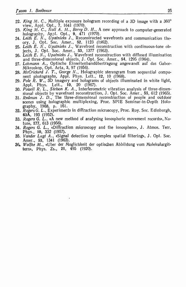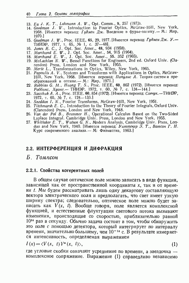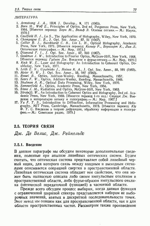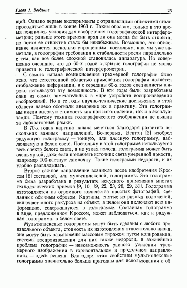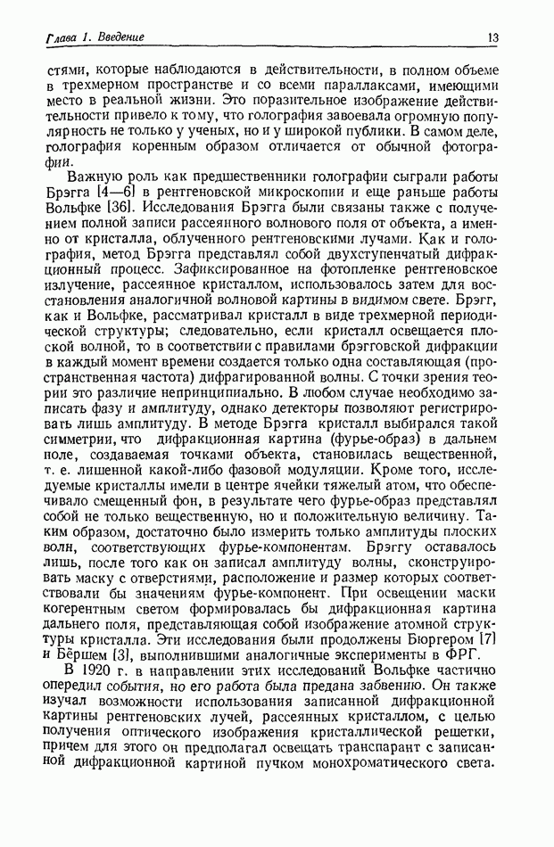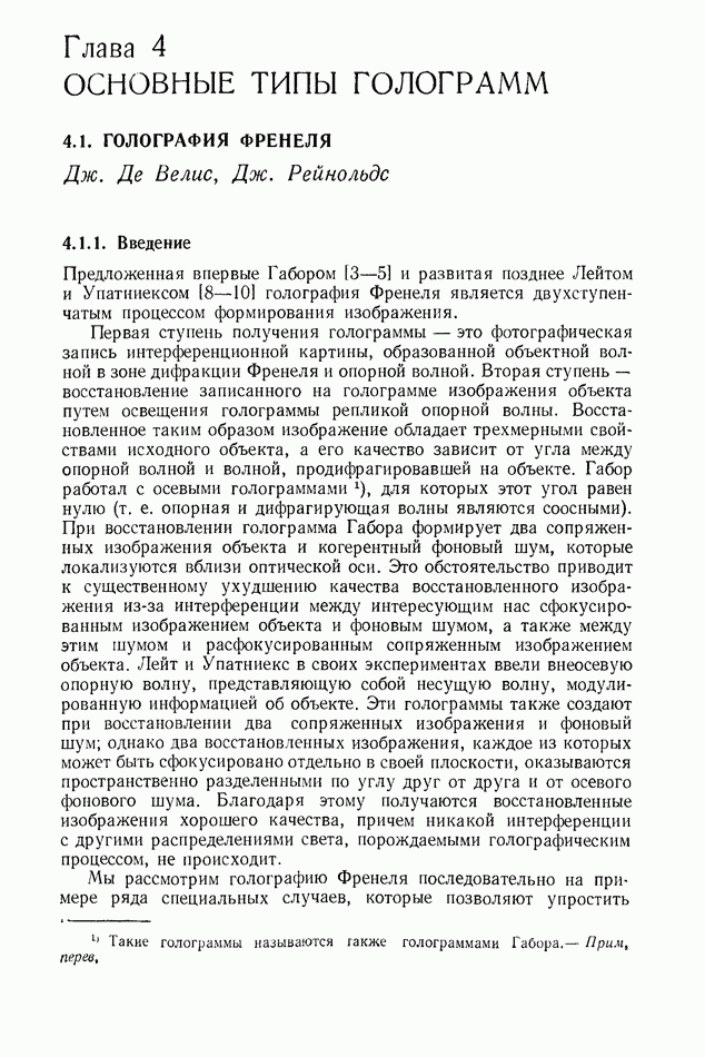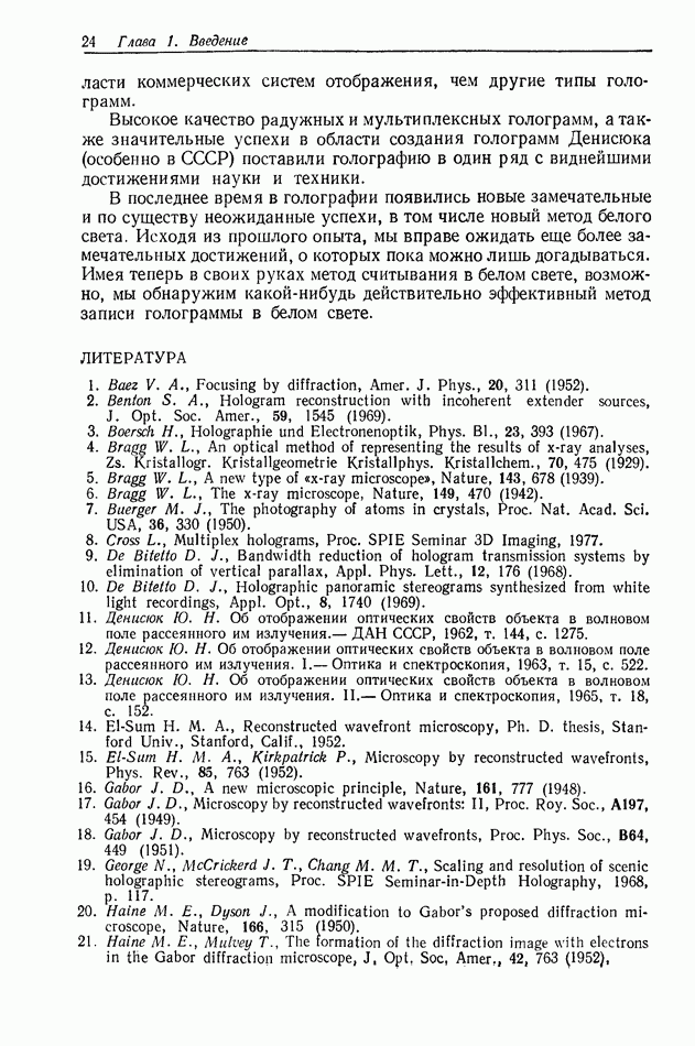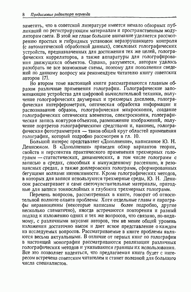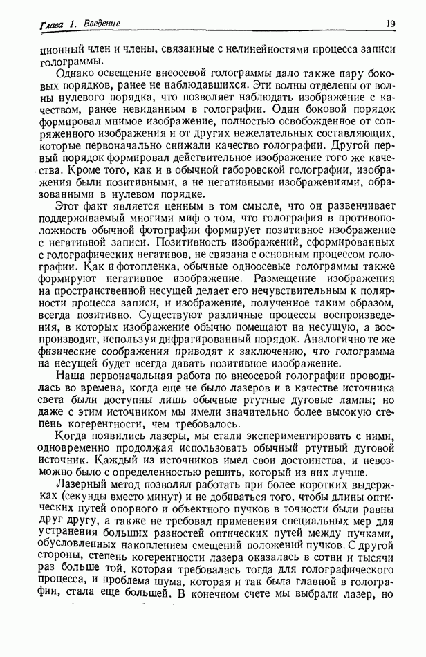 Предисловие редактора переводаВ последнее время голографические методы получения и анализа изображений находят все большее применение в различных областях науки и техники. Путь к использованию голографии отнюдь не был гладок. Хотя популярность она завоевала сразу же после появления лазерных голограмм в начале 60-х годов, прошло немало времени, прежде чем были преодолены многие технические трудности, разработаны и применены новые, основанные на принципах голографии, методы анализа и контроля явлений и объектов. Процесс расширения областей использования голографии продолжается и поныне. В научно-исследовательских институтах и научно-производственных объединениях возникло немало лабораторий, призванных распространять уже известные и разрабатывать новые голографические методы для различных областей науки и техники. Голография стала широко использоваться и как средство трехмерного отображения объектов. Возможности практического применения уже расширились настолько, что голография затронула и космические исследования, продемонстрировав целый ряд преимуществ голографических методов над традиционными. Интенсивное развитие голографии, расширение областей ее применения, постоянное увеличение числа специалистов, так или иначе связанных с голографией, — все это оказало влияние на рост интереса к литературе, рассматривающей те или иные аспекты голографии. За последние годы появилось немало книг по голографии. Одни из них (см. список литературы) посвящены проблеме в целом, другие — отдельным разделам голографии и конкретным областям ее приложения. Тем не менее вне поля зрения специальной голографической литературы осталось немало неосвещенных вопросов. Кроме того, назрела необходимость в подробном справочнике по голографии, в котором с достаточной полнотой были бы рассмотрены все главные разделы голографии. Наиболее близко удовлетворяла этим требованиям изданная в 1970 г. в русском переводе книга Р. Кольера, К Беркхарта и Л. Лина «Оптическая голография» [5]. Однако материал ее частично устарел, он уже не является достаточно полным и не отражает современного уровня развития голографии. Предлагаемая читателю книга представляет собой своего рода энциклопедический справочник, охватывающий как оптическую голографию в целом, так и формирование изображений и оптическую обработку информации. Для написания этой книги привлечен авторский коллектив в составе 31 специалиста из различных научных учреждений США и Канады. В авторский коллектив входит большинство ученых США, наиболее активно работающих в области голографии, оптической обработки информации и их применений. Введение к книге написал Э. Лейт — один из основоположников лазерной голографии, внесший большой вклад в дело ее практического использования в разных областях науки и техники. В переводном издании в книгу внесены некоторые изменения. Во-первых, она разбита на два тома и, во-вторых, с любезного разрешения редактора американского издания проф. Г. Колфилда, в т. 2 помещено «Дополнение», написанное крупнейшим советским специалистом в области голографии и оптики чл.-кор. АН СССР Ю. Н. Денисюком. Необходимость введения «Дополнения» обусловлена тем, что в американском издании весьма слабо отражены работы советских авторов и недостаточно освещен важный разде