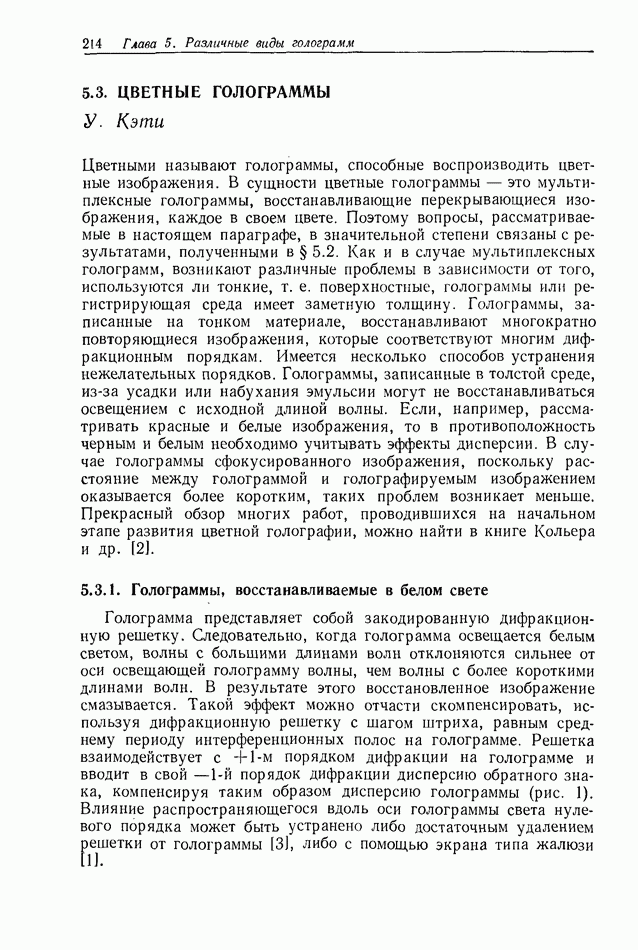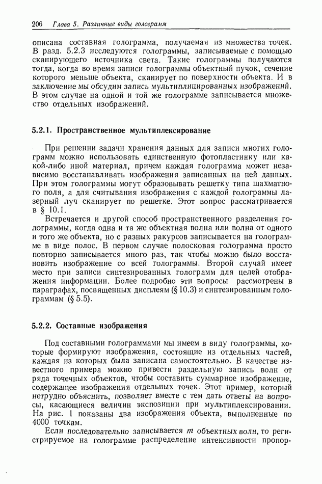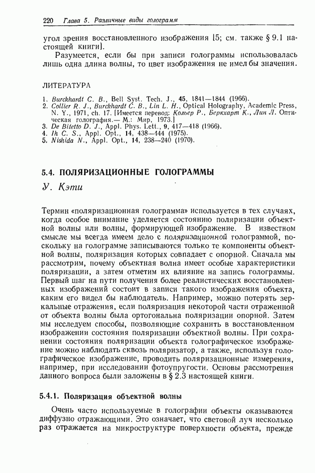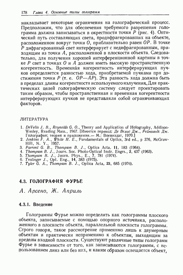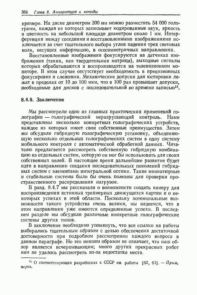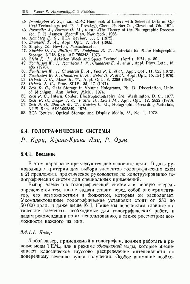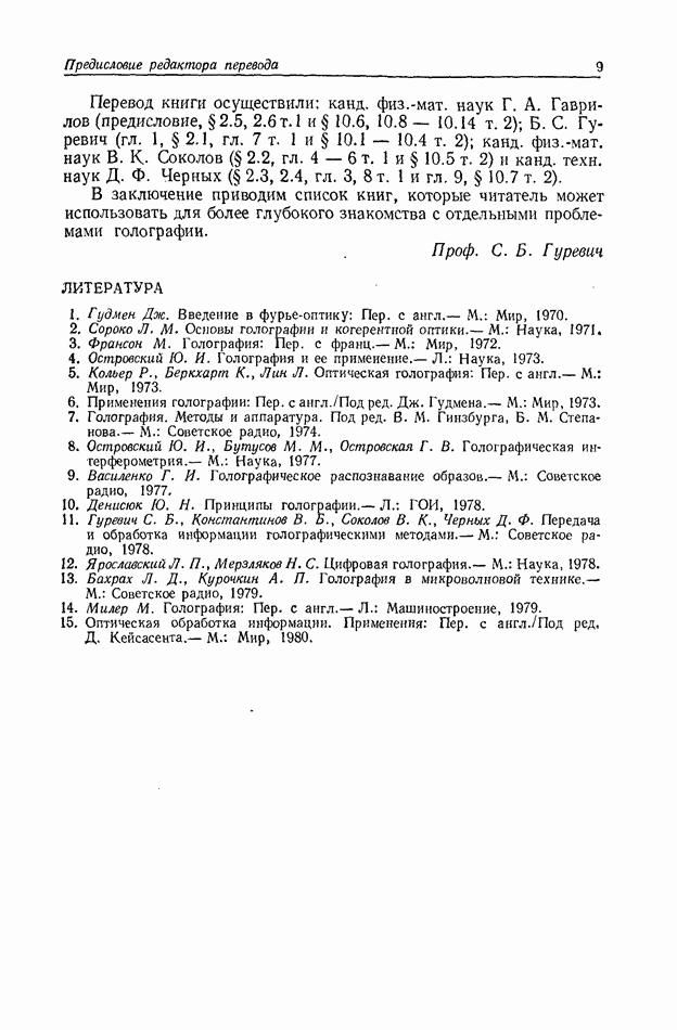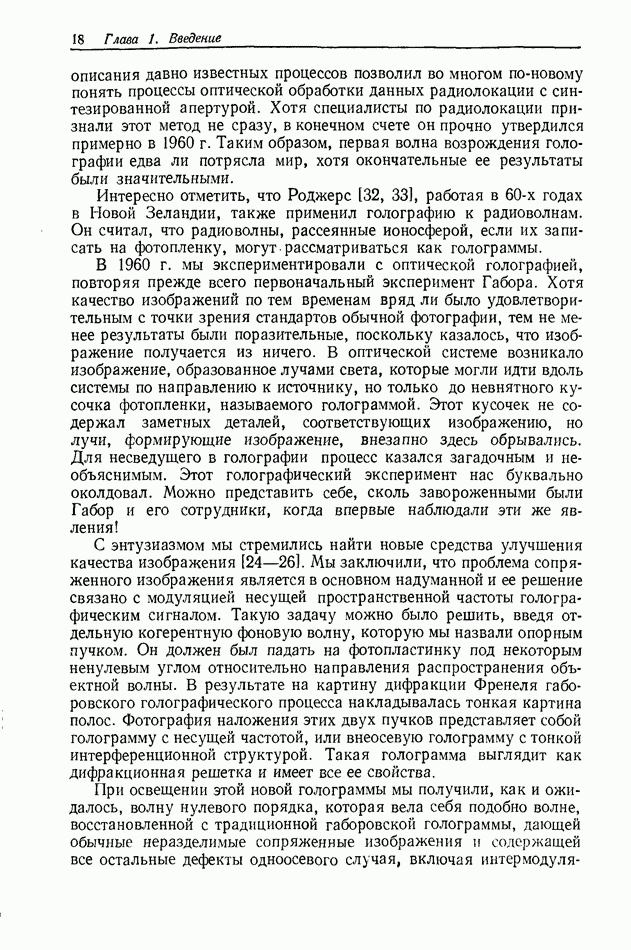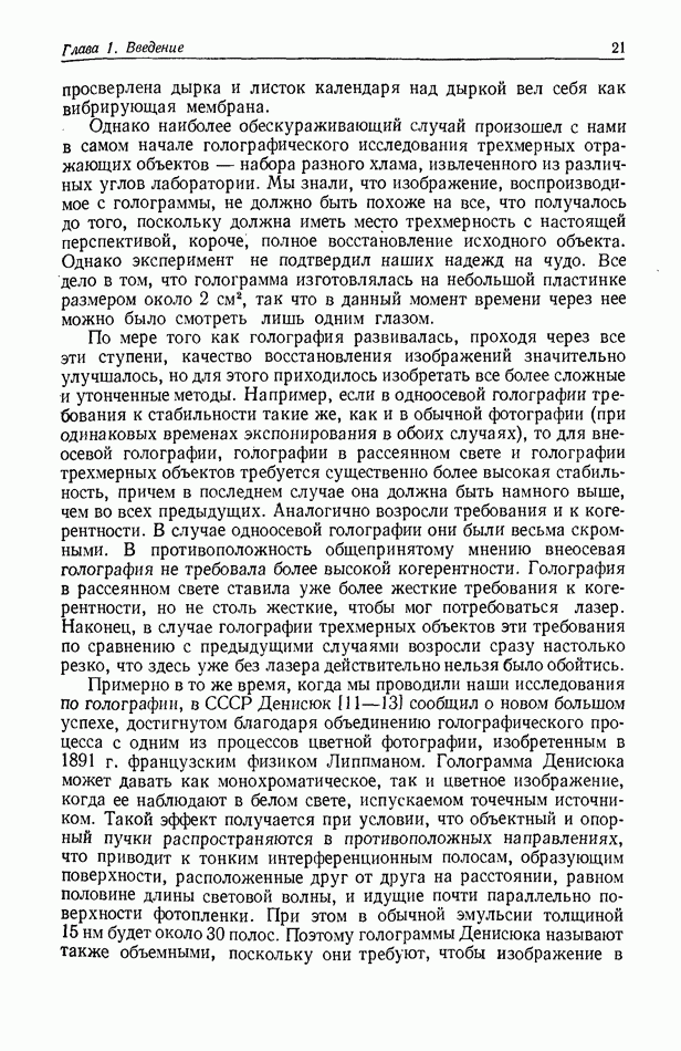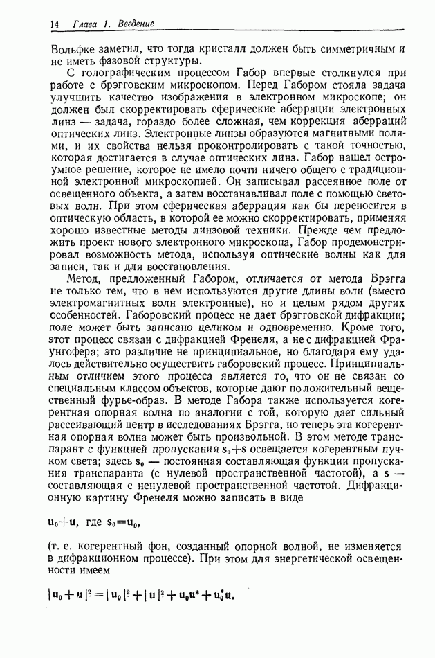 Предисловие редактора переводаВ последнее время голографические методы получения и анализа изображений находят все большее применение в различных областях науки и техники. Путь к использованию голографии отнюдь не был гладок. Хотя популярность она завоевала сразу же после появления лазерных голограмм в начале 60-х годов, прошло немало времени, прежде чем были преодолены многие технические трудности, разработаны и применены новые, основанные на принципах голографии, методы анализа и контроля явлений и объектов. Процесс расширения областей использования голографии продолжается и поныне. В научно-исследовательских институтах и научно-производственных объединениях возникло немало лабораторий, призванных распространять уже известные и разрабатывать новые голографические методы для различных областей науки и техники. Голография стала широко использоваться и как средство трехмерного отображения объектов. Возможности практического применения уже расширились настолько, что голография затронула и космические исследования, продемонстрировав целый ряд преимуществ голографических методов над традиционными. Интенсивное развитие голографии, расширение областей ее применения, постоянное увеличение числа специалистов, так или иначе связанных с голографией, — все это оказало влияние на рост интереса к литературе, рассматривающей те или иные аспекты голографии. За последние годы появилось немало книг по голографии. Одни из них (см. список литературы) посвящены проблеме в целом, другие — отдельным разделам голографии и конкретным областям ее приложения. Тем не менее вне поля зрения специальной голографической литературы осталось немало неосвещенных вопросов. Кроме того, назрела необходимость в подробном справочнике по голографии, в котором с достаточной полнотой были бы рассмотрены все главные разделы голографии. Наиболее близко удовлетворяла этим требованиям изданная в 1970 г. в русском переводе книга Р. Кольера, К Беркхарта и Л. Лина «Оптическая голография» [5]. Однако материал ее частично устарел, он уже не является достаточно полным и не отражает современного уровня развития голографии. Предлагаемая читателю книга представляет собой своего рода энциклопедический справочник, охватывающий как оптическую голографию в целом, так и формирование изображений и оптическую обработку информации. Для написания этой книги привлечен авторский коллектив в составе 31 специалиста из различных научных учреждений США и Канады. В авторский коллектив входит большинство ученых США, наиболее активно работающих в области голографии, оптической обработки информации и их применений. Введение к книге написал Э. Лейт — один из основоположников лазерной голографии, внесший большой вклад в дело ее практического использования в разных областях науки и техники. В переводном издании в книгу внесены некоторые изменения. Во-первых, она разбита на два тома и, во-вторых, с любезного разрешения редактора американского издания проф. Г. Колфилда, в т. 2 помещено «Дополнение», написанное крупнейшим советским специалистом в области голографии и оптики чл.-кор. АН СССР Ю. Н. Денисюком. Необходимость введения «Дополнения» обусловлена тем, что в американском издании весьма слабо отражены работы советских авторов и недостаточно освещен важный разде