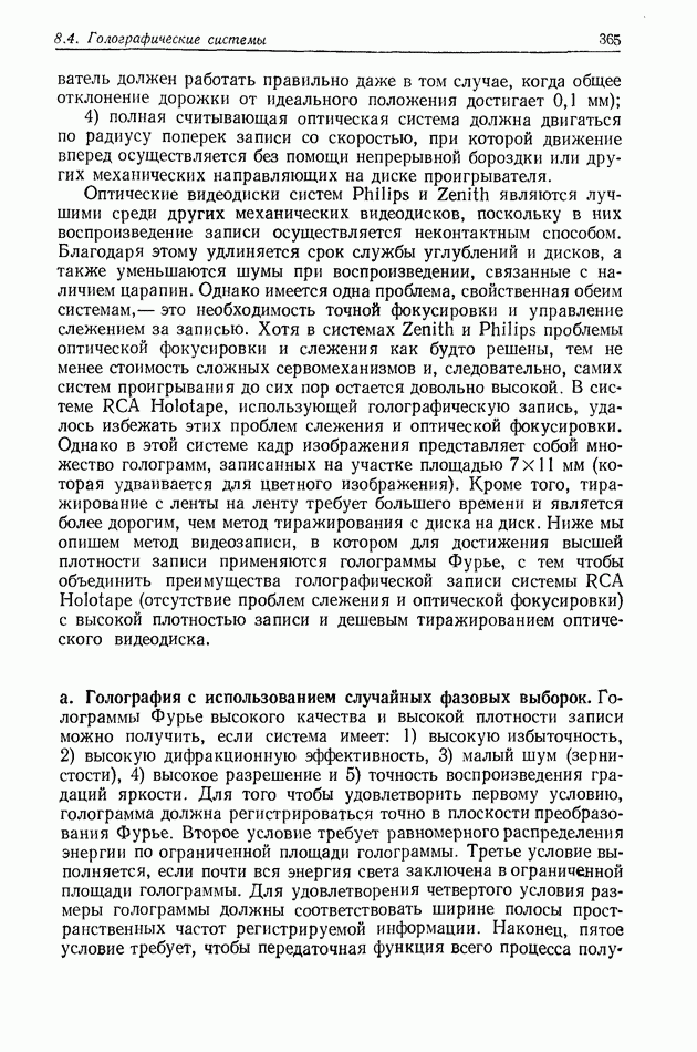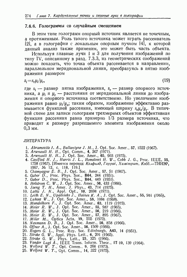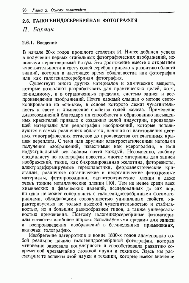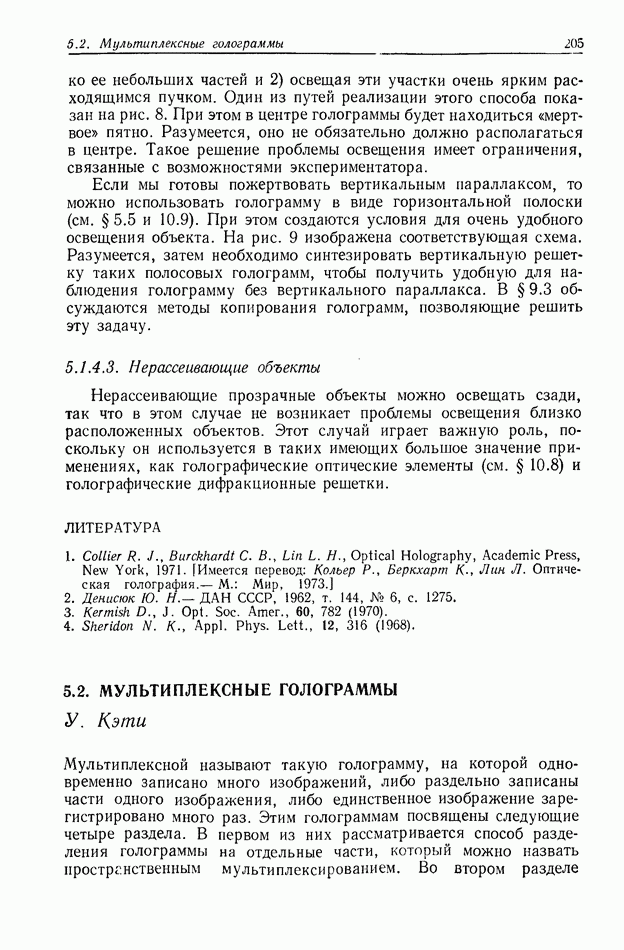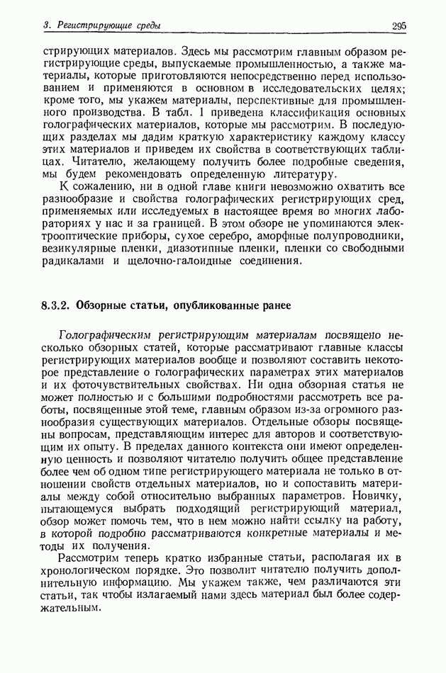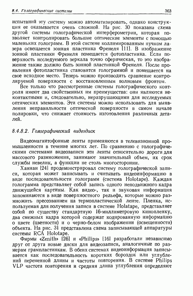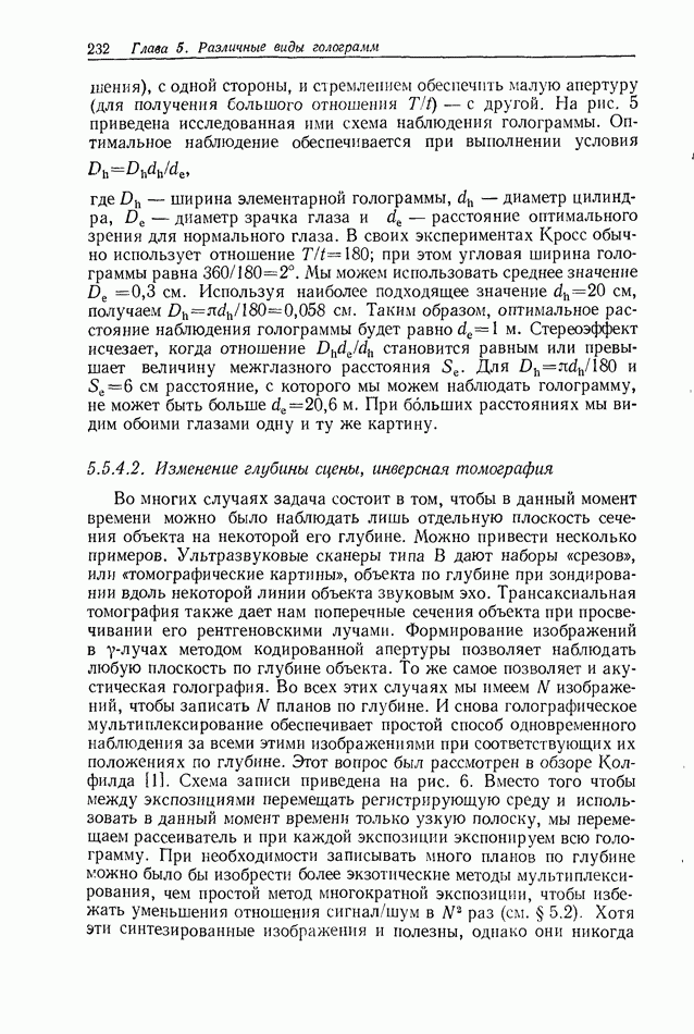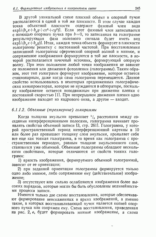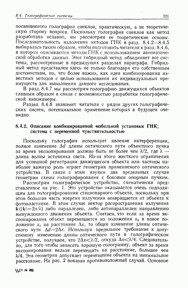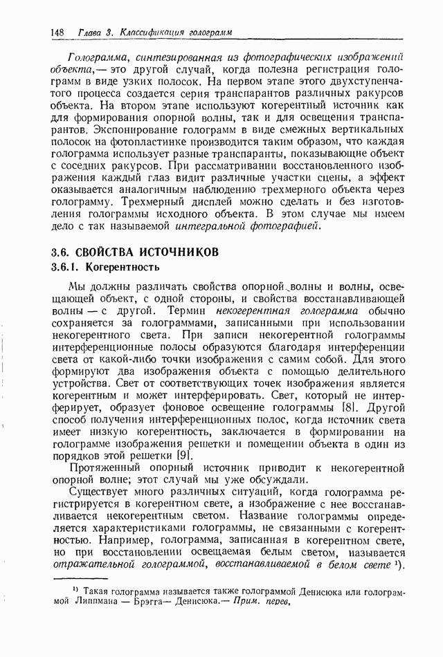 Предисловие редактора переводаВ последнее время голографические методы получения и анализа изображений находят все большее применение в различных областях науки и техники. Путь к использованию голографии отнюдь не был гладок. Хотя популярность она завоевала сразу же после появления лазерных голограмм в начале 60-х годов, прошло немало времени, прежде чем были преодолены многие технические трудности, разработаны и применены новые, основанные на принципах голографии, методы анализа и контроля явлений и объектов. Процесс расширения областей использования голографии продолжается и поныне. В научно-исследовательских институтах и научно-производственных объединениях возникло немало лабораторий, призванных распространять уже известные и разрабатывать новые голографические методы для различных областей науки и техники. Голография стала широко использоваться и как средство трехмерного отображения объектов. Возможности практического применения уже расширились настолько, что голография затронула и космические исследования, продемонстрировав целый ряд преимуществ голографических методов над традиционными. Интенсивное развитие голографии, расширение областей ее применения, постоянное увеличение числа специалистов, так или иначе связанных с голографией, — все это оказало влияние на рост интереса к литературе, рассматривающей те или иные аспекты голографии. За последние годы появилось немало книг по голографии. Одни из них (см. список литературы) посвящены проблеме в целом, другие — отдельным разделам голографии и конкретным областям ее приложения. Тем не менее вне поля зрения специальной голографической литературы осталось немало неосвещенных вопросов. Кроме того, назрела необходимость в подробном справочнике по голографии, в котором с достаточной полнотой были бы рассмотрены все главные разделы голографии. Наиболее близко удовлетворяла этим требованиям изданная в 1970 г. в русском переводе книга Р. Кольера, К Беркхарта и Л. Лина «Оптическая голография» [5]. Однако материал ее частично устарел, он уже не является достаточно полным и не отражает современного уровня развития голографии. Предлагаемая читателю книга представляет собой своего рода энциклопедический справочник, охватывающий как оптическую голографию в целом, так и формирование изображений и оптическую обработку информации. Для написания этой книги привлечен авторский коллектив в составе 31 специалиста из различных научных учреждений США и Канады. В авторский коллектив входит большинство ученых США, наиболее активно работающих в области голографии, оптической обработки информации и их применений. Введение к книге написал Э. Лейт — один из основоположников лазерной голографии, внесший большой вклад в дело ее практического использования в разных областях науки и техники. В переводном издании в книгу внесены некоторые изменения. Во-первых, она разбита на два тома и, во-вторых, с любезного разрешения редактора американского издания проф. Г. Колфилда, в т. 2 помещено «Дополнение», написанное крупнейшим советским специалистом в области голографии и оптики чл.-кор. АН СССР Ю. Н. Денисюком. Необходимость введения «Дополнения» обусловлена тем, что в американском издании весьма слабо отражены работы советских авторов и недостаточно освещен важный разде